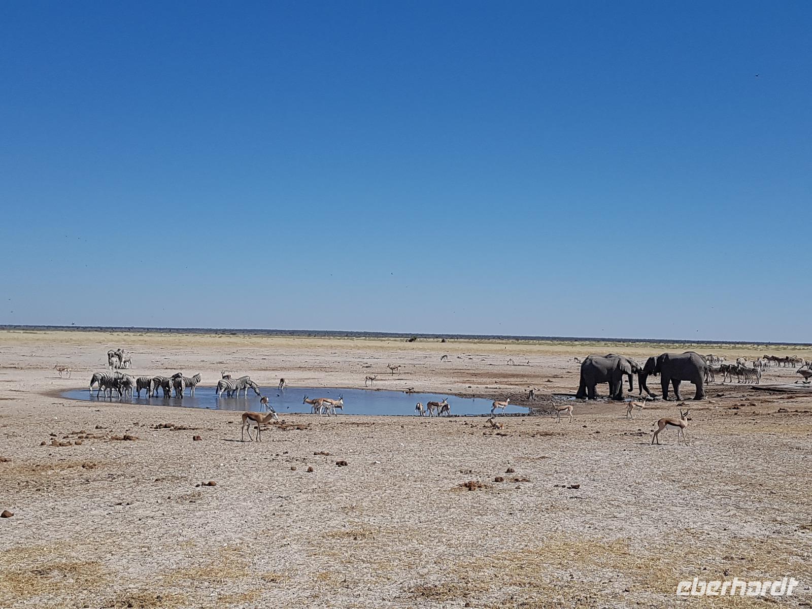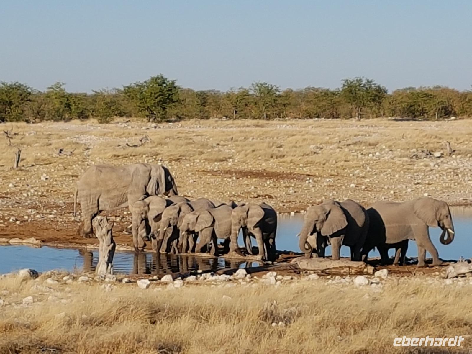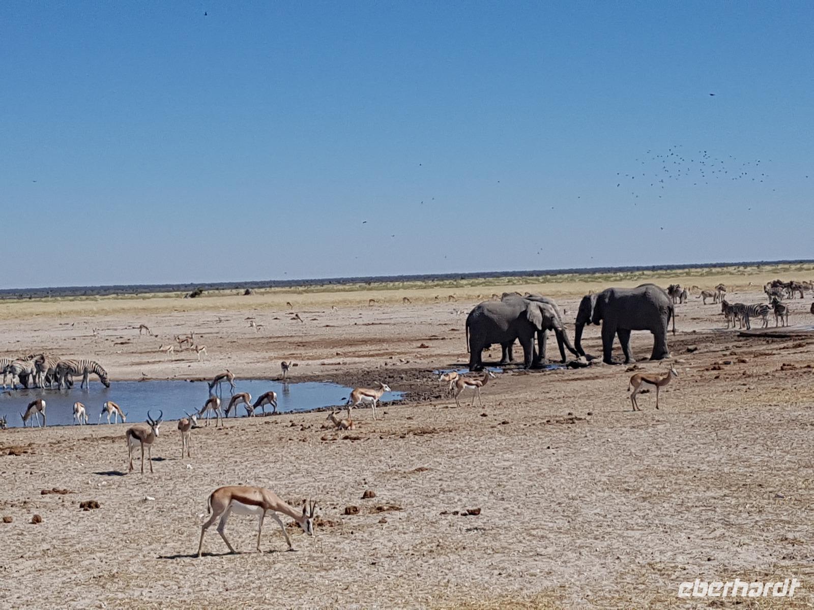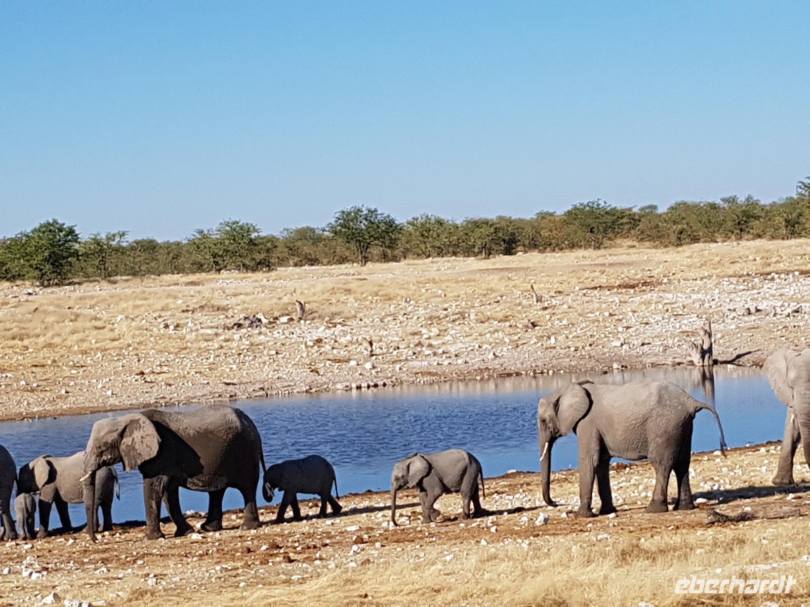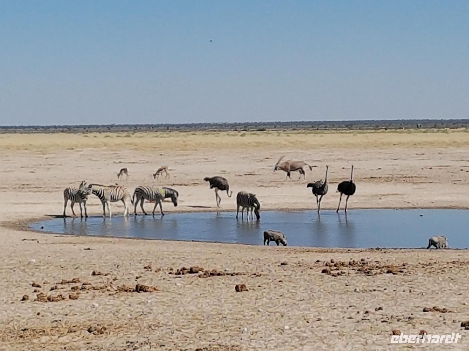 So wie gestern verbrachten wir die Mittagstunden beim gemütlichen Picknick in einem schattigen Camp direkt im Park. Hier konnte man sich was zum Essen bestellen oder zum Wasserloch laufen, um Tiere zu beobachten. Eberhardt Travel lud heute alle Gäste zum Eis ein. War eine gute Idee, oder? Am frühenNachmittag fuhren wir direkt am Rand von dem Herzstück des Parks, die 100 Kilometer lange Etosha-Pfanne. Eine große, weiße Fläche, wie der Name aus der Sansprache bedeutet, breitet sich ins Unendliche aus. Die weiße, nichtgreifbare Weite zieht uns alle magisch in ihren Bann.