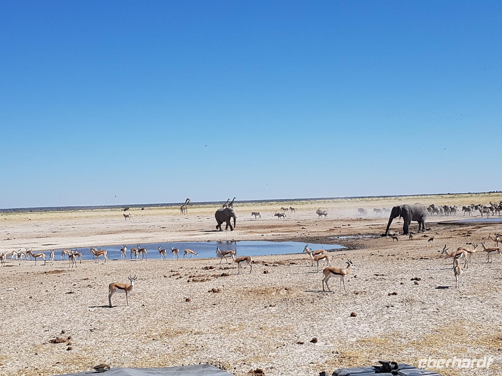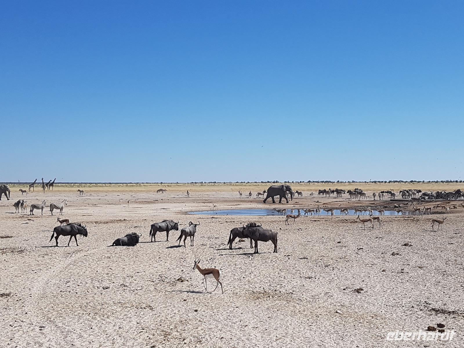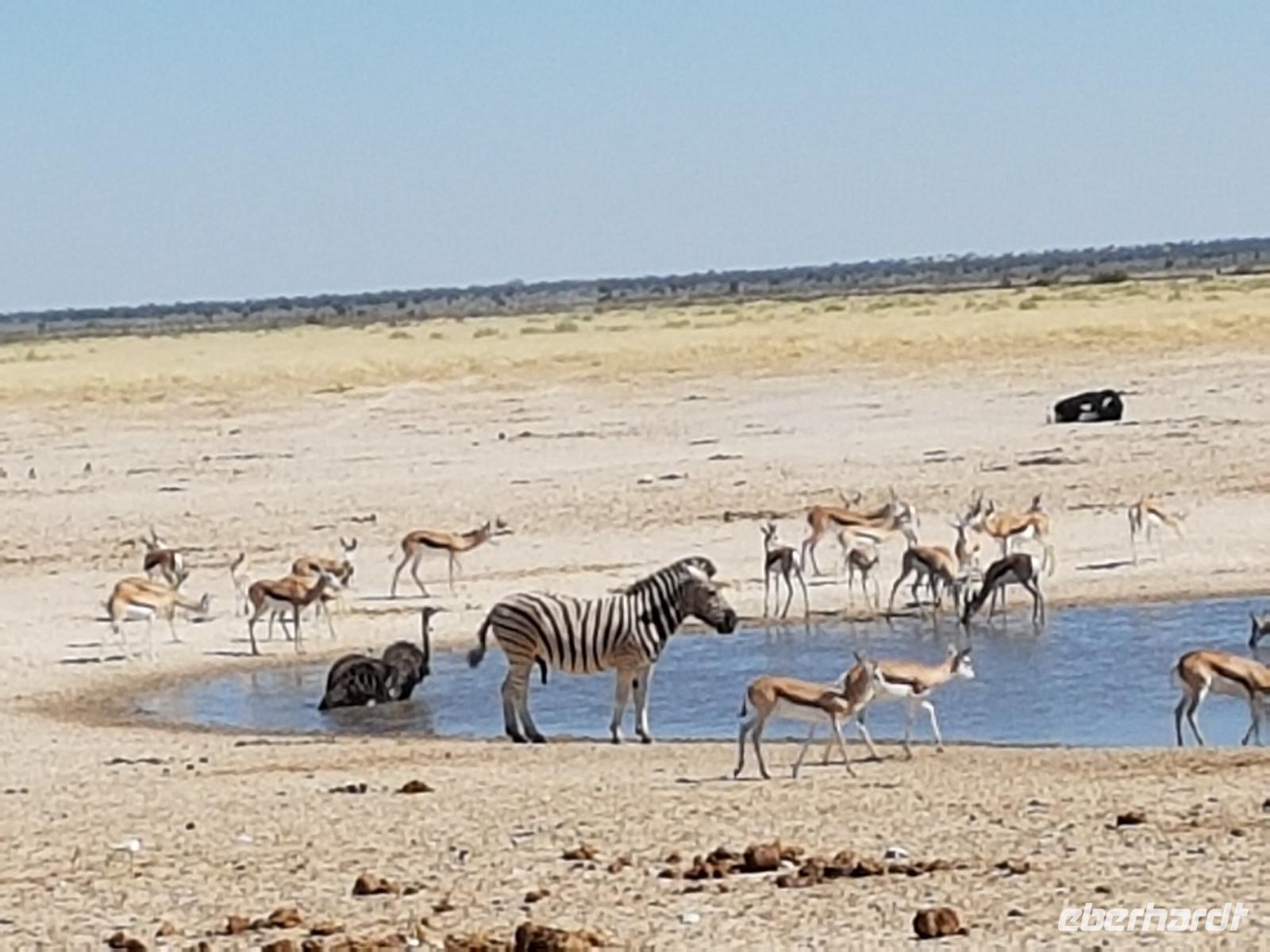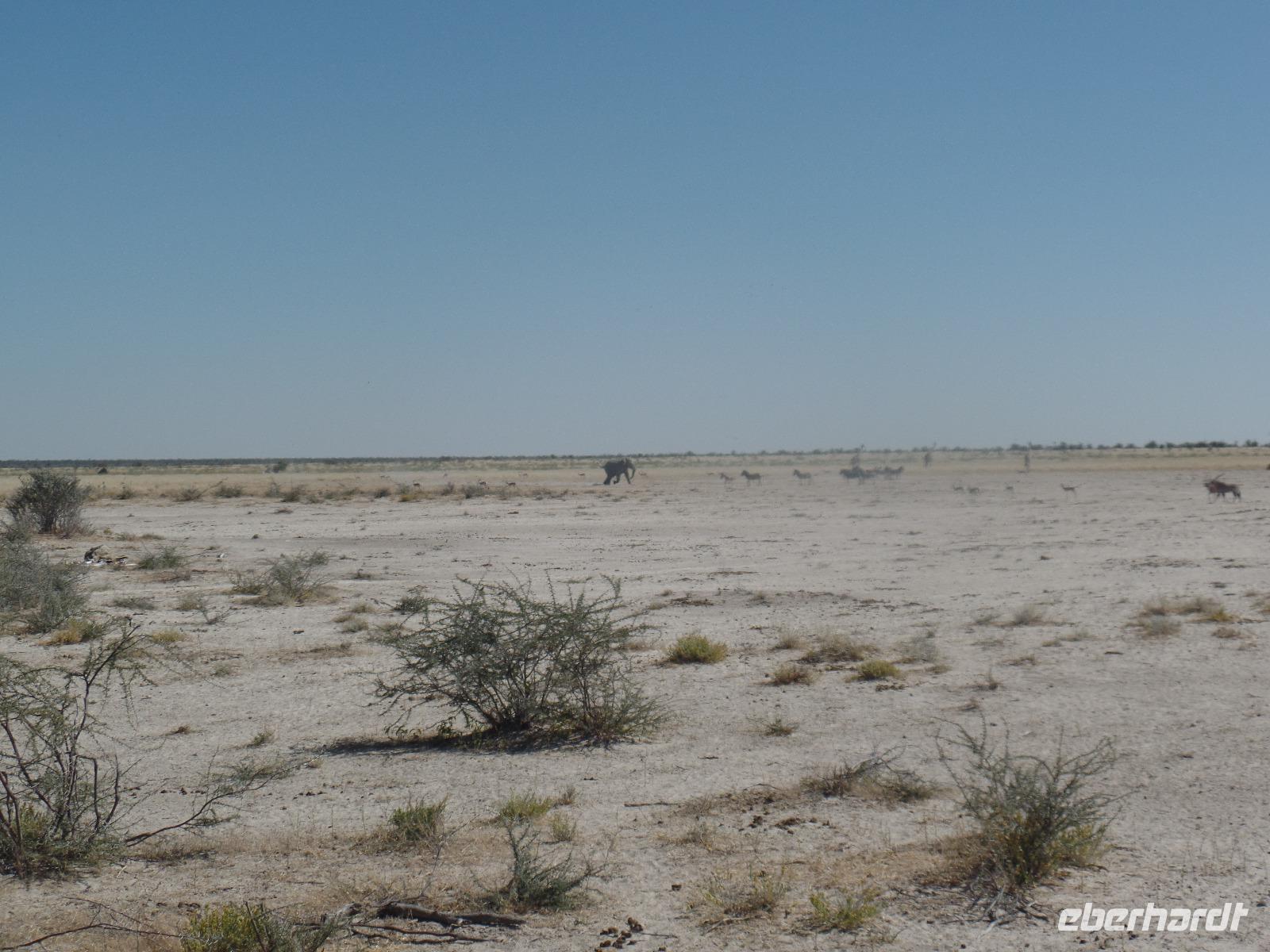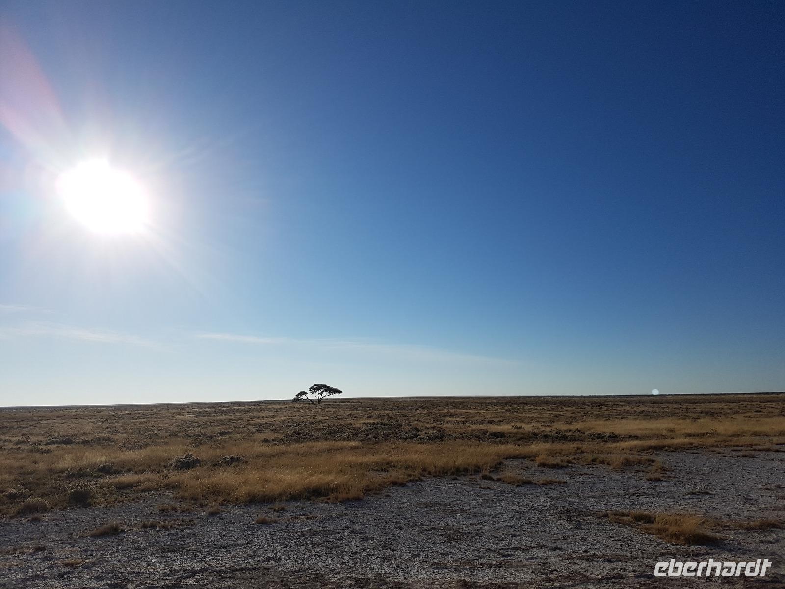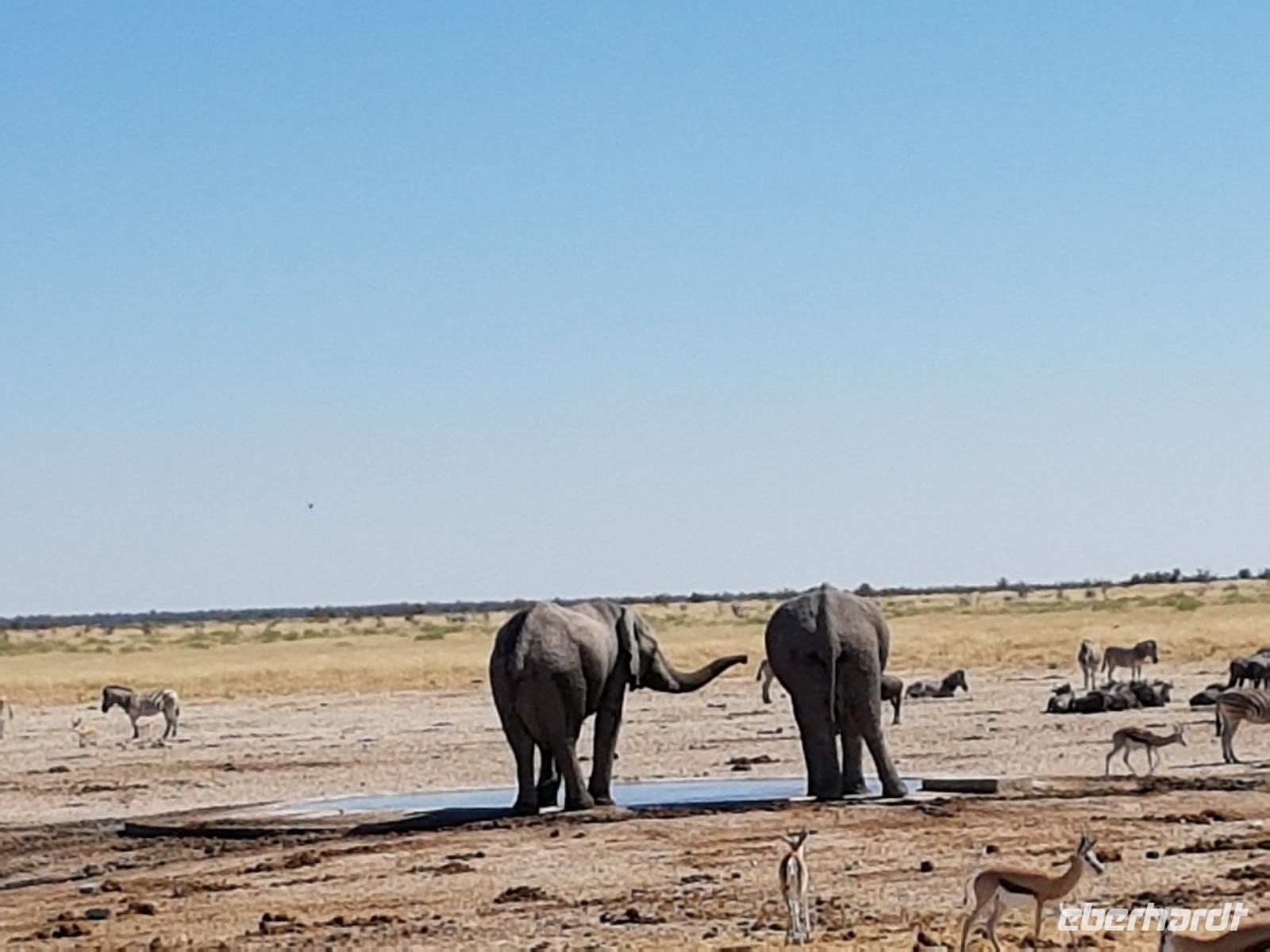 So wie gestern verbrachten wir die Mittagstunden beim gemütlichen Picknick in einem schattigen Camp direkt im Park. Hier konnte man sich was zum Essen bestellen oder zum Wasserloch laufen, um Tiere zu beobachten. Eberhardt Travel lud heute alle Gäste zum Eis ein. War eine gute Idee, oder? Am frühenNachmittag fuhren wir direkt am Rand von dem Herzstück des Parks, die 100 Kilometer lange Etosha-Pfanne. Eine große, weiße Fläche, wie der Name aus der Sansprache bedeutet, breitet sich ins Unendliche aus. Die weiße, nichtgreifbare Weite zieht uns alle magisch in ihren Bann.