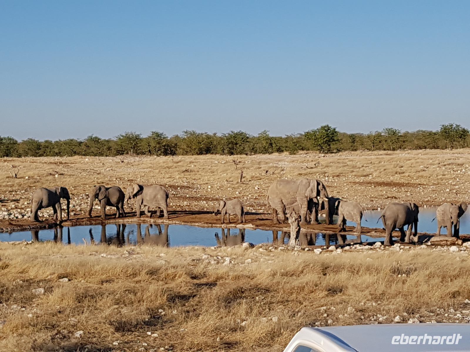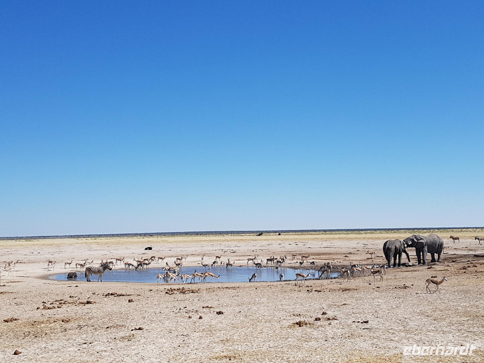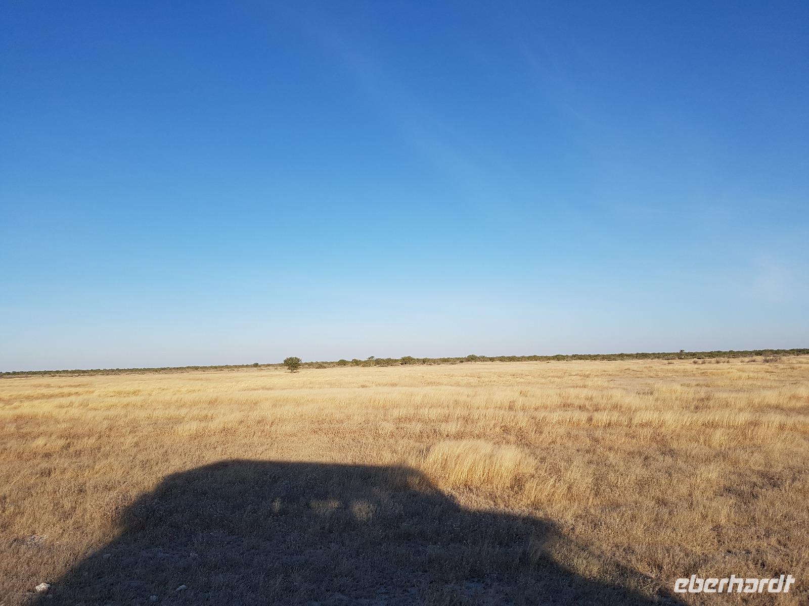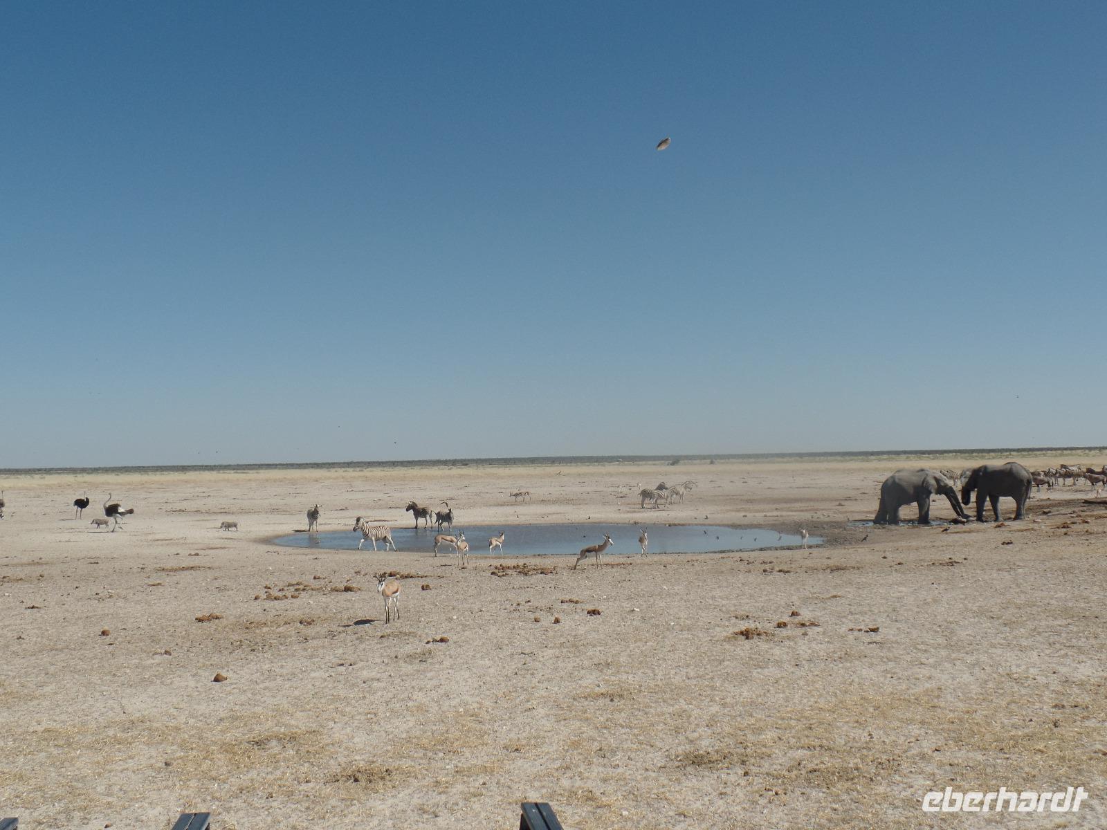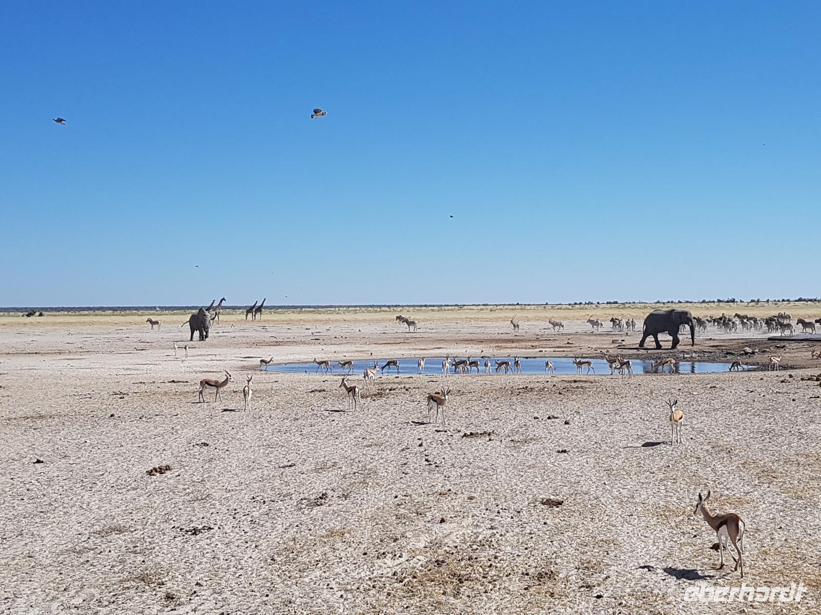 So wie gestern verbrachten wir die Mittagstunden beim gemütlichen Picknick in einem schattigen Camp direkt im Park. Hier konnte man sich was zum Essen bestellen oder zum Wasserloch laufen, um Tiere zu beobachten. Eberhardt Travel lud heute alle Gäste zum Eis ein. War eine gute Idee, oder? Am frühenNachmittag fuhren wir direkt am Rand von dem Herzstück des Parks, die 100 Kilometer lange Etosha-Pfanne. Eine große, weiße Fläche, wie der Name aus der Sansprache bedeutet, breitet sich ins Unendliche aus. Die weiße, nichtgreifbare Weite zieht uns alle magisch in ihren Bann.
