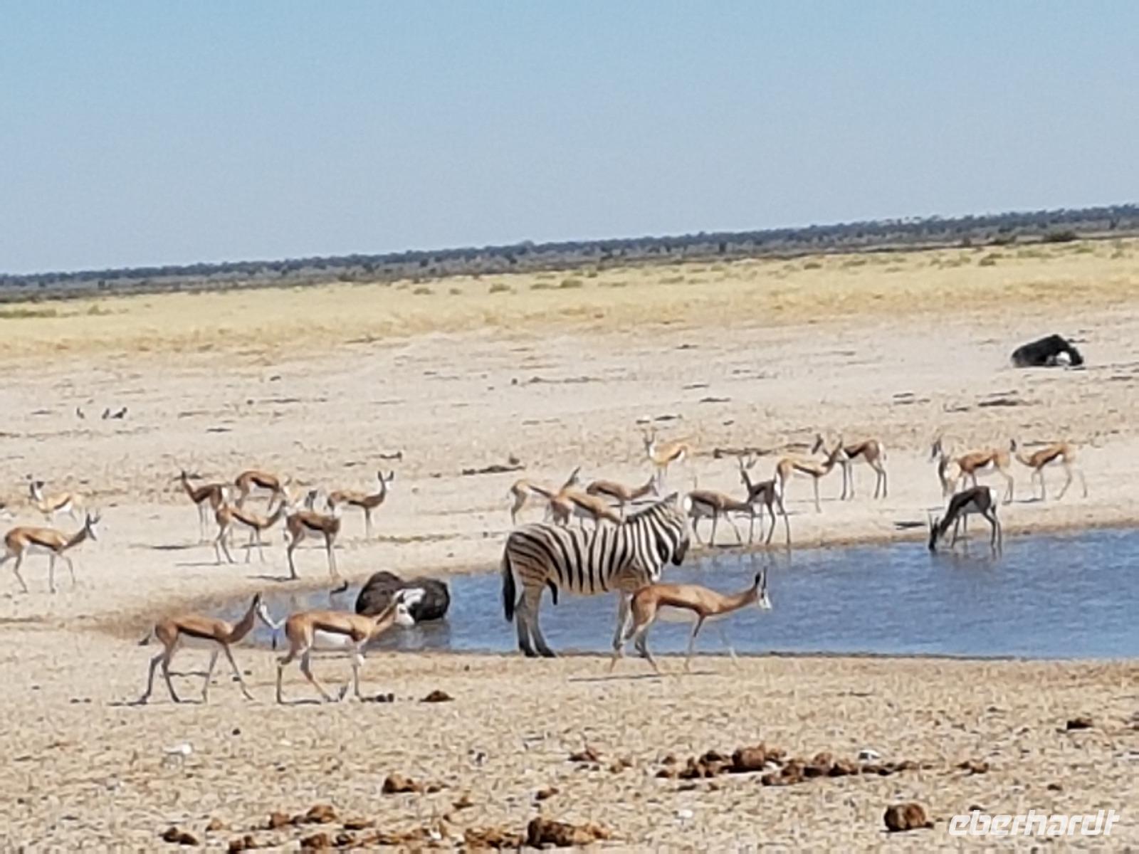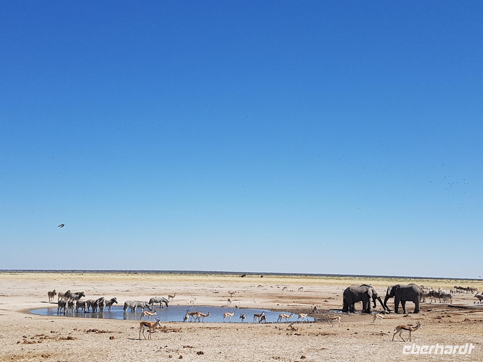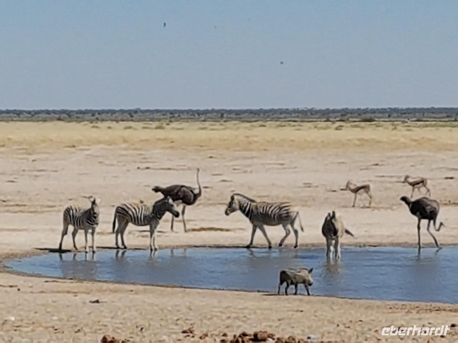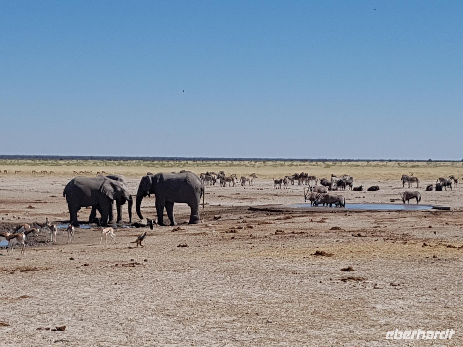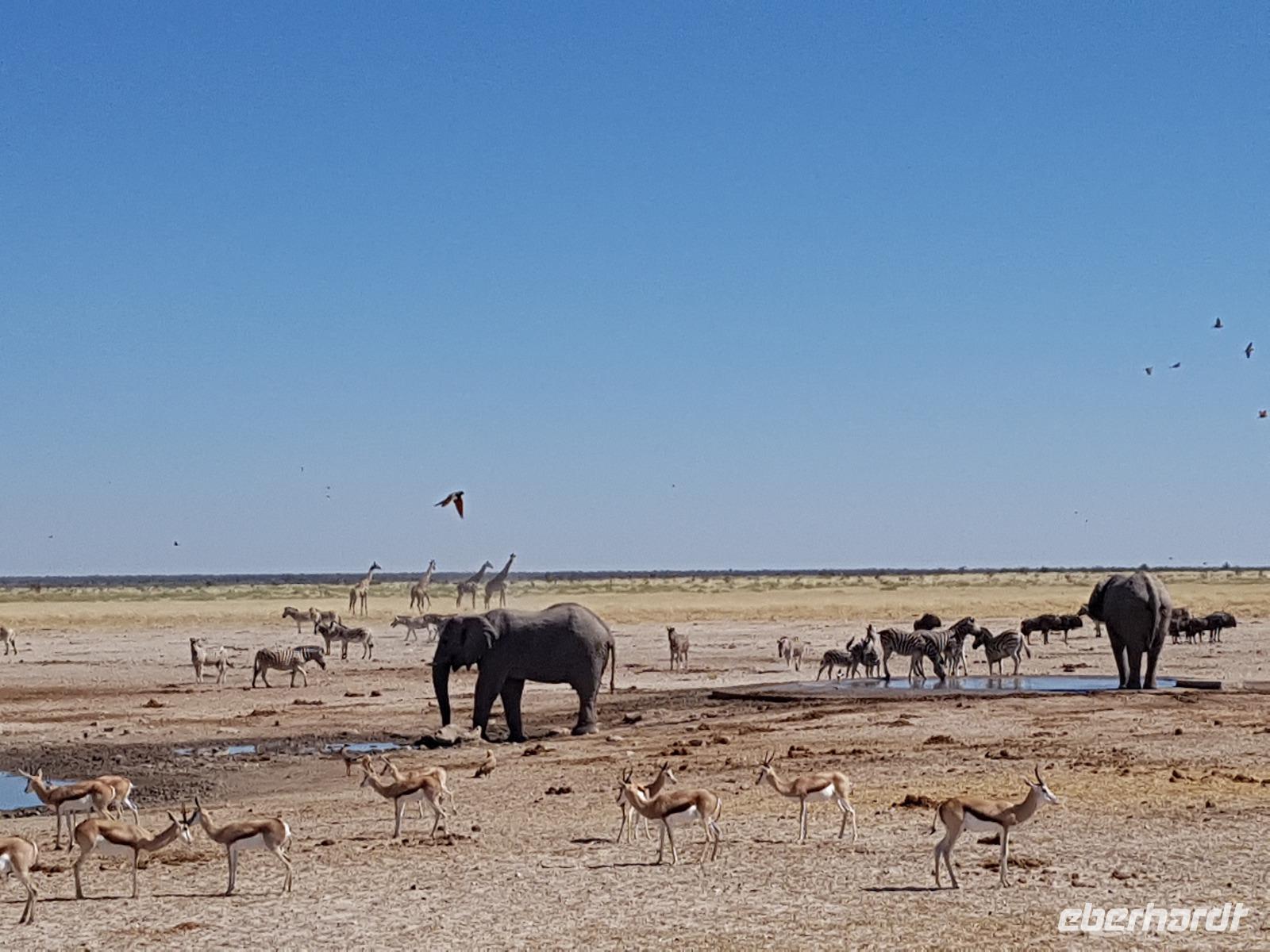 So wie gestern verbrachten wir die Mittagstunden beim gemütlichen Picknick in einem schattigen Camp direkt im Park. Hier konnte man sich was zum Essen bestellen oder zum Wasserloch laufen, um Tiere zu beobachten. Eberhardt Travel lud heute alle Gäste zum Eis ein. War eine gute Idee, oder? Am frühenNachmittag fuhren wir direkt am Rand von dem Herzstück des Parks, die 100 Kilometer lange Etosha-Pfanne. Eine große, weiße Fläche, wie der Name aus der Sansprache bedeutet, breitet sich ins Unendliche aus. Die weiße, nichtgreifbare Weite zieht uns alle magisch in ihren Bann.