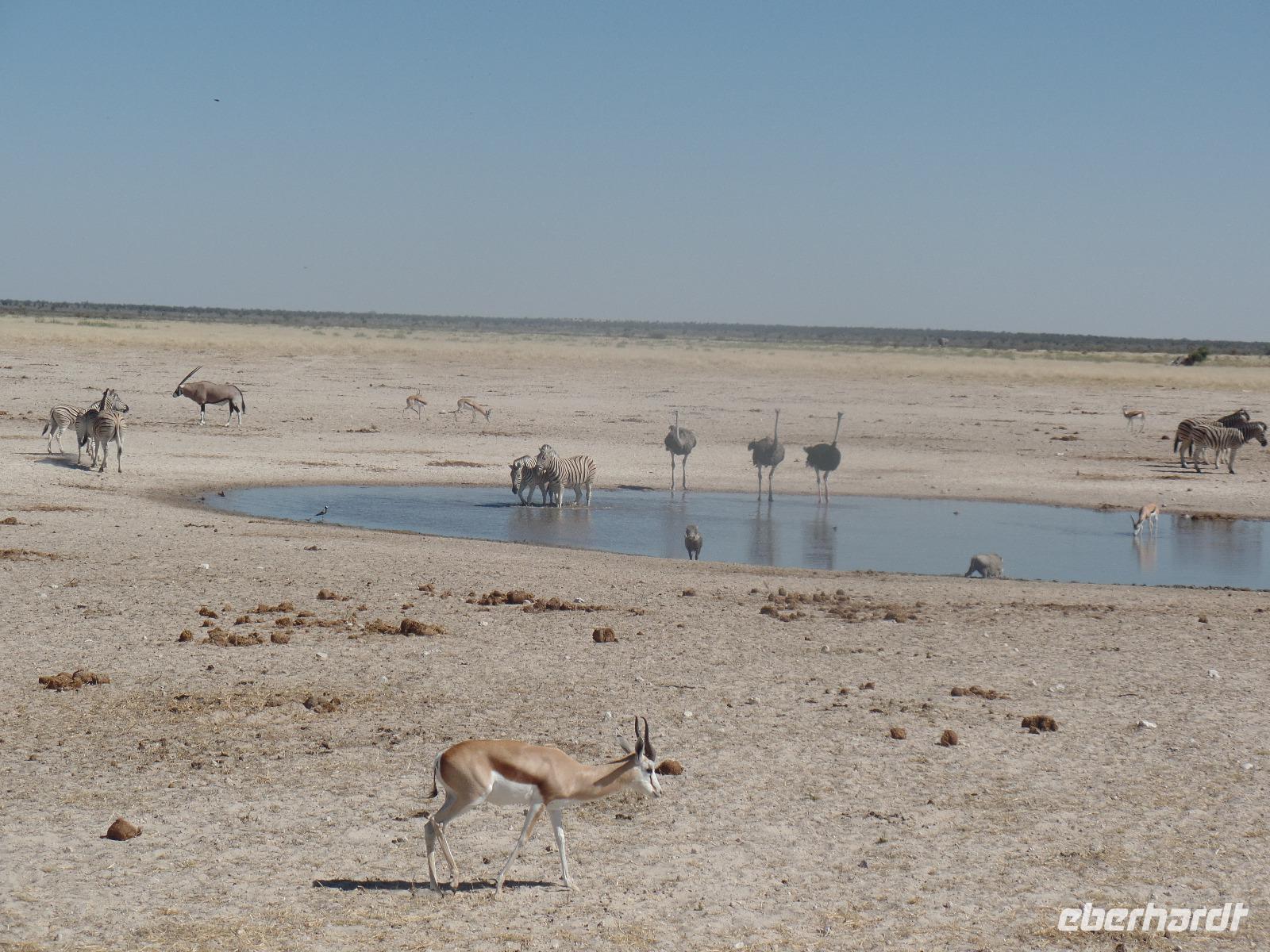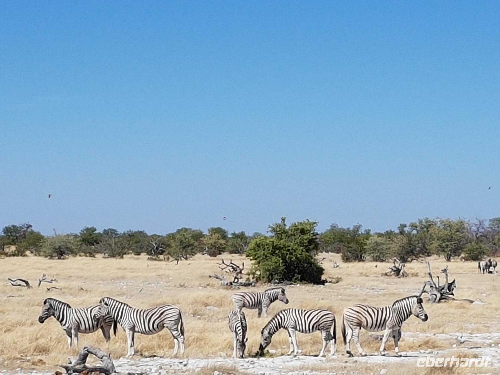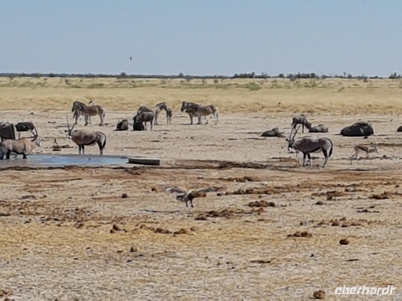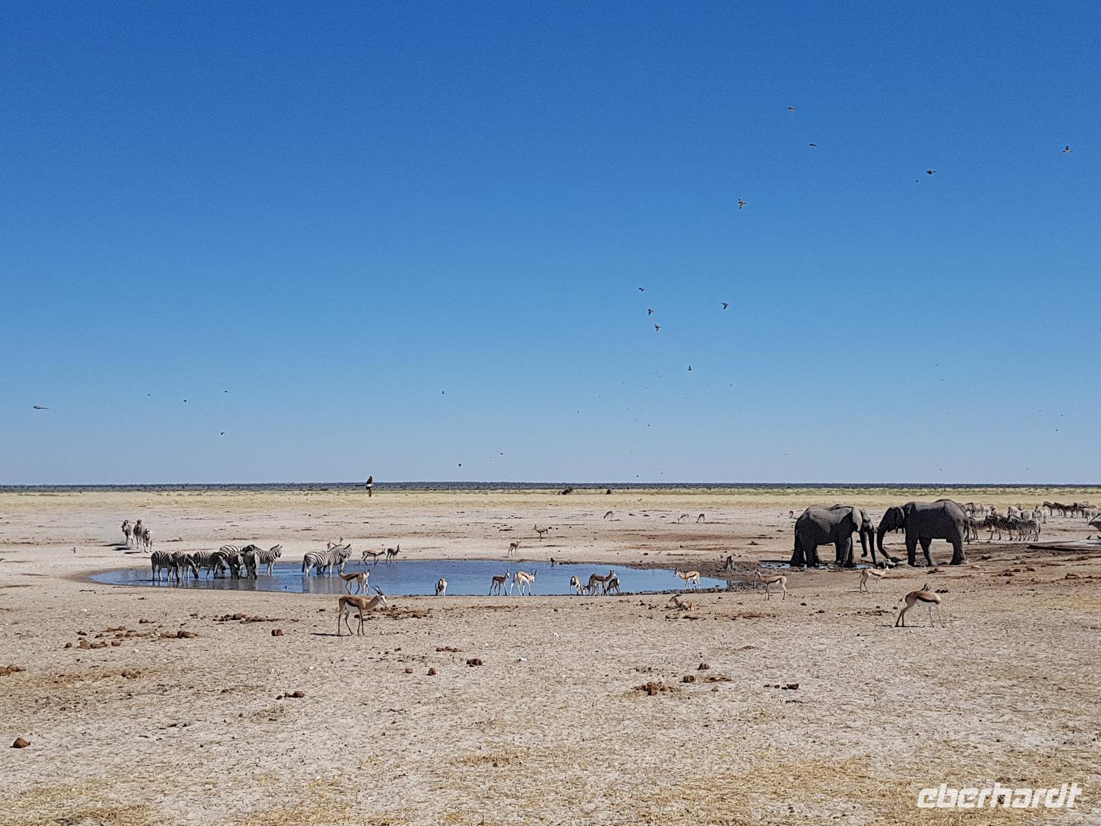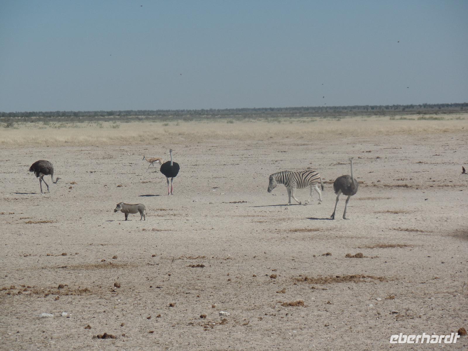 So wie gestern verbrachten wir die Mittagstunden beim gemütlichen Picknick in einem schattigen Camp direkt im Park. Hier konnte man sich was zum Essen bestellen oder zum Wasserloch laufen, um Tiere zu beobachten. Eberhardt Travel lud heute alle Gäste zum Eis ein. War eine gute Idee, oder? Am frühenNachmittag fuhren wir direkt am Rand von dem Herzstück des Parks, die 100 Kilometer lange Etosha-Pfanne. Eine große, weiße Fläche, wie der Name aus der Sansprache bedeutet, breitet sich ins Unendliche aus. Die weiße, nichtgreifbare Weite zieht uns alle magisch in ihren Bann.