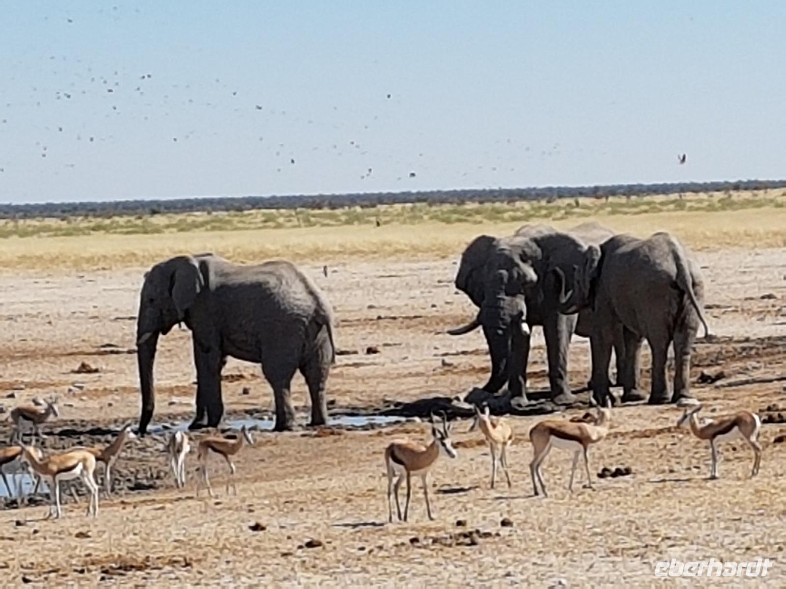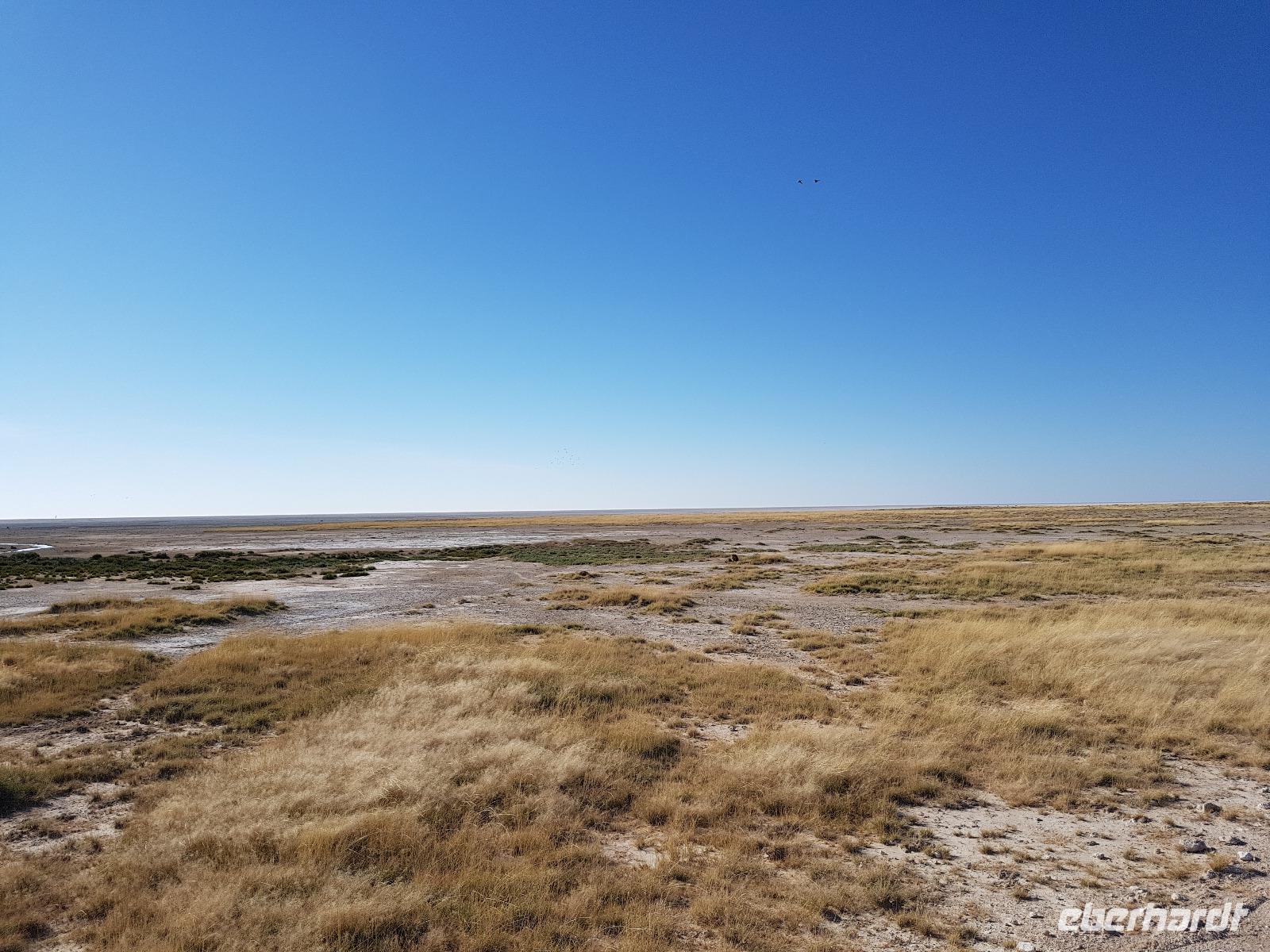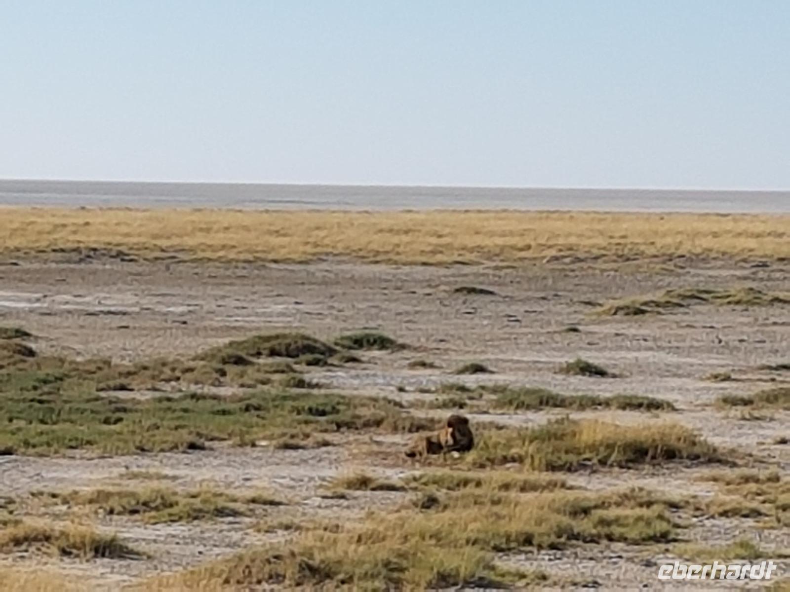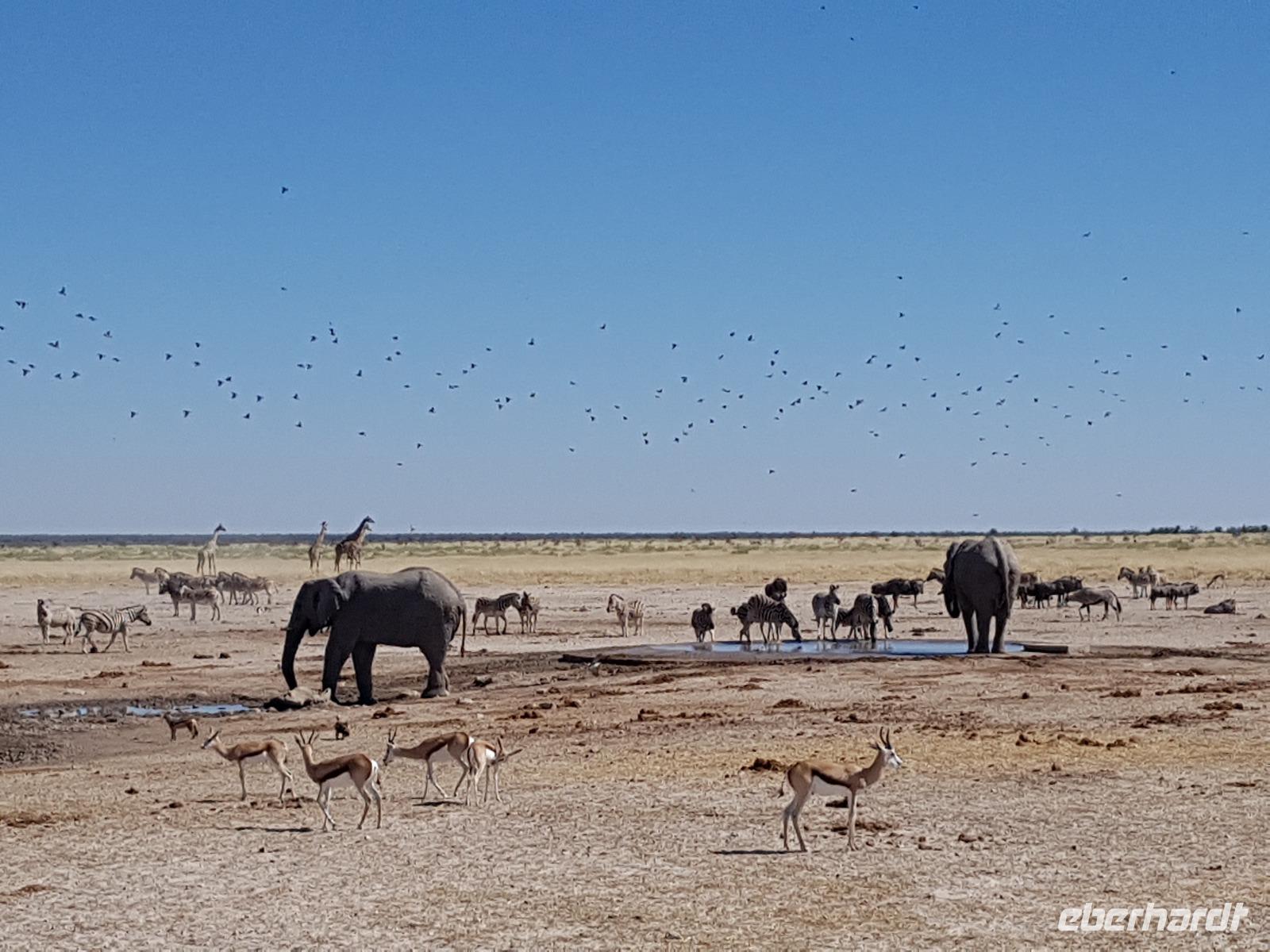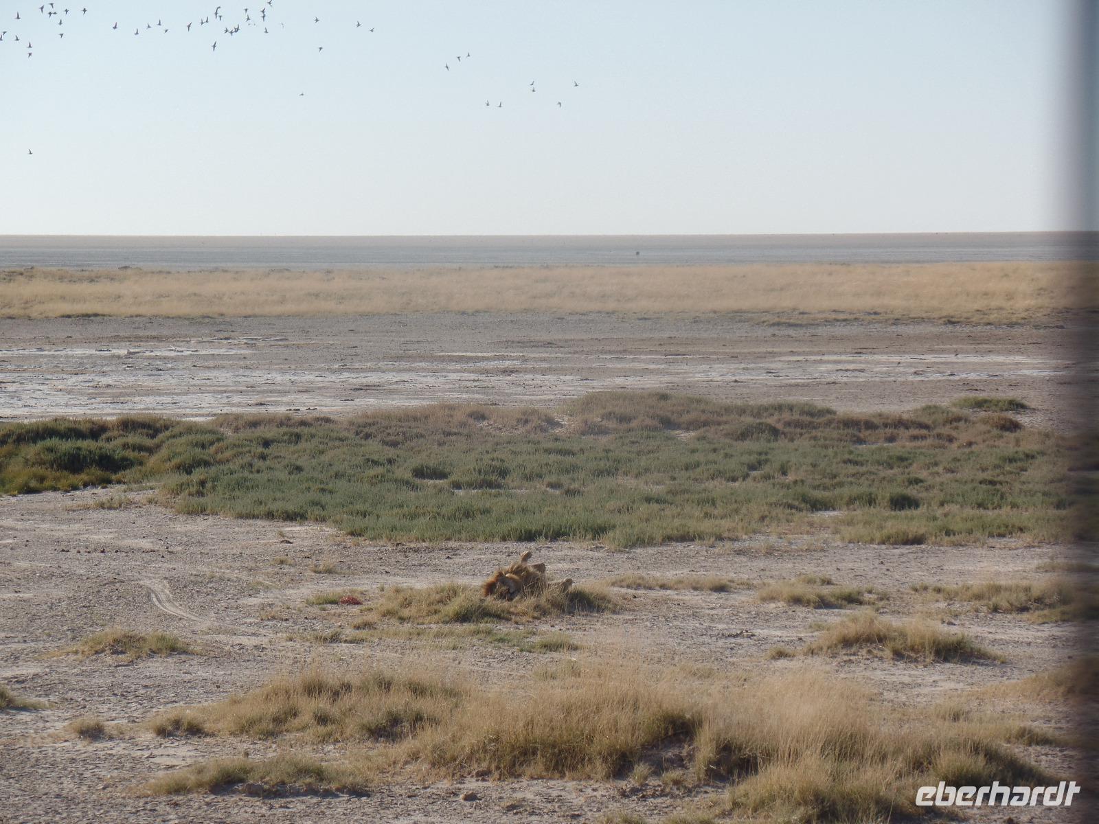 So wie gestern verbrachten wir die Mittagstunden beim gemütlichen Picknick in einem schattigen Camp direkt im Park. Hier konnte man sich was zum Essen bestellen oder zum Wasserloch laufen, um Tiere zu beobachten. Eberhardt Travel lud heute alle Gäste zum Eis ein. War eine gute Idee, oder? Am frühenNachmittag fuhren wir direkt am Rand von dem Herzstück des Parks, die 100 Kilometer lange Etosha-Pfanne. Eine große, weiße Fläche, wie der Name aus der Sansprache bedeutet, breitet sich ins Unendliche aus. Die weiße, nichtgreifbare Weite zieht uns alle magisch in ihren Bann.