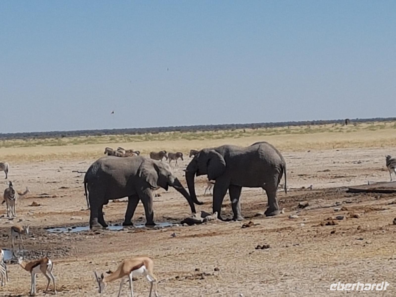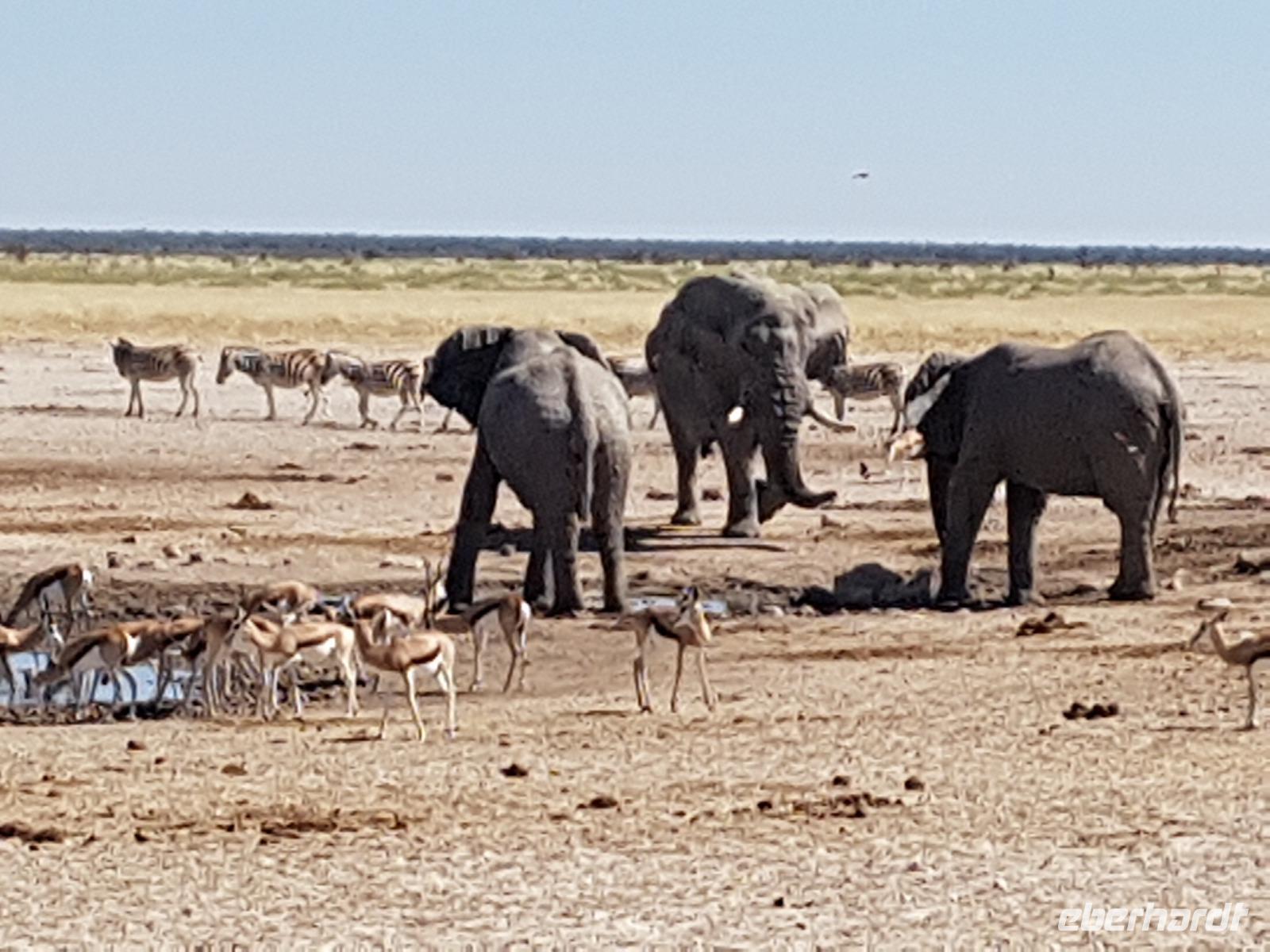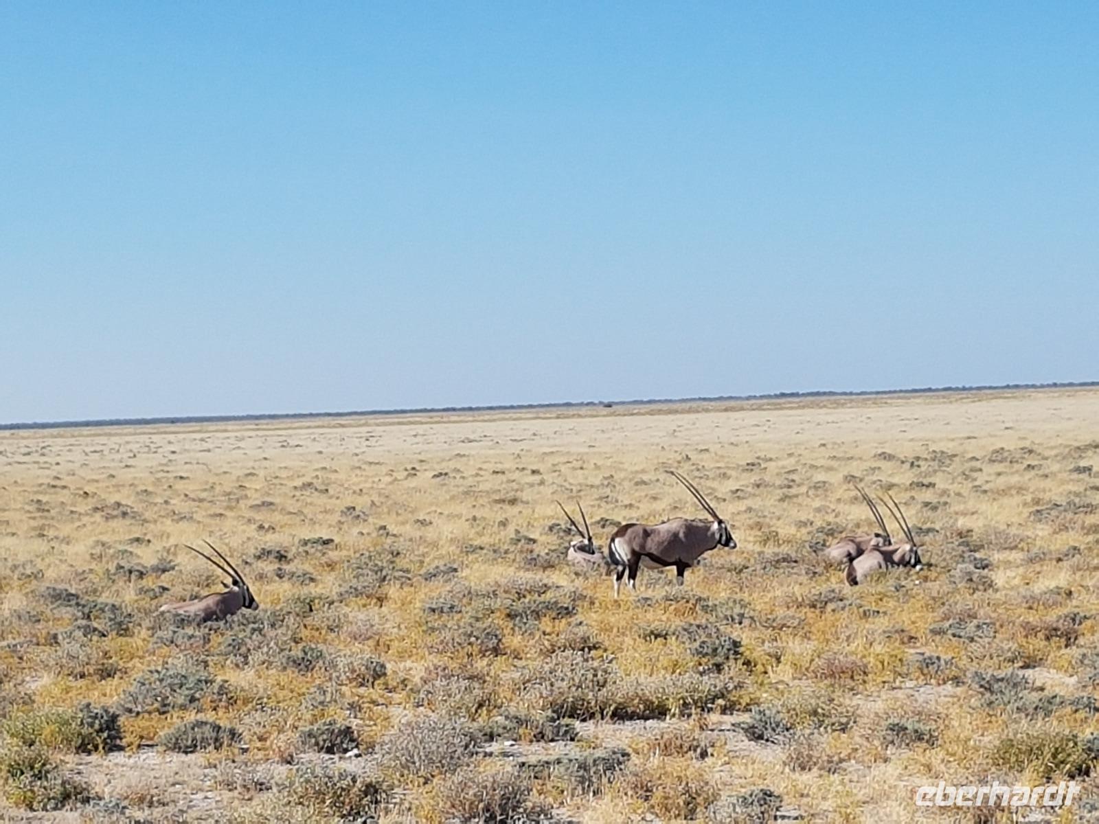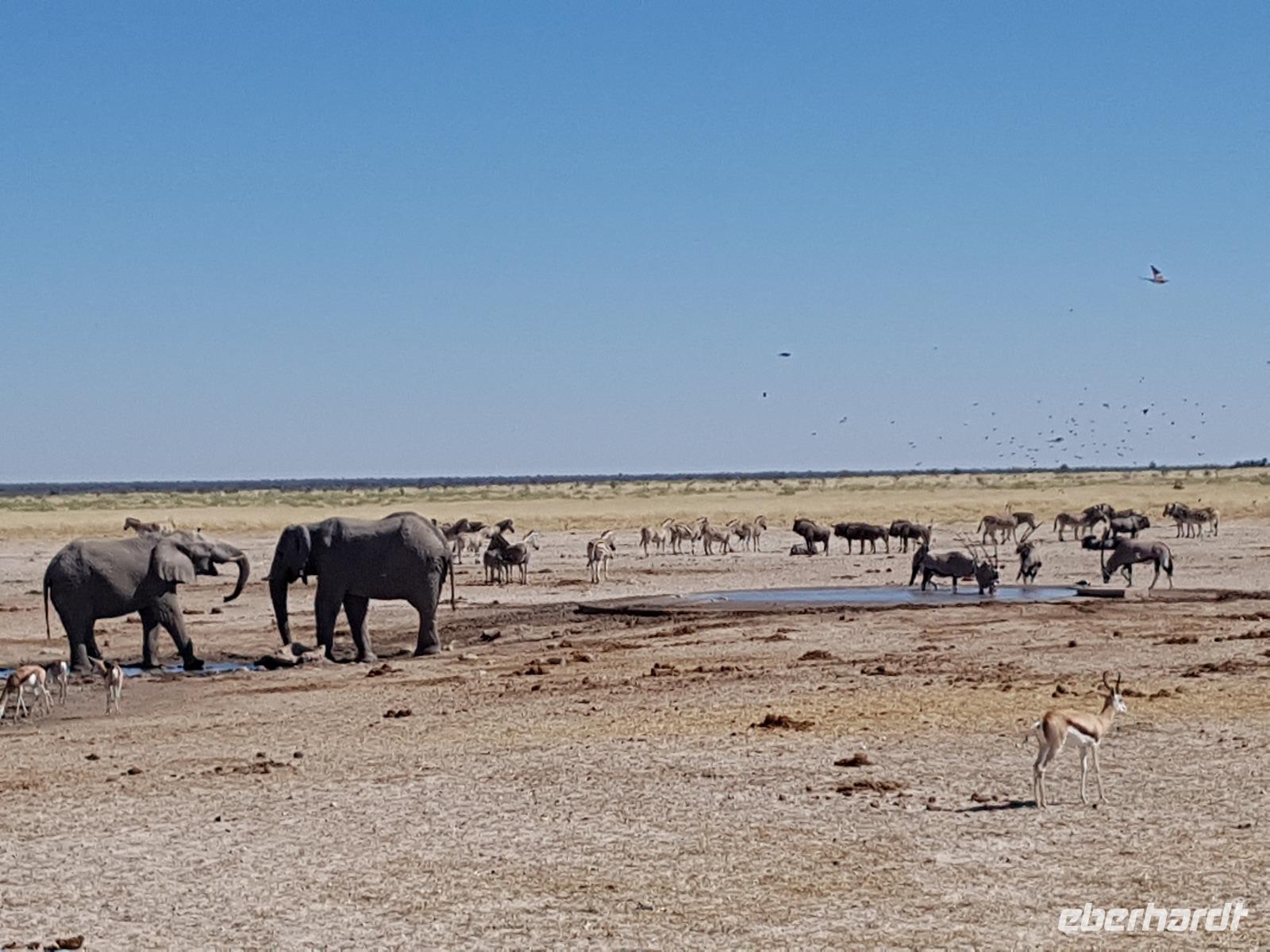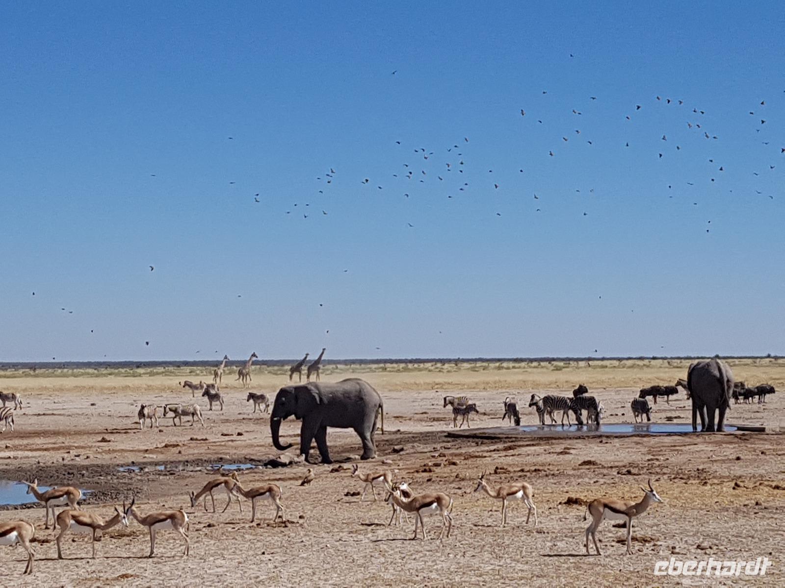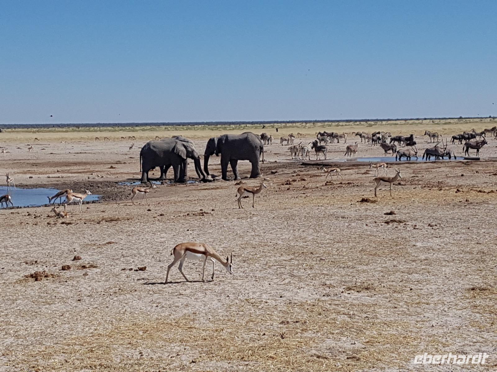 So wie gestern verbrachten wir die Mittagstunden beim gemütlichen Picknick in einem schattigen Camp direkt im Park. Hier konnte man sich was zum Essen bestellen oder zum Wasserloch laufen, um Tiere zu beobachten. Eberhardt Travel lud heute alle Gäste zum Eis ein. War eine gute Idee, oder? Am frühenNachmittag fuhren wir direkt am Rand von dem Herzstück des Parks, die 100 Kilometer lange Etosha-Pfanne. Eine große, weiße Fläche, wie der Name aus der Sansprache bedeutet, breitet sich ins Unendliche aus. Die weiße, nichtgreifbare Weite zieht uns alle magisch in ihren Bann.