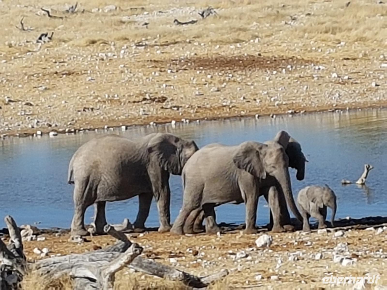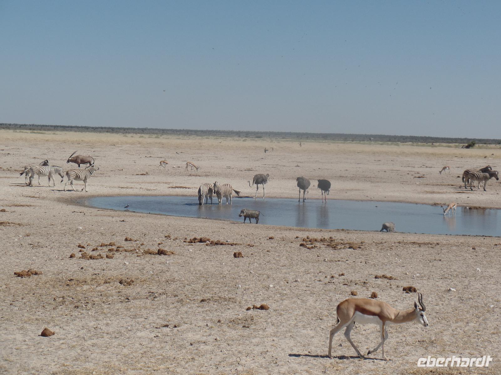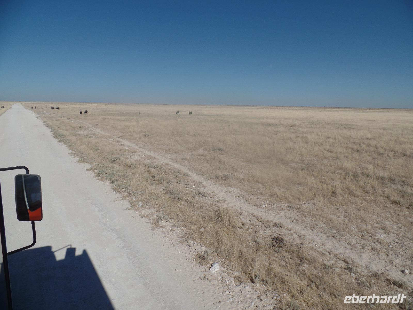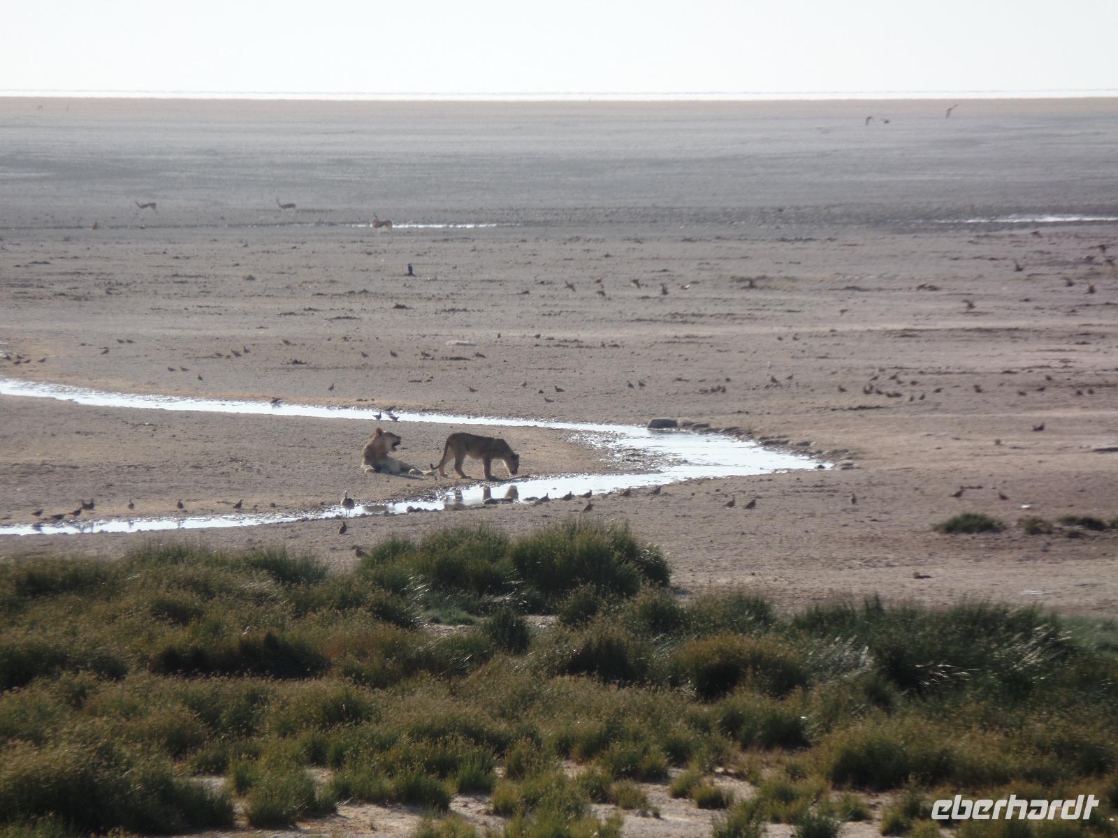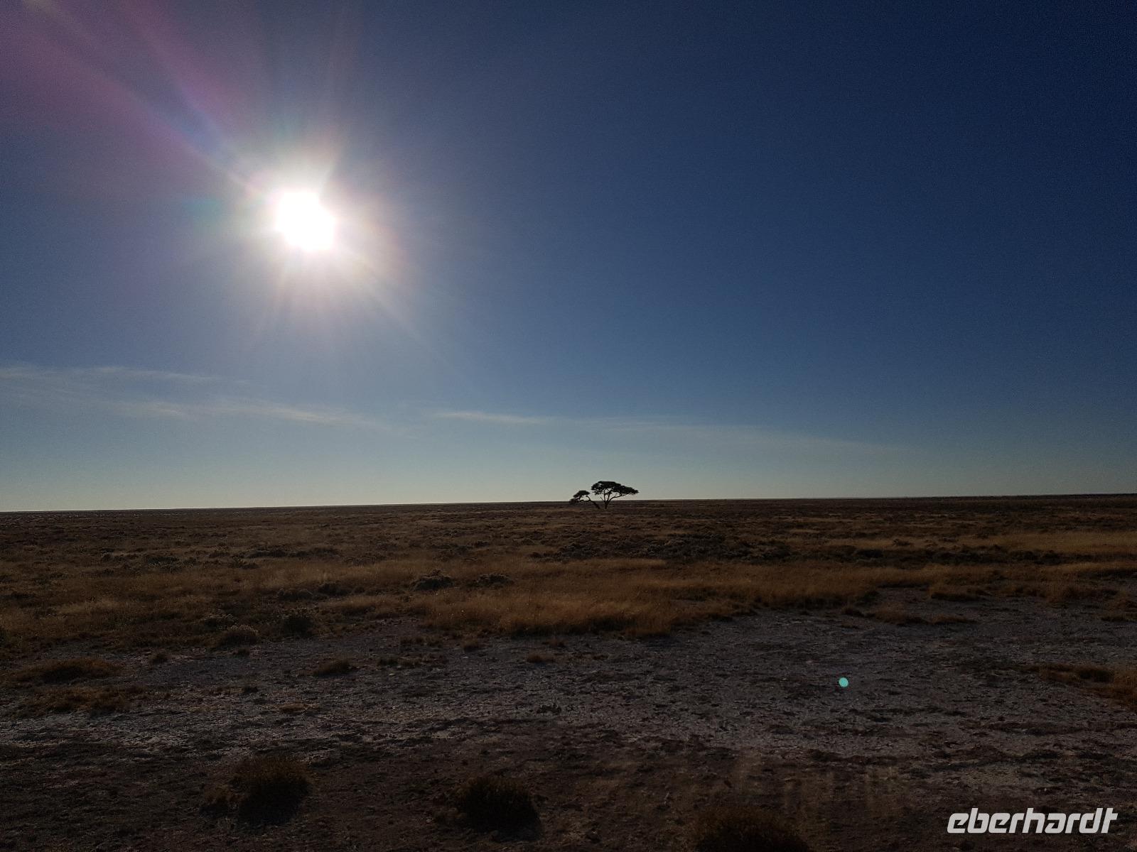 So wie gestern verbrachten wir die Mittagstunden beim gemütlichen Picknick in einem schattigen Camp direkt im Park. Hier konnte man sich was zum Essen bestellen oder zum Wasserloch laufen, um Tiere zu beobachten. Eberhardt Travel lud heute alle Gäste zum Eis ein. War eine gute Idee, oder? Am frühenNachmittag fuhren wir direkt am Rand von dem Herzstück des Parks, die 100 Kilometer lange Etosha-Pfanne. Eine große, weiße Fläche, wie der Name aus der Sansprache bedeutet, breitet sich ins Unendliche aus. Die weiße, nichtgreifbare Weite zieht uns alle magisch in ihren Bann.