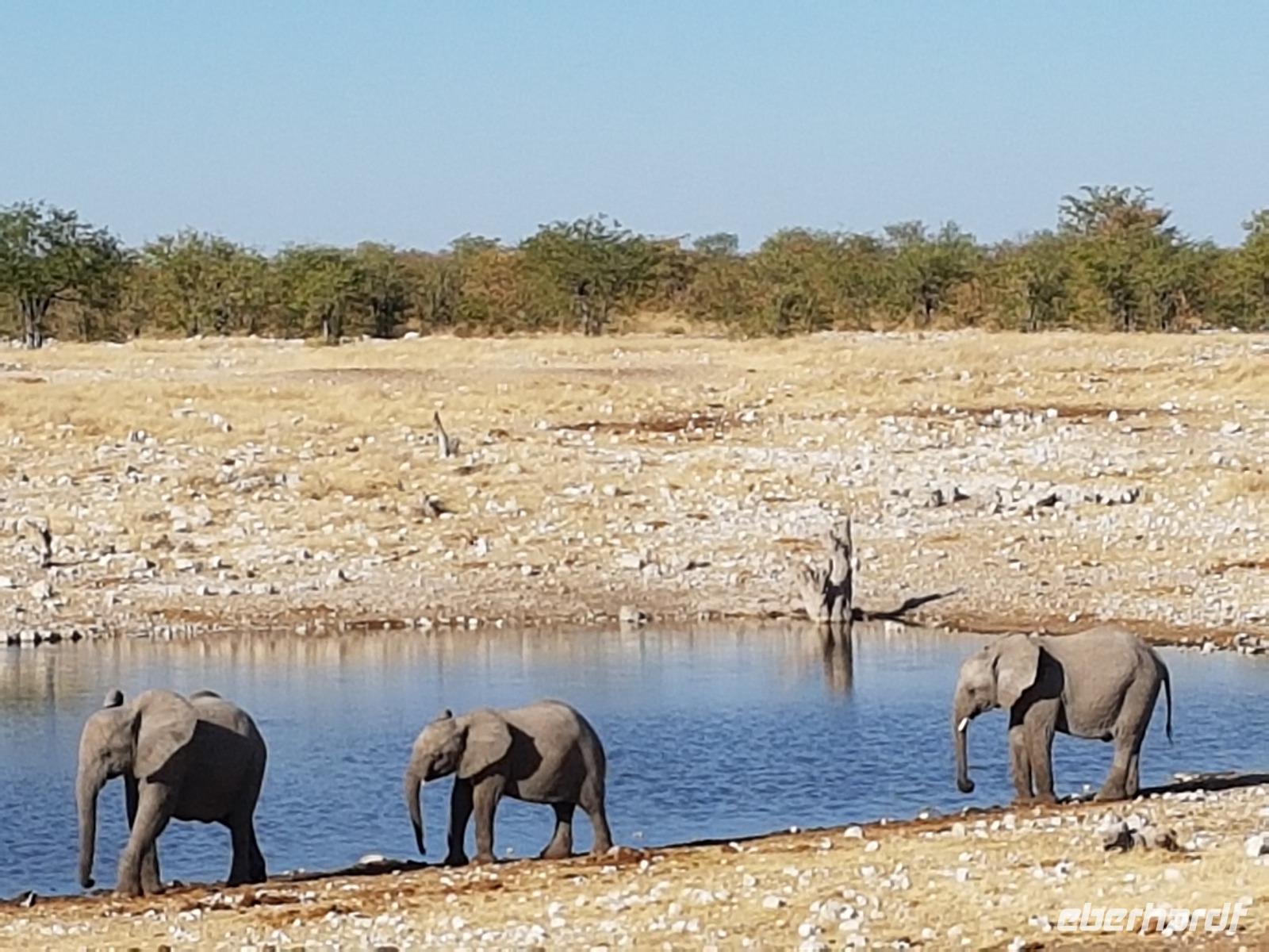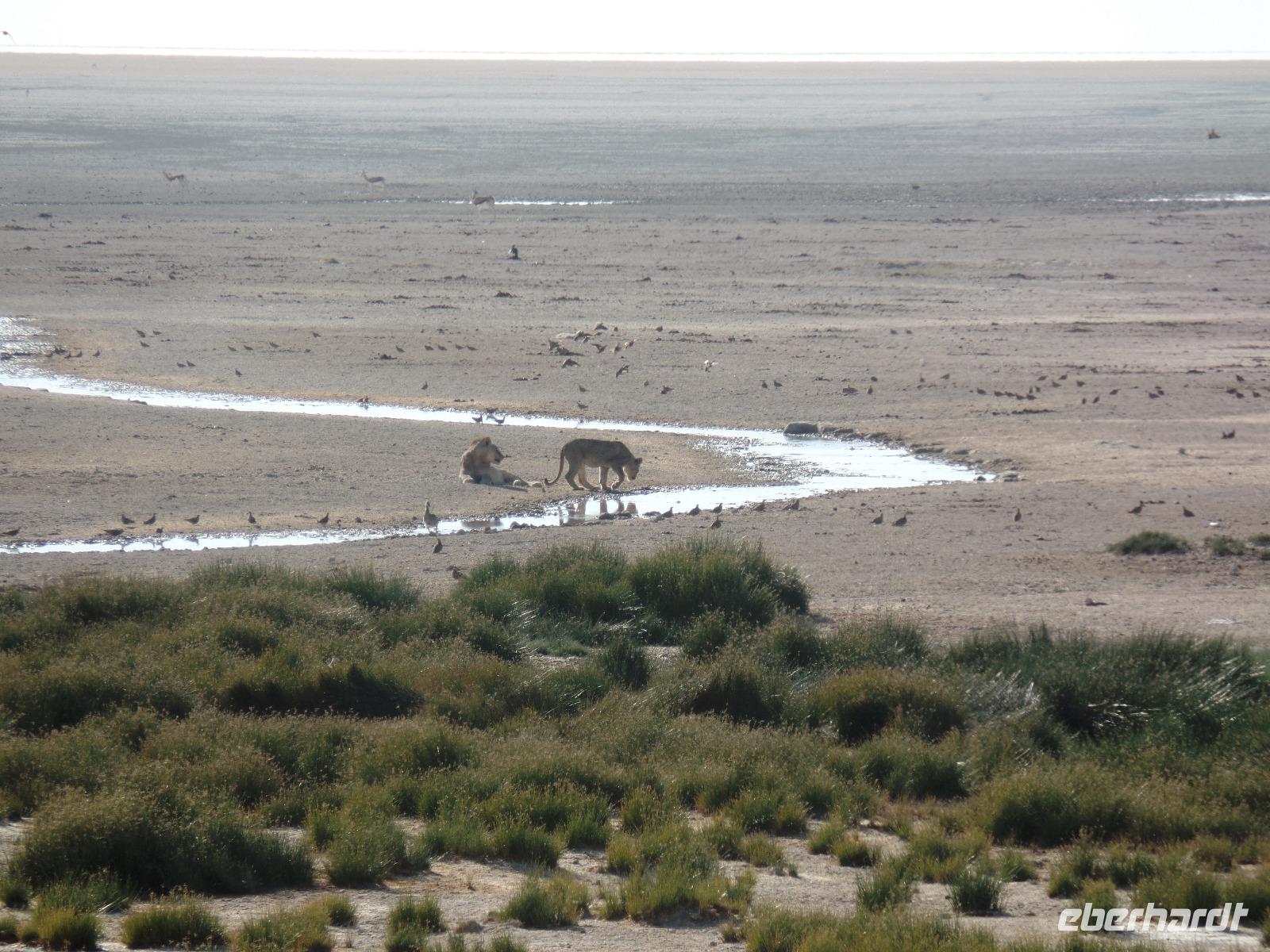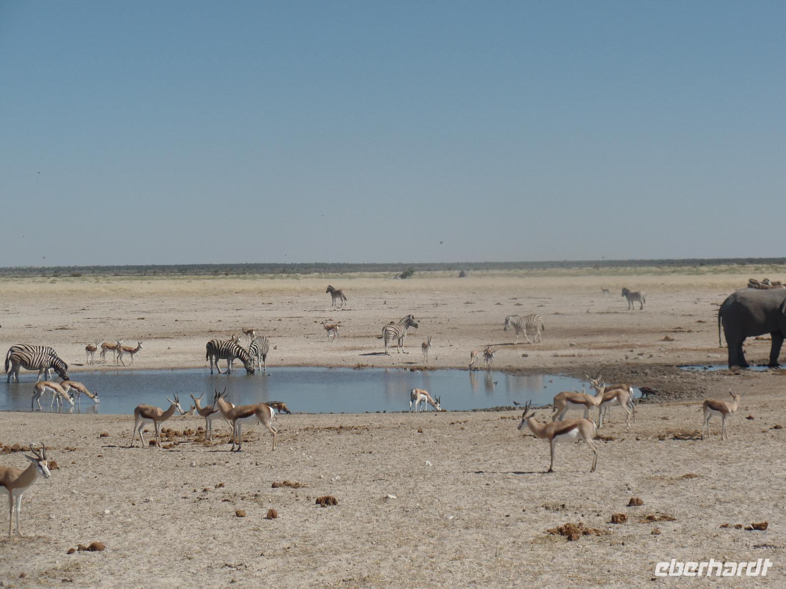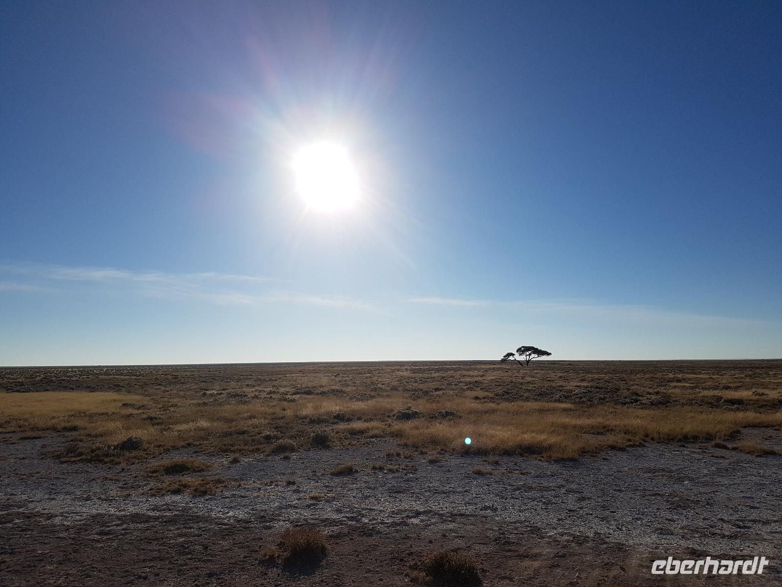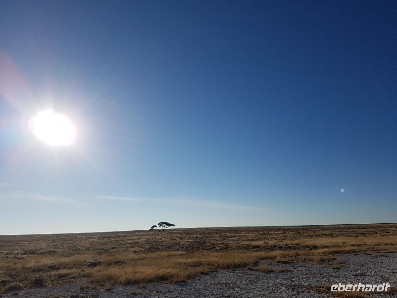 So wie gestern verbrachten wir die Mittagstunden beim gemütlichen Picknick in einem schattigen Camp direkt im Park. Hier konnte man sich was zum Essen bestellen oder zum Wasserloch laufen, um Tiere zu beobachten. Eberhardt Travel lud heute alle Gäste zum Eis ein. War eine gute Idee, oder? Am frühenNachmittag fuhren wir direkt am Rand von dem Herzstück des Parks, die 100 Kilometer lange Etosha-Pfanne. Eine große, weiße Fläche, wie der Name aus der Sansprache bedeutet, breitet sich ins Unendliche aus. Die weiße, nichtgreifbare Weite zieht uns alle magisch in ihren Bann.