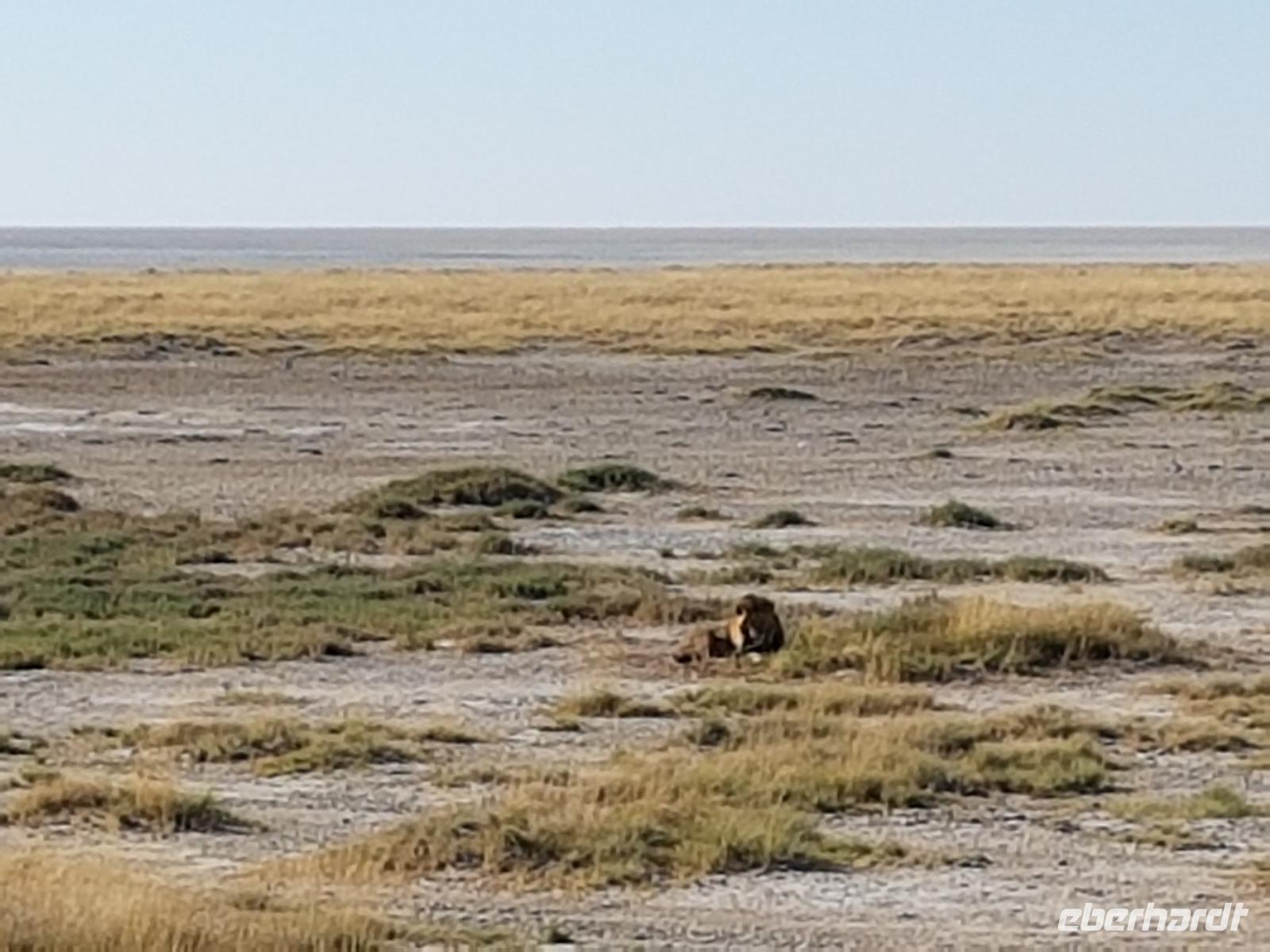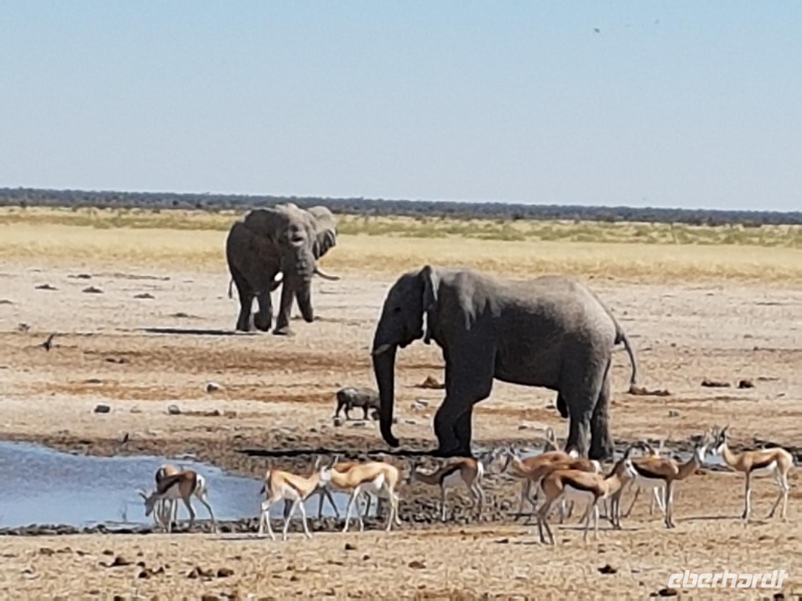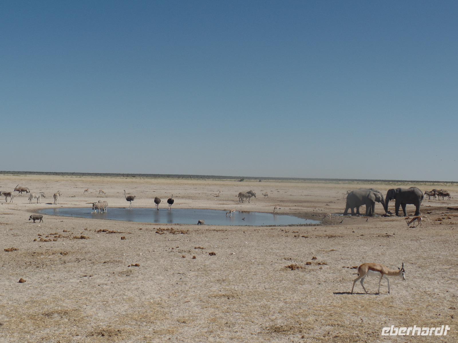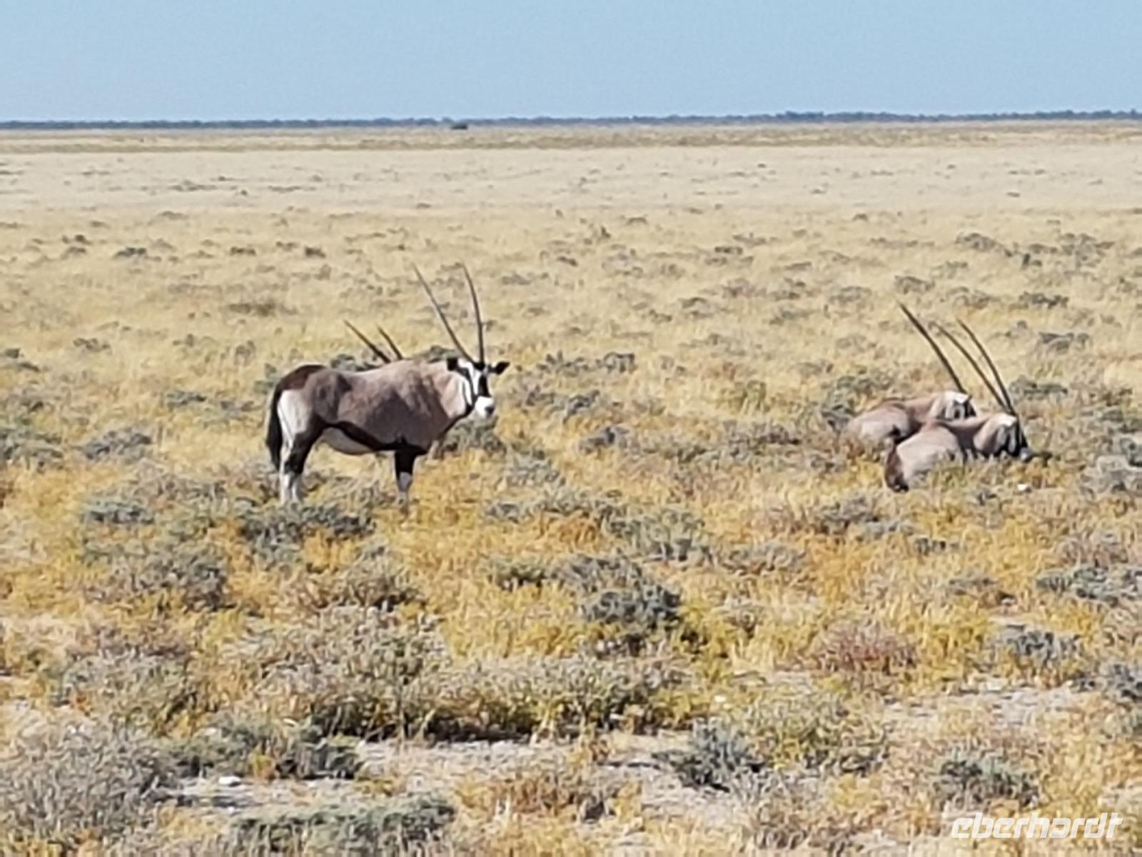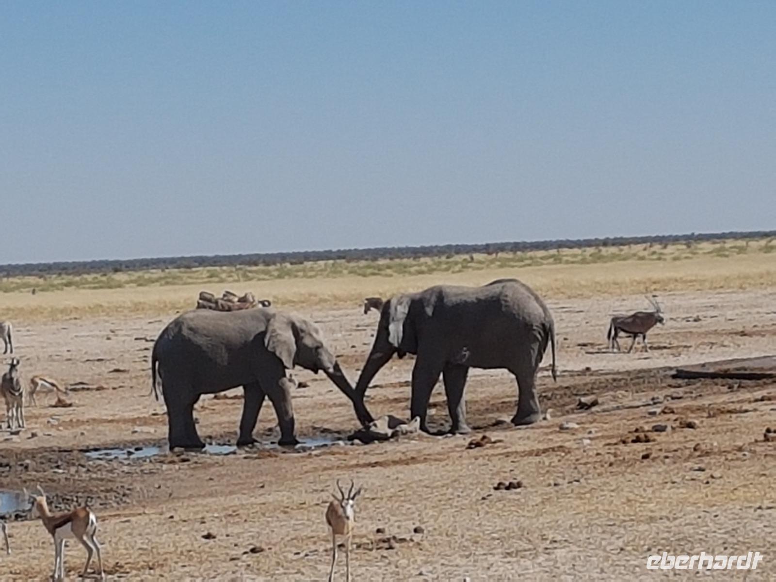 So wie gestern verbrachten wir die Mittagstunden beim gemütlichen Picknick in einem schattigen Camp direkt im Park. Hier konnte man sich was zum Essen bestellen oder zum Wasserloch laufen, um Tiere zu beobachten. Eberhardt Travel lud heute alle Gäste zum Eis ein. War eine gute Idee, oder? Am frühenNachmittag fuhren wir direkt am Rand von dem Herzstück des Parks, die 100 Kilometer lange Etosha-Pfanne. Eine große, weiße Fläche, wie der Name aus der Sansprache bedeutet, breitet sich ins Unendliche aus. Die weiße, nichtgreifbare Weite zieht uns alle magisch in ihren Bann.