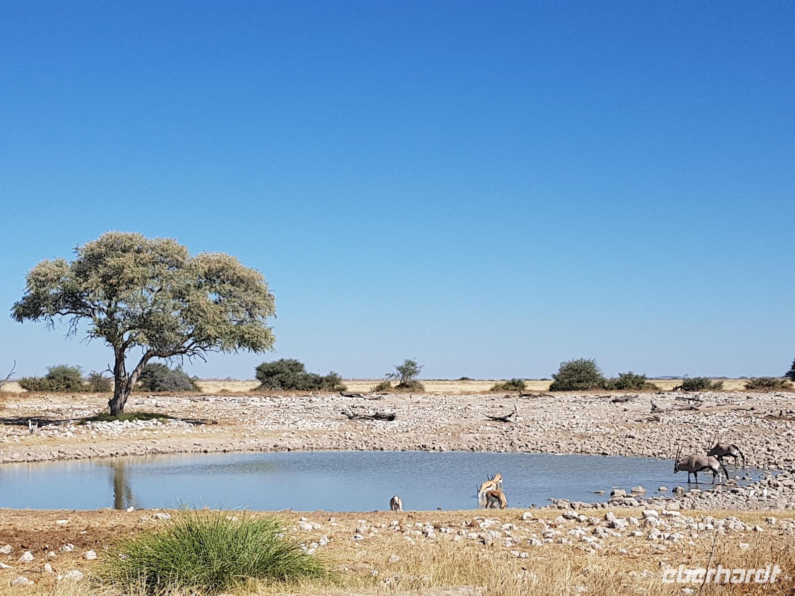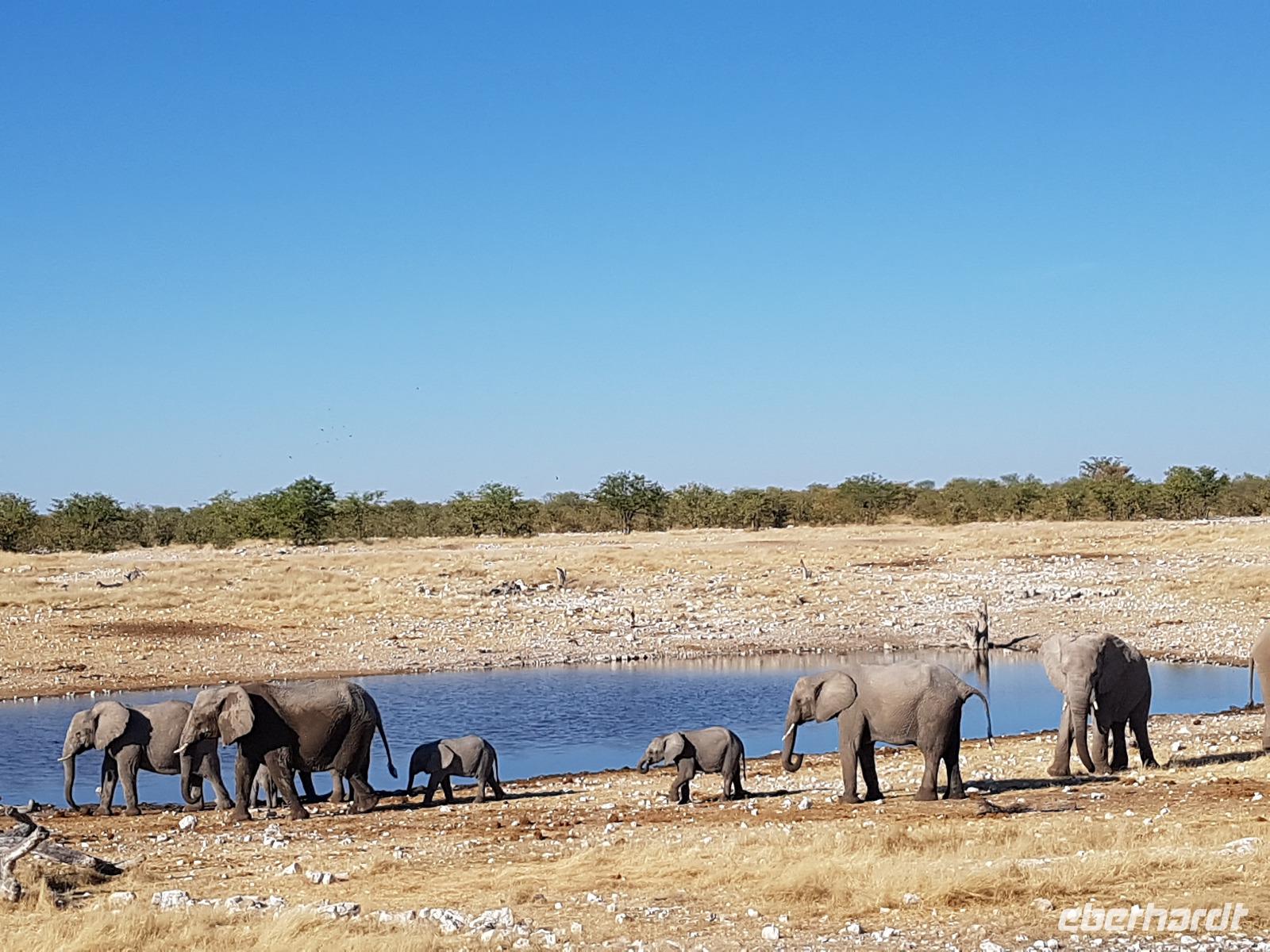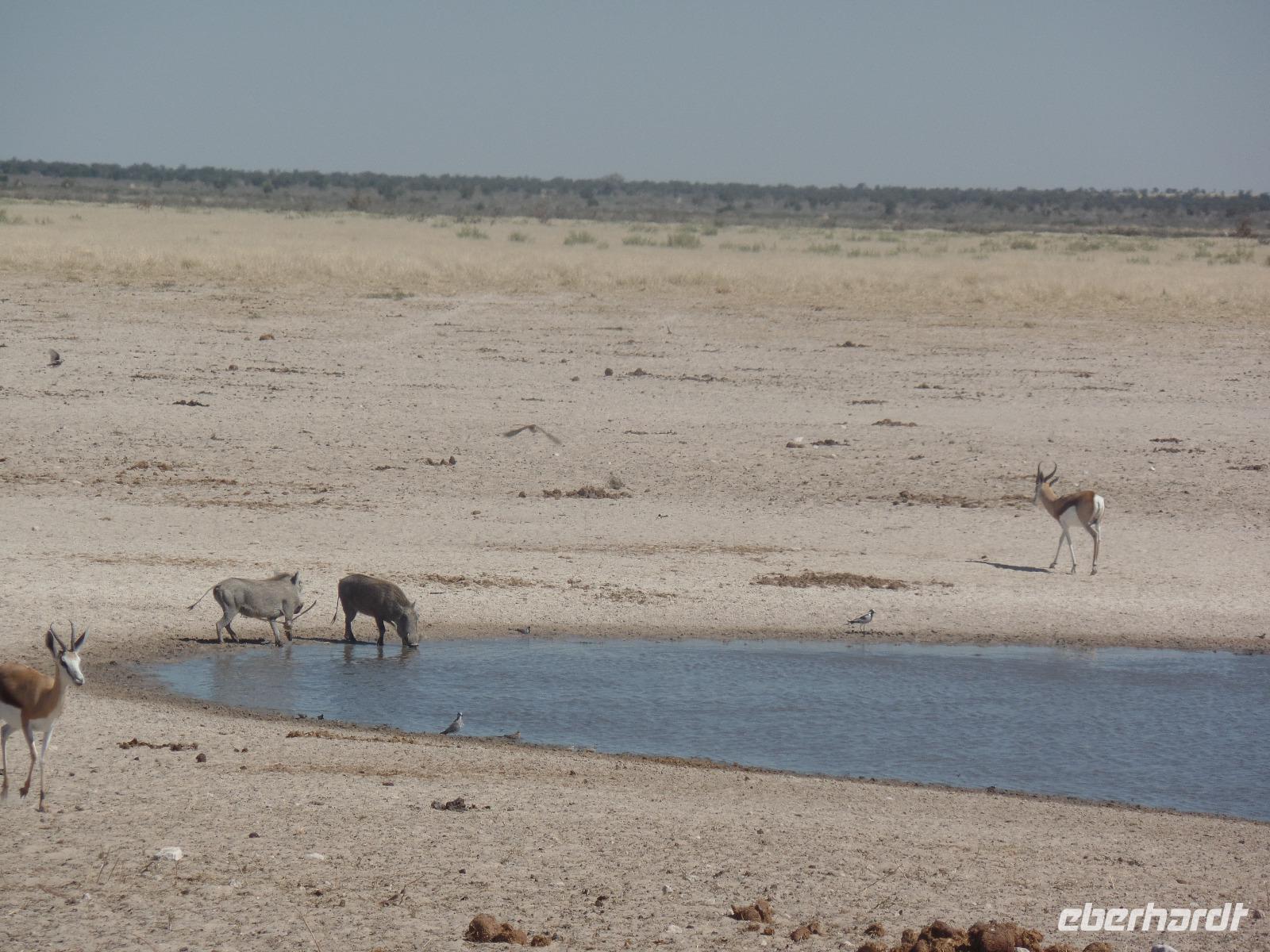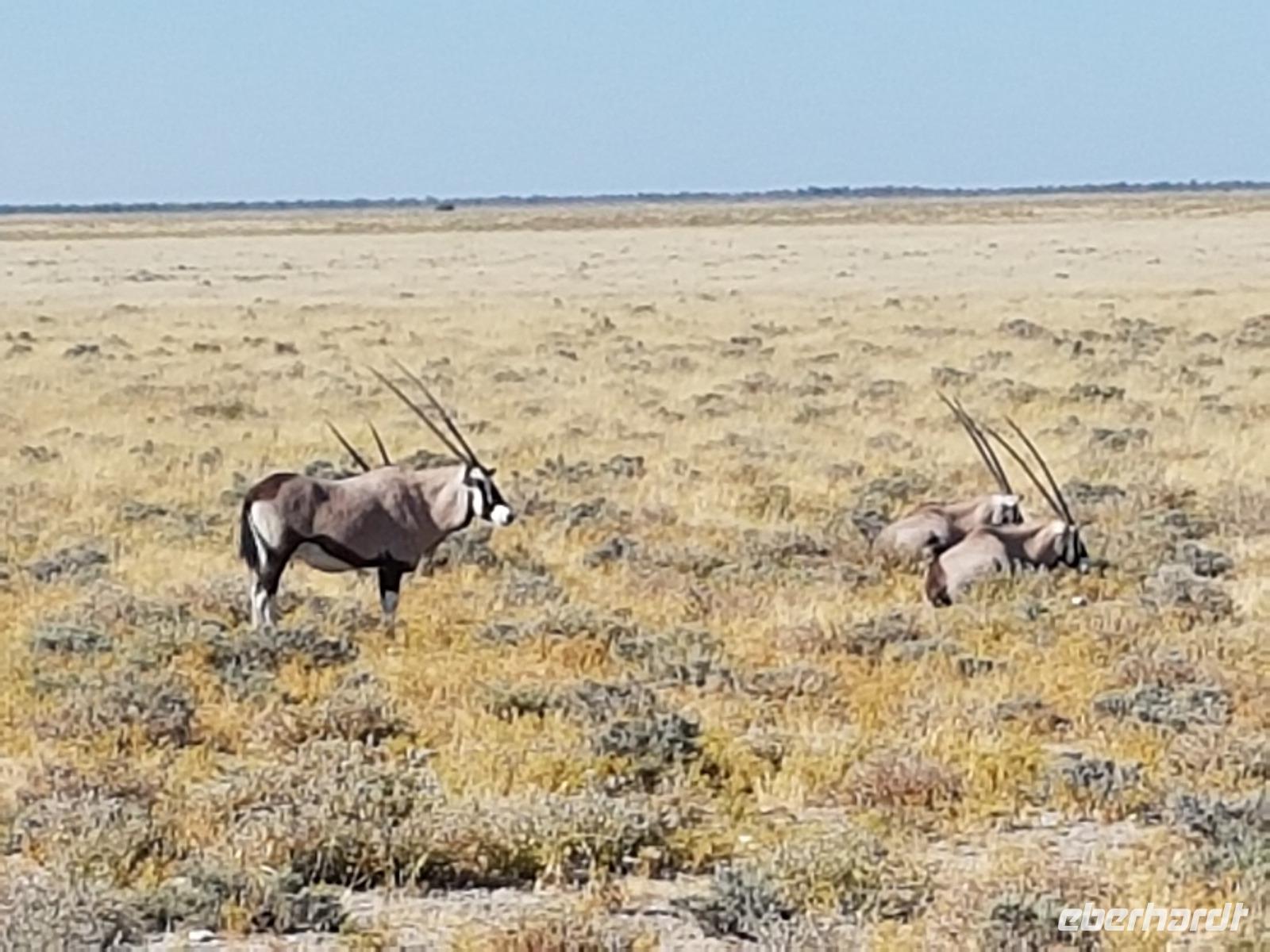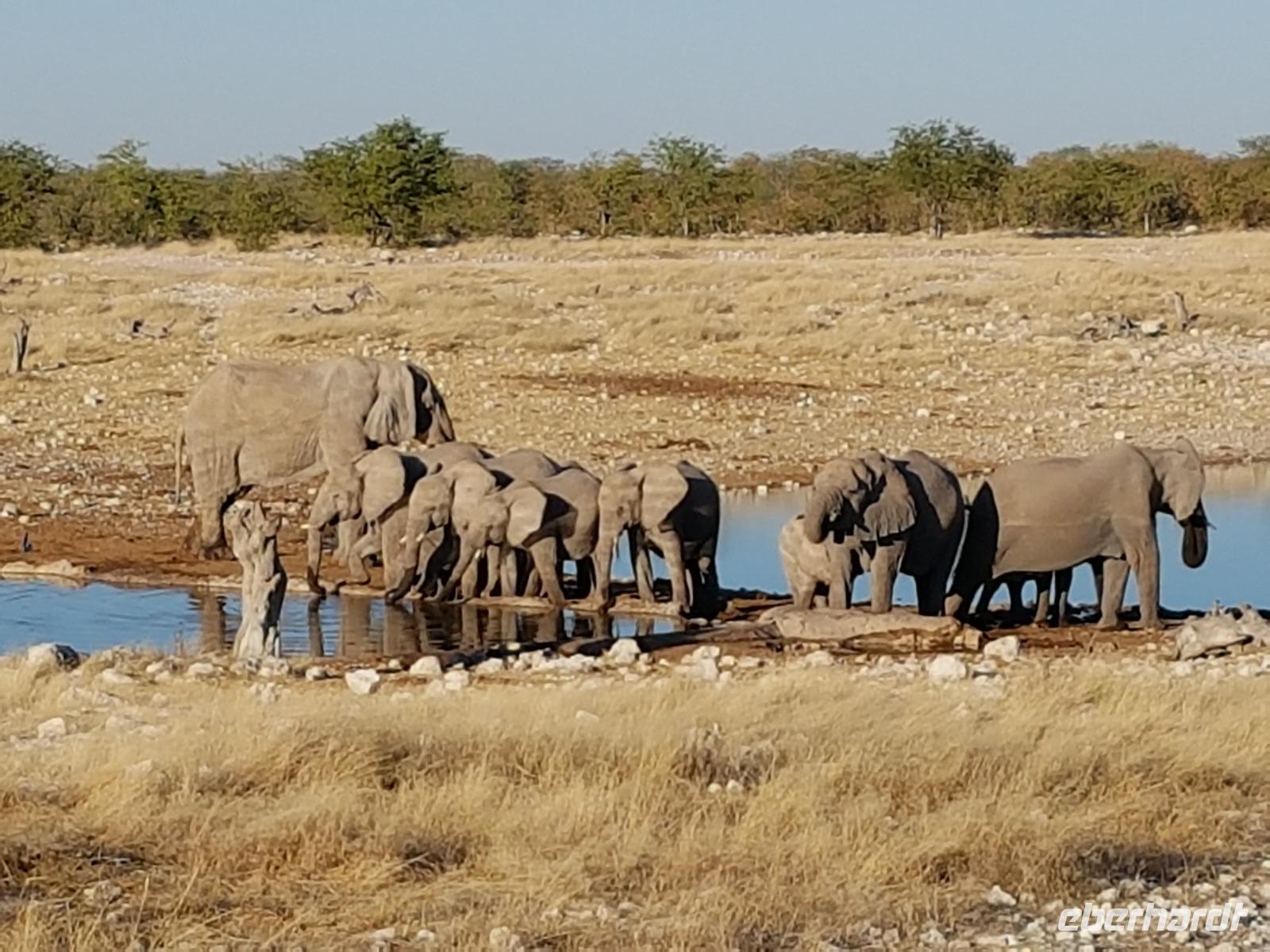 So wie gestern verbrachten wir die Mittagstunden beim gemütlichen Picknick in einem schattigen Camp direkt im Park. Hier konnte man sich was zum Essen bestellen oder zum Wasserloch laufen, um Tiere zu beobachten. Eberhardt Travel lud heute alle Gäste zum Eis ein. War eine gute Idee, oder? Am frühenNachmittag fuhren wir direkt am Rand von dem Herzstück des Parks, die 100 Kilometer lange Etosha-Pfanne. Eine große, weiße Fläche, wie der Name aus der Sansprache bedeutet, breitet sich ins Unendliche aus. Die weiße, nichtgreifbare Weite zieht uns alle magisch in ihren Bann.