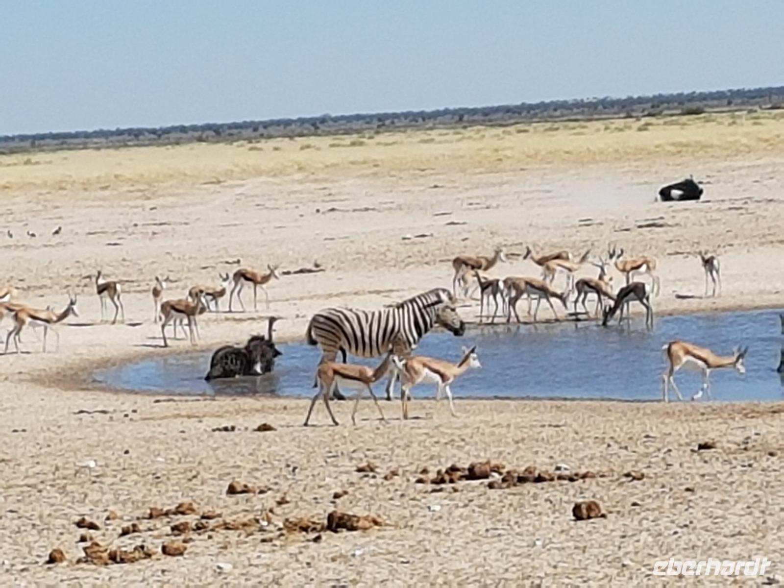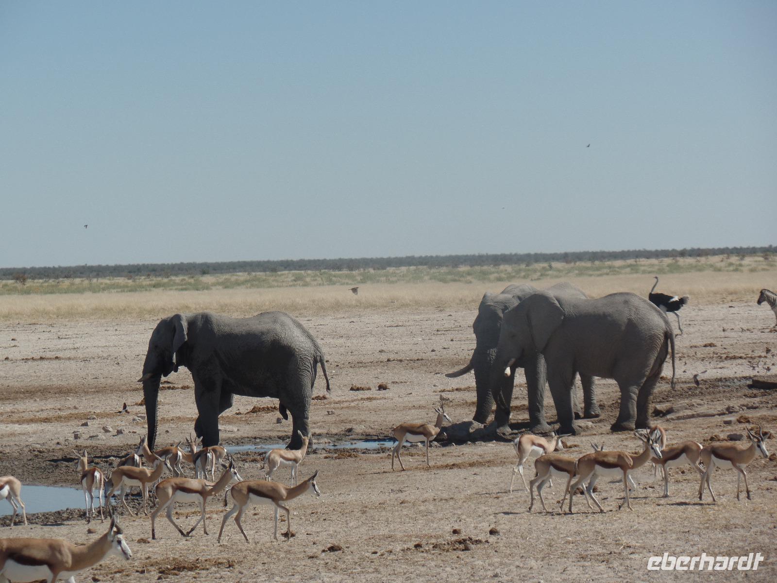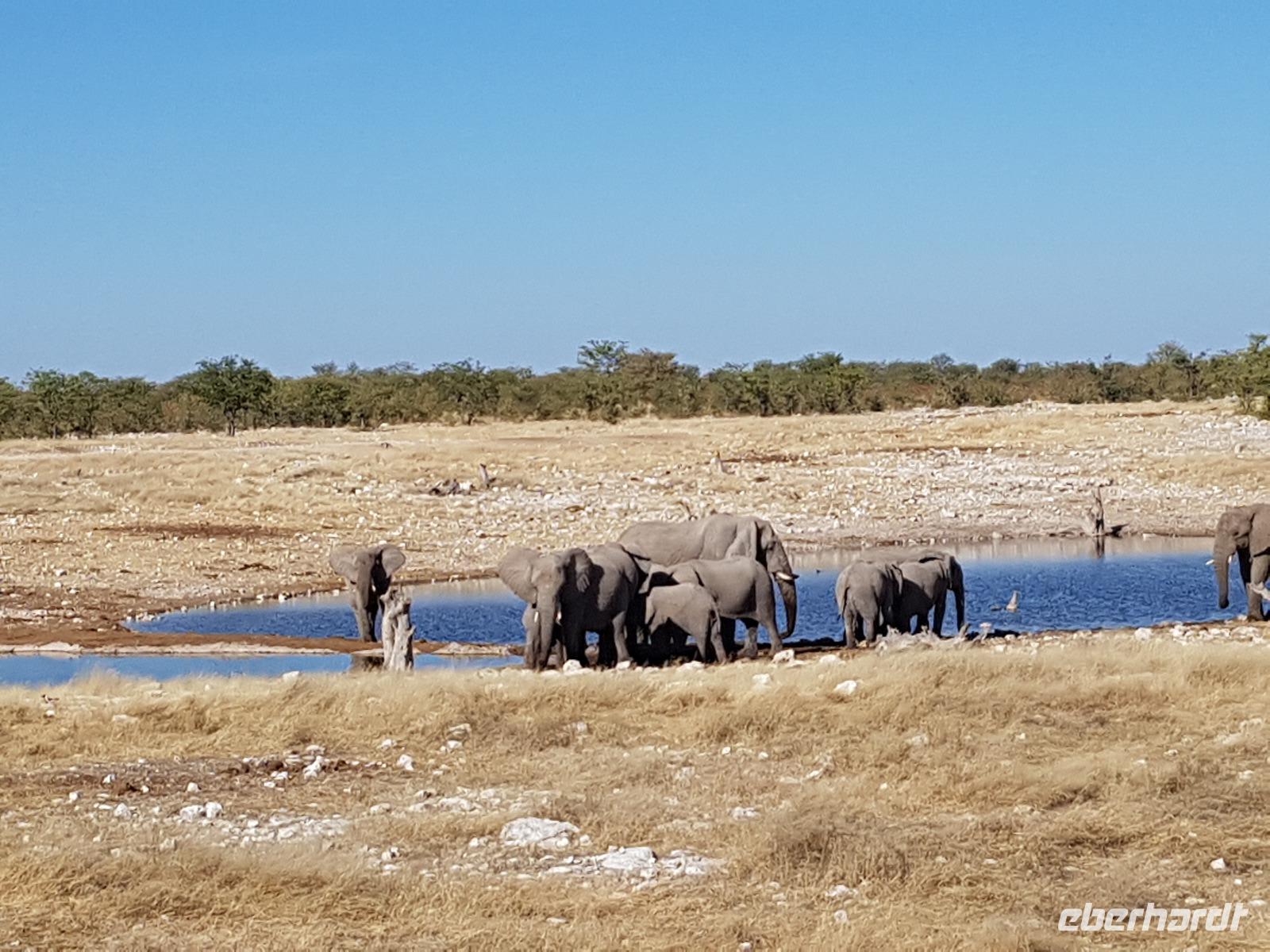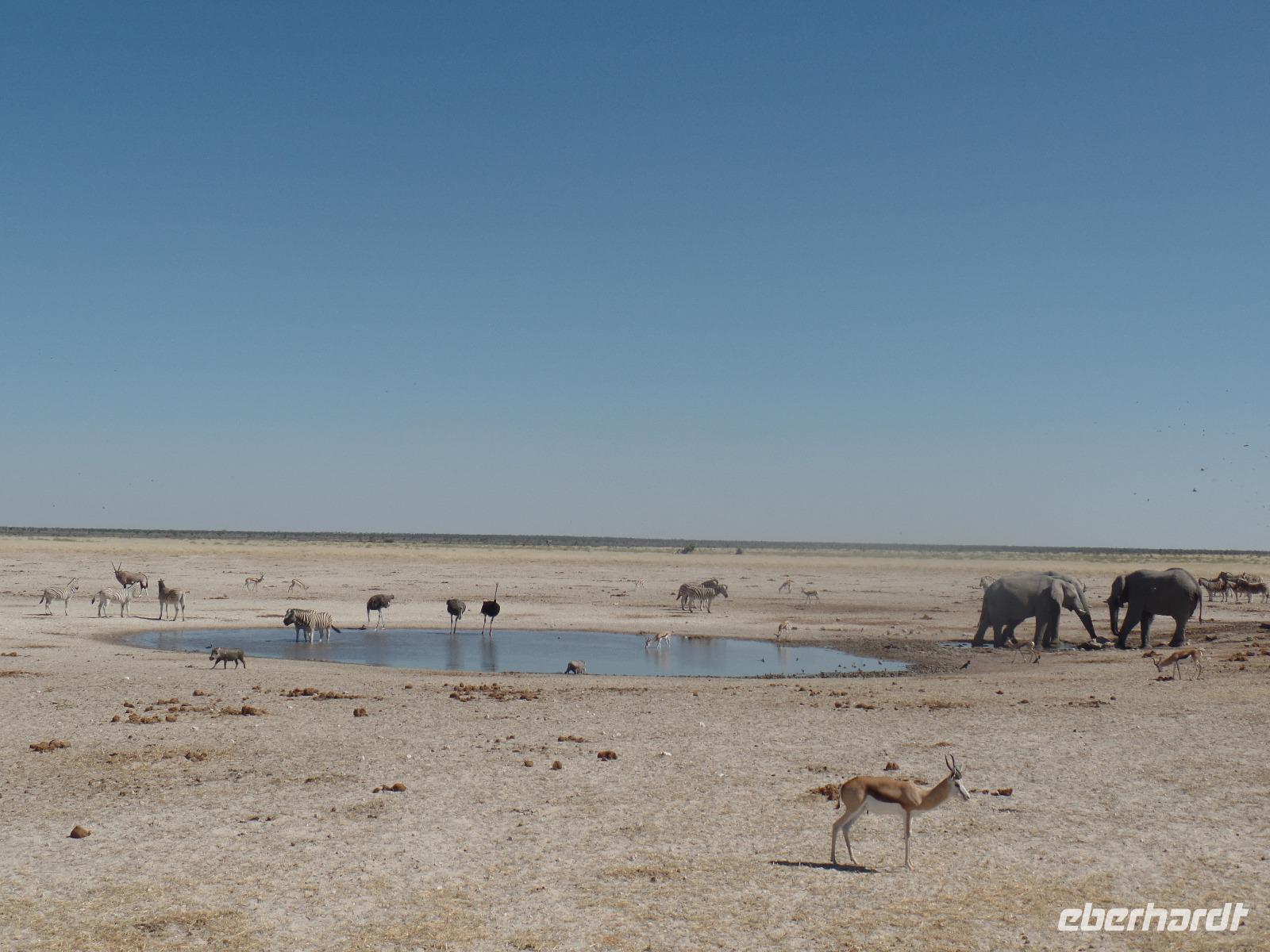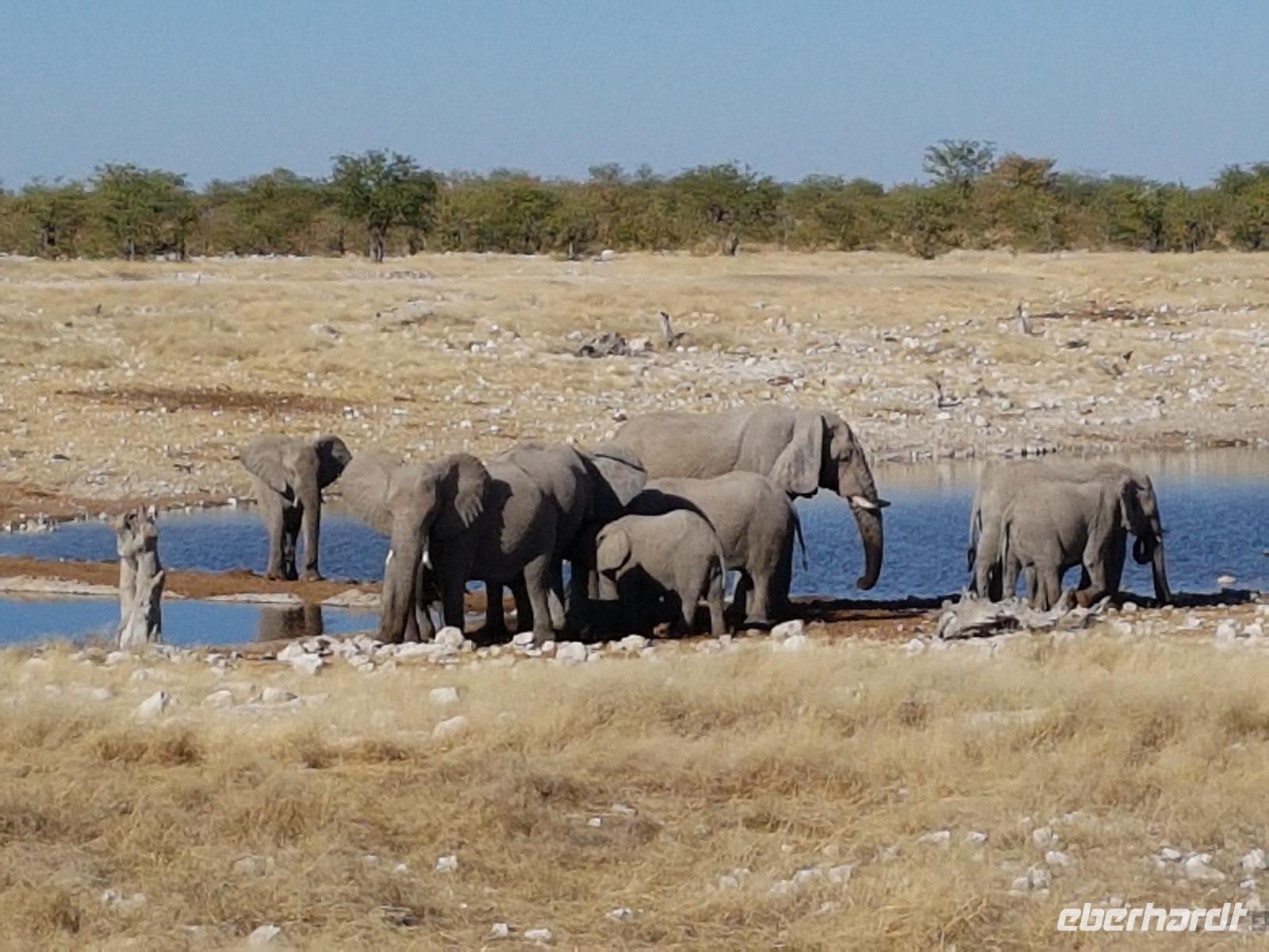 So wie gestern verbrachten wir die Mittagstunden beim gemütlichen Picknick in einem schattigen Camp direkt im Park. Hier konnte man sich was zum Essen bestellen oder zum Wasserloch laufen, um Tiere zu beobachten. Eberhardt Travel lud heute alle Gäste zum Eis ein. War eine gute Idee, oder? Am frühenNachmittag fuhren wir direkt am Rand von dem Herzstück des Parks, die 100 Kilometer lange Etosha-Pfanne. Eine große, weiße Fläche, wie der Name aus der Sansprache bedeutet, breitet sich ins Unendliche aus. Die weiße, nichtgreifbare Weite zieht uns alle magisch in ihren Bann.