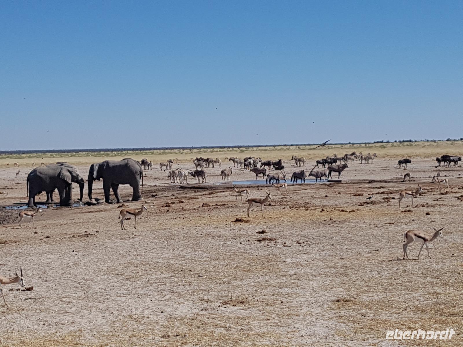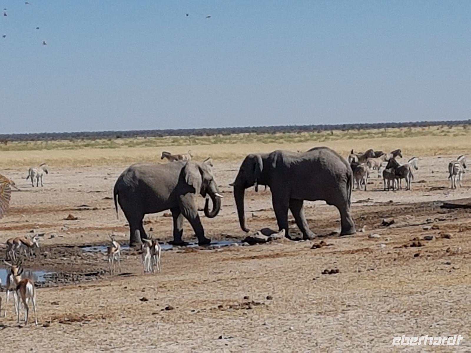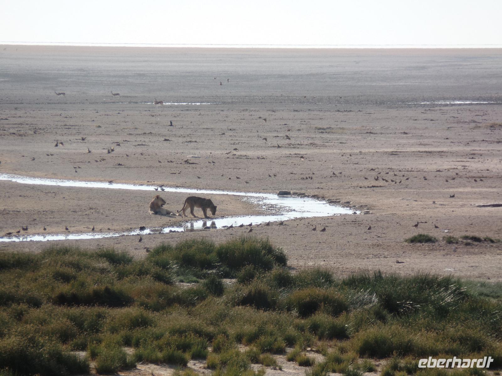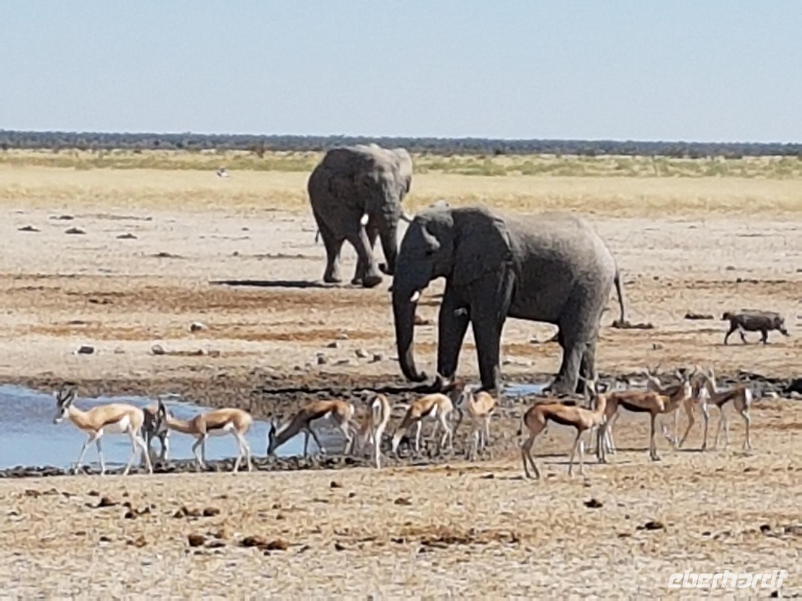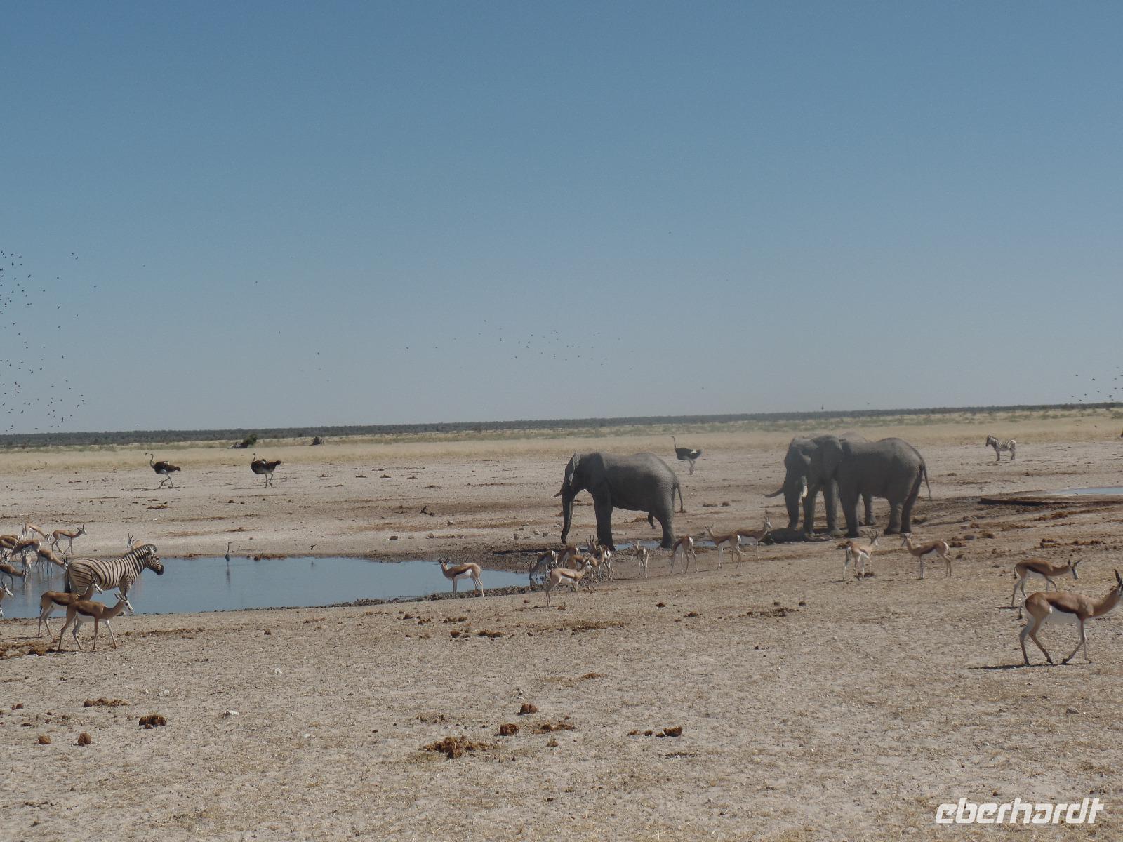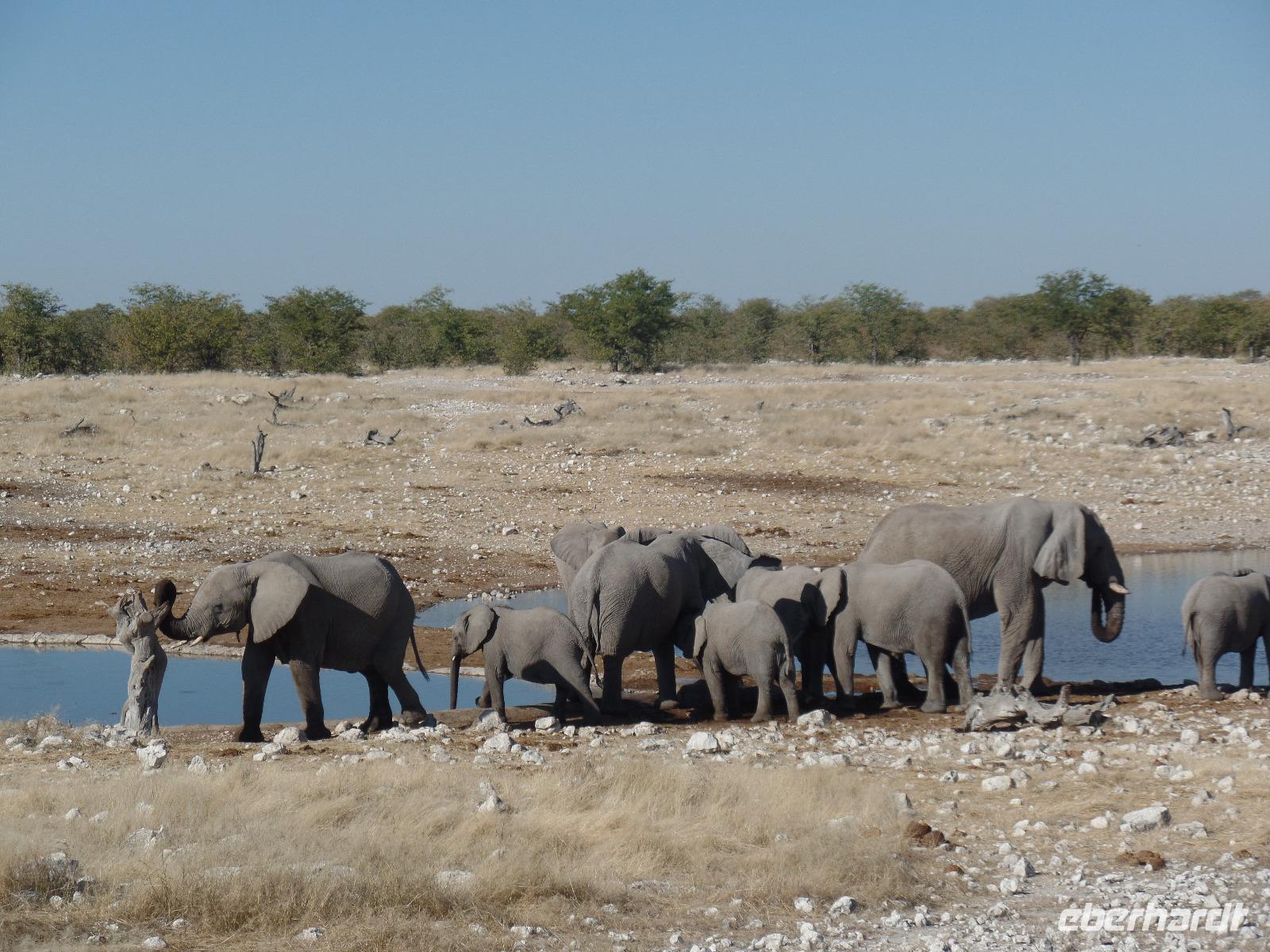 So wie gestern verbrachten wir die Mittagstunden beim gemütlichen Picknick in einem schattigen Camp direkt im Park. Hier konnte man sich was zum Essen bestellen oder zum Wasserloch laufen, um Tiere zu beobachten. Eberhardt Travel lud heute alle Gäste zum Eis ein. War eine gute Idee, oder? Am frühenNachmittag fuhren wir direkt am Rand von dem Herzstück des Parks, die 100 Kilometer lange Etosha-Pfanne. Eine große, weiße Fläche, wie der Name aus der Sansprache bedeutet, breitet sich ins Unendliche aus. Die weiße, nichtgreifbare Weite zieht uns alle magisch in ihren Bann.