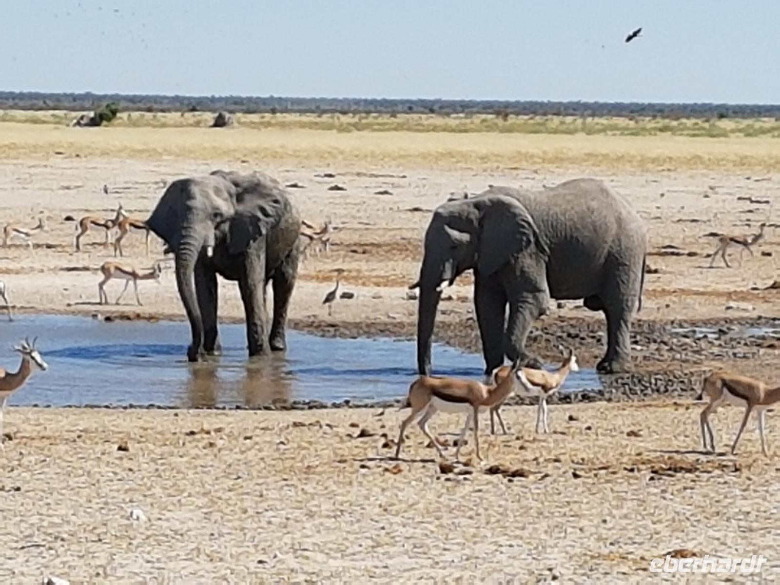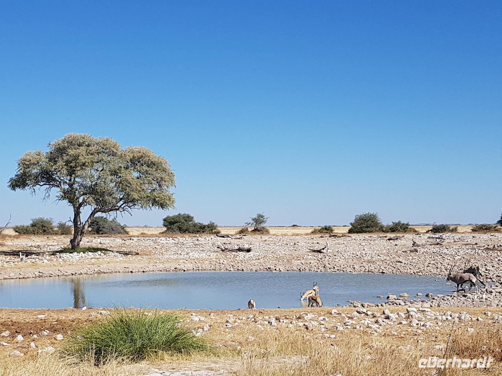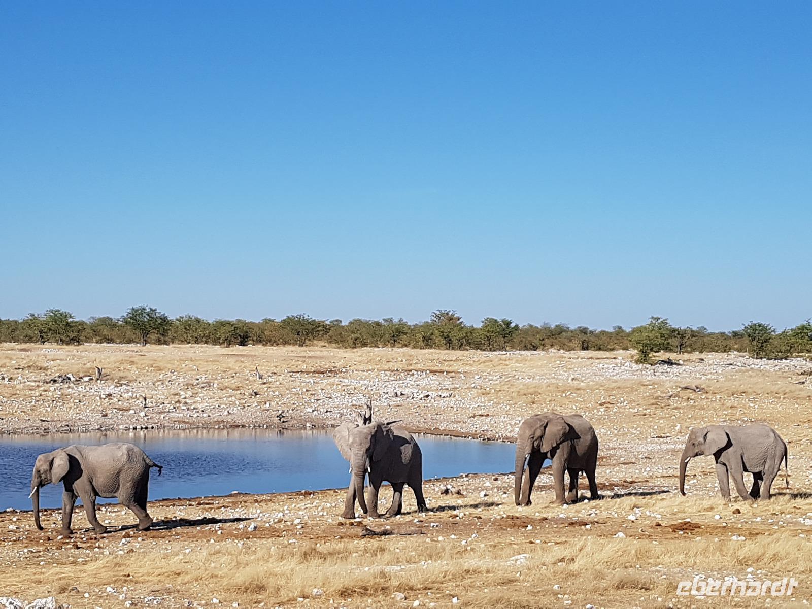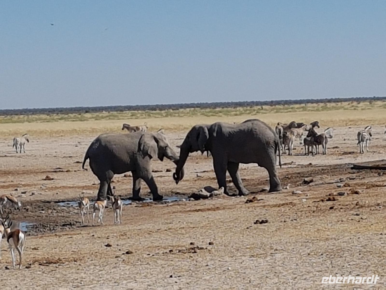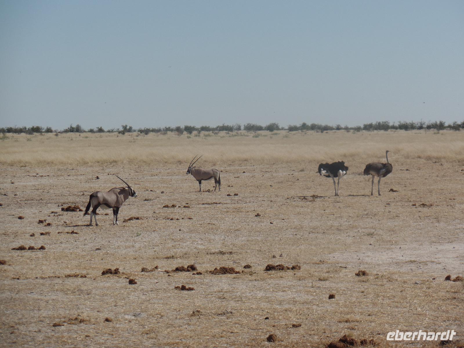 So wie gestern verbrachten wir die Mittagstunden beim gemütlichen Picknick in einem schattigen Camp direkt im Park. Hier konnte man sich was zum Essen bestellen oder zum Wasserloch laufen, um Tiere zu beobachten. Eberhardt Travel lud heute alle Gäste zum Eis ein. War eine gute Idee, oder? Am frühenNachmittag fuhren wir direkt am Rand von dem Herzstück des Parks, die 100 Kilometer lange Etosha-Pfanne. Eine große, weiße Fläche, wie der Name aus der Sansprache bedeutet, breitet sich ins Unendliche aus. Die weiße, nichtgreifbare Weite zieht uns alle magisch in ihren Bann.