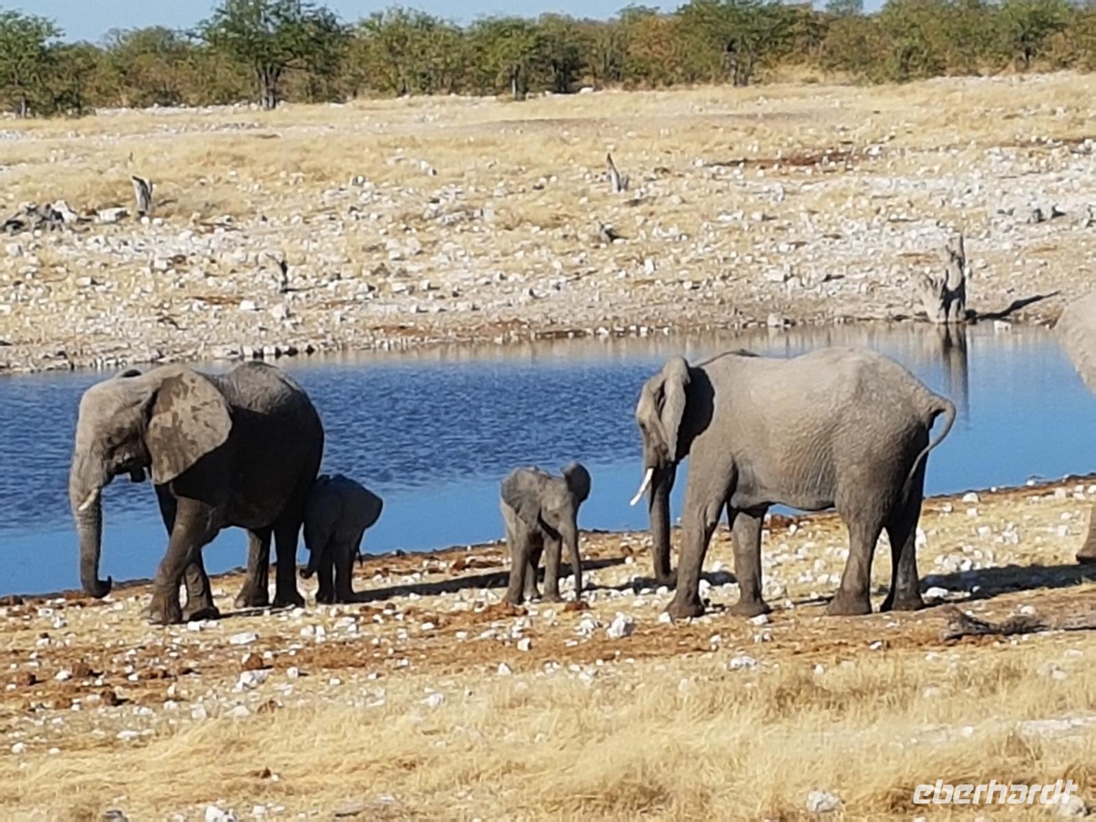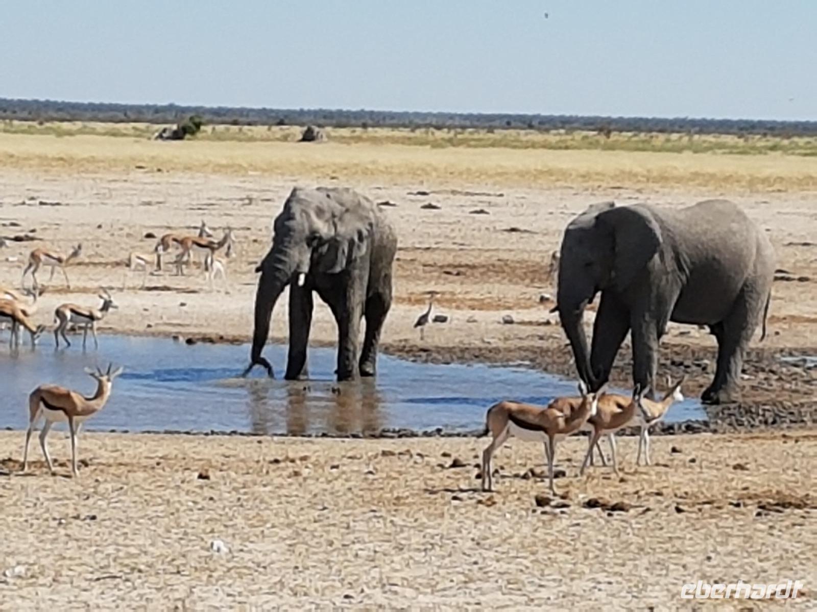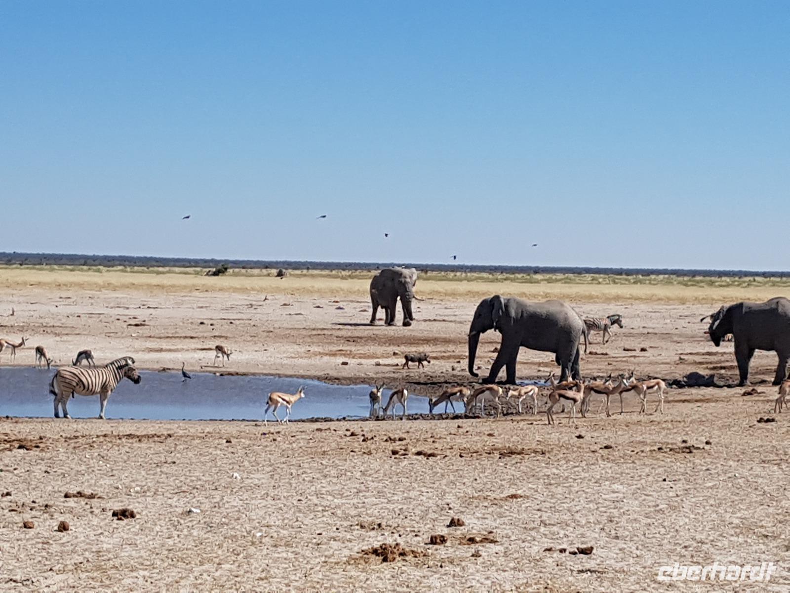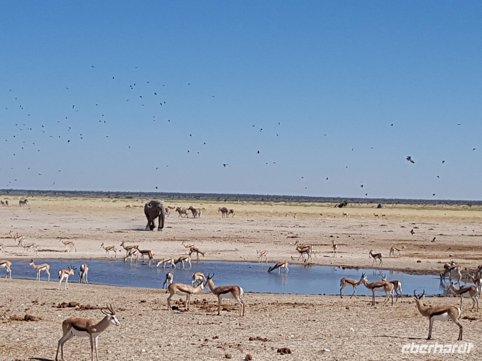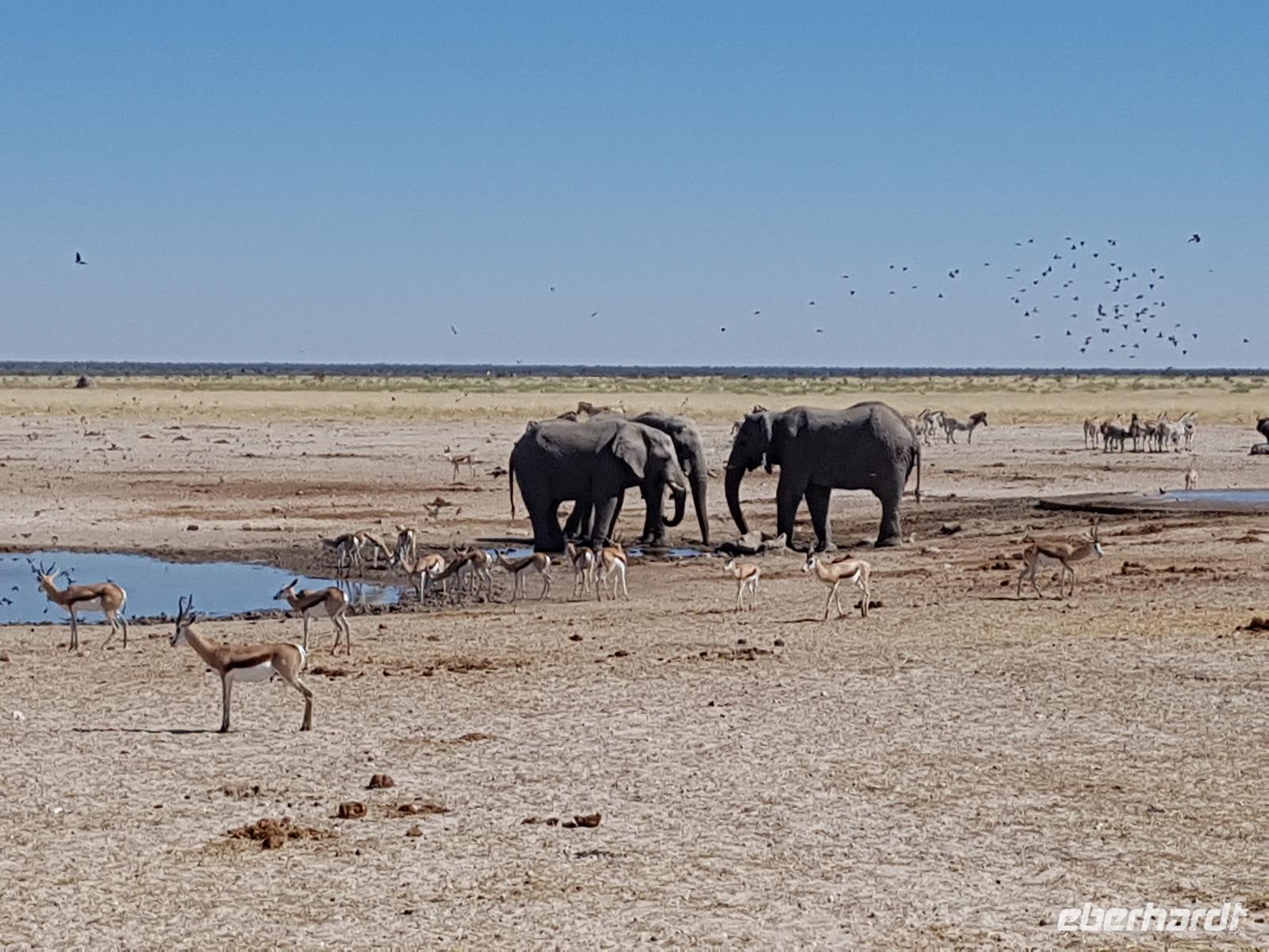 So wie gestern verbrachten wir die Mittagstunden beim gemütlichen Picknick in einem schattigen Camp direkt im Park. Hier konnte man sich was zum Essen bestellen oder zum Wasserloch laufen, um Tiere zu beobachten. Eberhardt Travel lud heute alle Gäste zum Eis ein. War eine gute Idee, oder? Am frühenNachmittag fuhren wir direkt am Rand von dem Herzstück des Parks, die 100 Kilometer lange Etosha-Pfanne. Eine große, weiße Fläche, wie der Name aus der Sansprache bedeutet, breitet sich ins Unendliche aus. Die weiße, nichtgreifbare Weite zieht uns alle magisch in ihren Bann.