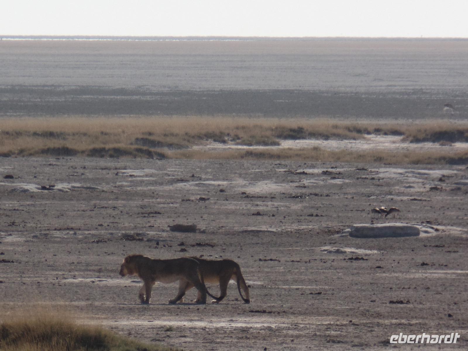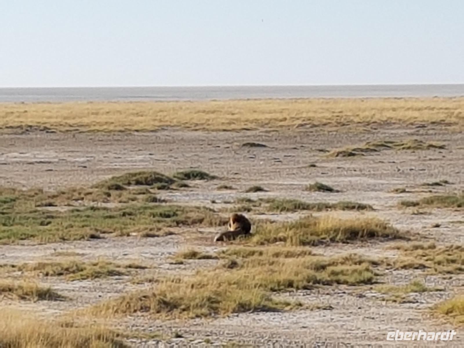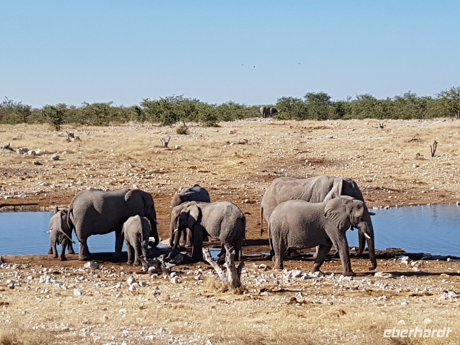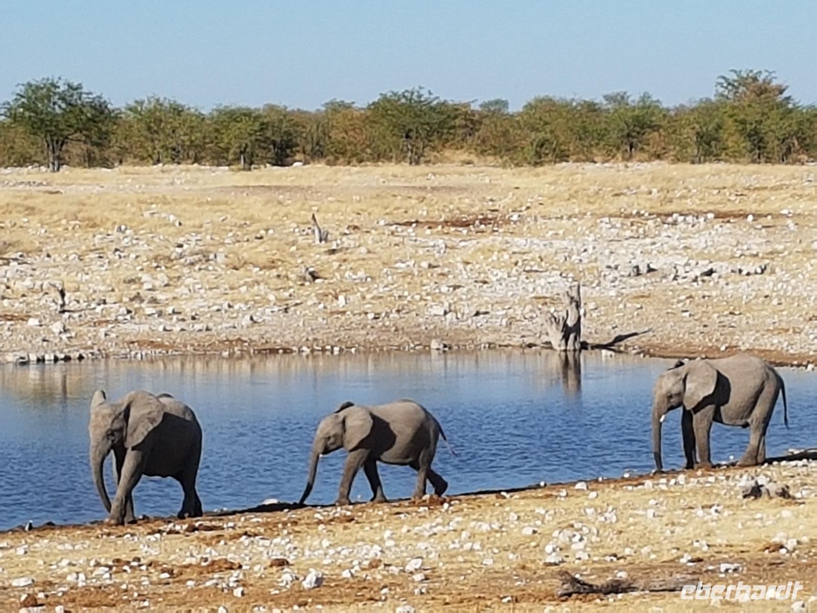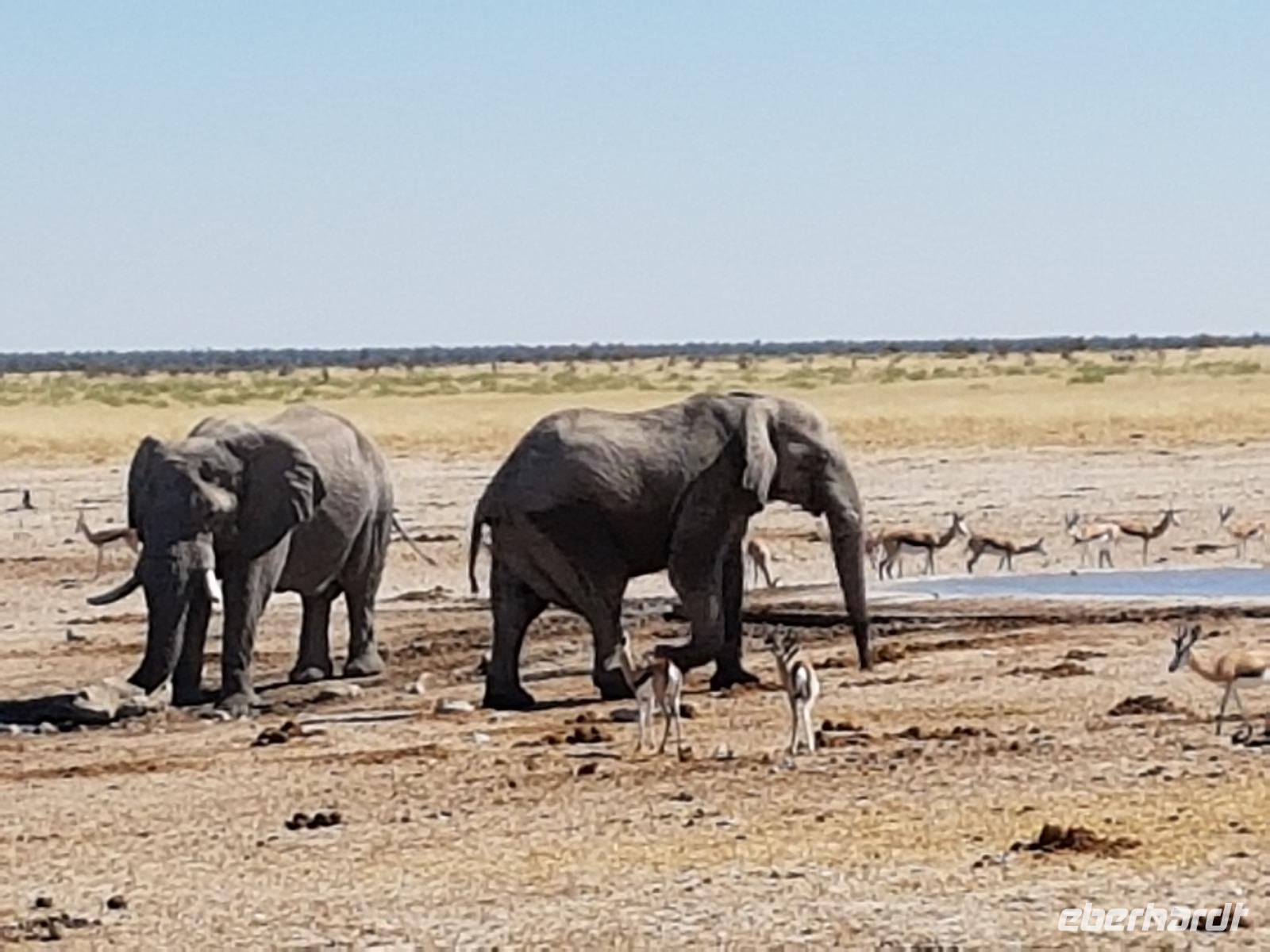 So wie gestern verbrachten wir die Mittagstunden beim gemütlichen Picknick in einem schattigen Camp direkt im Park. Hier konnte man sich was zum Essen bestellen oder zum Wasserloch laufen, um Tiere zu beobachten. Eberhardt Travel lud heute alle Gäste zum Eis ein. War eine gute Idee, oder? Am frühenNachmittag fuhren wir direkt am Rand von dem Herzstück des Parks, die 100 Kilometer lange Etosha-Pfanne. Eine große, weiße Fläche, wie der Name aus der Sansprache bedeutet, breitet sich ins Unendliche aus. Die weiße, nichtgreifbare Weite zieht uns alle magisch in ihren Bann.