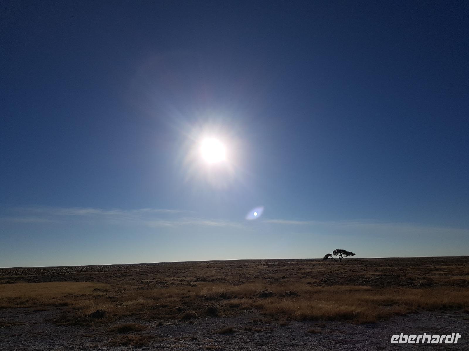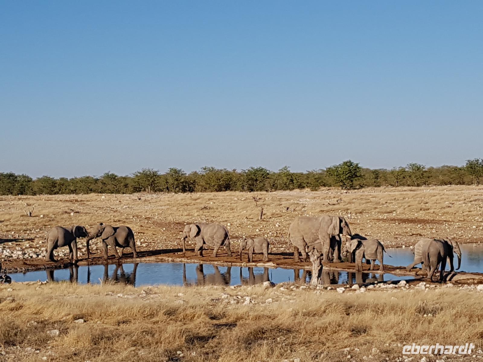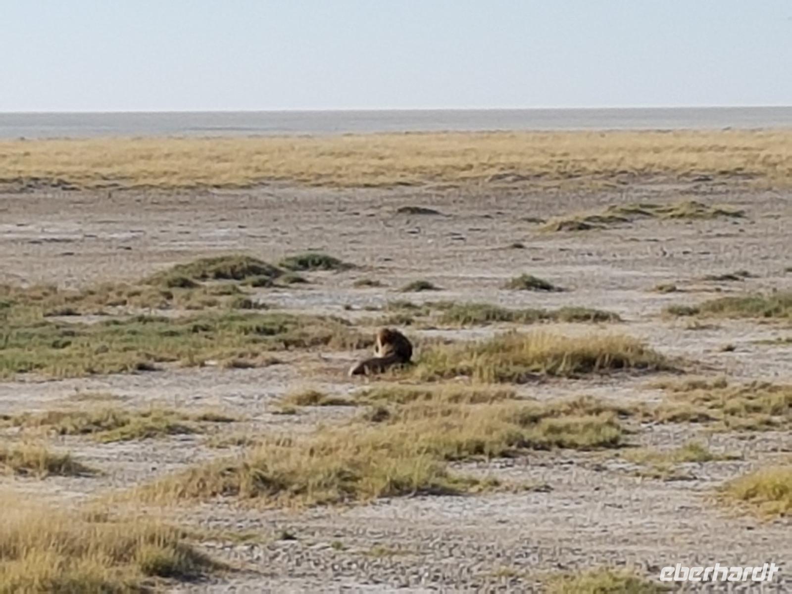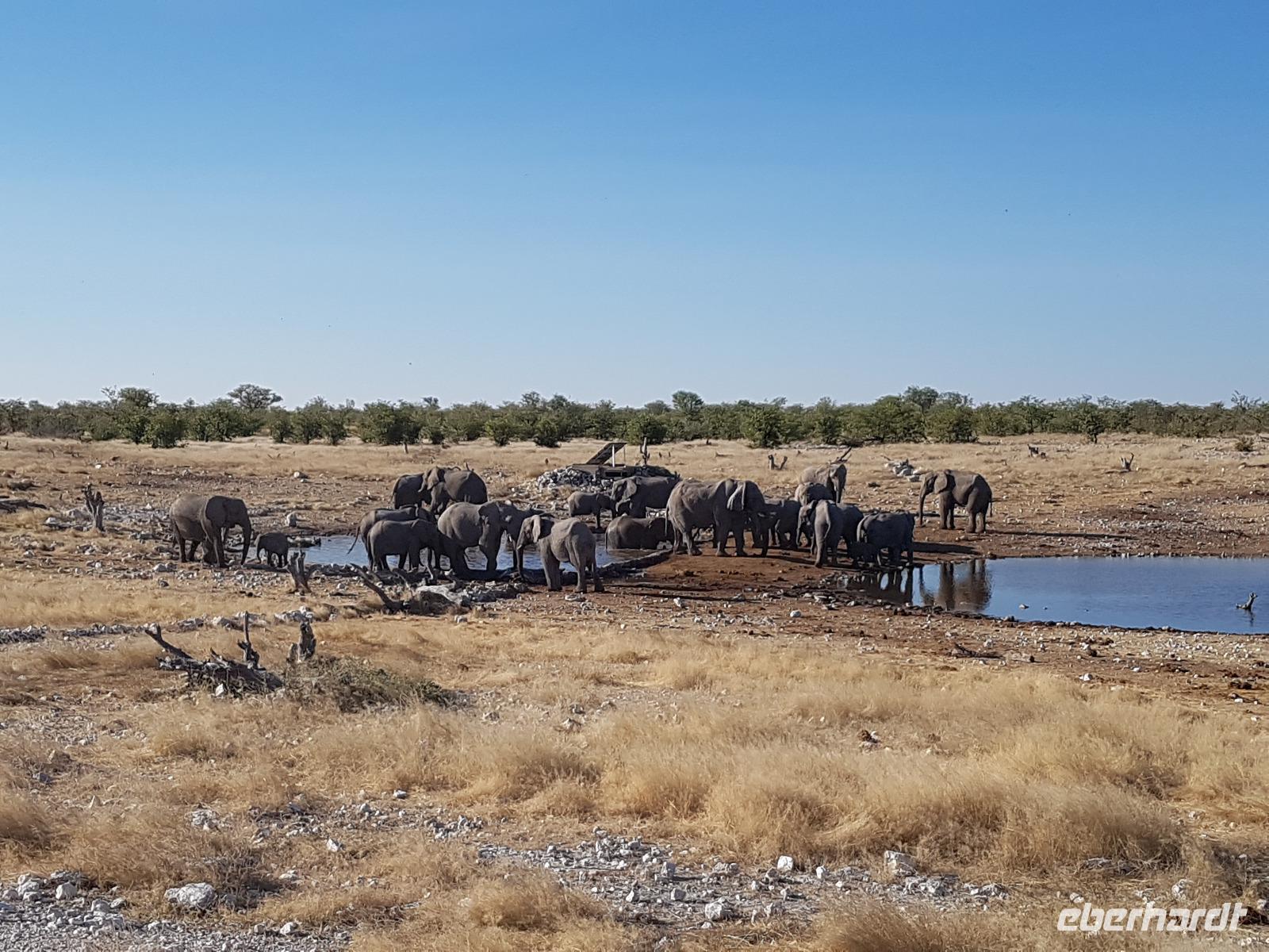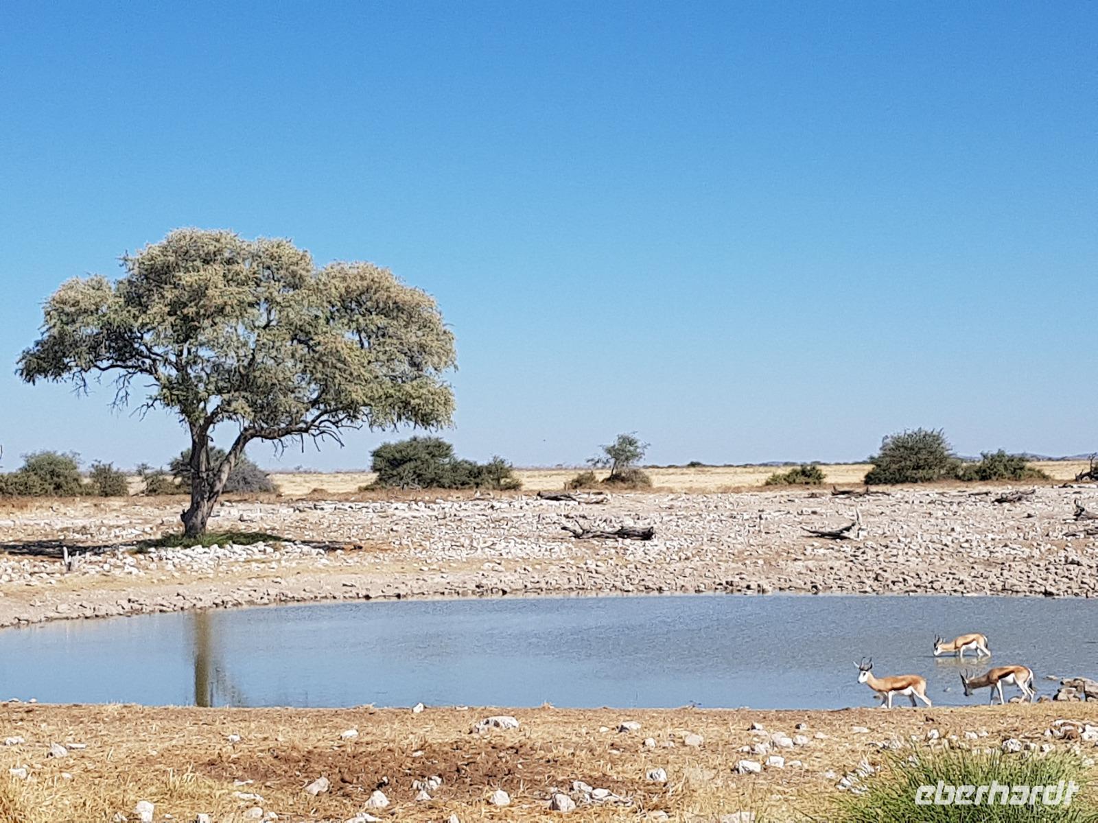 So wie gestern verbrachten wir die Mittagstunden beim gemütlichen Picknick in einem schattigen Camp direkt im Park. Hier konnte man sich was zum Essen bestellen oder zum Wasserloch laufen, um Tiere zu beobachten. Eberhardt Travel lud heute alle Gäste zum Eis ein. War eine gute Idee, oder? Am frühenNachmittag fuhren wir direkt am Rand von dem Herzstück des Parks, die 100 Kilometer lange Etosha-Pfanne. Eine große, weiße Fläche, wie der Name aus der Sansprache bedeutet, breitet sich ins Unendliche aus. Die weiße, nichtgreifbare Weite zieht uns alle magisch in ihren Bann.