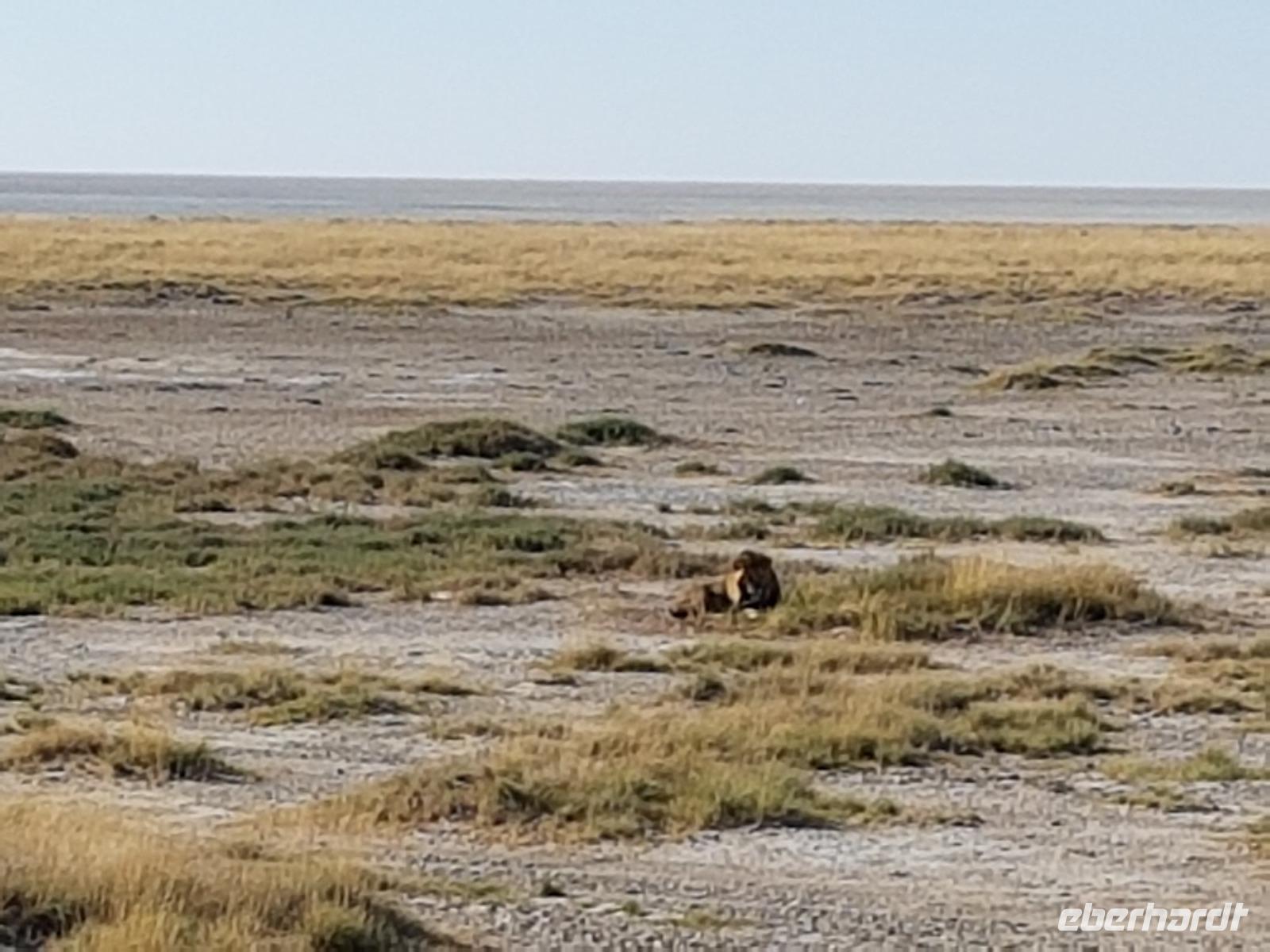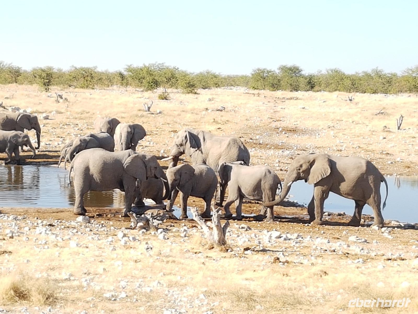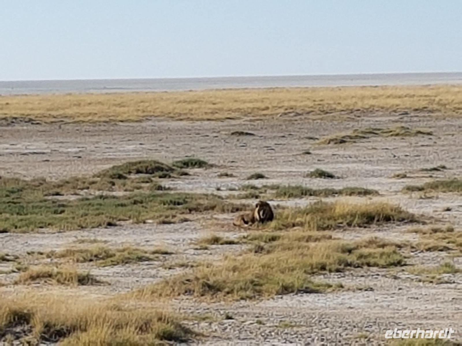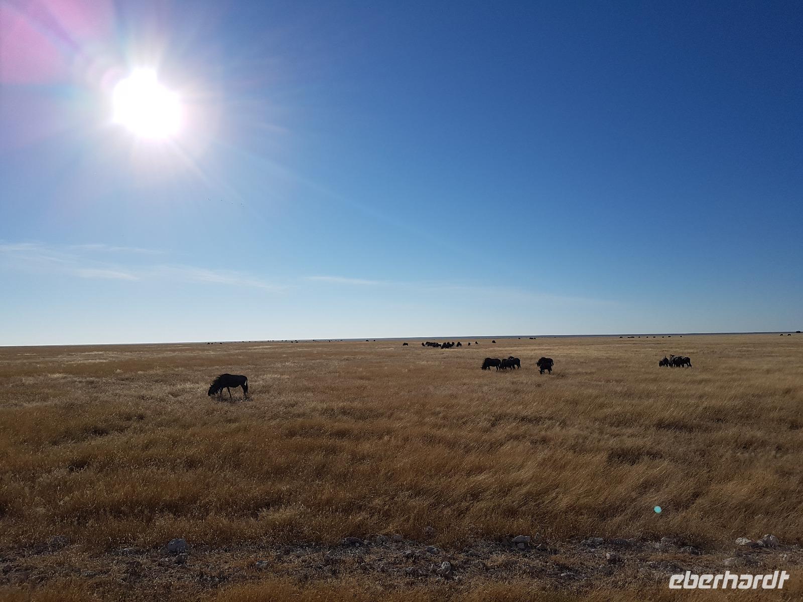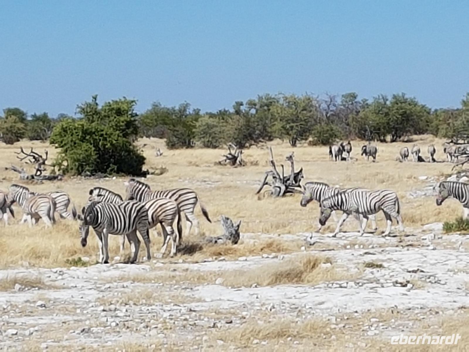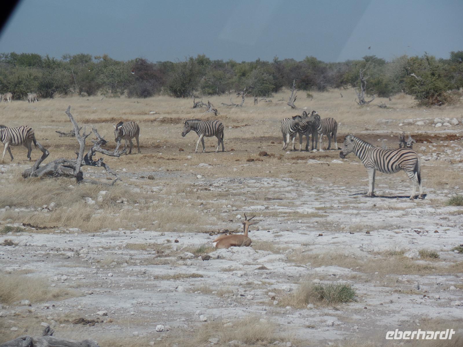 So wie gestern verbrachten wir die Mittagstunden beim gemütlichen Picknick in einem schattigen Camp direkt im Park. Hier konnte man sich was zum Essen bestellen oder zum Wasserloch laufen, um Tiere zu beobachten. Eberhardt Travel lud heute alle Gäste zum Eis ein. War eine gute Idee, oder? Am frühenNachmittag fuhren wir direkt am Rand von dem Herzstück des Parks, die 100 Kilometer lange Etosha-Pfanne. Eine große, weiße Fläche, wie der Name aus der Sansprache bedeutet, breitet sich ins Unendliche aus. Die weiße, nichtgreifbare Weite zieht uns alle magisch in ihren Bann.