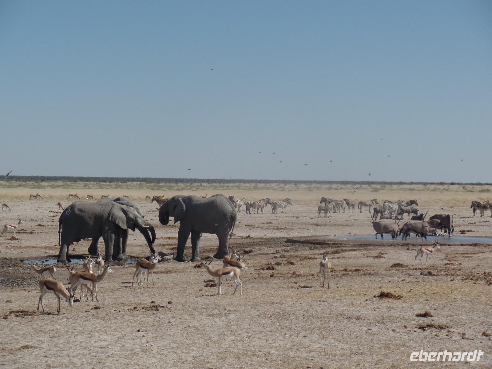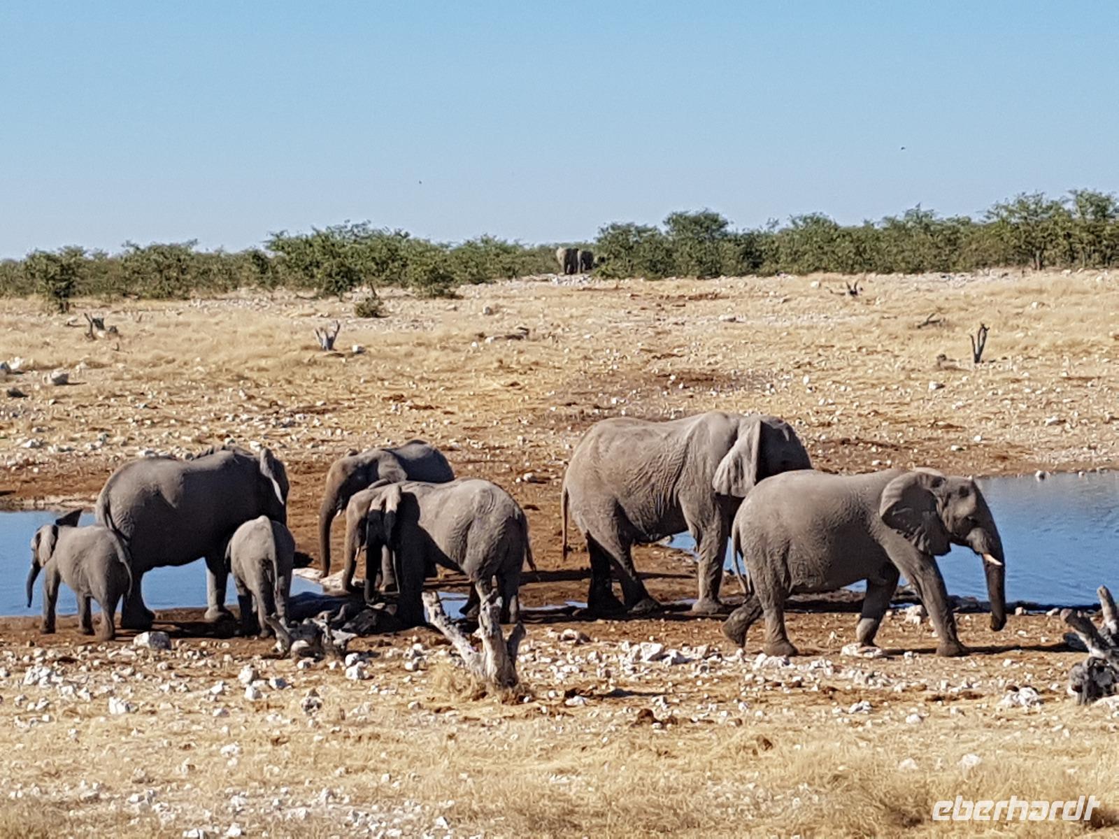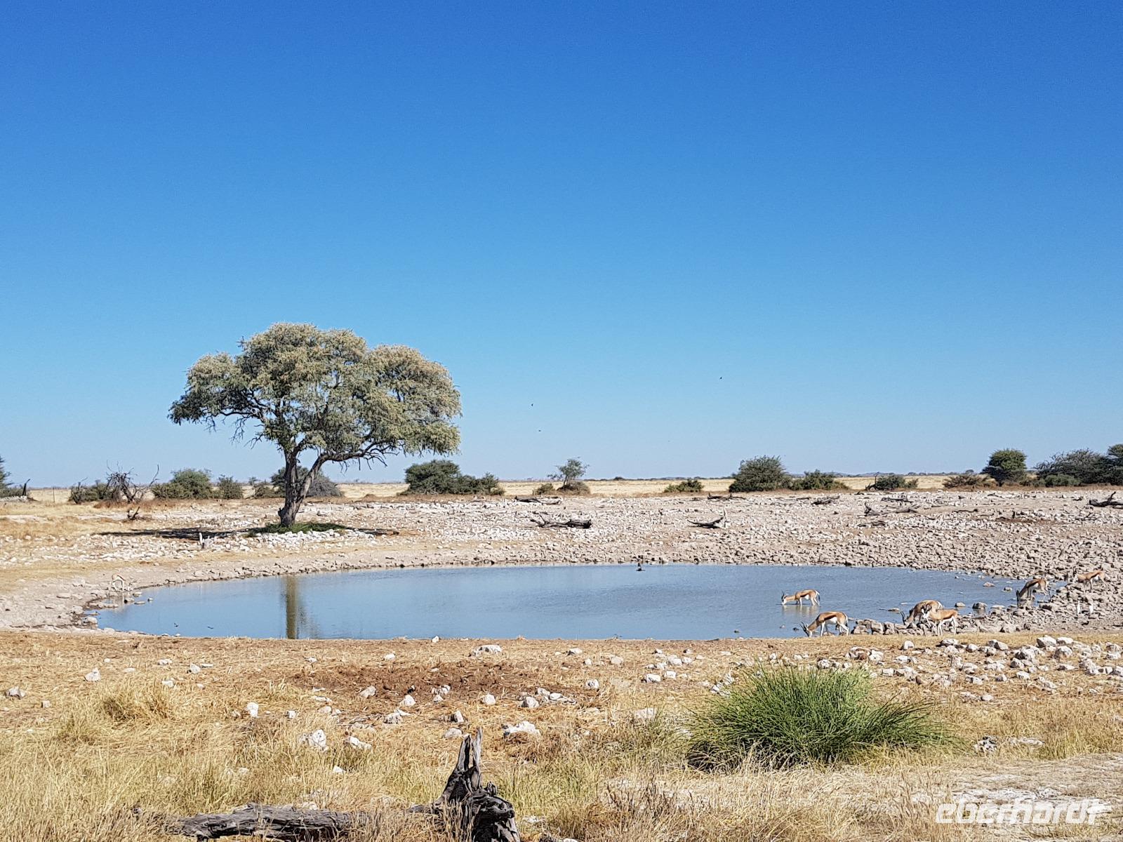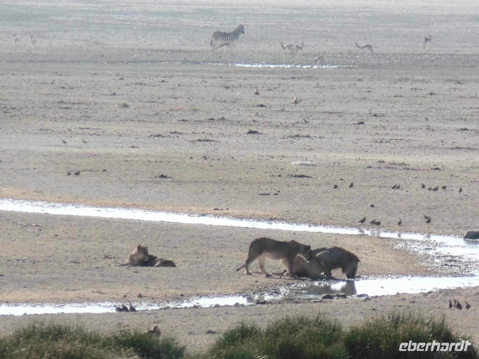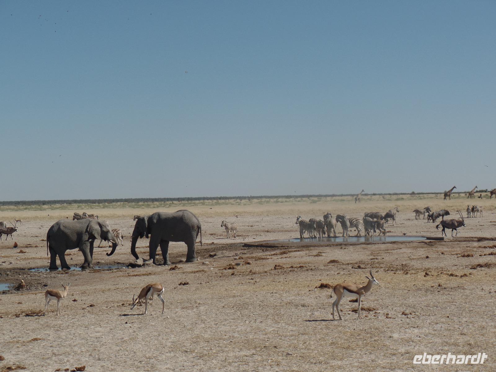 So wie gestern verbrachten wir die Mittagstunden beim gemütlichen Picknick in einem schattigen Camp direkt im Park. Hier konnte man sich was zum Essen bestellen oder zum Wasserloch laufen, um Tiere zu beobachten. Eberhardt Travel lud heute alle Gäste zum Eis ein. War eine gute Idee, oder? Am frühenNachmittag fuhren wir direkt am Rand von dem Herzstück des Parks, die 100 Kilometer lange Etosha-Pfanne. Eine große, weiße Fläche, wie der Name aus der Sansprache bedeutet, breitet sich ins Unendliche aus. Die weiße, nichtgreifbare Weite zieht uns alle magisch in ihren Bann.