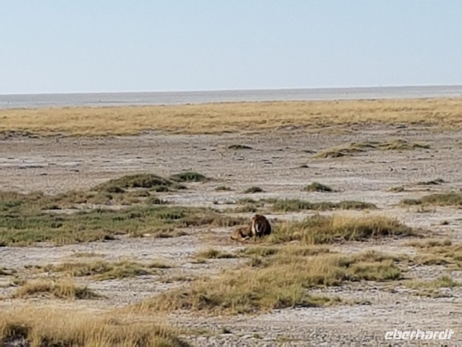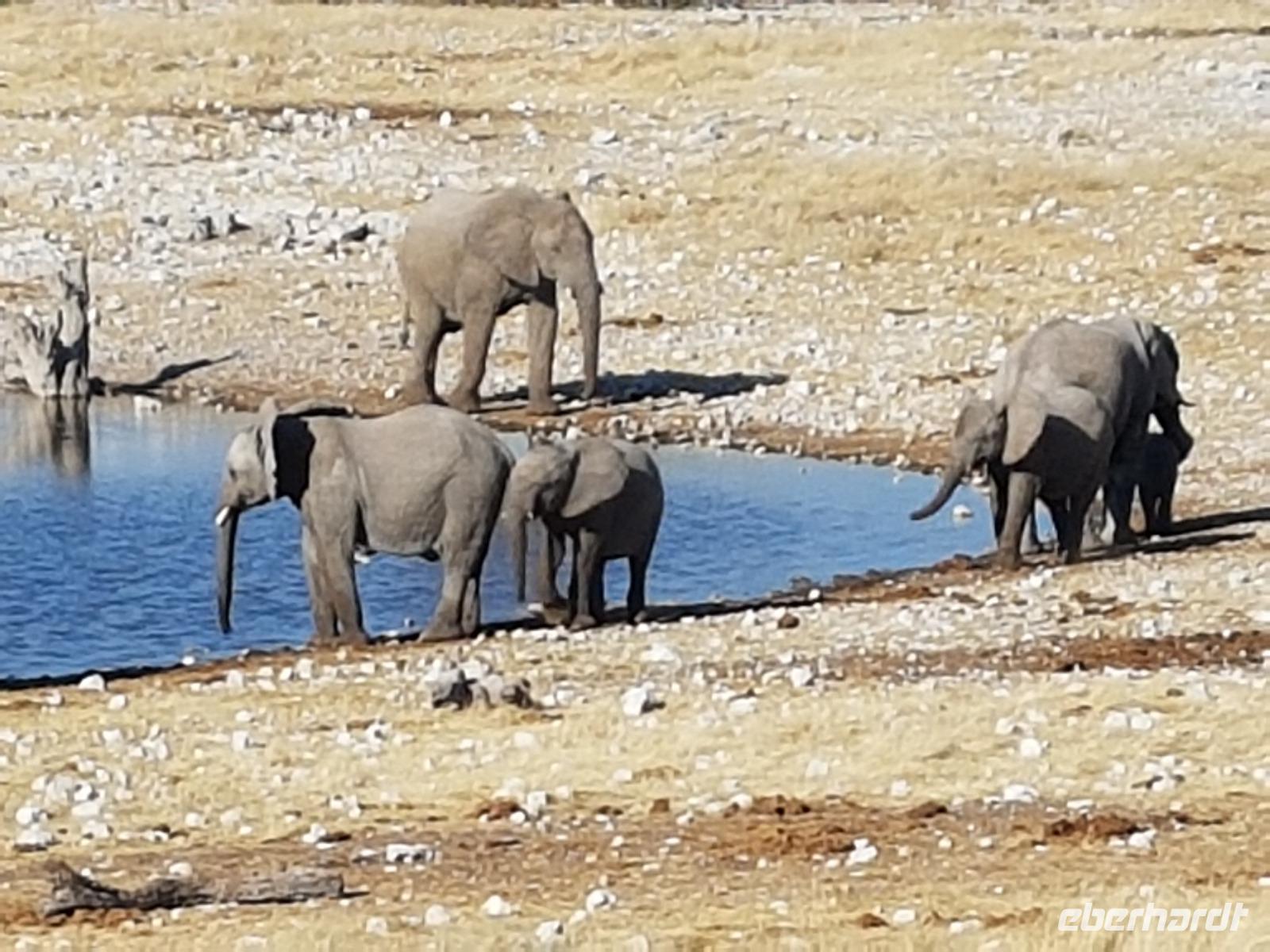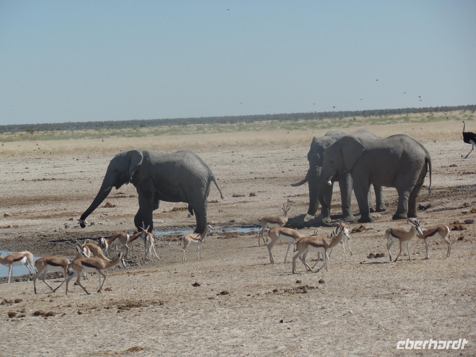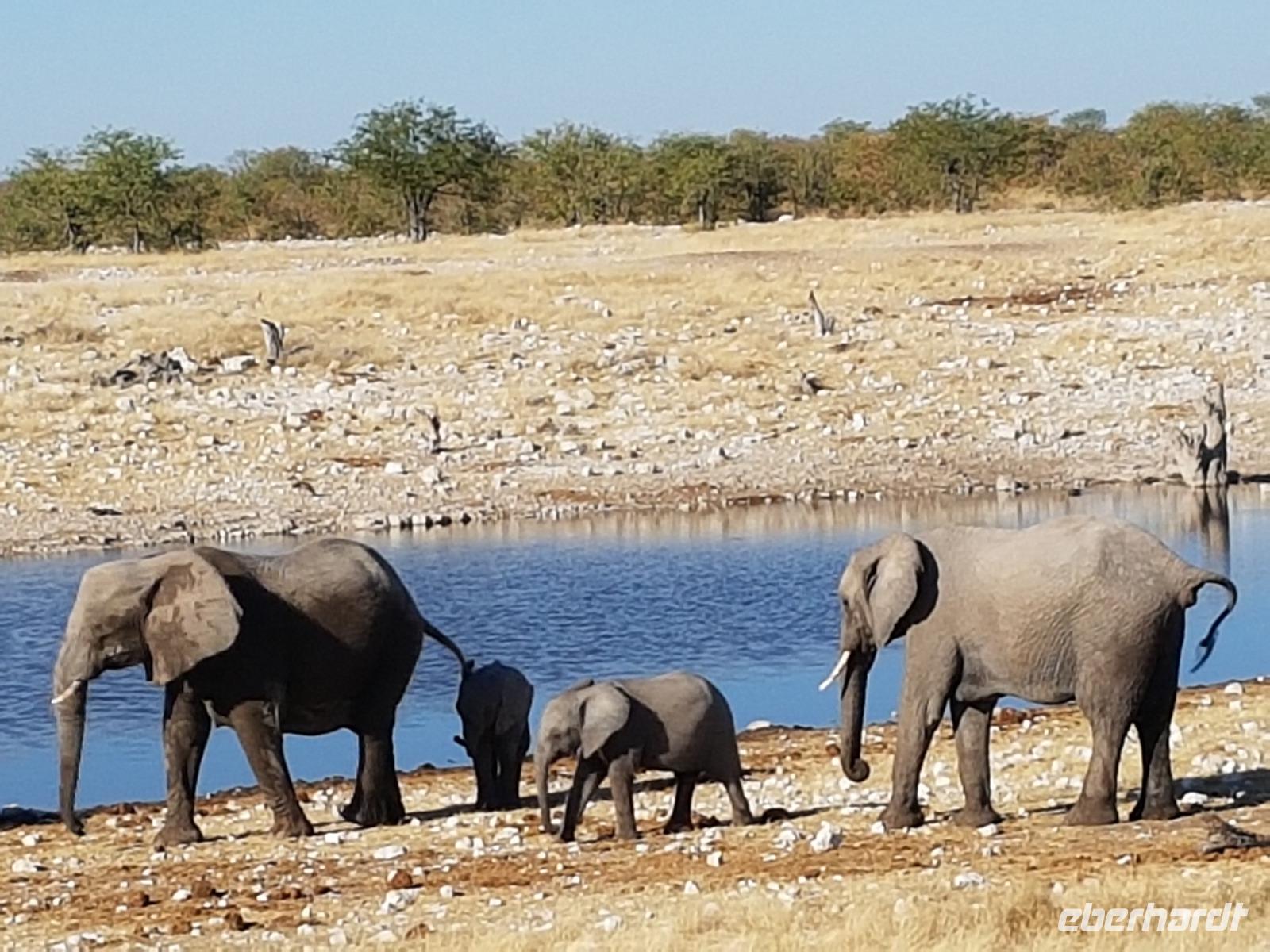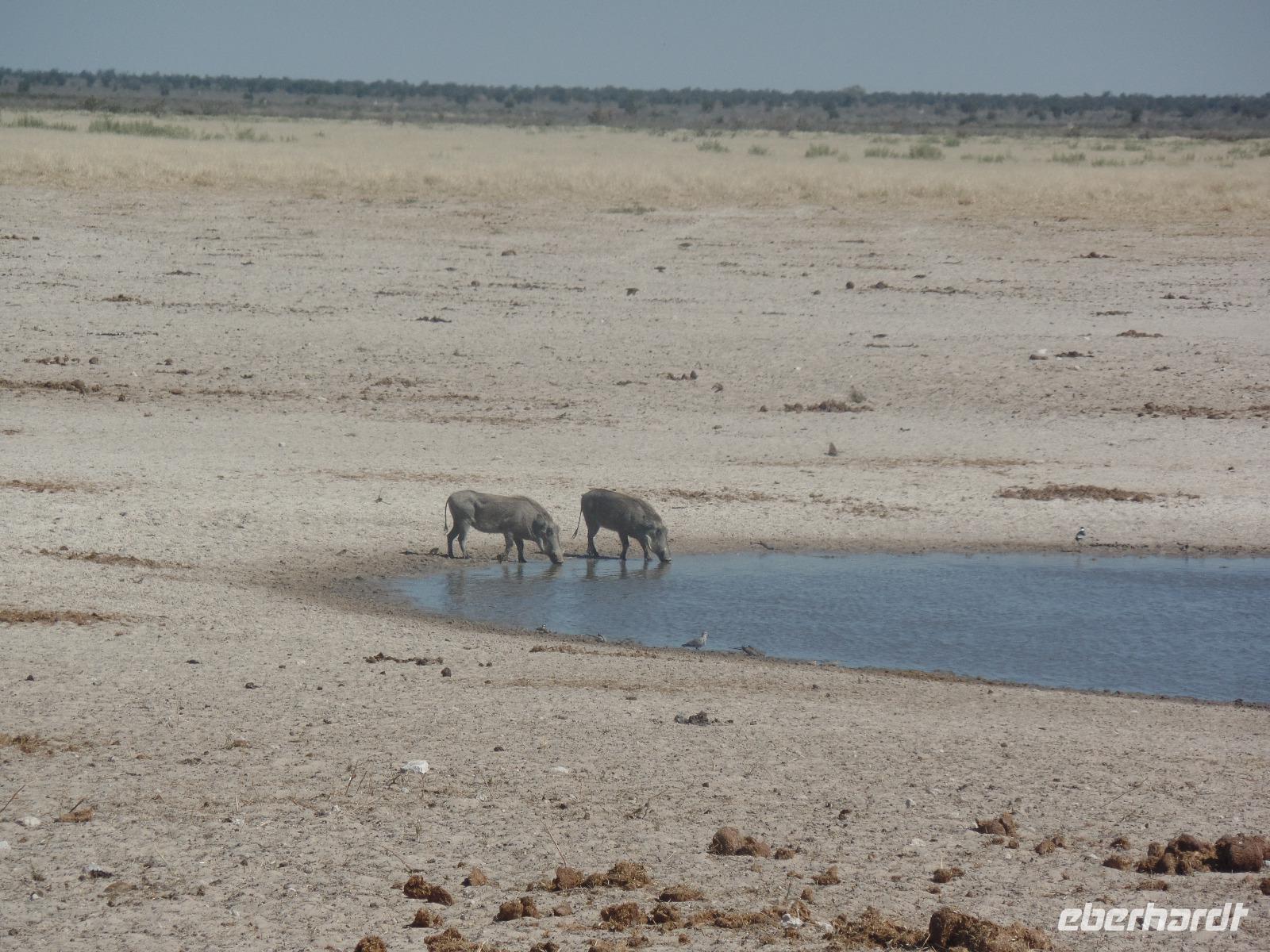 So wie gestern verbrachten wir die Mittagstunden beim gemütlichen Picknick in einem schattigen Camp direkt im Park. Hier konnte man sich was zum Essen bestellen oder zum Wasserloch laufen, um Tiere zu beobachten. Eberhardt Travel lud heute alle Gäste zum Eis ein. War eine gute Idee, oder? Am frühenNachmittag fuhren wir direkt am Rand von dem Herzstück des Parks, die 100 Kilometer lange Etosha-Pfanne. Eine große, weiße Fläche, wie der Name aus der Sansprache bedeutet, breitet sich ins Unendliche aus. Die weiße, nichtgreifbare Weite zieht uns alle magisch in ihren Bann.