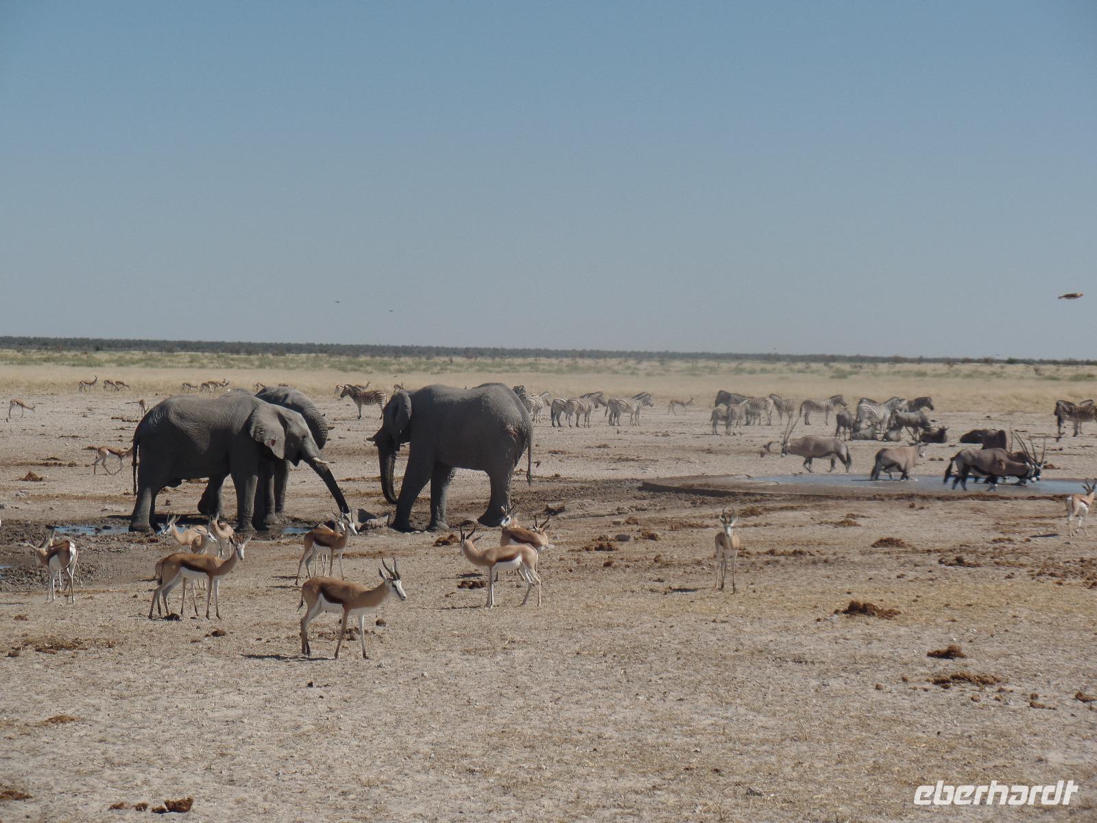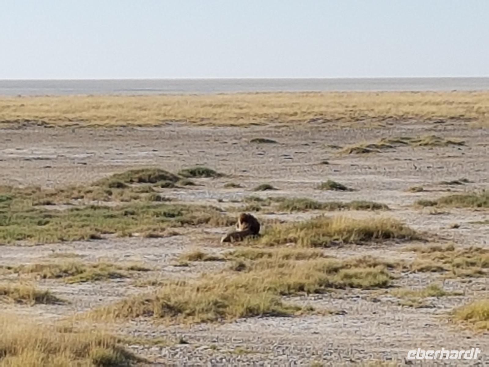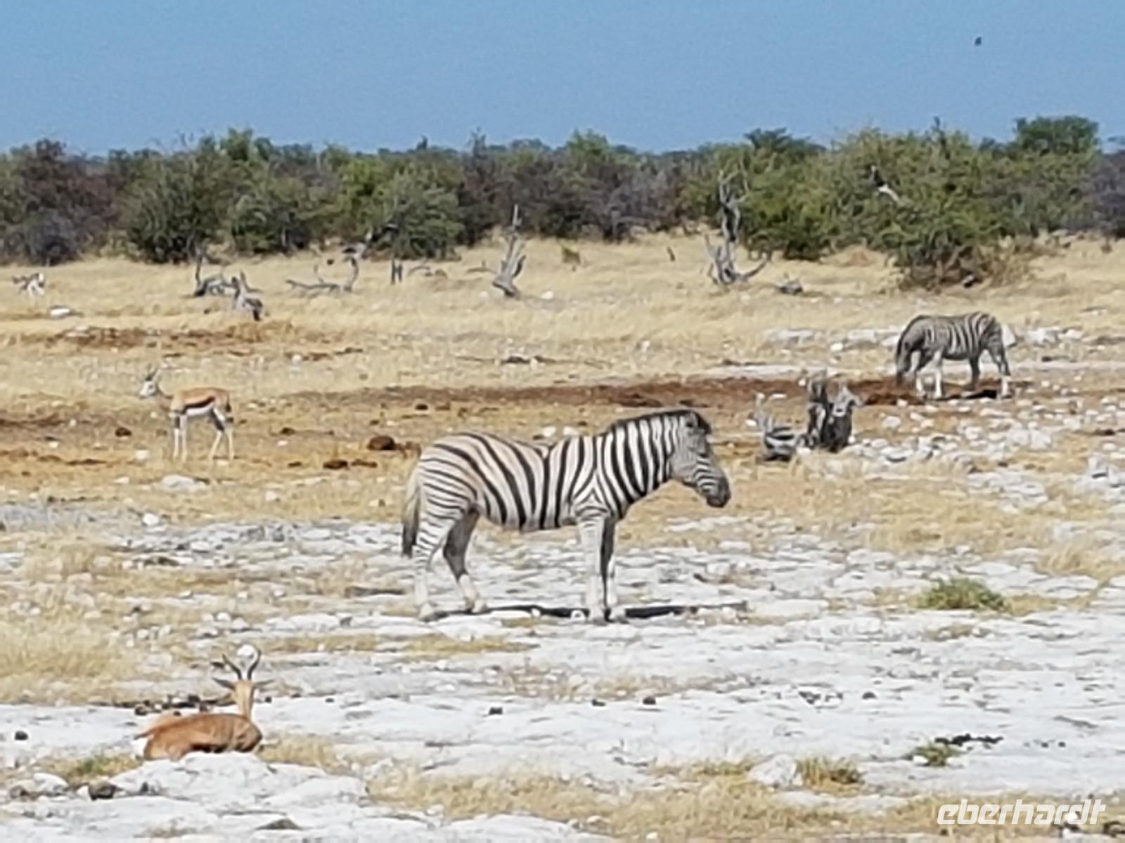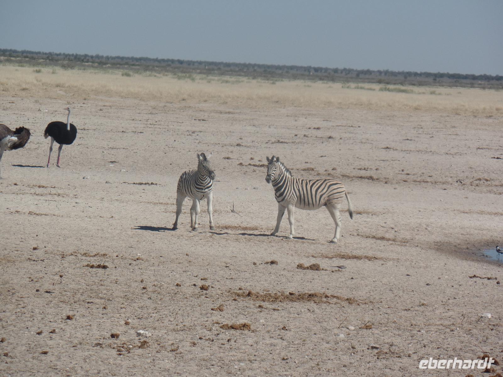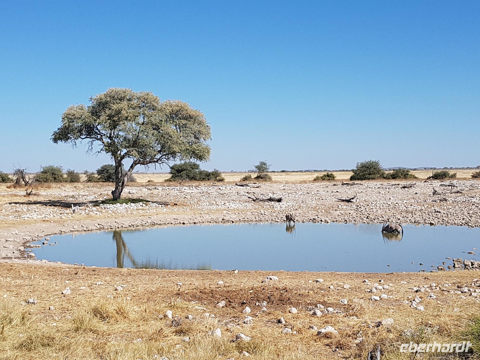 So wie gestern verbrachten wir die Mittagstunden beim gemütlichen Picknick in einem schattigen Camp direkt im Park. Hier konnte man sich was zum Essen bestellen oder zum Wasserloch laufen, um Tiere zu beobachten. Eberhardt Travel lud heute alle Gäste zum Eis ein. War eine gute Idee, oder? Am frühenNachmittag fuhren wir direkt am Rand von dem Herzstück des Parks, die 100 Kilometer lange Etosha-Pfanne. Eine große, weiße Fläche, wie der Name aus der Sansprache bedeutet, breitet sich ins Unendliche aus. Die weiße, nichtgreifbare Weite zieht uns alle magisch in ihren Bann.