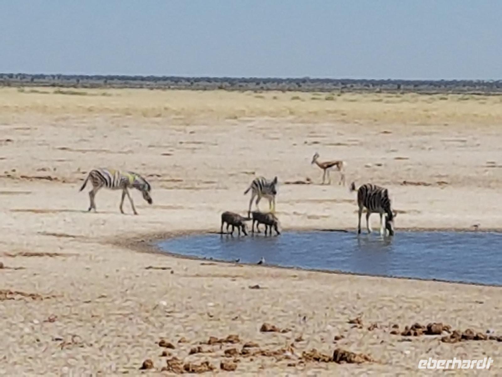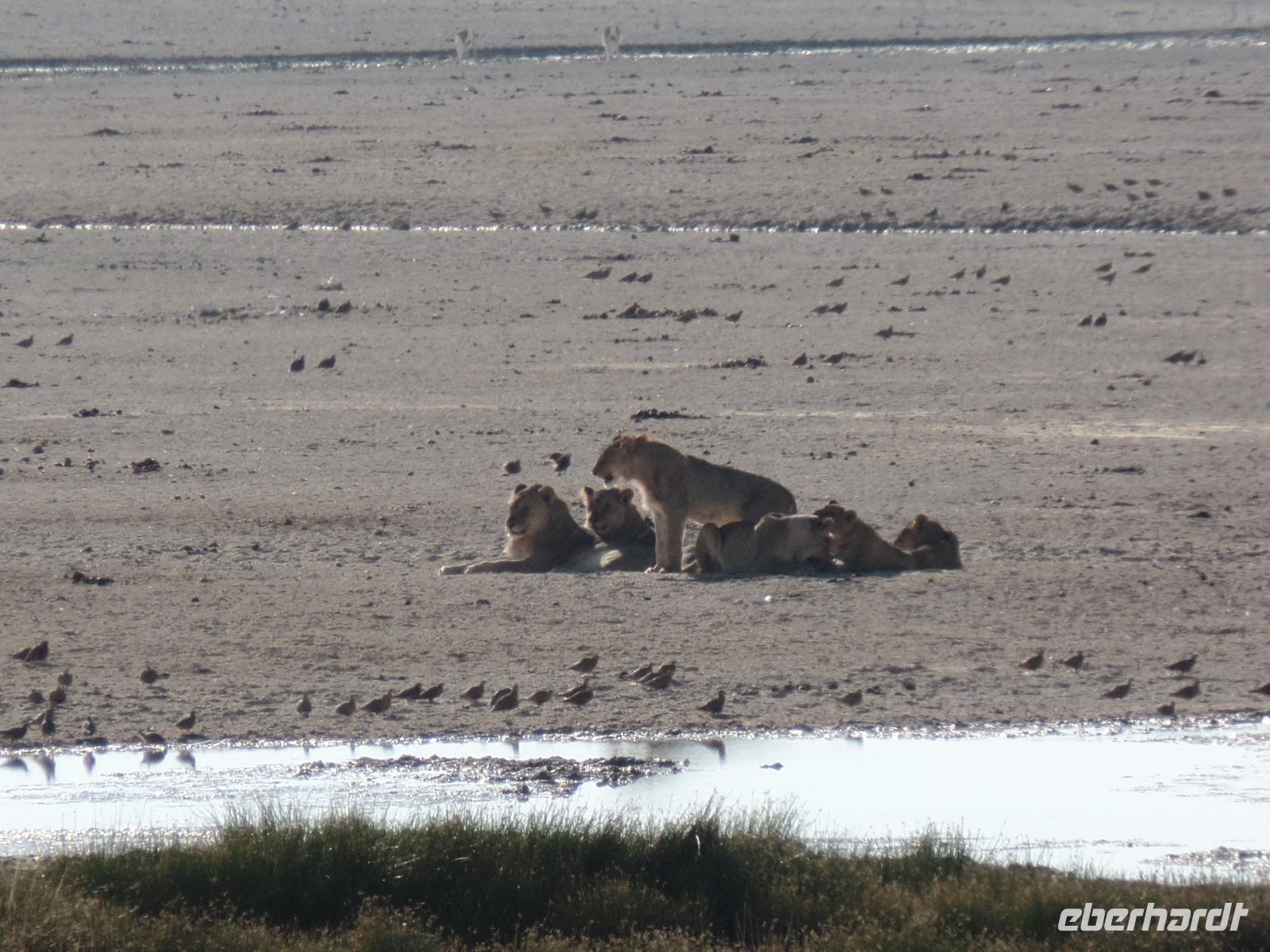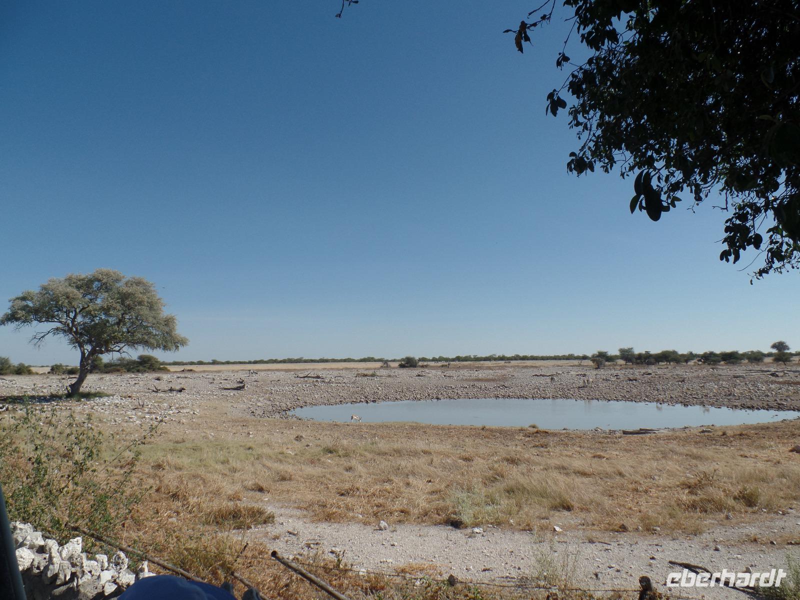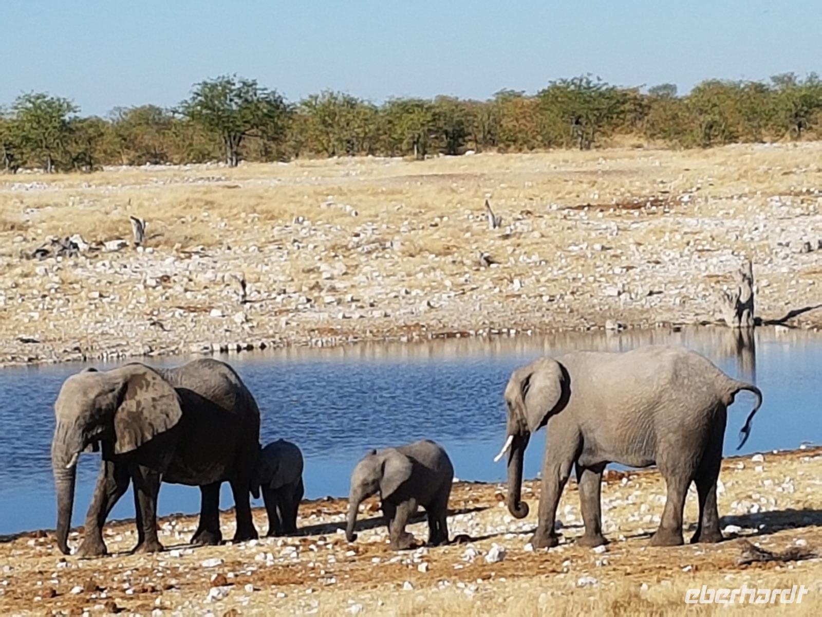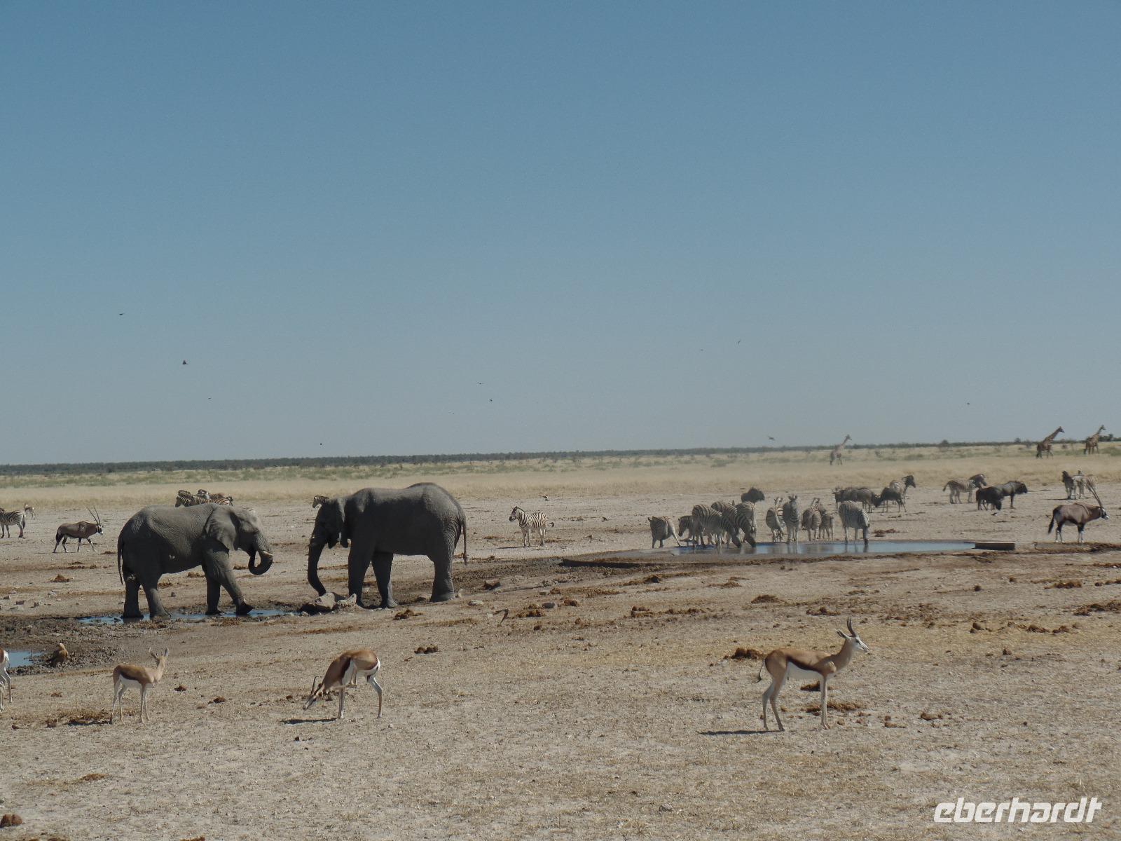 So wie gestern verbrachten wir die Mittagstunden beim gemütlichen Picknick in einem schattigen Camp direkt im Park. Hier konnte man sich was zum Essen bestellen oder zum Wasserloch laufen, um Tiere zu beobachten. Eberhardt Travel lud heute alle Gäste zum Eis ein. War eine gute Idee, oder? Am frühenNachmittag fuhren wir direkt am Rand von dem Herzstück des Parks, die 100 Kilometer lange Etosha-Pfanne. Eine große, weiße Fläche, wie der Name aus der Sansprache bedeutet, breitet sich ins Unendliche aus. Die weiße, nichtgreifbare Weite zieht uns alle magisch in ihren Bann.