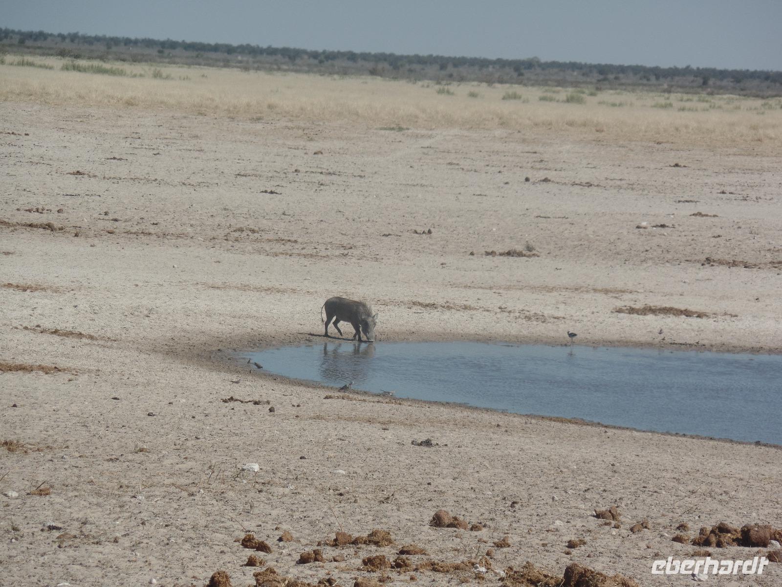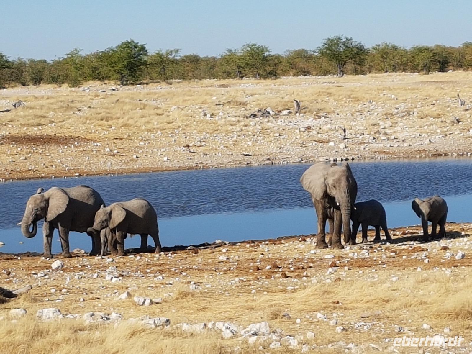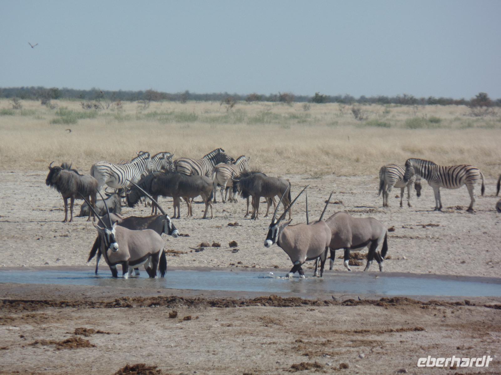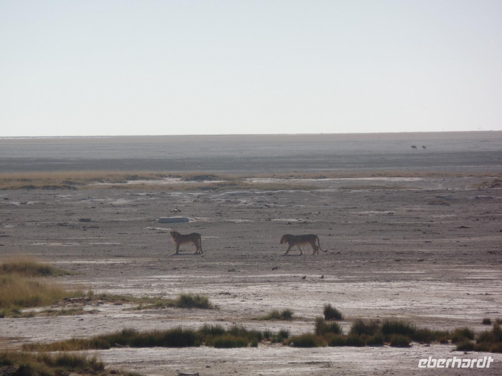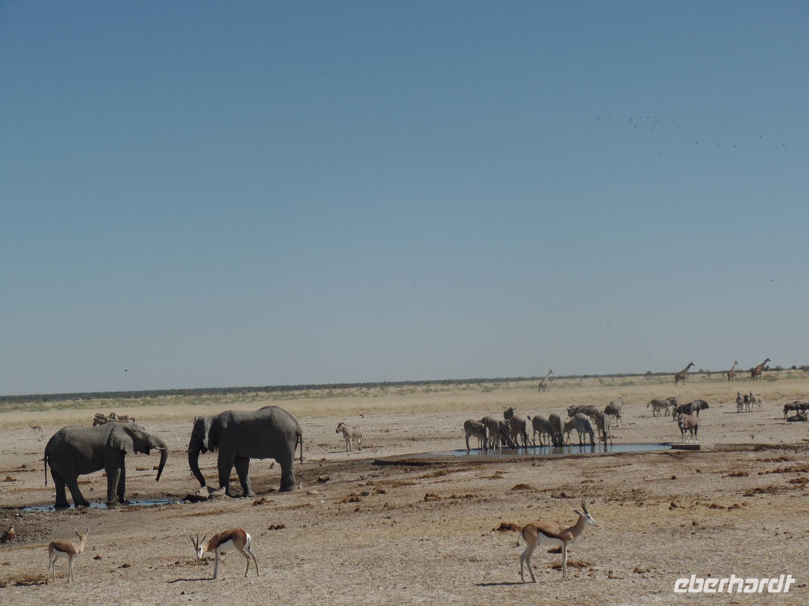 So wie gestern verbrachten wir die Mittagstunden beim gemütlichen Picknick in einem schattigen Camp direkt im Park. Hier konnte man sich was zum Essen bestellen oder zum Wasserloch laufen, um Tiere zu beobachten. Eberhardt Travel lud heute alle Gäste zum Eis ein. War eine gute Idee, oder? Am frühenNachmittag fuhren wir direkt am Rand von dem Herzstück des Parks, die 100 Kilometer lange Etosha-Pfanne. Eine große, weiße Fläche, wie der Name aus der Sansprache bedeutet, breitet sich ins Unendliche aus. Die weiße, nichtgreifbare Weite zieht uns alle magisch in ihren Bann.