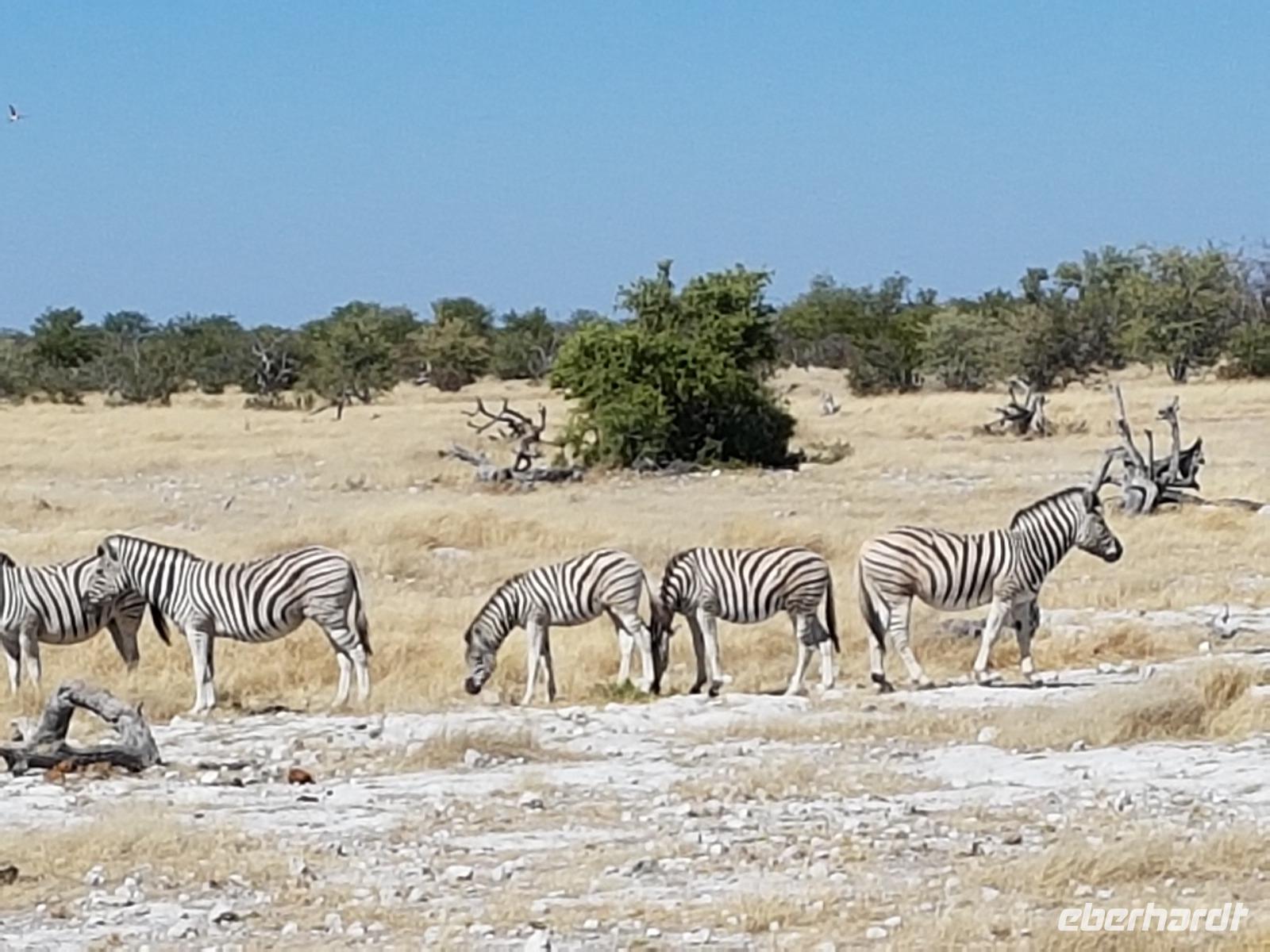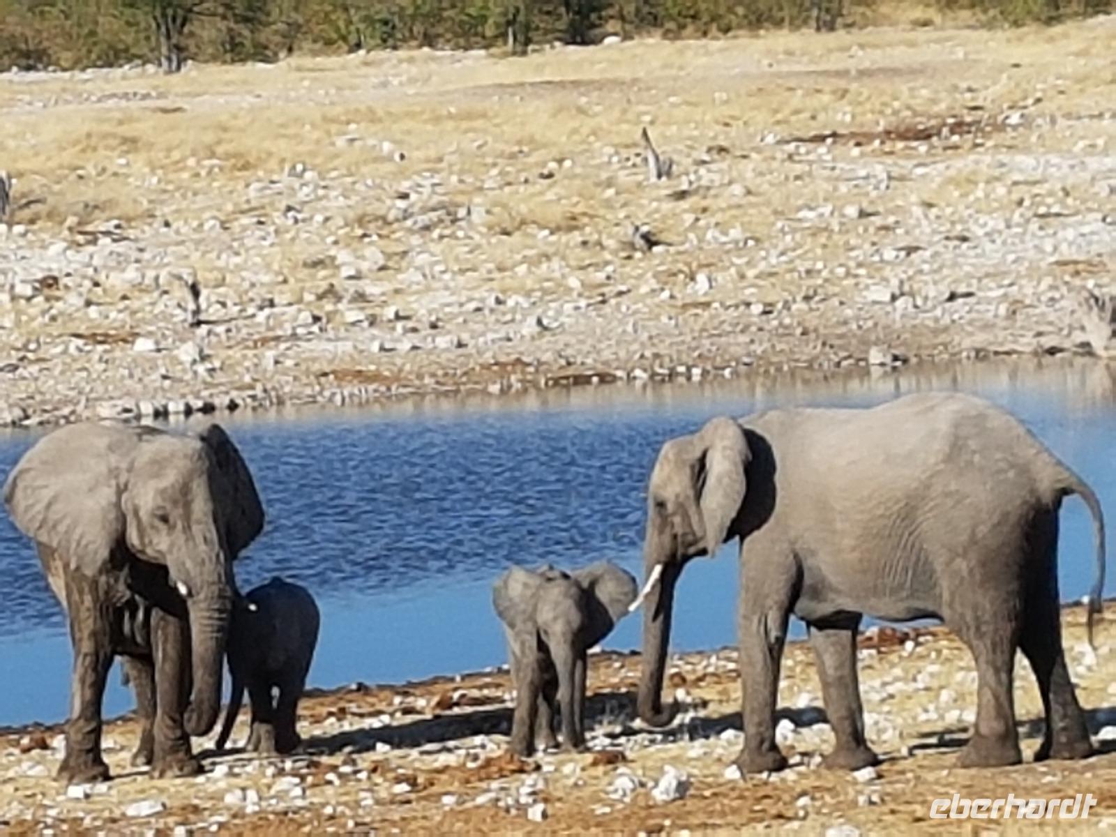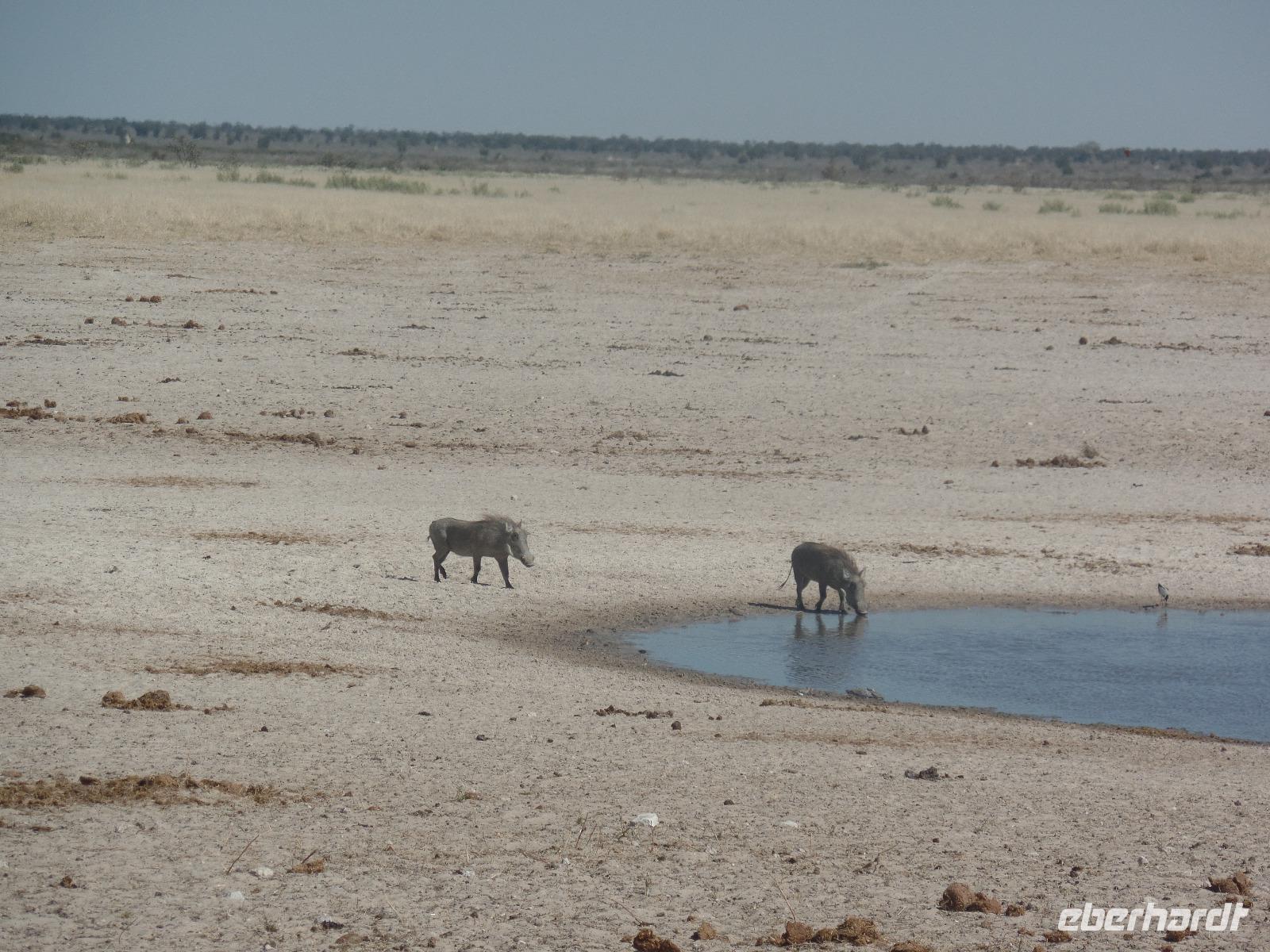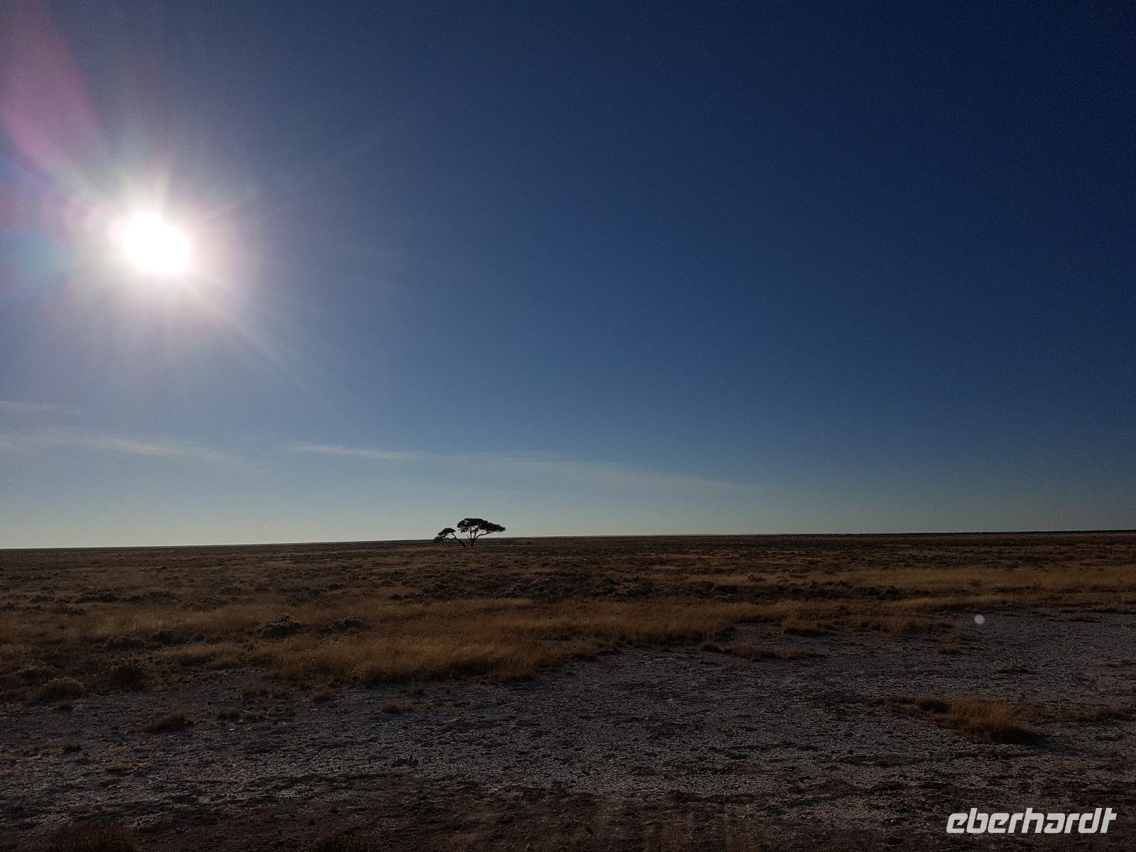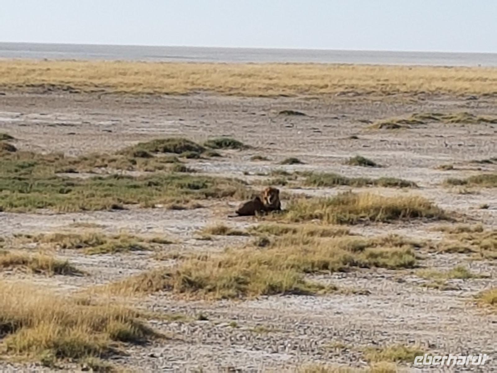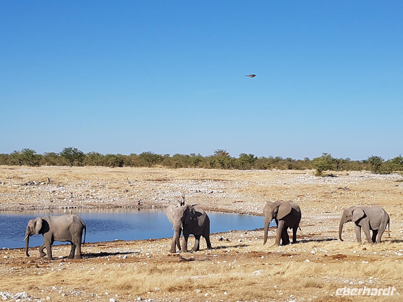 So wie gestern verbrachten wir die Mittagstunden beim gemütlichen Picknick in einem schattigen Camp direkt im Park. Hier konnte man sich was zum Essen bestellen oder zum Wasserloch laufen, um Tiere zu beobachten. Eberhardt Travel lud heute alle Gäste zum Eis ein. War eine gute Idee, oder? Am frühenNachmittag fuhren wir direkt am Rand von dem Herzstück des Parks, die 100 Kilometer lange Etosha-Pfanne. Eine große, weiße Fläche, wie der Name aus der Sansprache bedeutet, breitet sich ins Unendliche aus. Die weiße, nichtgreifbare Weite zieht uns alle magisch in ihren Bann.