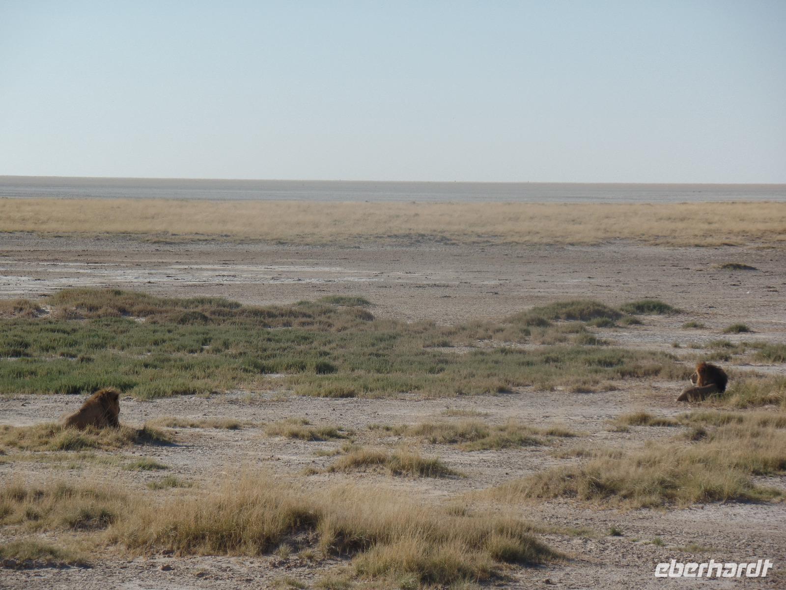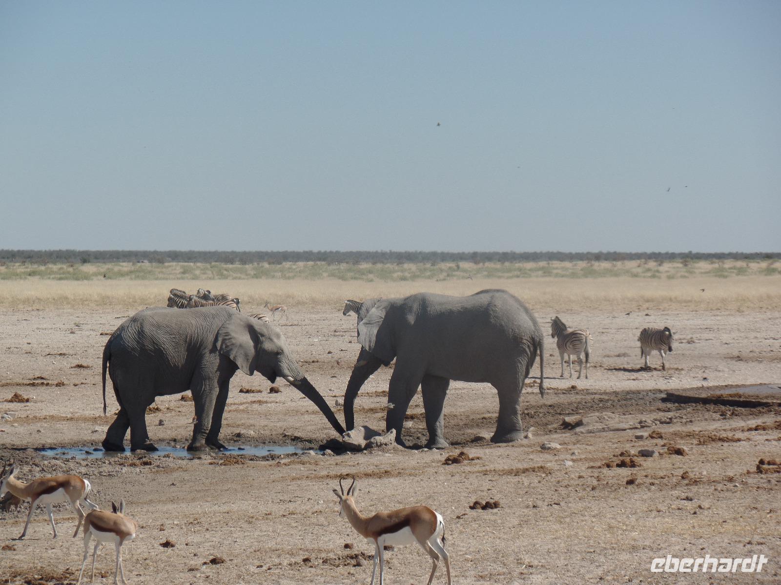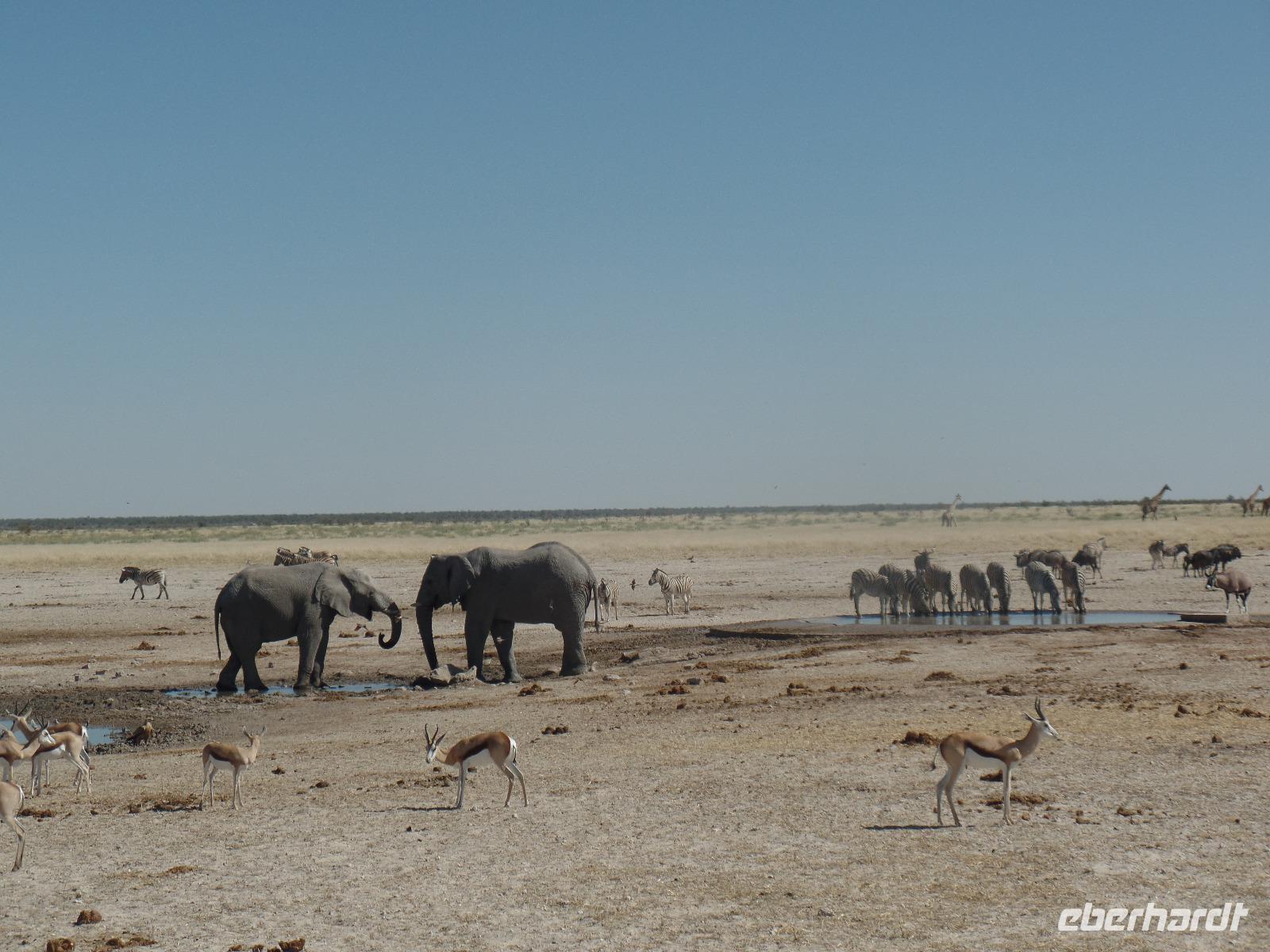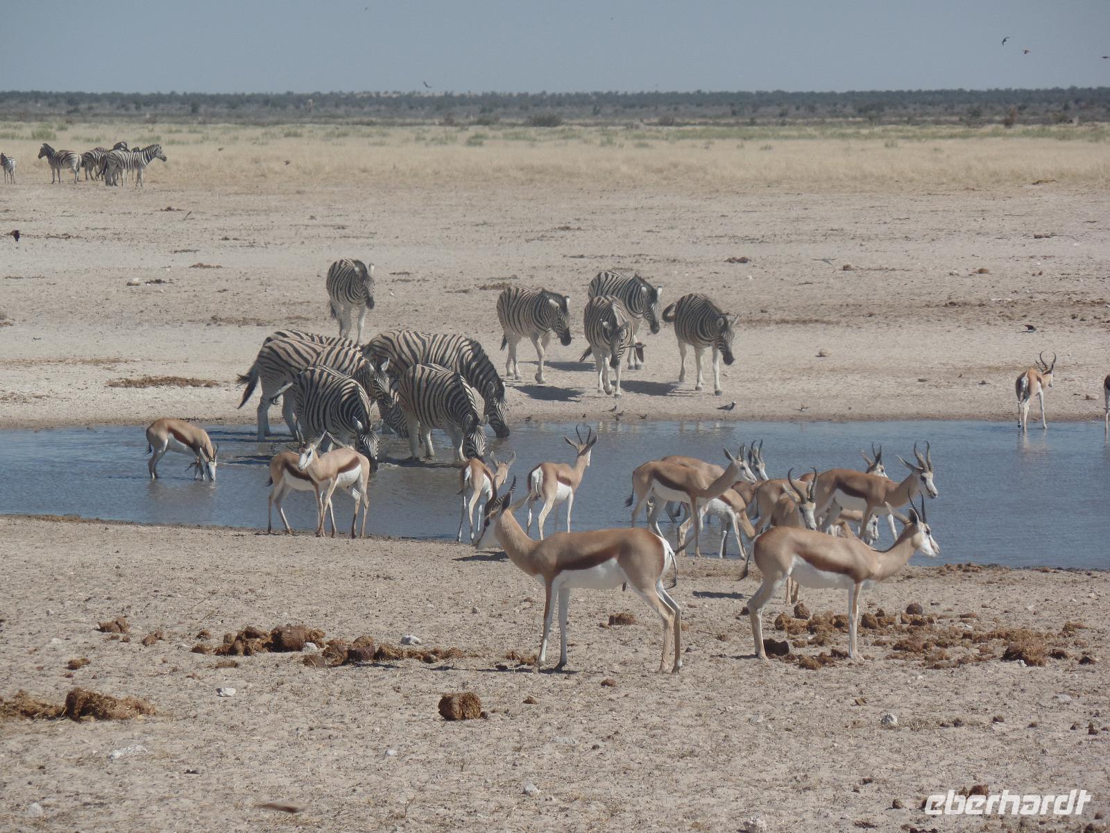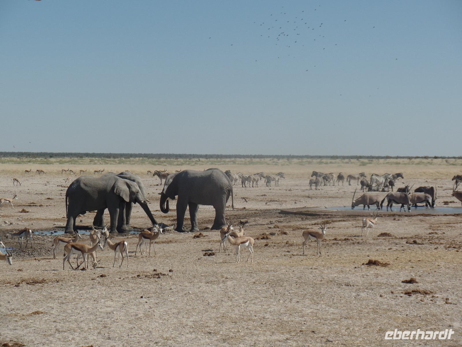 So wie gestern verbrachten wir die Mittagstunden beim gemütlichen Picknick in einem schattigen Camp direkt im Park. Hier konnte man sich was zum Essen bestellen oder zum Wasserloch laufen, um Tiere zu beobachten. Eberhardt Travel lud heute alle Gäste zum Eis ein. War eine gute Idee, oder? Am frühenNachmittag fuhren wir direkt am Rand von dem Herzstück des Parks, die 100 Kilometer lange Etosha-Pfanne. Eine große, weiße Fläche, wie der Name aus der Sansprache bedeutet, breitet sich ins Unendliche aus. Die weiße, nichtgreifbare Weite zieht uns alle magisch in ihren Bann.