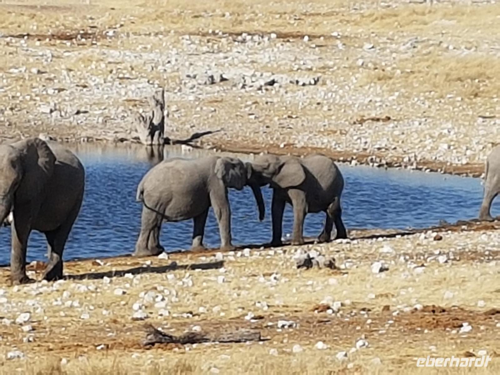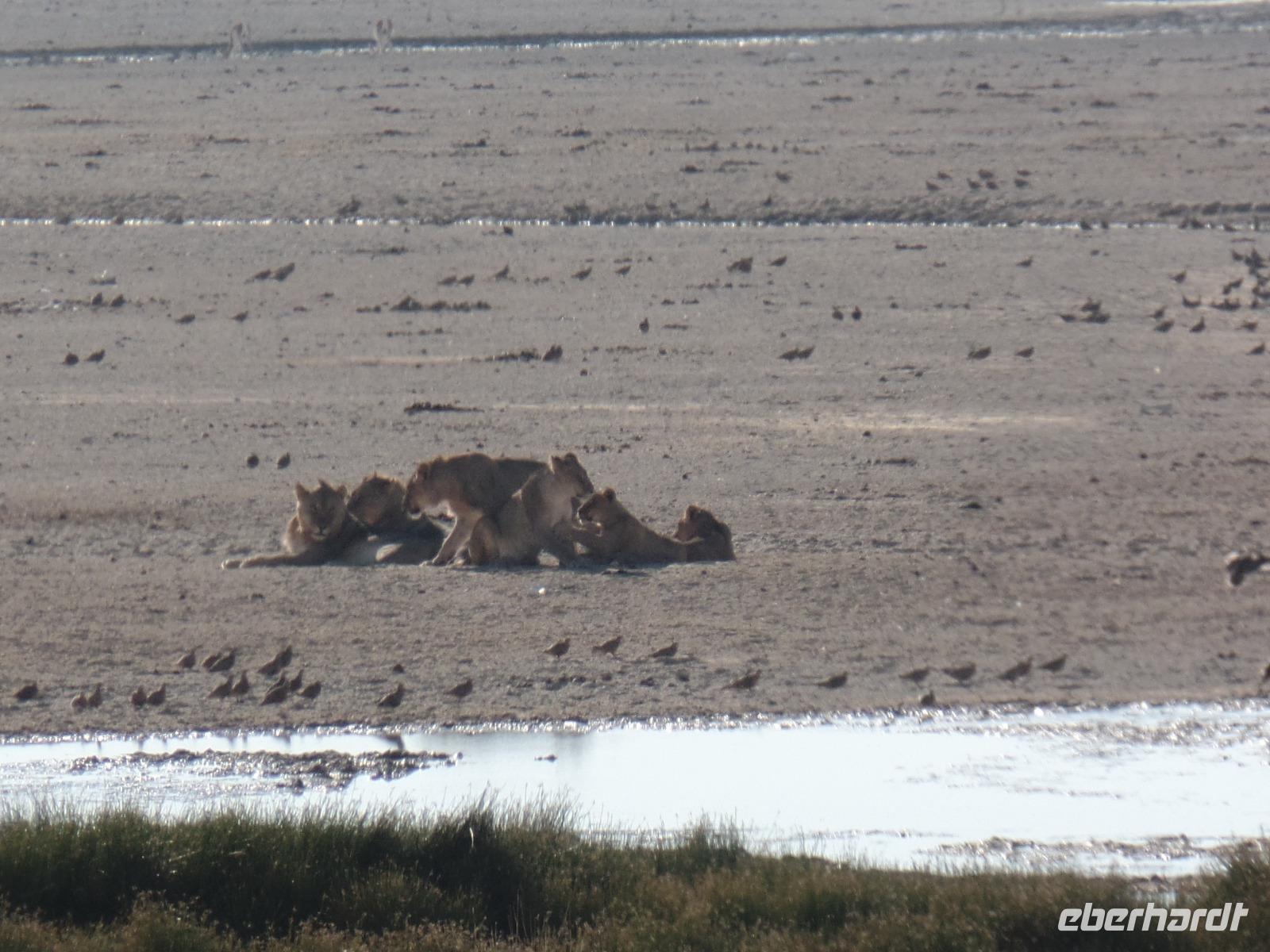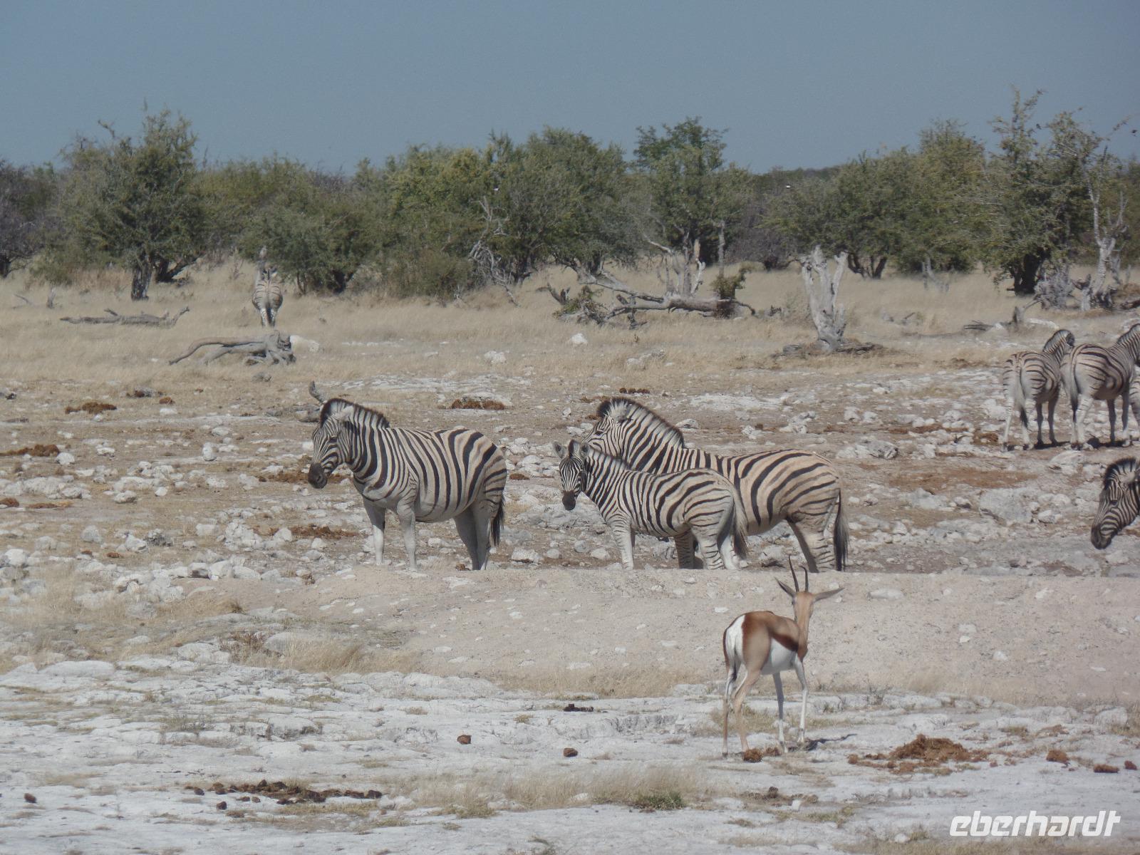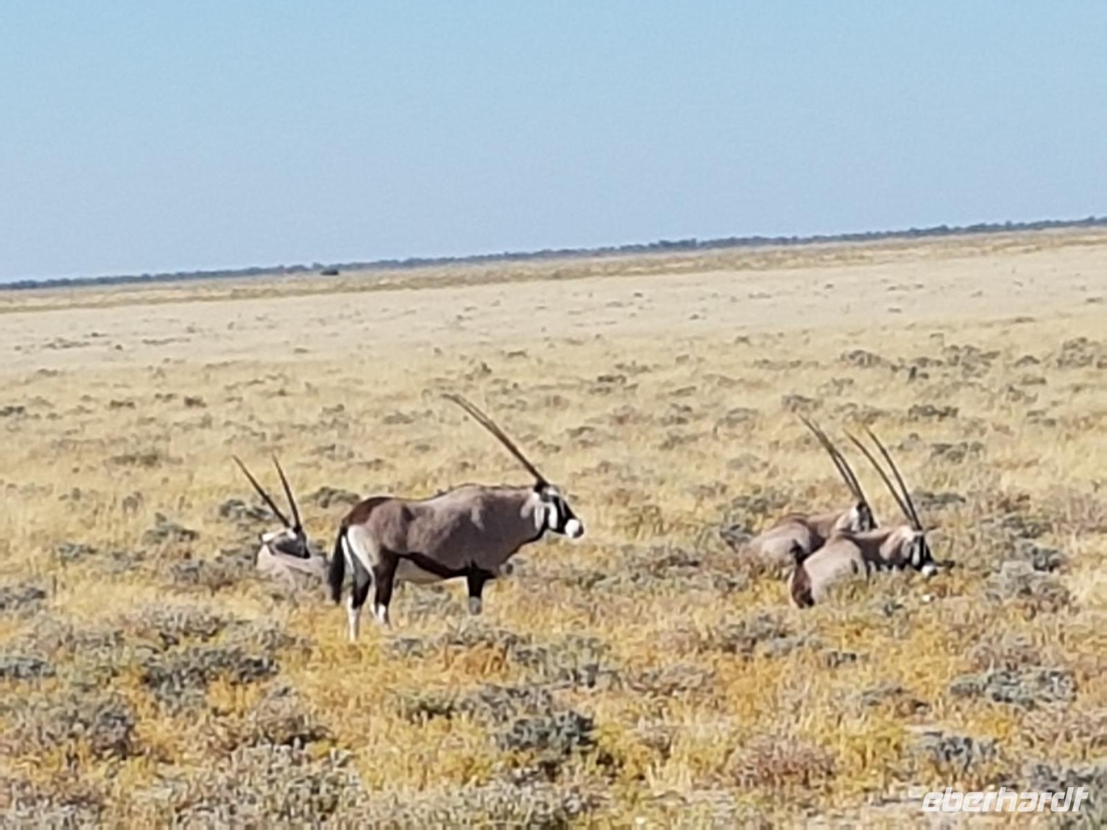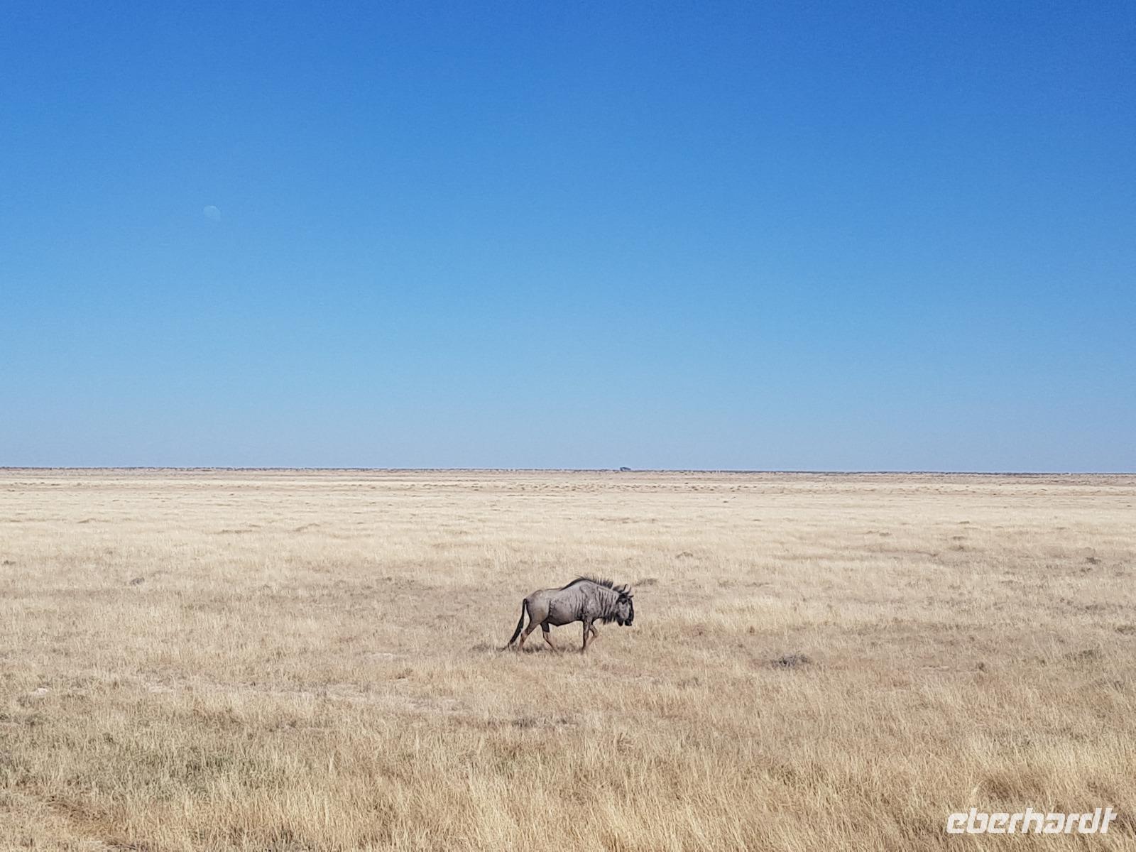 So wie gestern verbrachten wir die Mittagstunden beim gemütlichen Picknick in einem schattigen Camp direkt im Park. Hier konnte man sich was zum Essen bestellen oder zum Wasserloch laufen, um Tiere zu beobachten. Eberhardt Travel lud heute alle Gäste zum Eis ein. War eine gute Idee, oder? Am frühenNachmittag fuhren wir direkt am Rand von dem Herzstück des Parks, die 100 Kilometer lange Etosha-Pfanne. Eine große, weiße Fläche, wie der Name aus der Sansprache bedeutet, breitet sich ins Unendliche aus. Die weiße, nichtgreifbare Weite zieht uns alle magisch in ihren Bann.