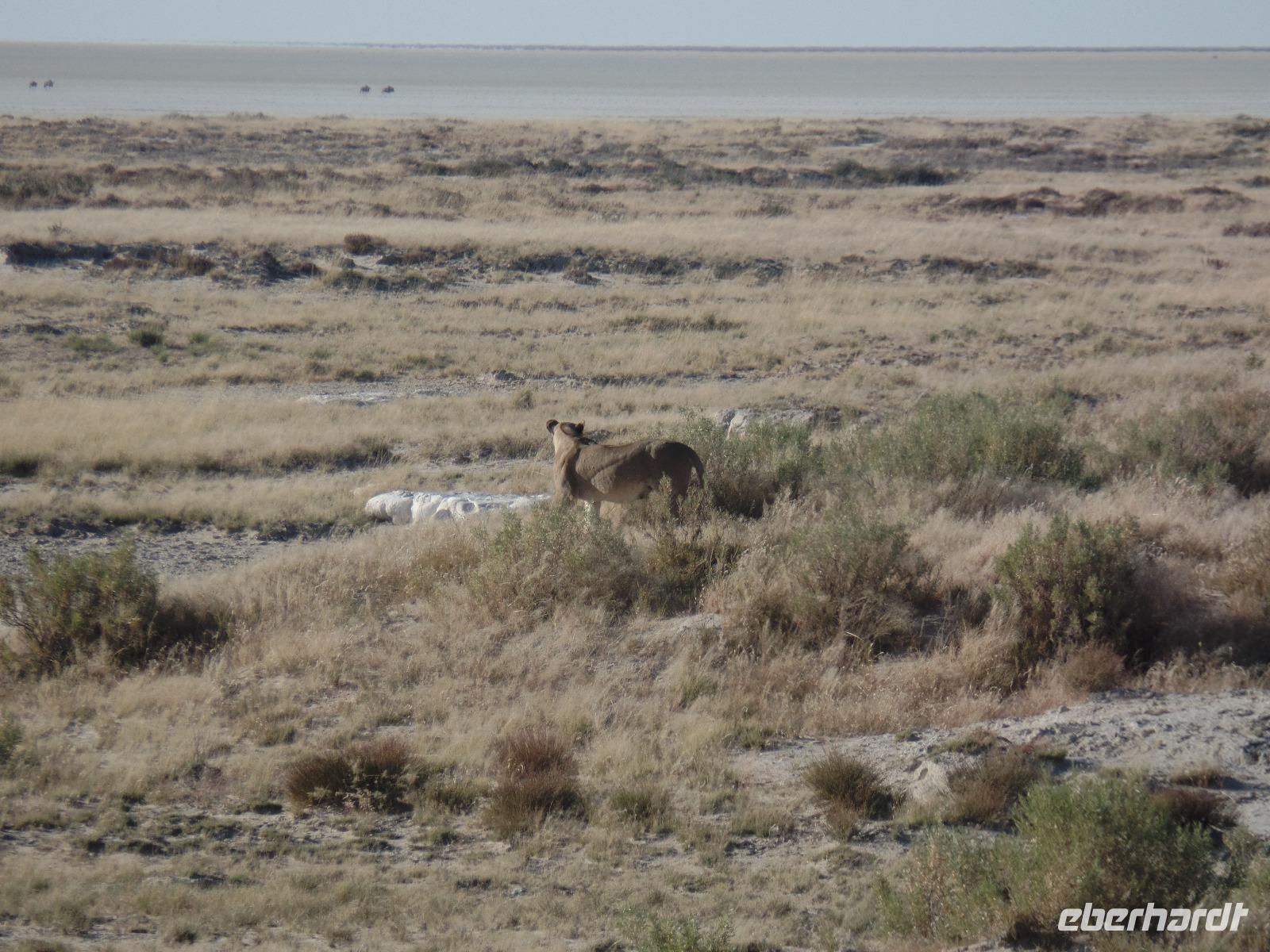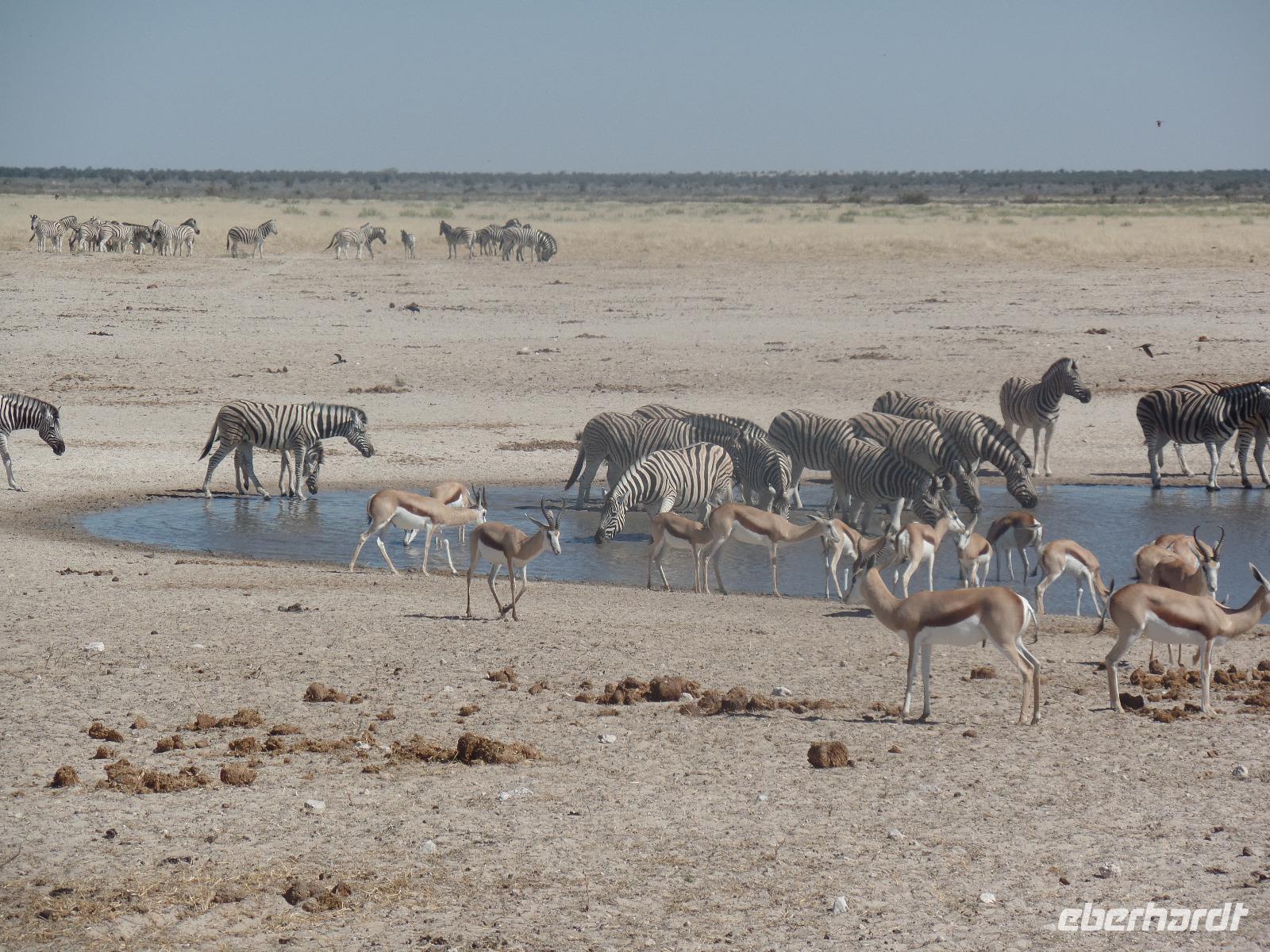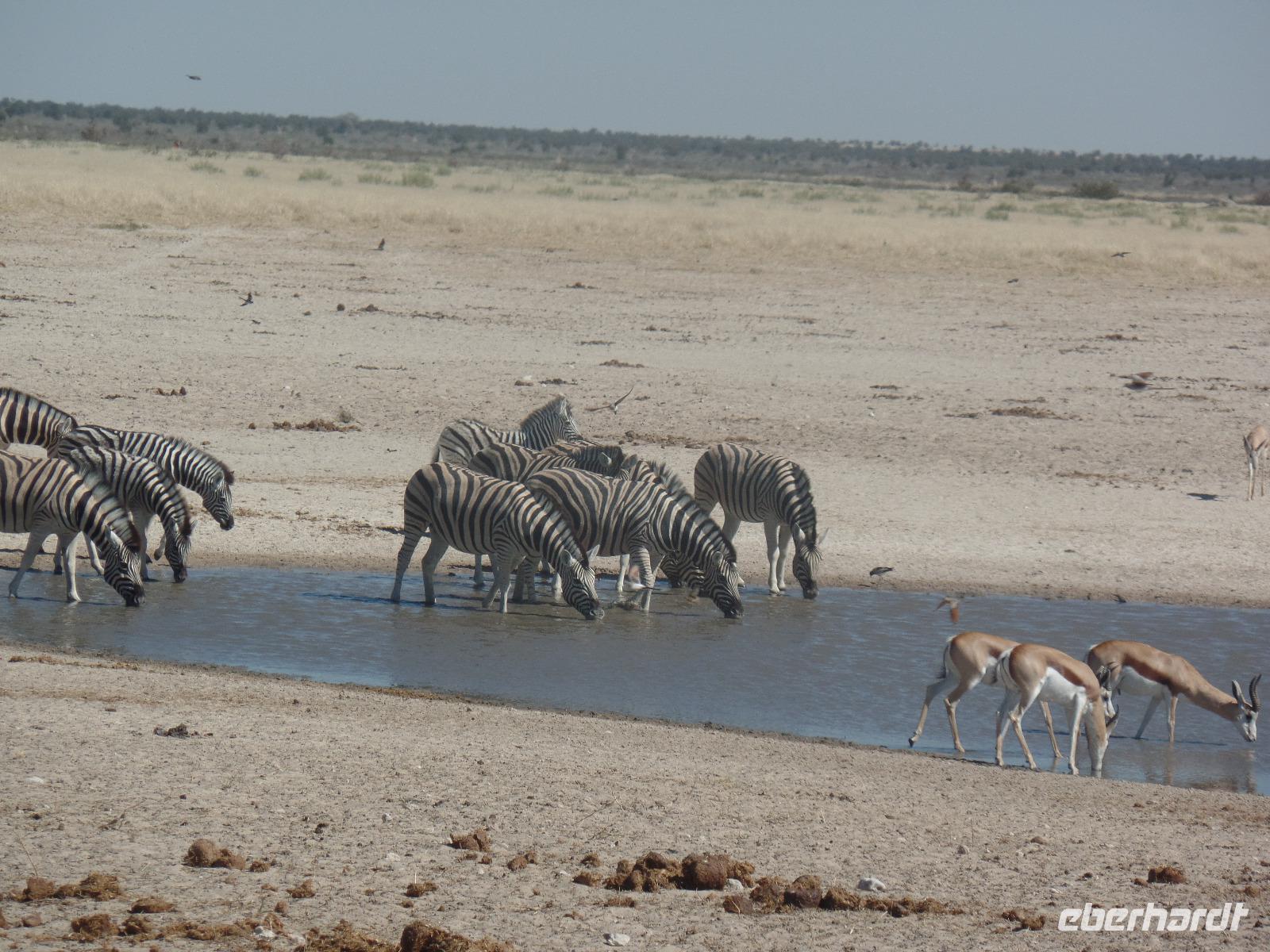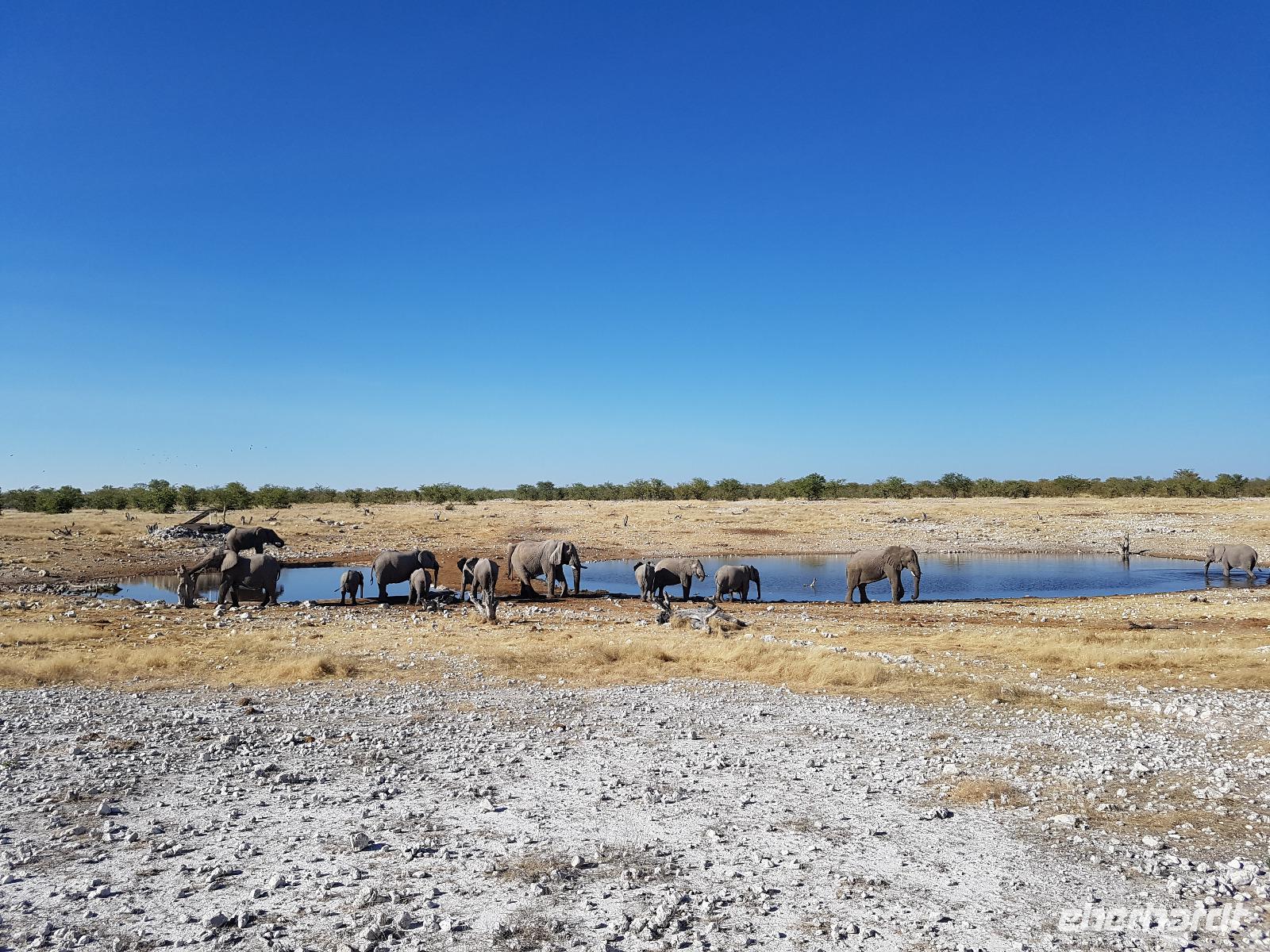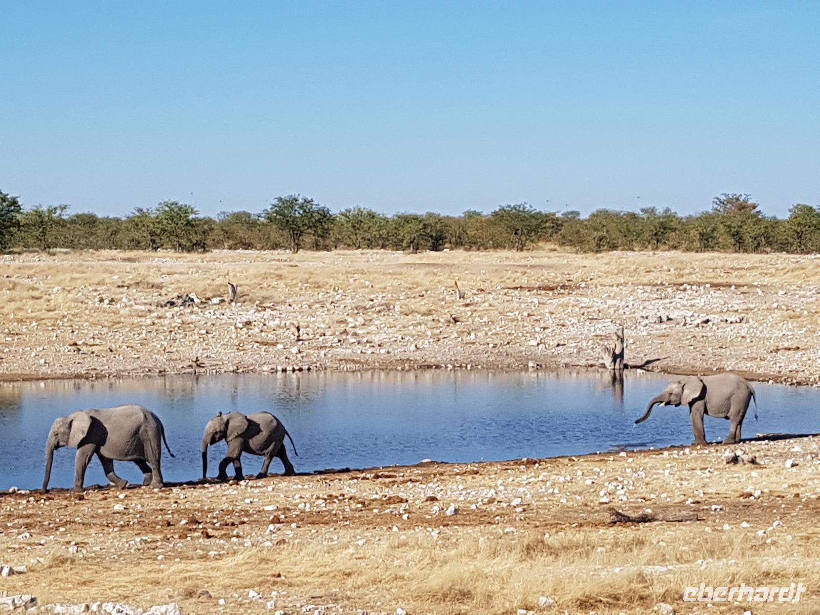 So wie gestern verbrachten wir die Mittagstunden beim gemütlichen Picknick in einem schattigen Camp direkt im Park. Hier konnte man sich was zum Essen bestellen oder zum Wasserloch laufen, um Tiere zu beobachten. Eberhardt Travel lud heute alle Gäste zum Eis ein. War eine gute Idee, oder? Am frühenNachmittag fuhren wir direkt am Rand von dem Herzstück des Parks, die 100 Kilometer lange Etosha-Pfanne. Eine große, weiße Fläche, wie der Name aus der Sansprache bedeutet, breitet sich ins Unendliche aus. Die weiße, nichtgreifbare Weite zieht uns alle magisch in ihren Bann.