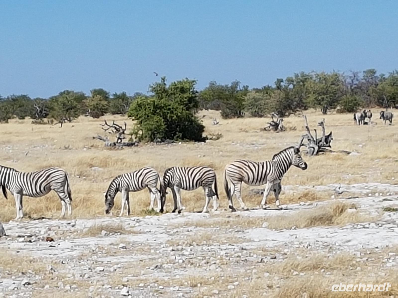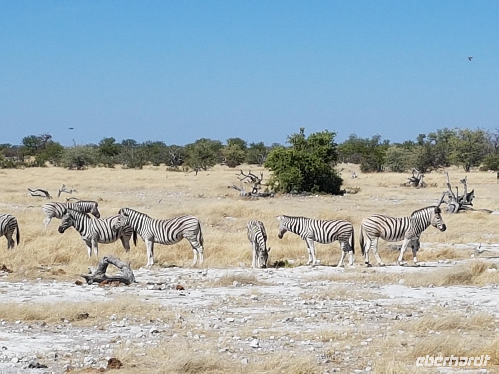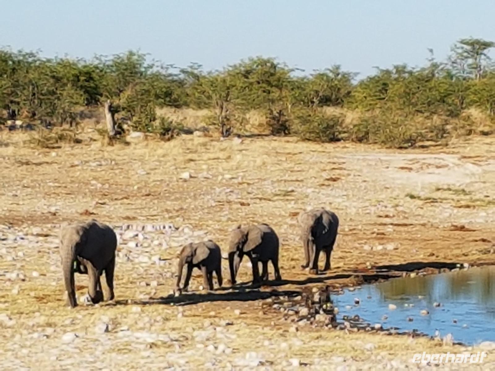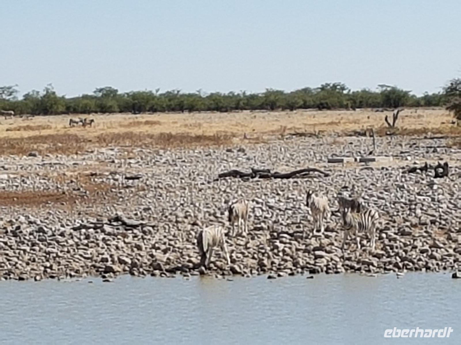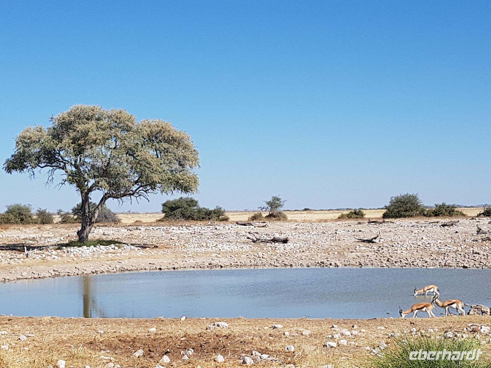 So wie gestern verbrachten wir die Mittagstunden beim gemütlichen Picknick in einem schattigen Camp direkt im Park. Hier konnte man sich was zum Essen bestellen oder zum Wasserloch laufen, um Tiere zu beobachten. Eberhardt Travel lud heute alle Gäste zum Eis ein. War eine gute Idee, oder? Am frühenNachmittag fuhren wir direkt am Rand von dem Herzstück des Parks, die 100 Kilometer lange Etosha-Pfanne. Eine große, weiße Fläche, wie der Name aus der Sansprache bedeutet, breitet sich ins Unendliche aus. Die weiße, nichtgreifbare Weite zieht uns alle magisch in ihren Bann.