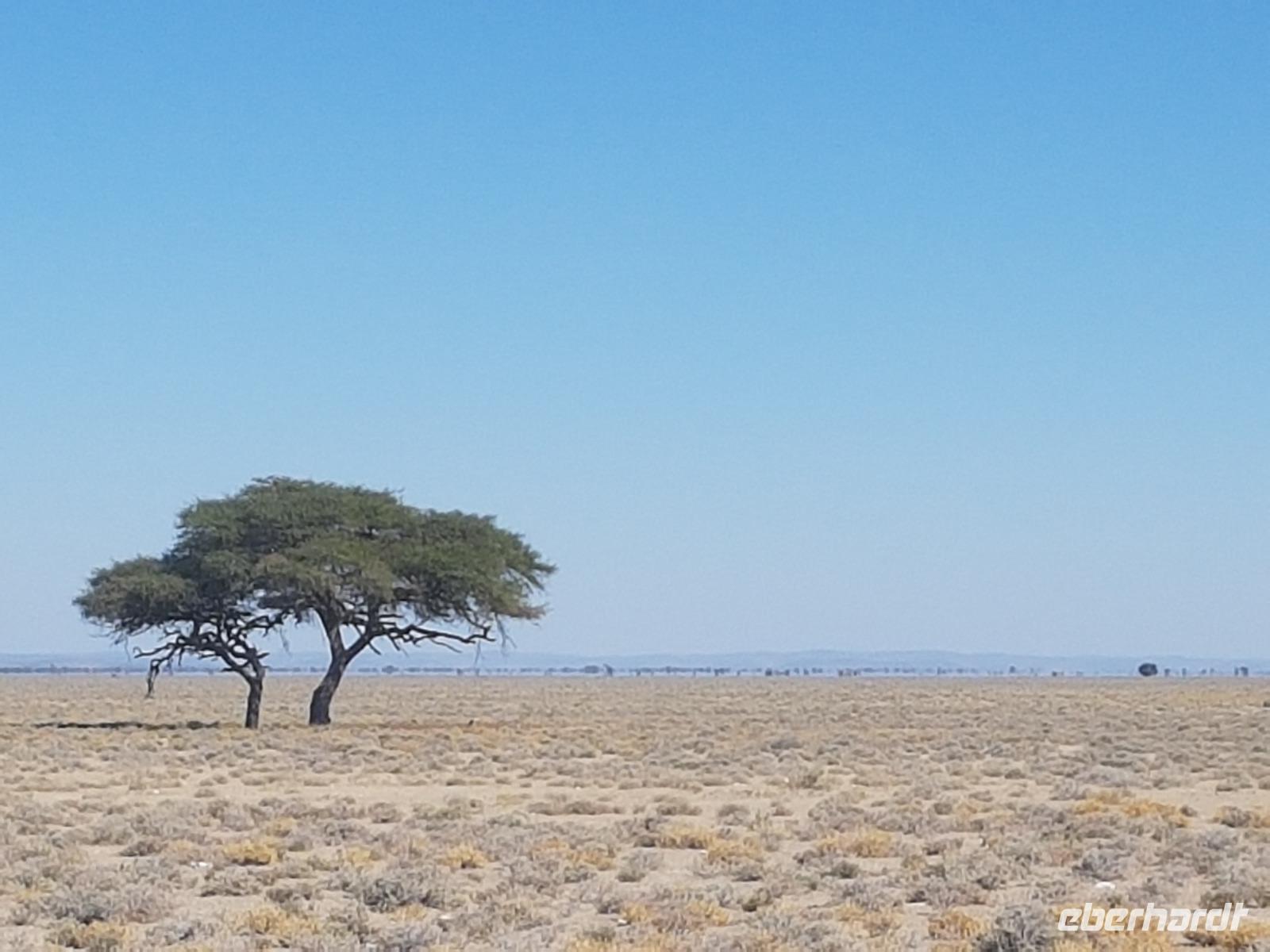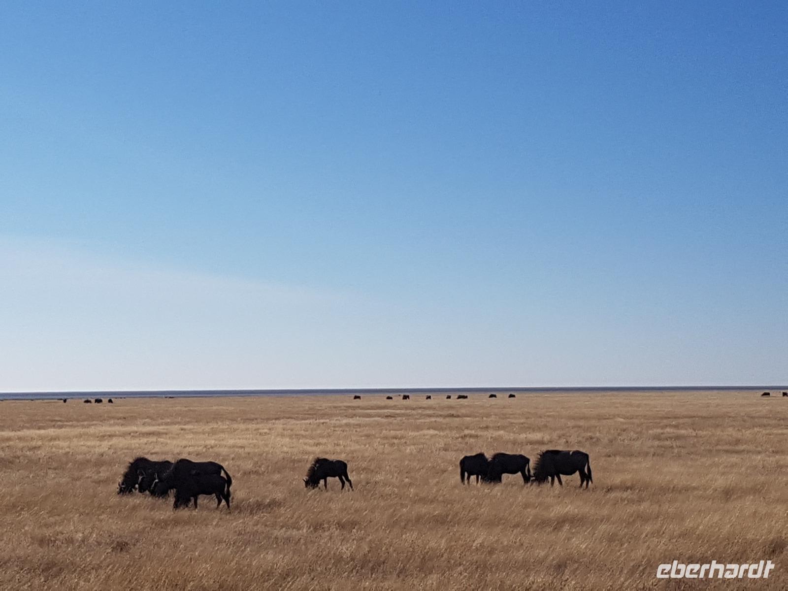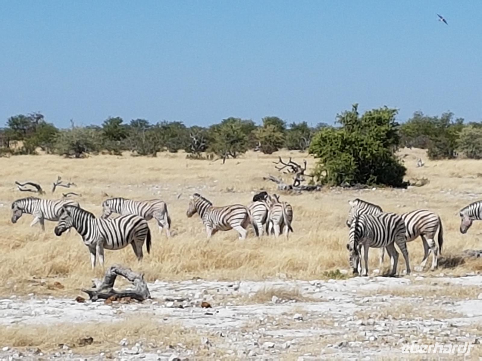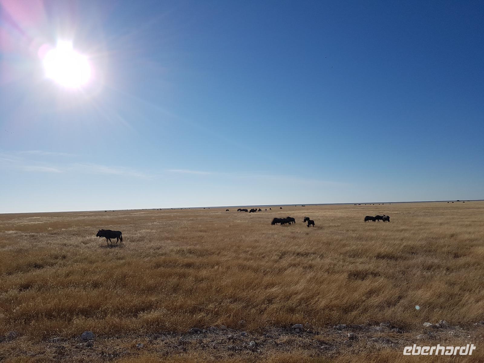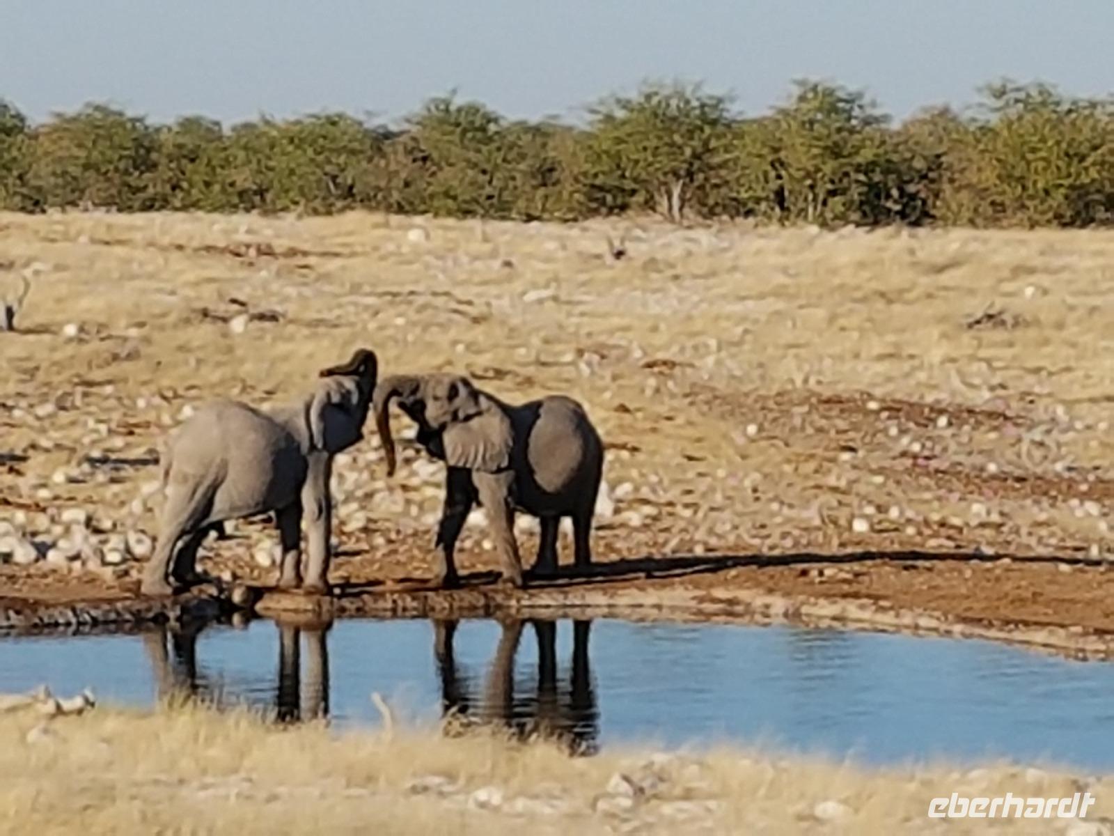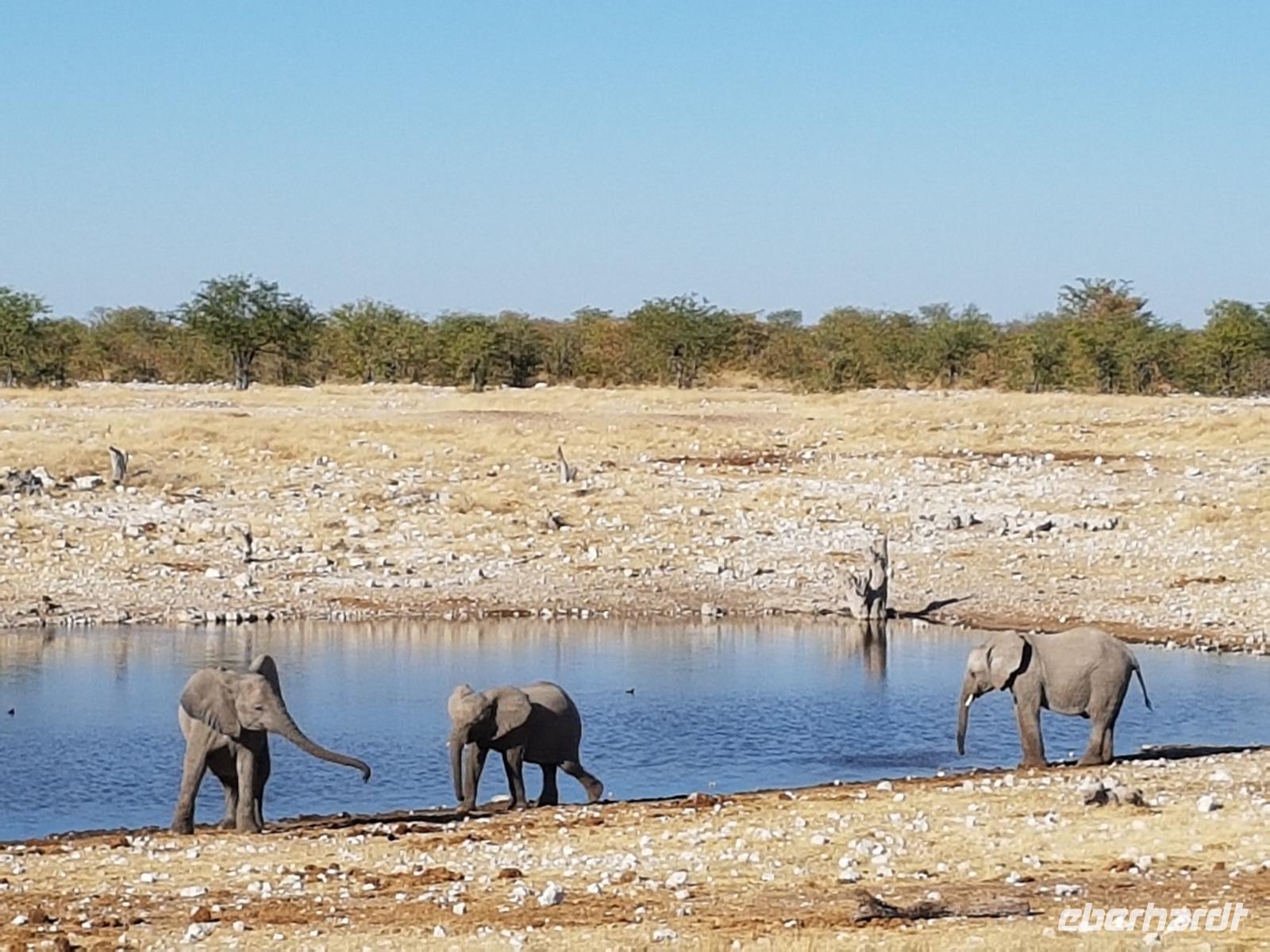 So wie gestern verbrachten wir die Mittagstunden beim gemütlichen Picknick in einem schattigen Camp direkt im Park. Hier konnte man sich was zum Essen bestellen oder zum Wasserloch laufen, um Tiere zu beobachten. Eberhardt Travel lud heute alle Gäste zum Eis ein. War eine gute Idee, oder? Am frühenNachmittag fuhren wir direkt am Rand von dem Herzstück des Parks, die 100 Kilometer lange Etosha-Pfanne. Eine große, weiße Fläche, wie der Name aus der Sansprache bedeutet, breitet sich ins Unendliche aus. Die weiße, nichtgreifbare Weite zieht uns alle magisch in ihren Bann.