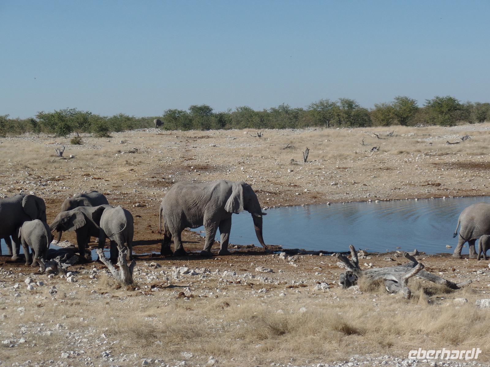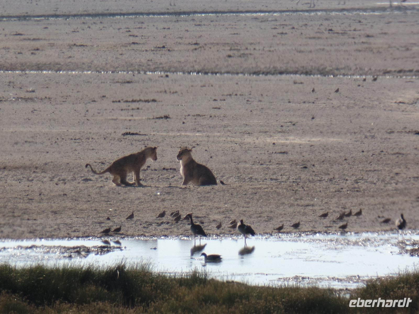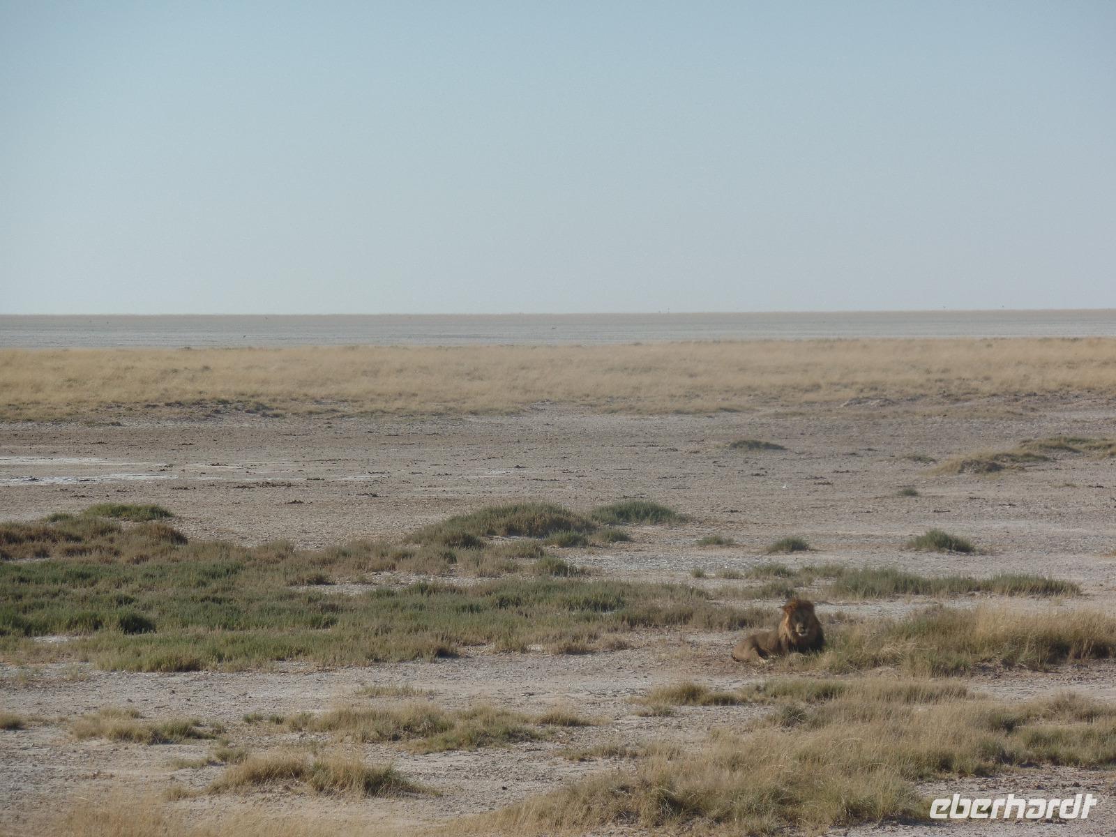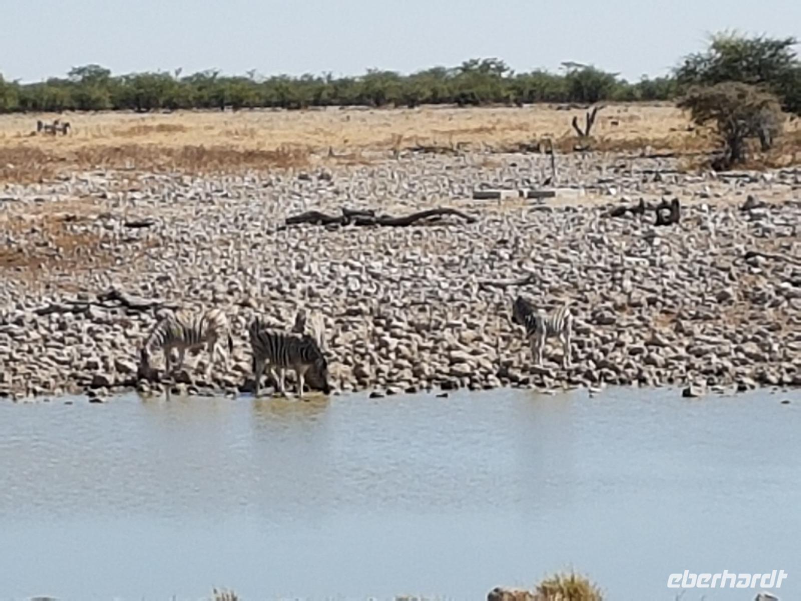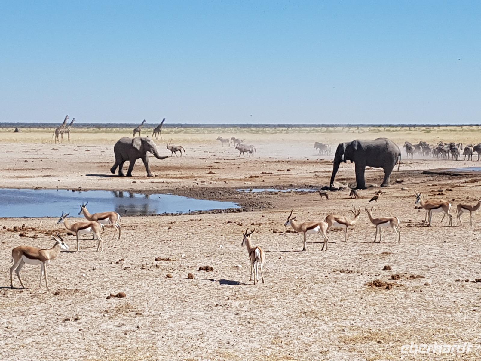 So wie gestern verbrachten wir die Mittagstunden beim gemütlichen Picknick in einem schattigen Camp direkt im Park. Hier konnte man sich was zum Essen bestellen oder zum Wasserloch laufen, um Tiere zu beobachten. Eberhardt Travel lud heute alle Gäste zum Eis ein. War eine gute Idee, oder? Am frühenNachmittag fuhren wir direkt am Rand von dem Herzstück des Parks, die 100 Kilometer lange Etosha-Pfanne. Eine große, weiße Fläche, wie der Name aus der Sansprache bedeutet, breitet sich ins Unendliche aus. Die weiße, nichtgreifbare Weite zieht uns alle magisch in ihren Bann.
