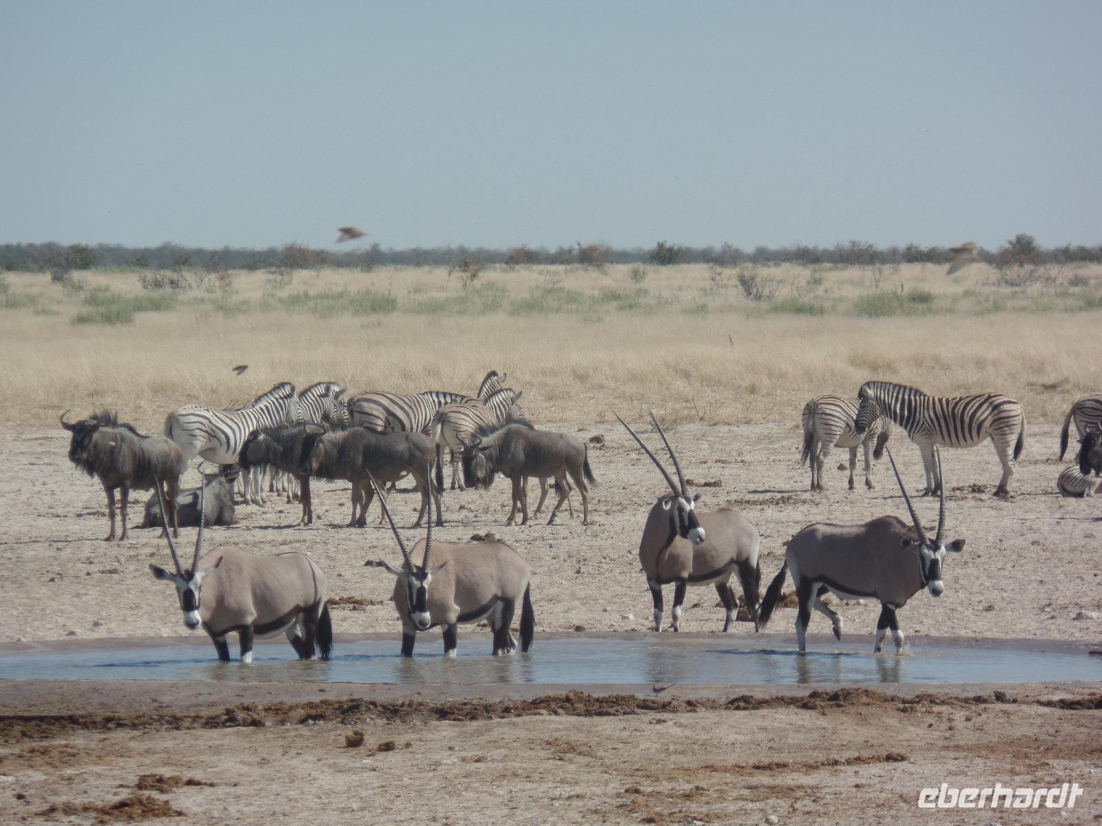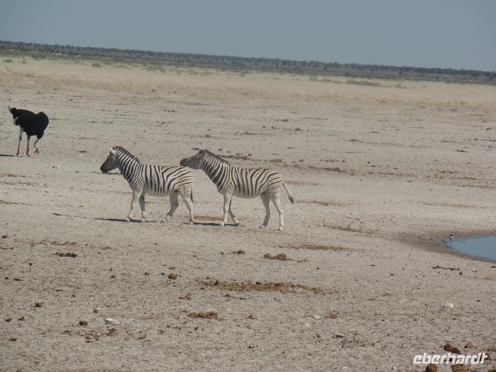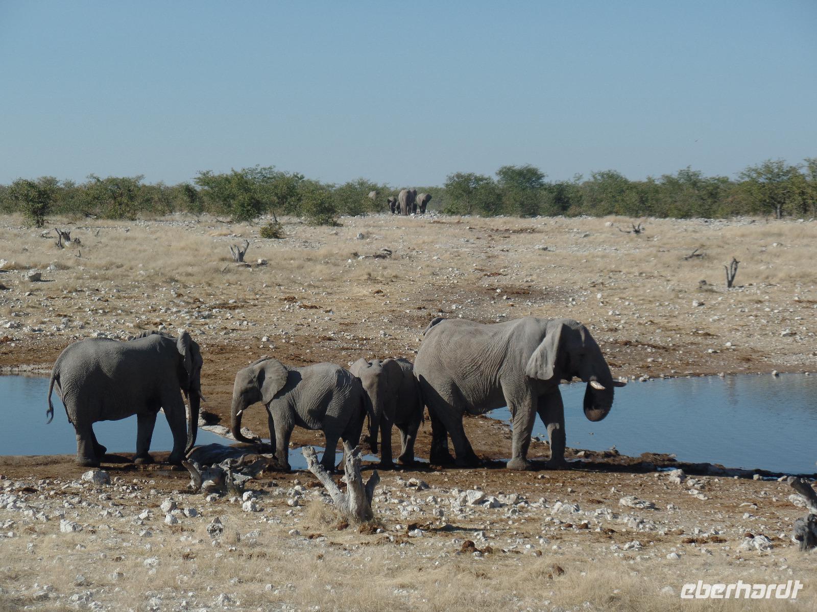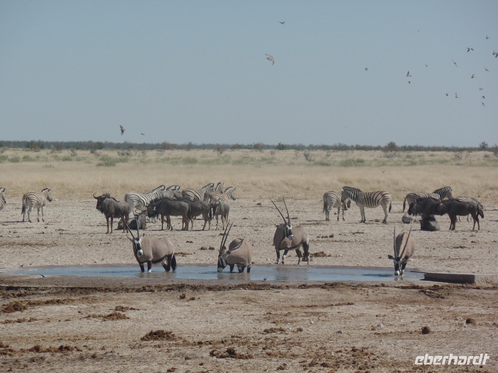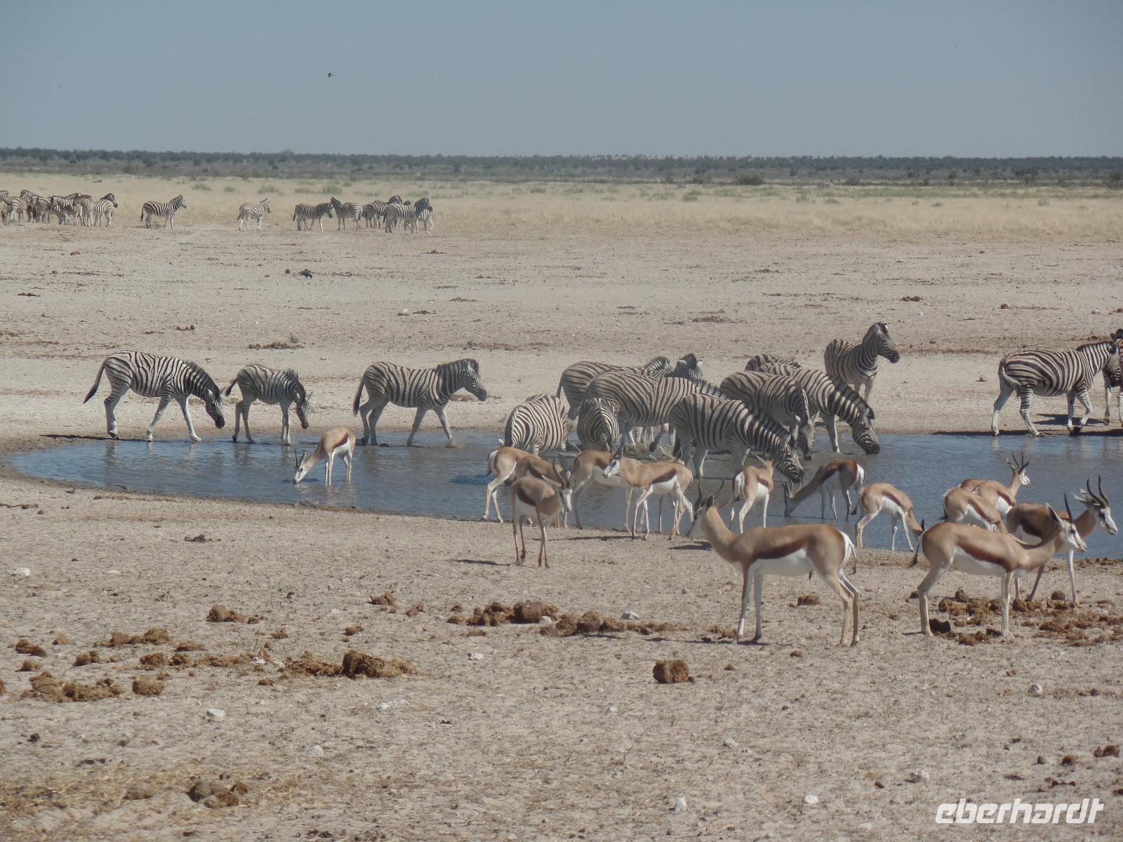 So wie gestern verbrachten wir die Mittagstunden beim gemütlichen Picknick in einem schattigen Camp direkt im Park. Hier konnte man sich was zum Essen bestellen oder zum Wasserloch laufen, um Tiere zu beobachten. Eberhardt Travel lud heute alle Gäste zum Eis ein. War eine gute Idee, oder? Am frühenNachmittag fuhren wir direkt am Rand von dem Herzstück des Parks, die 100 Kilometer lange Etosha-Pfanne. Eine große, weiße Fläche, wie der Name aus der Sansprache bedeutet, breitet sich ins Unendliche aus. Die weiße, nichtgreifbare Weite zieht uns alle magisch in ihren Bann.