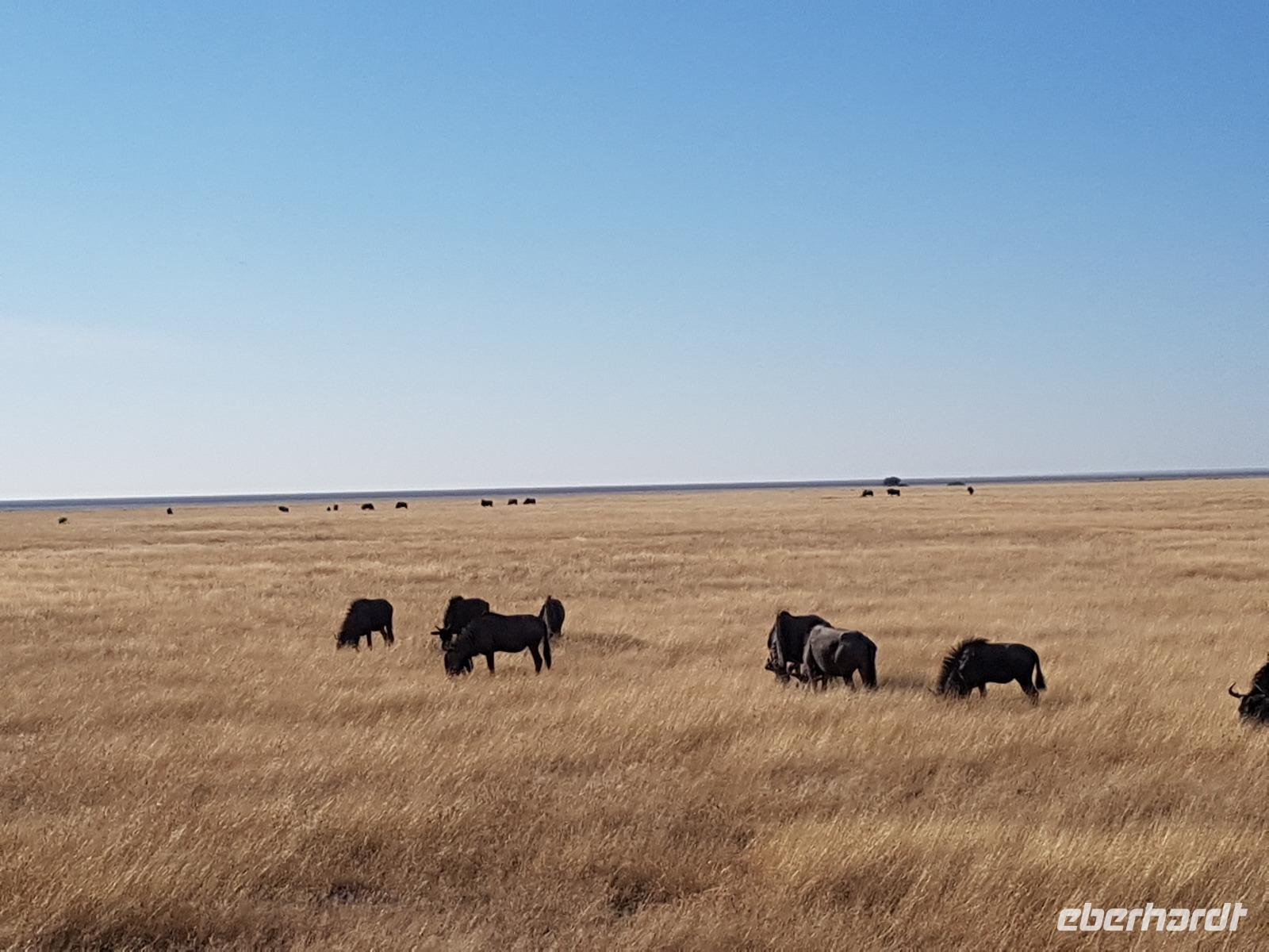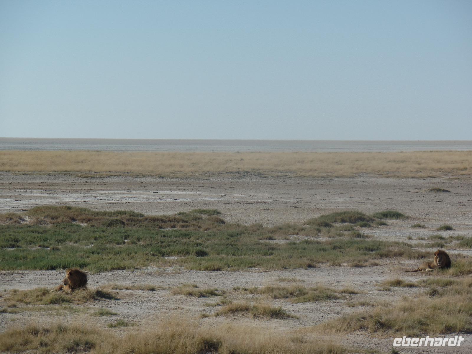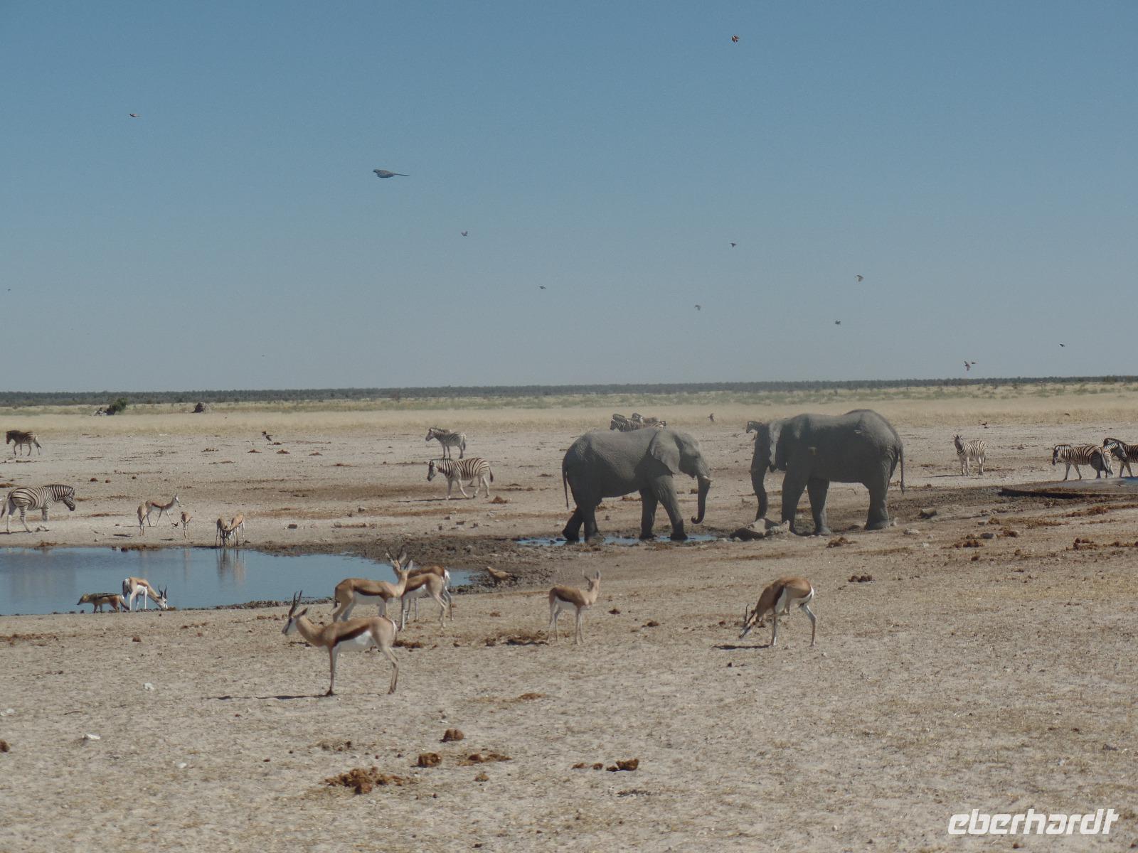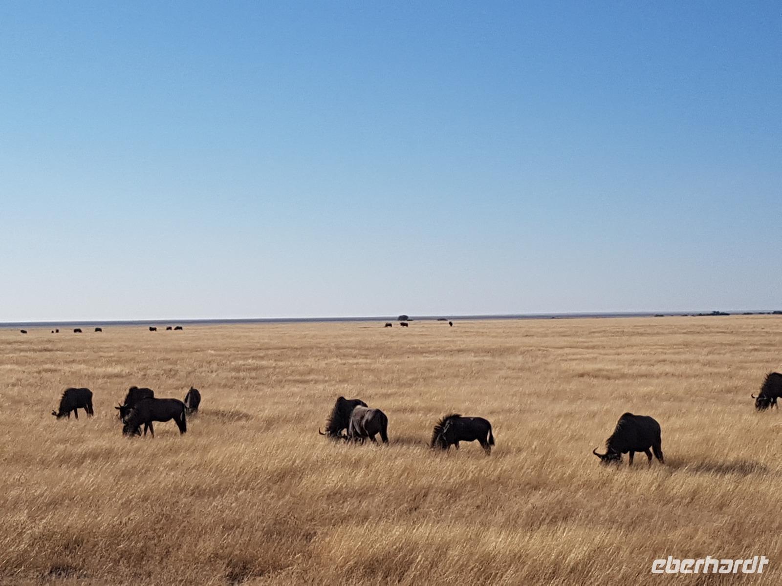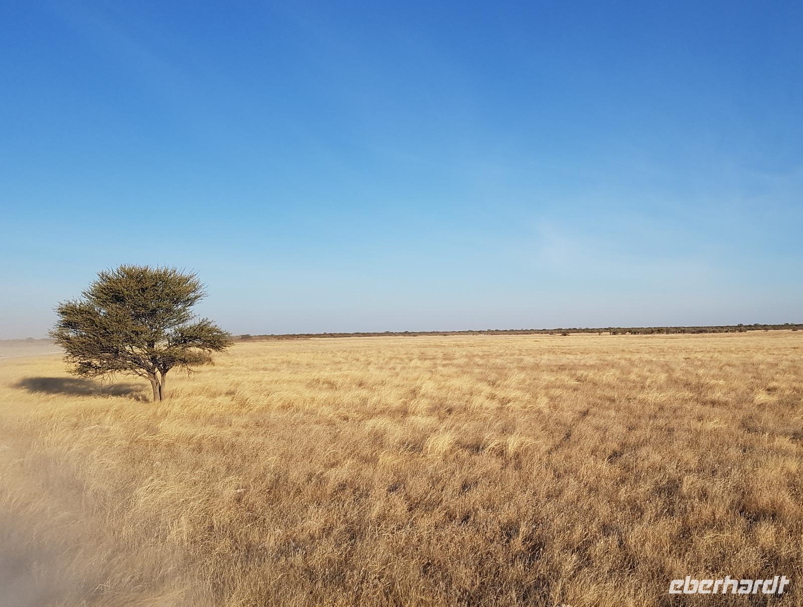 So wie gestern verbrachten wir die Mittagstunden beim gemütlichen Picknick in einem schattigen Camp direkt im Park. Hier konnte man sich was zum Essen bestellen oder zum Wasserloch laufen, um Tiere zu beobachten. Eberhardt Travel lud heute alle Gäste zum Eis ein. War eine gute Idee, oder? Am frühenNachmittag fuhren wir direkt am Rand von dem Herzstück des Parks, die 100 Kilometer lange Etosha-Pfanne. Eine große, weiße Fläche, wie der Name aus der Sansprache bedeutet, breitet sich ins Unendliche aus. Die weiße, nichtgreifbare Weite zieht uns alle magisch in ihren Bann.