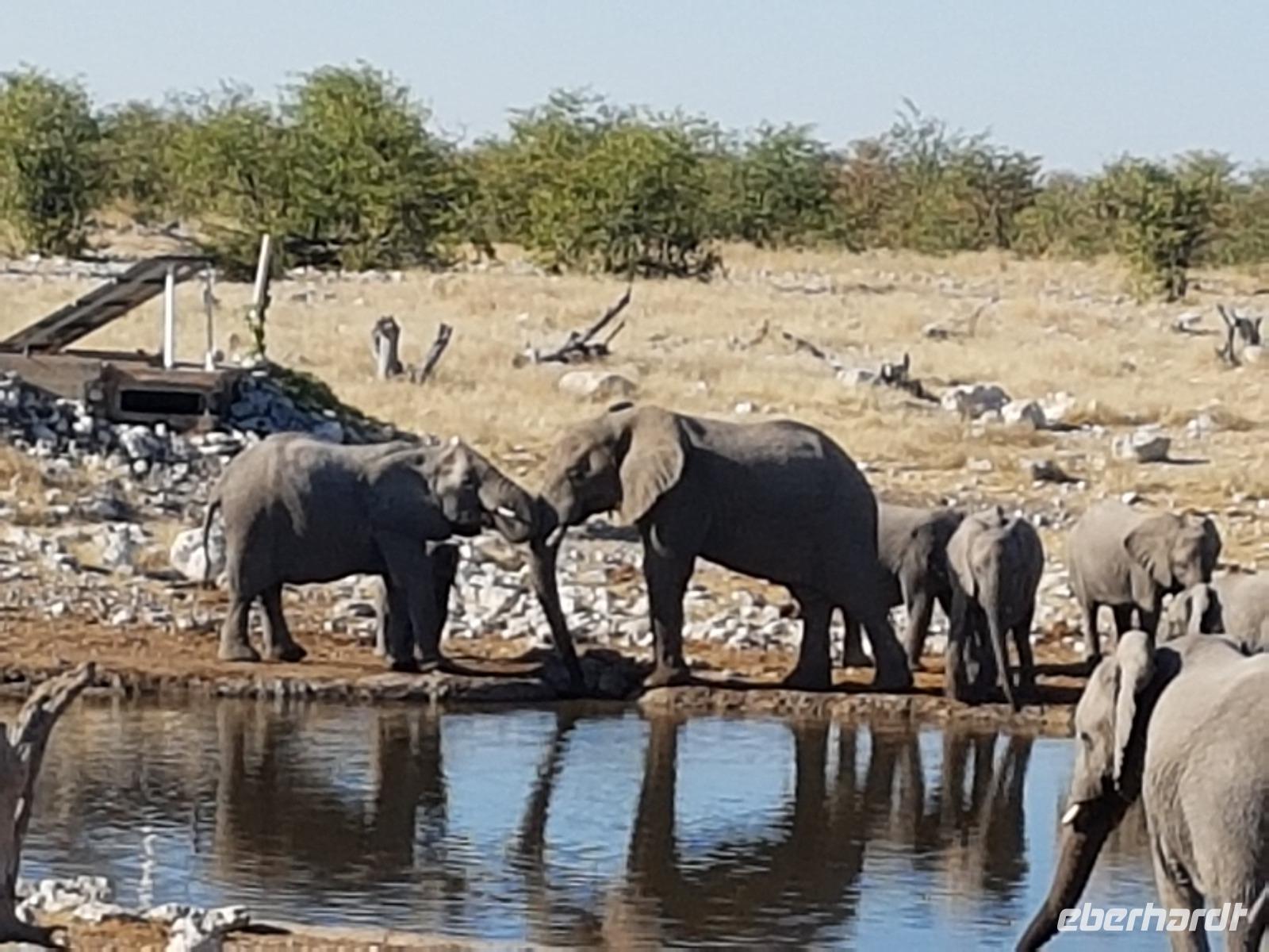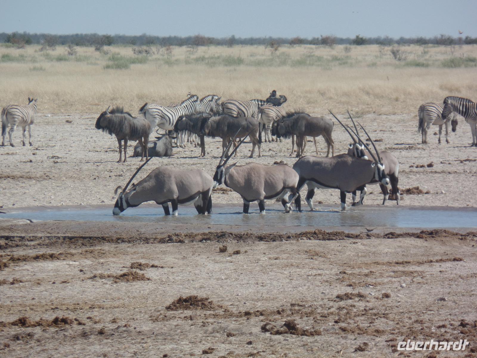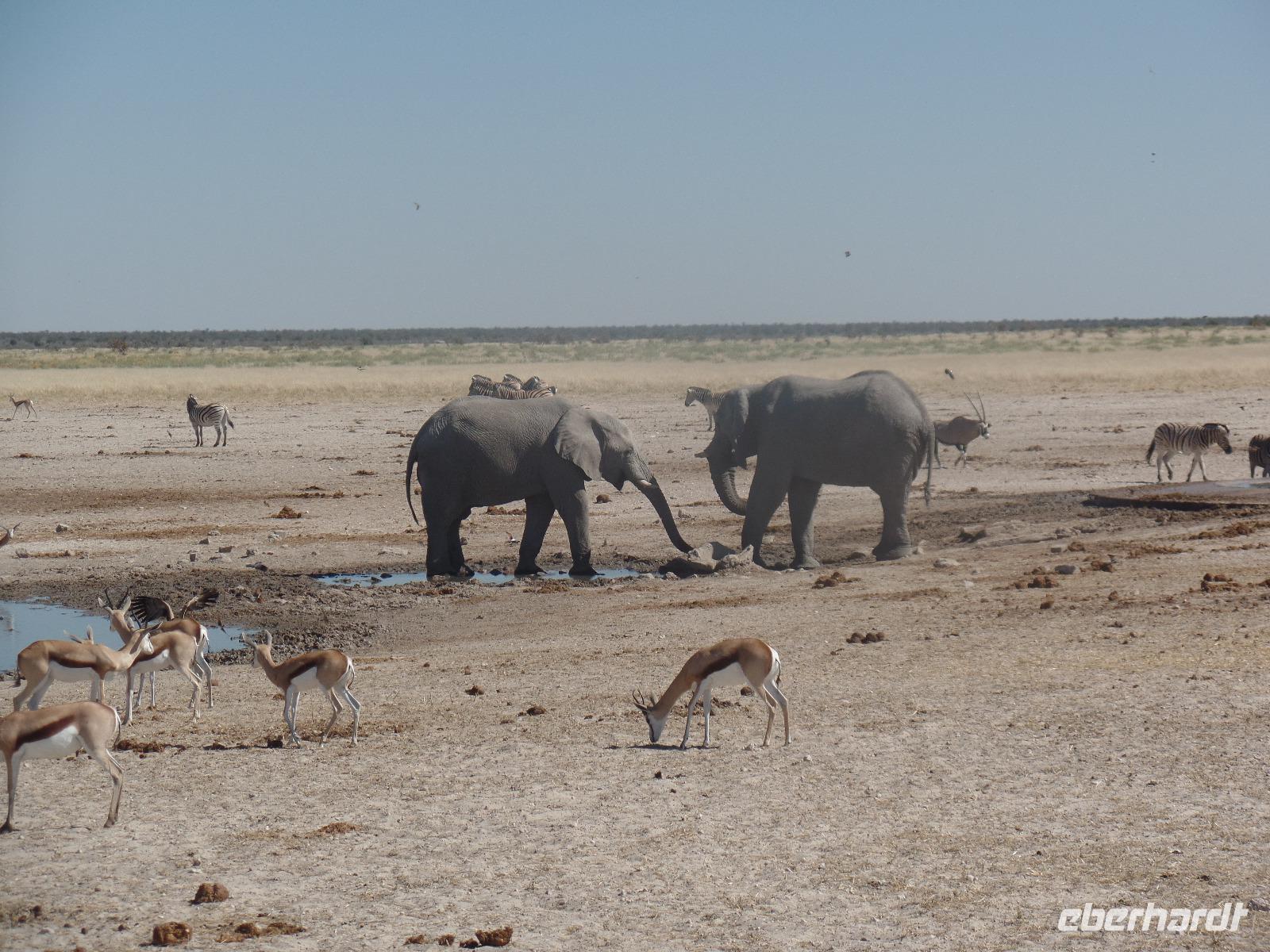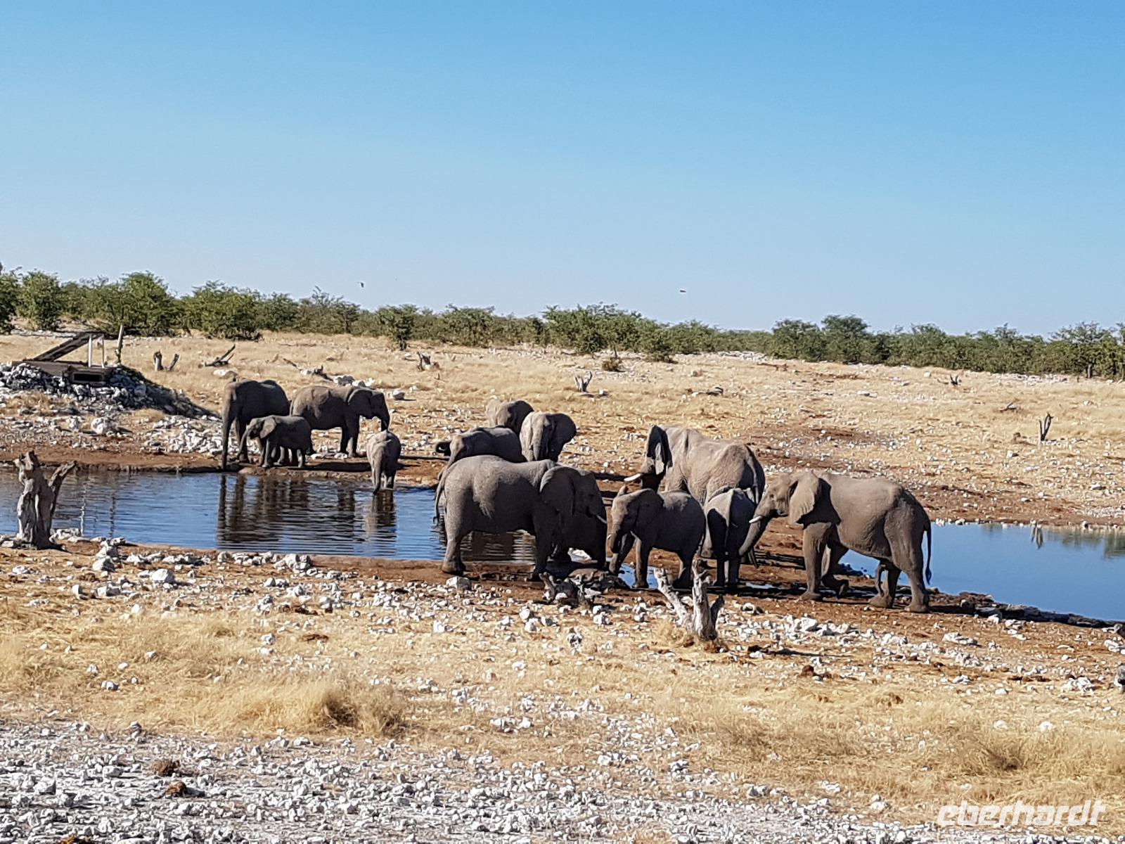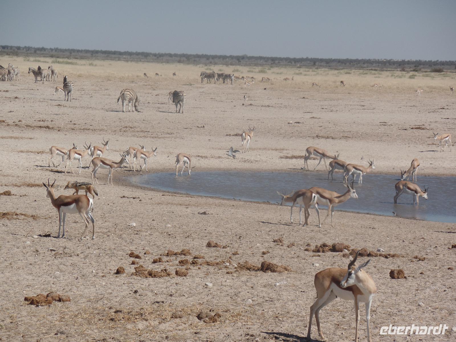 So wie gestern verbrachten wir die Mittagstunden beim gemütlichen Picknick in einem schattigen Camp direkt im Park. Hier konnte man sich was zum Essen bestellen oder zum Wasserloch laufen, um Tiere zu beobachten. Eberhardt Travel lud heute alle Gäste zum Eis ein. War eine gute Idee, oder? Am frühenNachmittag fuhren wir direkt am Rand von dem Herzstück des Parks, die 100 Kilometer lange Etosha-Pfanne. Eine große, weiße Fläche, wie der Name aus der Sansprache bedeutet, breitet sich ins Unendliche aus. Die weiße, nichtgreifbare Weite zieht uns alle magisch in ihren Bann.