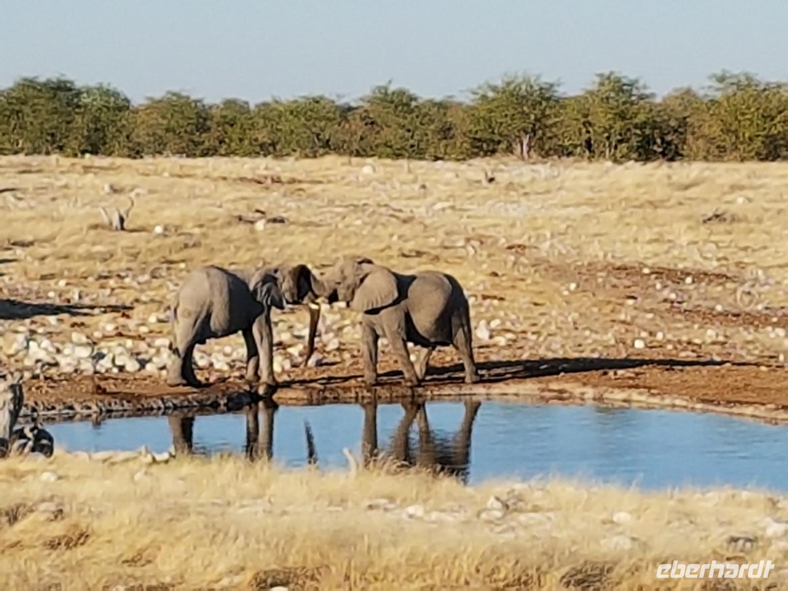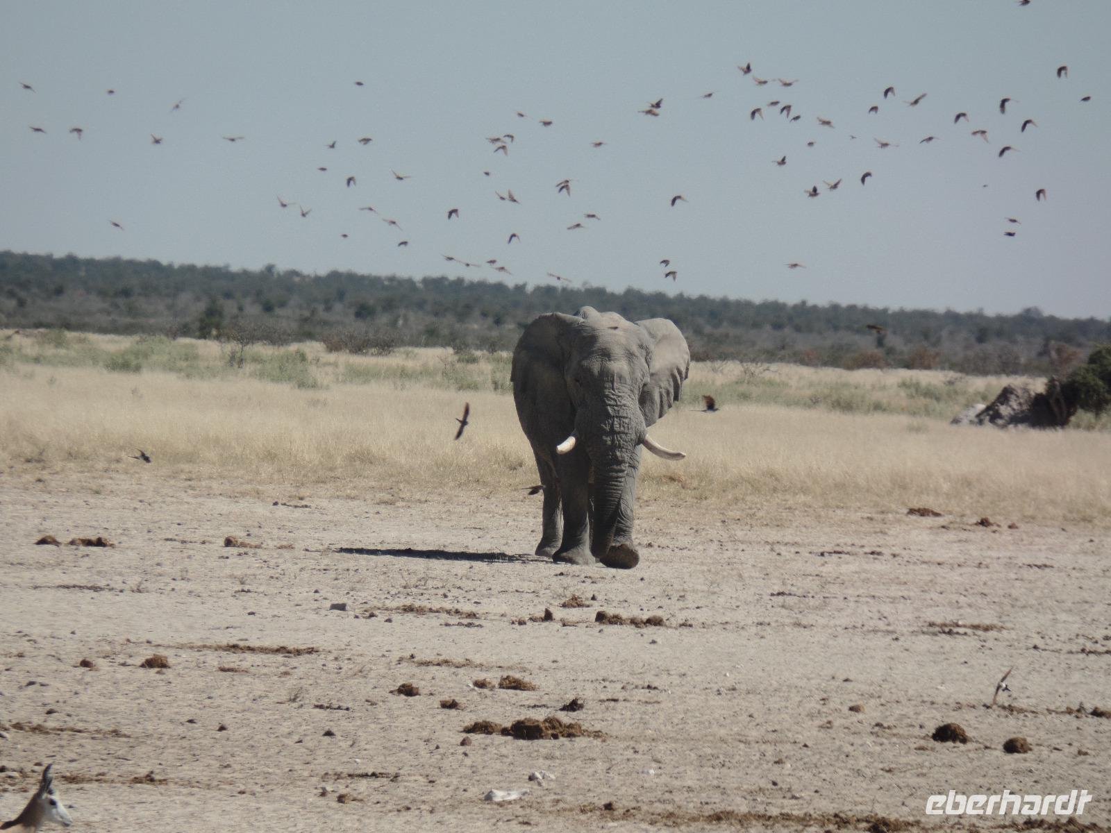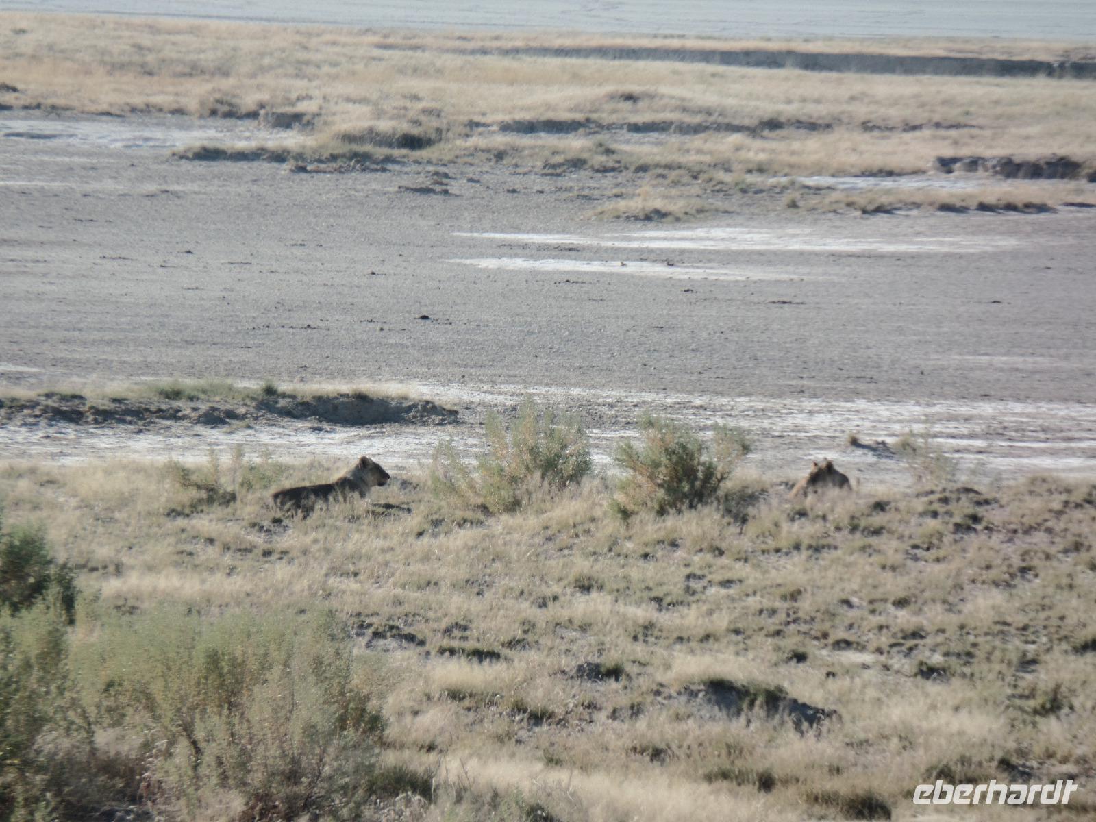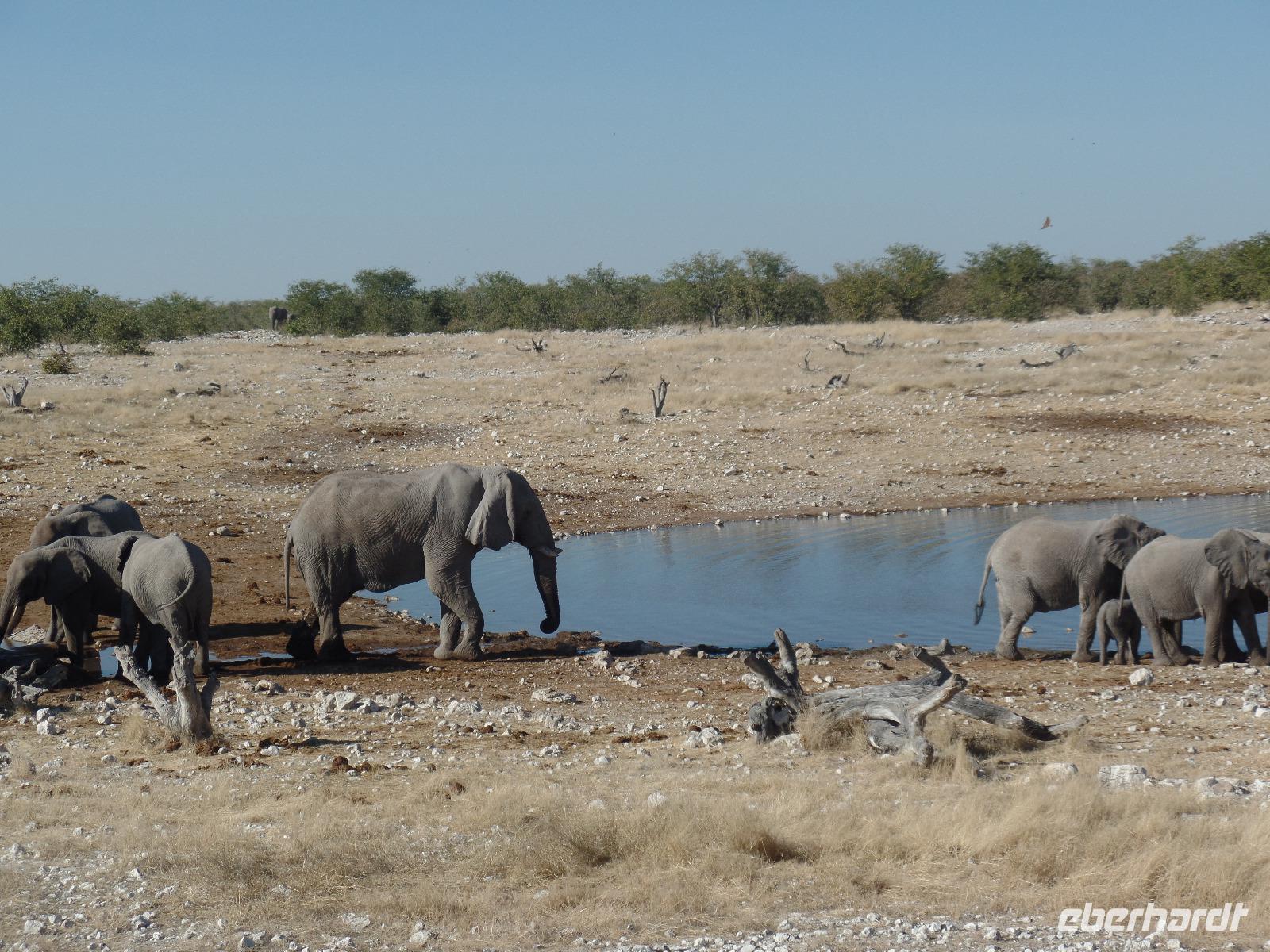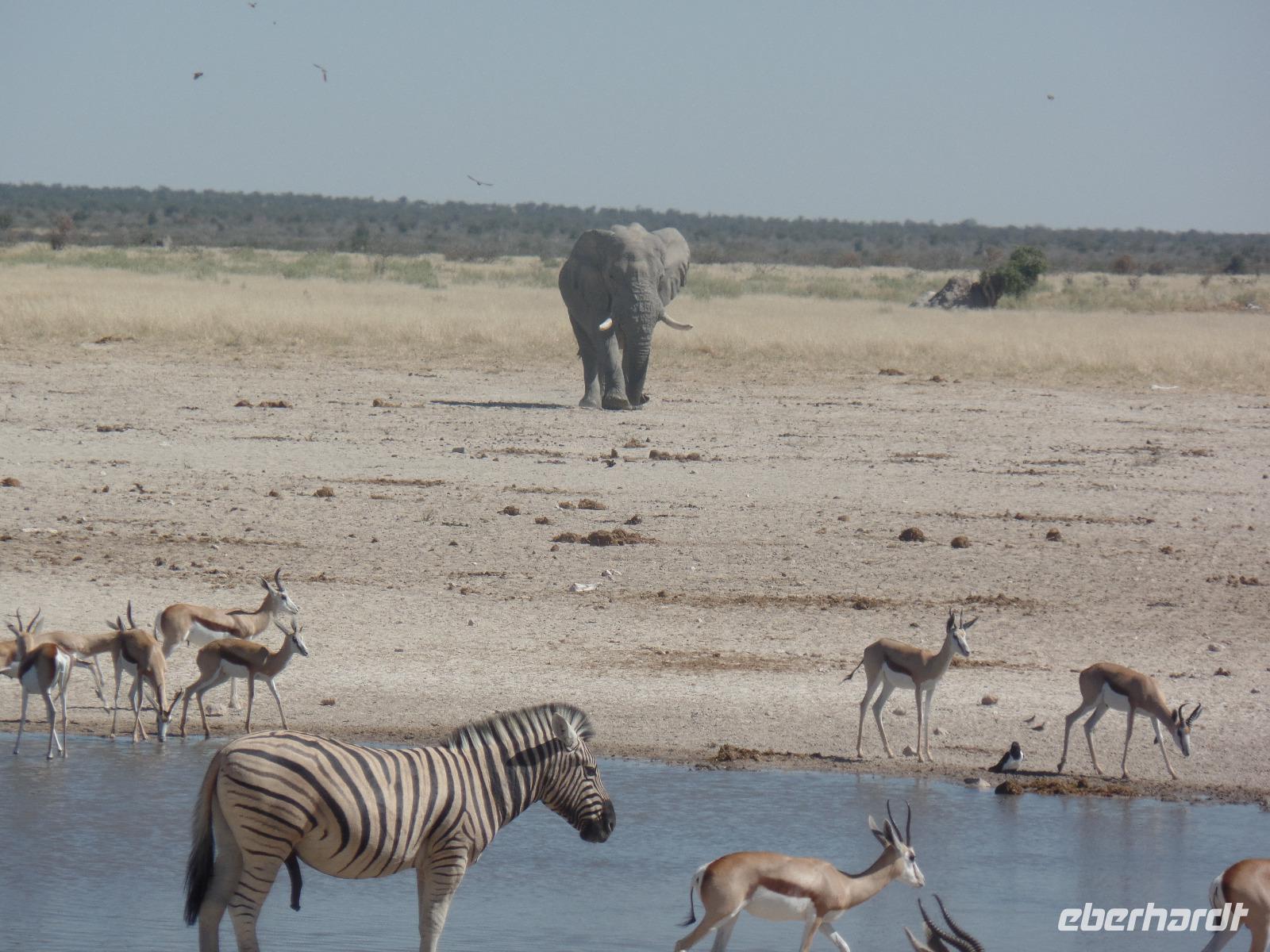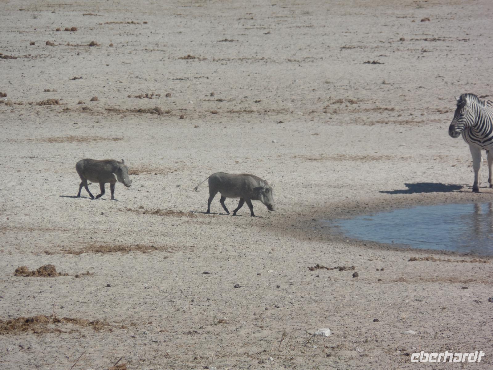 So wie gestern verbrachten wir die Mittagstunden beim gemütlichen Picknick in einem schattigen Camp direkt im Park. Hier konnte man sich was zum Essen bestellen oder zum Wasserloch laufen, um Tiere zu beobachten. Eberhardt Travel lud heute alle Gäste zum Eis ein. War eine gute Idee, oder? Am frühenNachmittag fuhren wir direkt am Rand von dem Herzstück des Parks, die 100 Kilometer lange Etosha-Pfanne. Eine große, weiße Fläche, wie der Name aus der Sansprache bedeutet, breitet sich ins Unendliche aus. Die weiße, nichtgreifbare Weite zieht uns alle magisch in ihren Bann.
