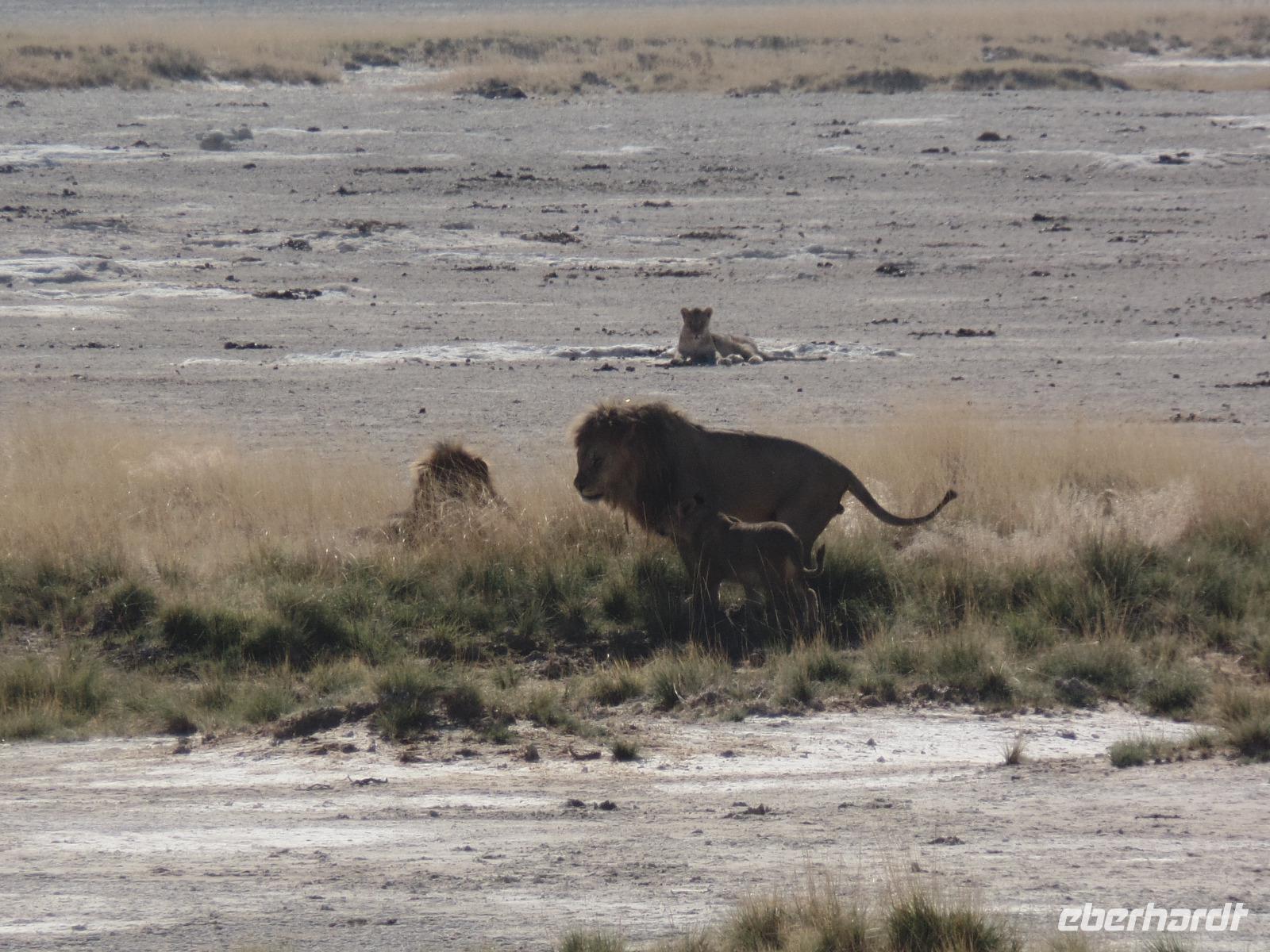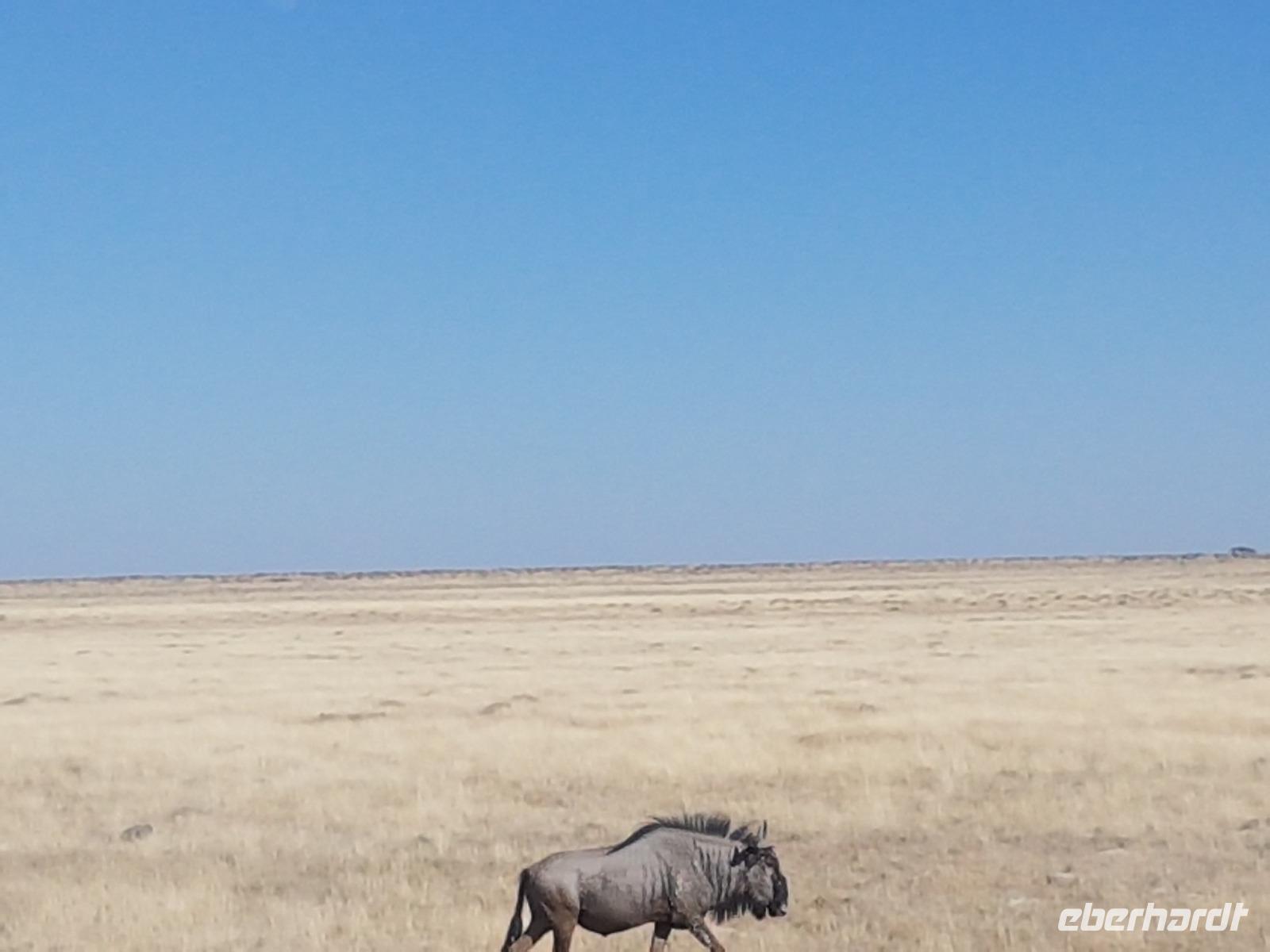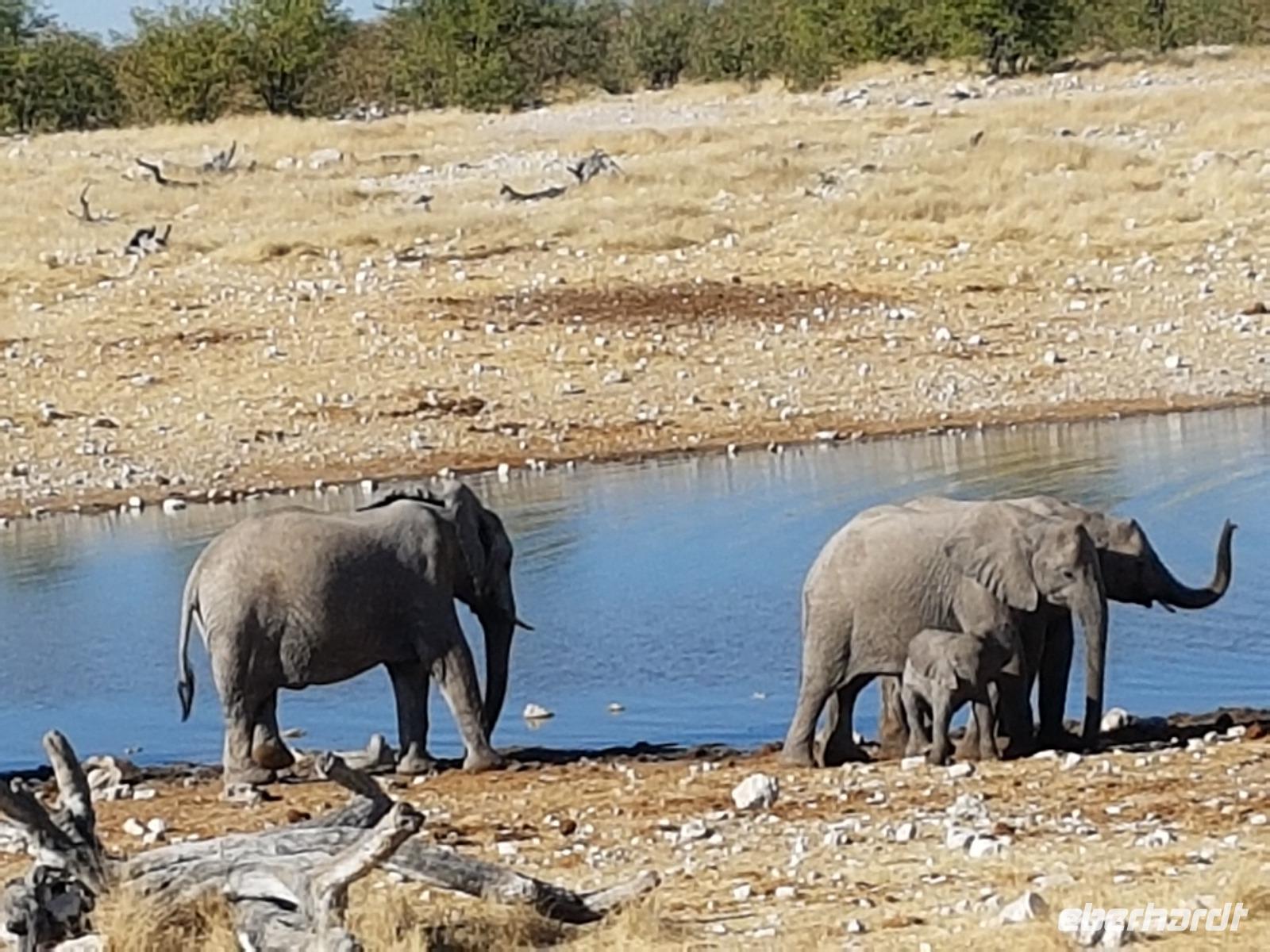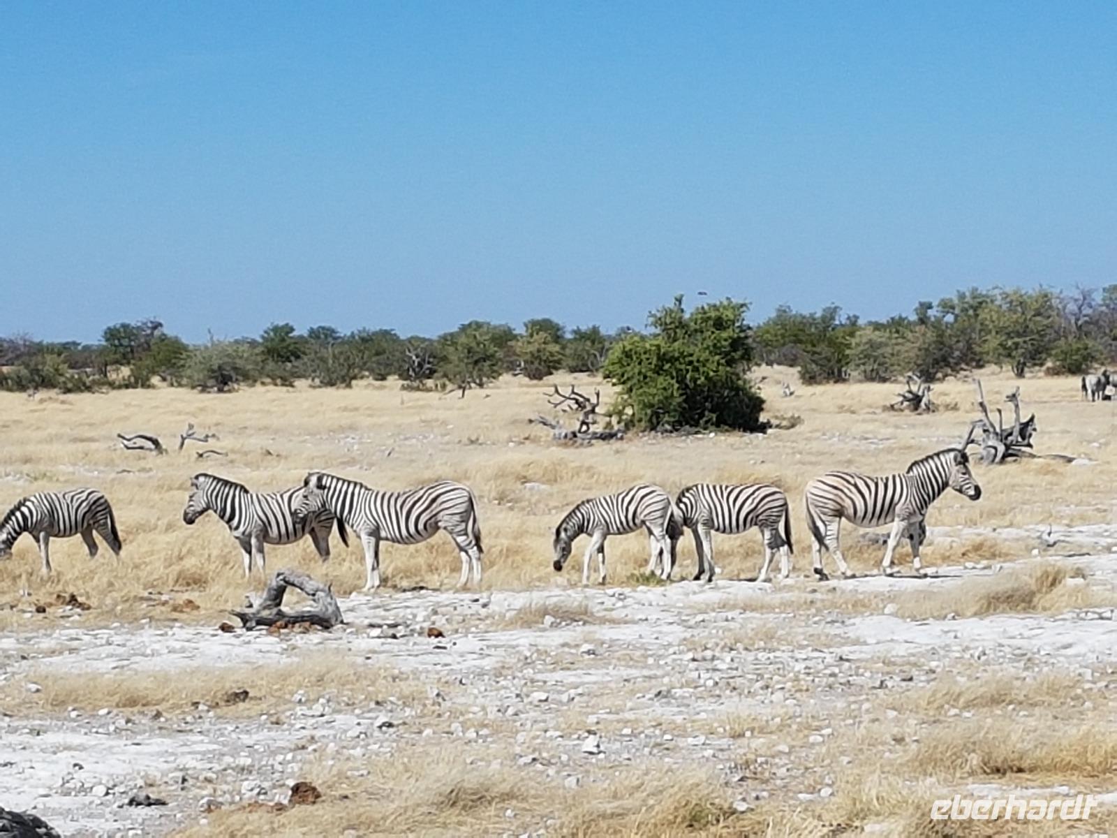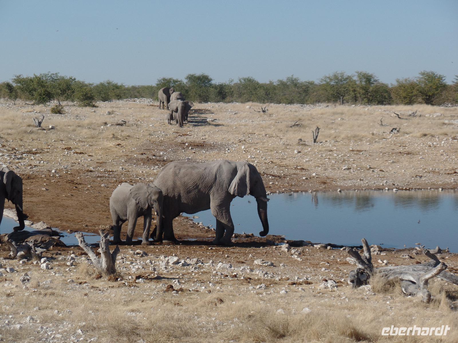 So wie gestern verbrachten wir die Mittagstunden beim gemütlichen Picknick in einem schattigen Camp direkt im Park. Hier konnte man sich was zum Essen bestellen oder zum Wasserloch laufen, um Tiere zu beobachten. Eberhardt Travel lud heute alle Gäste zum Eis ein. War eine gute Idee, oder? Am frühenNachmittag fuhren wir direkt am Rand von dem Herzstück des Parks, die 100 Kilometer lange Etosha-Pfanne. Eine große, weiße Fläche, wie der Name aus der Sansprache bedeutet, breitet sich ins Unendliche aus. Die weiße, nichtgreifbare Weite zieht uns alle magisch in ihren Bann.