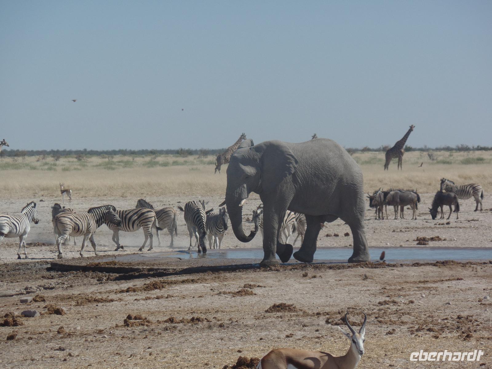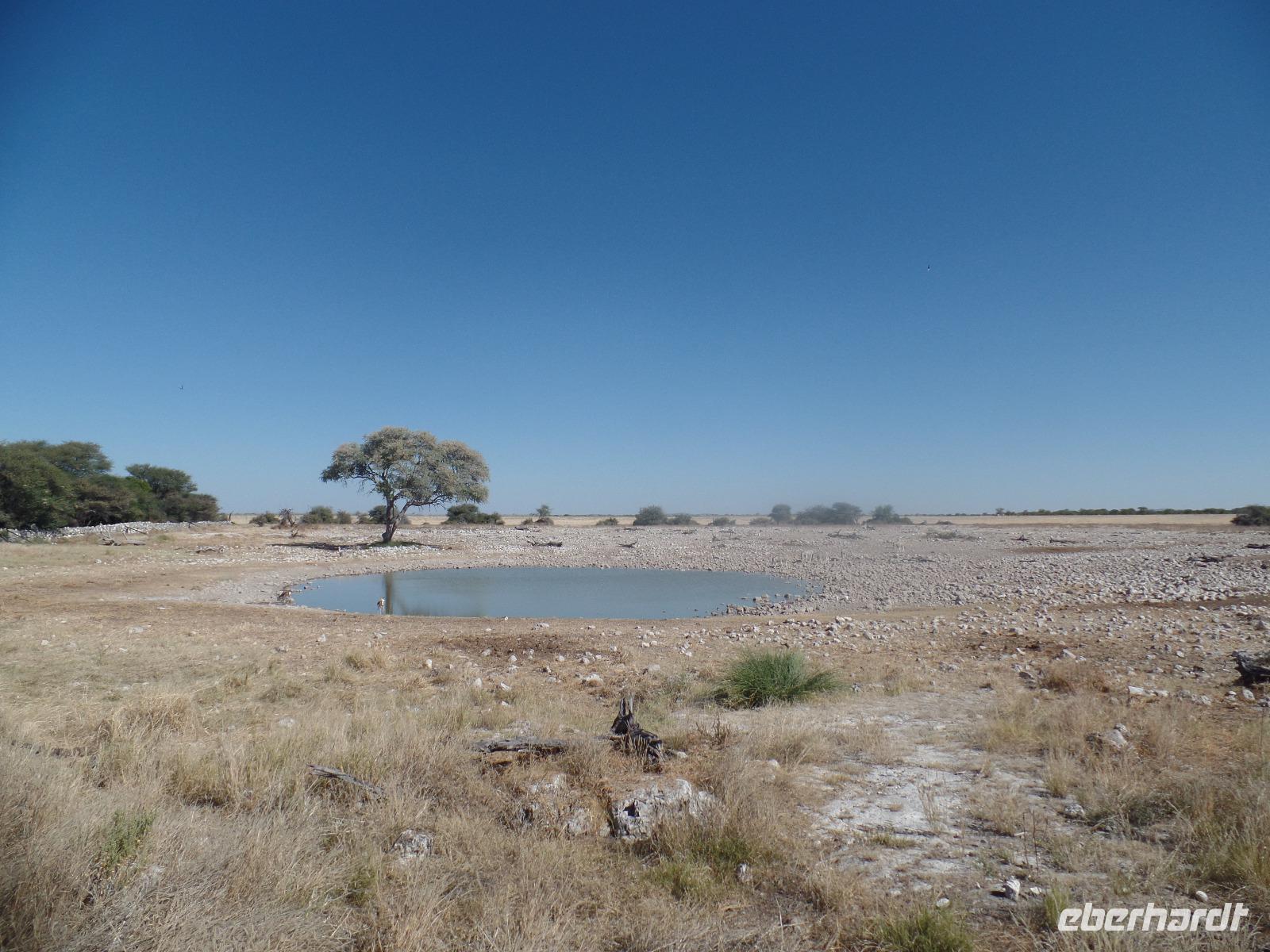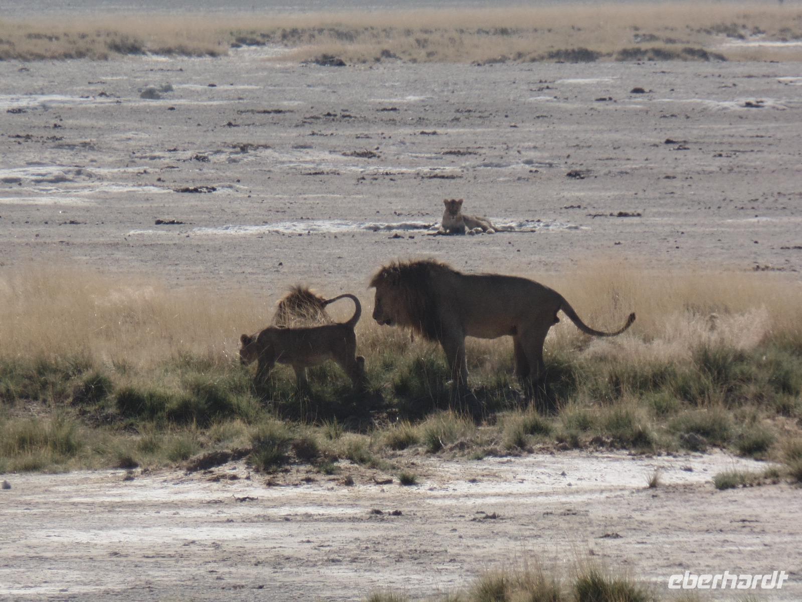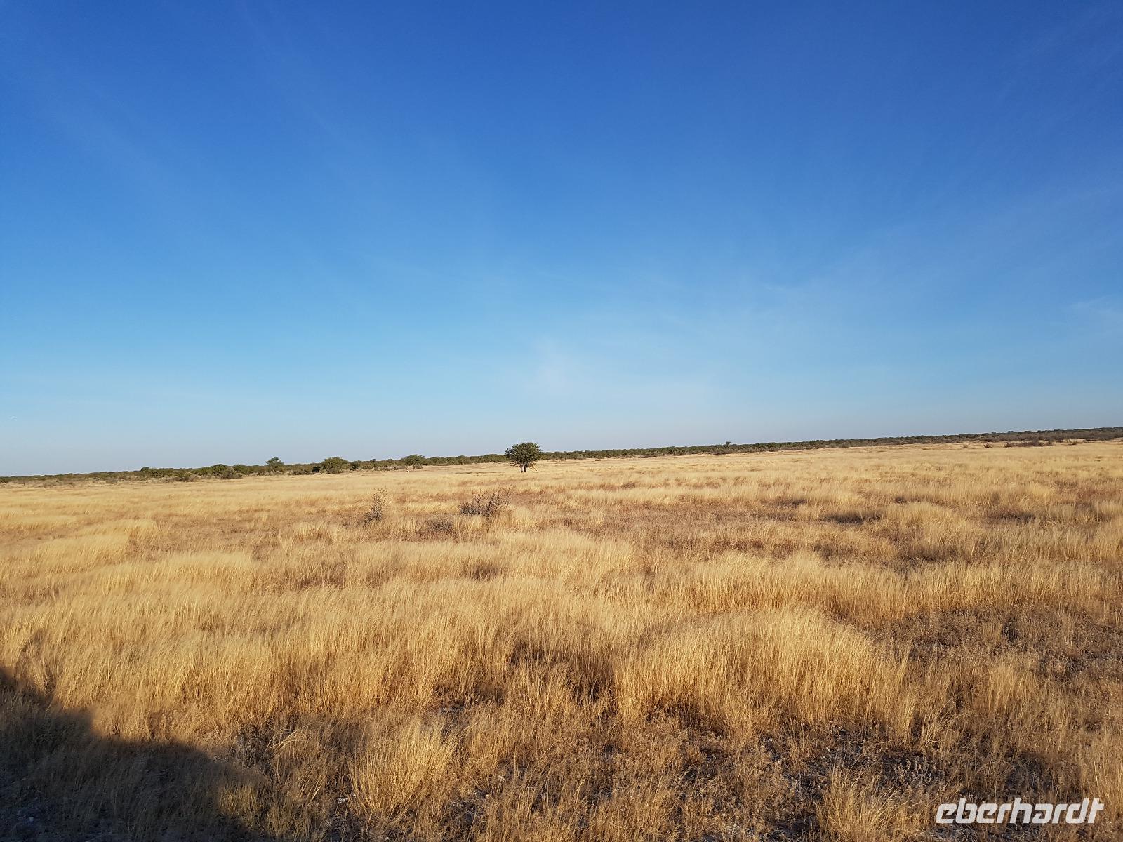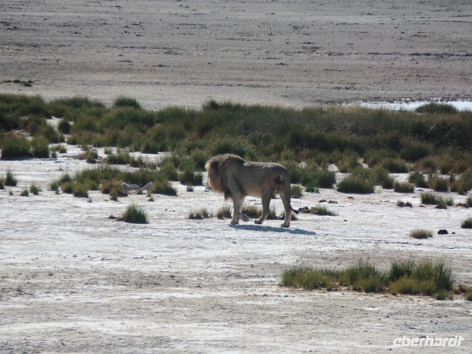 So wie gestern verbrachten wir die Mittagstunden beim gemütlichen Picknick in einem schattigen Camp direkt im Park. Hier konnte man sich was zum Essen bestellen oder zum Wasserloch laufen, um Tiere zu beobachten. Eberhardt Travel lud heute alle Gäste zum Eis ein. War eine gute Idee, oder? Am frühenNachmittag fuhren wir direkt am Rand von dem Herzstück des Parks, die 100 Kilometer lange Etosha-Pfanne. Eine große, weiße Fläche, wie der Name aus der Sansprache bedeutet, breitet sich ins Unendliche aus. Die weiße, nichtgreifbare Weite zieht uns alle magisch in ihren Bann.