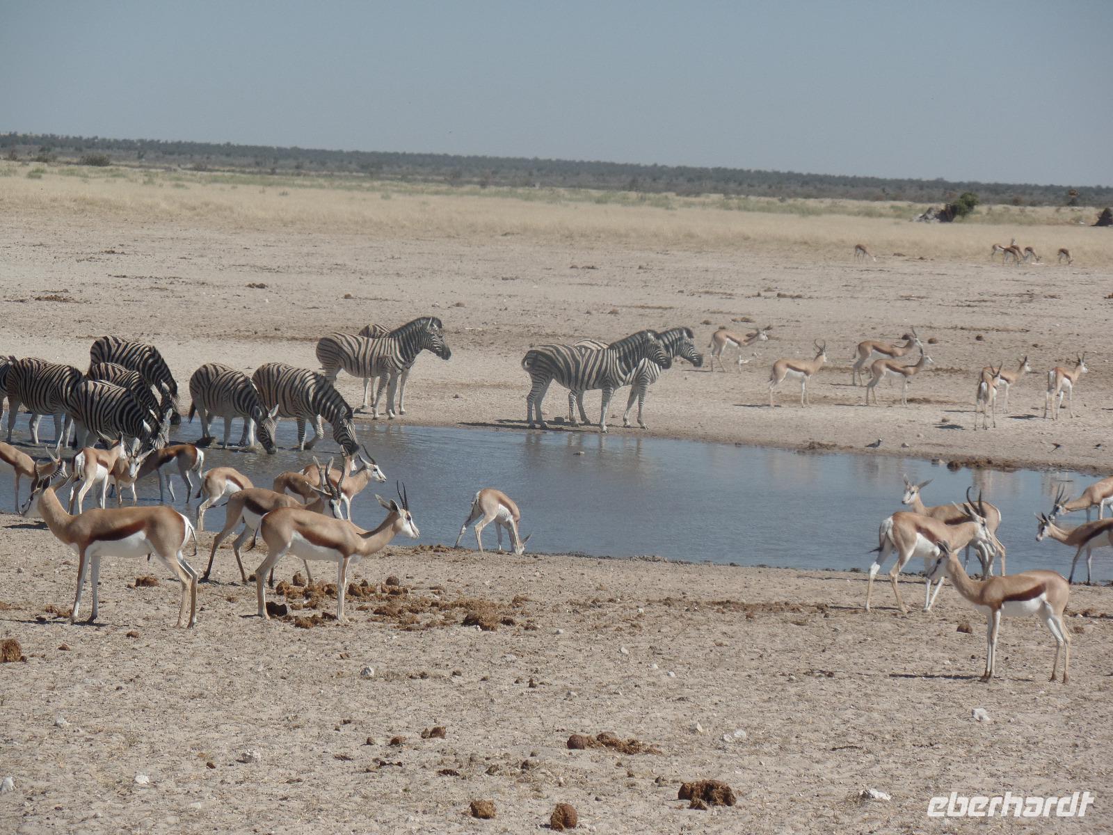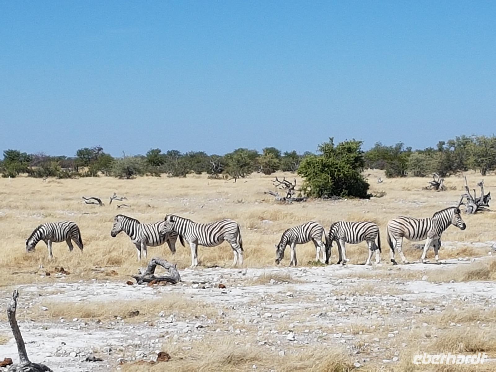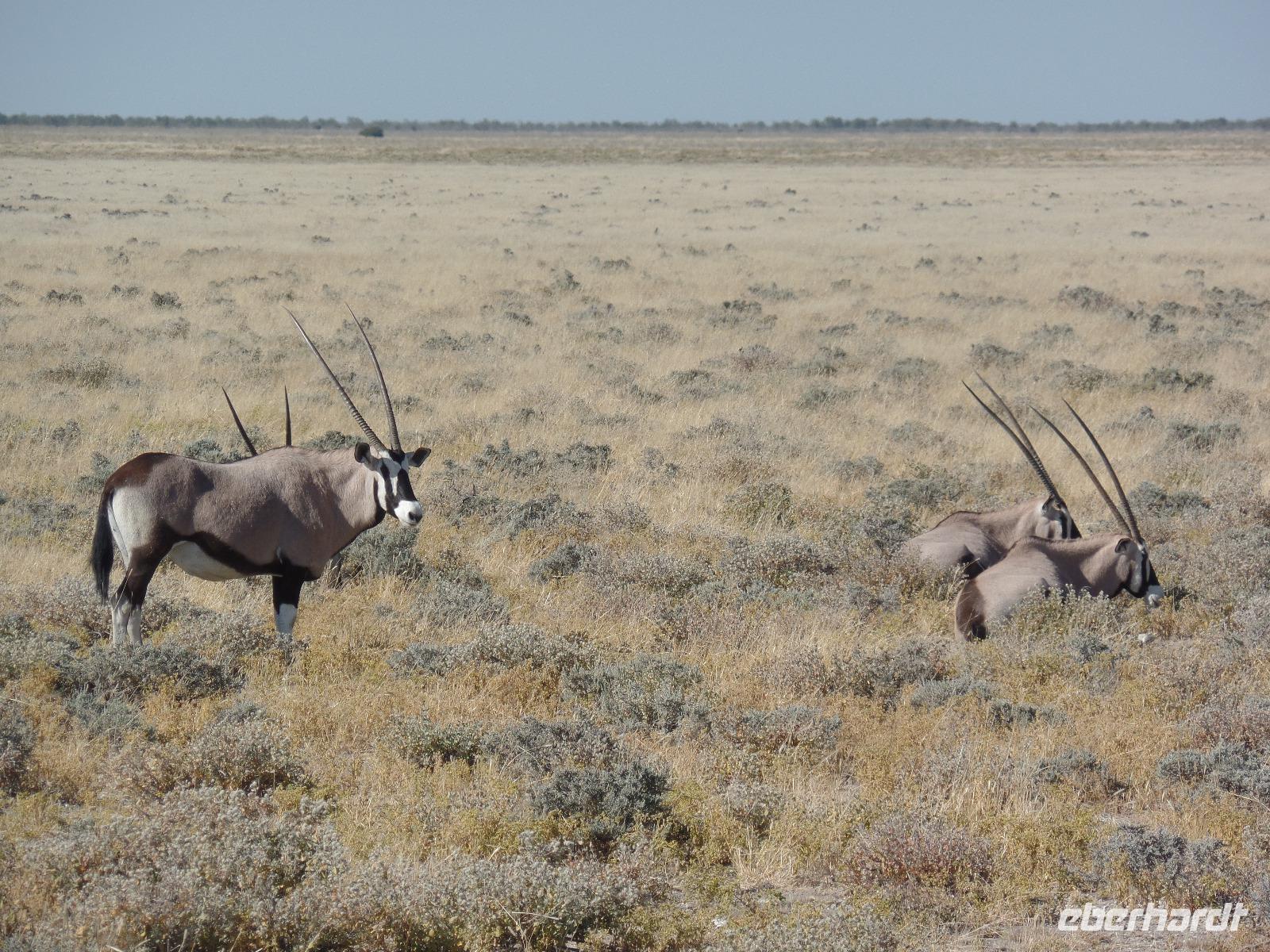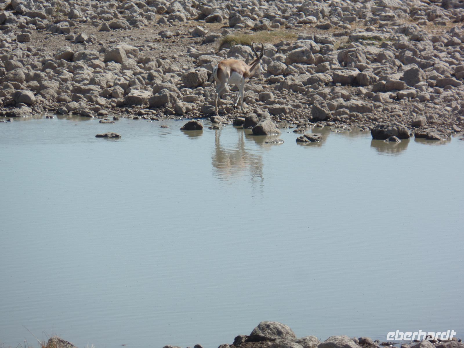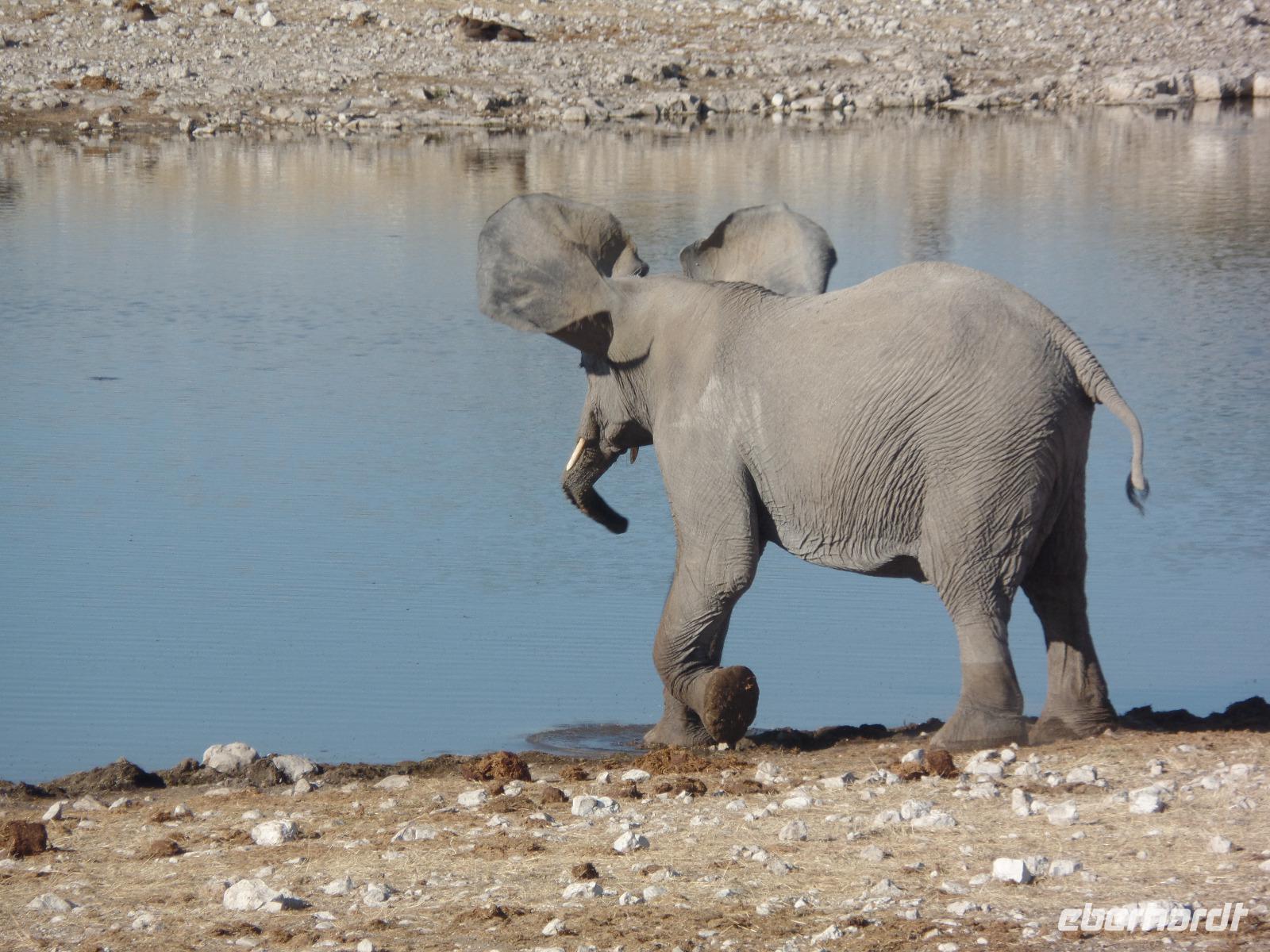 So wie gestern verbrachten wir die Mittagstunden beim gemütlichen Picknick in einem schattigen Camp direkt im Park. Hier konnte man sich was zum Essen bestellen oder zum Wasserloch laufen, um Tiere zu beobachten. Eberhardt Travel lud heute alle Gäste zum Eis ein. War eine gute Idee, oder? Am frühenNachmittag fuhren wir direkt am Rand von dem Herzstück des Parks, die 100 Kilometer lange Etosha-Pfanne. Eine große, weiße Fläche, wie der Name aus der Sansprache bedeutet, breitet sich ins Unendliche aus. Die weiße, nichtgreifbare Weite zieht uns alle magisch in ihren Bann.