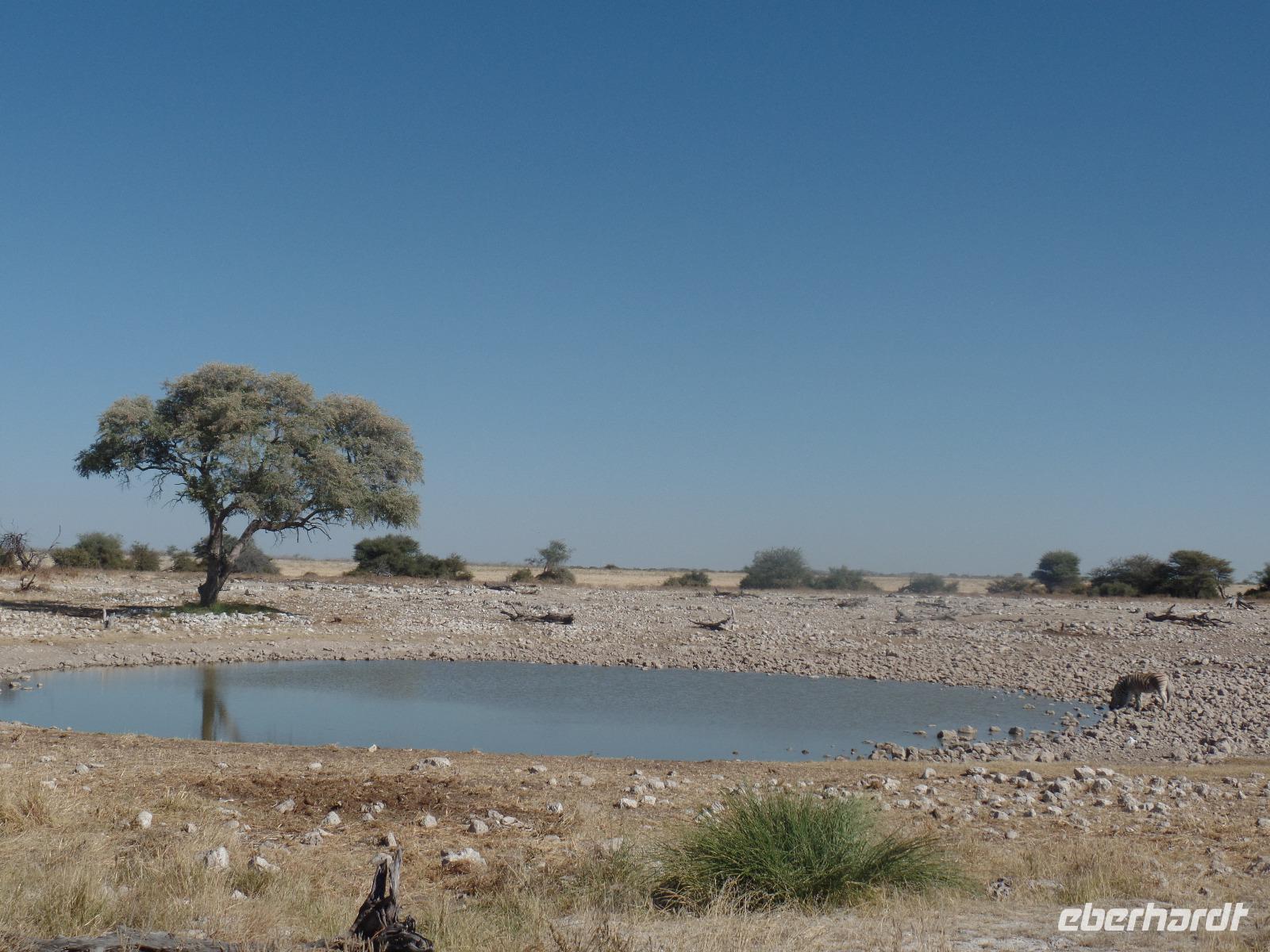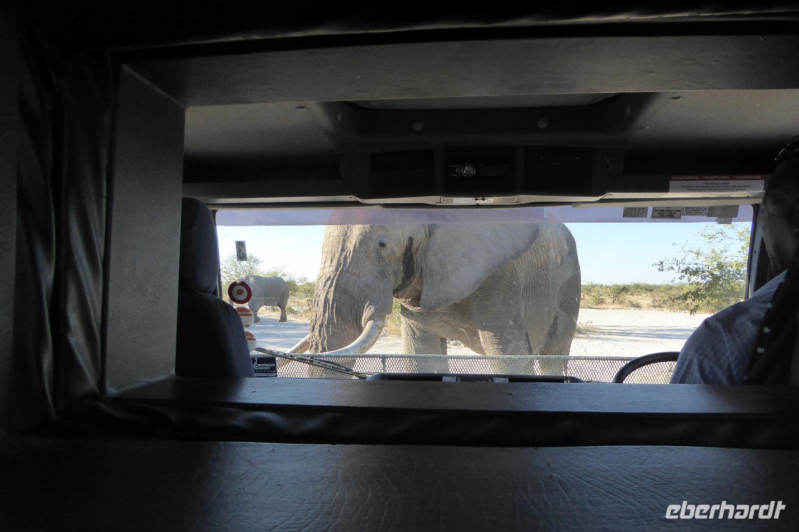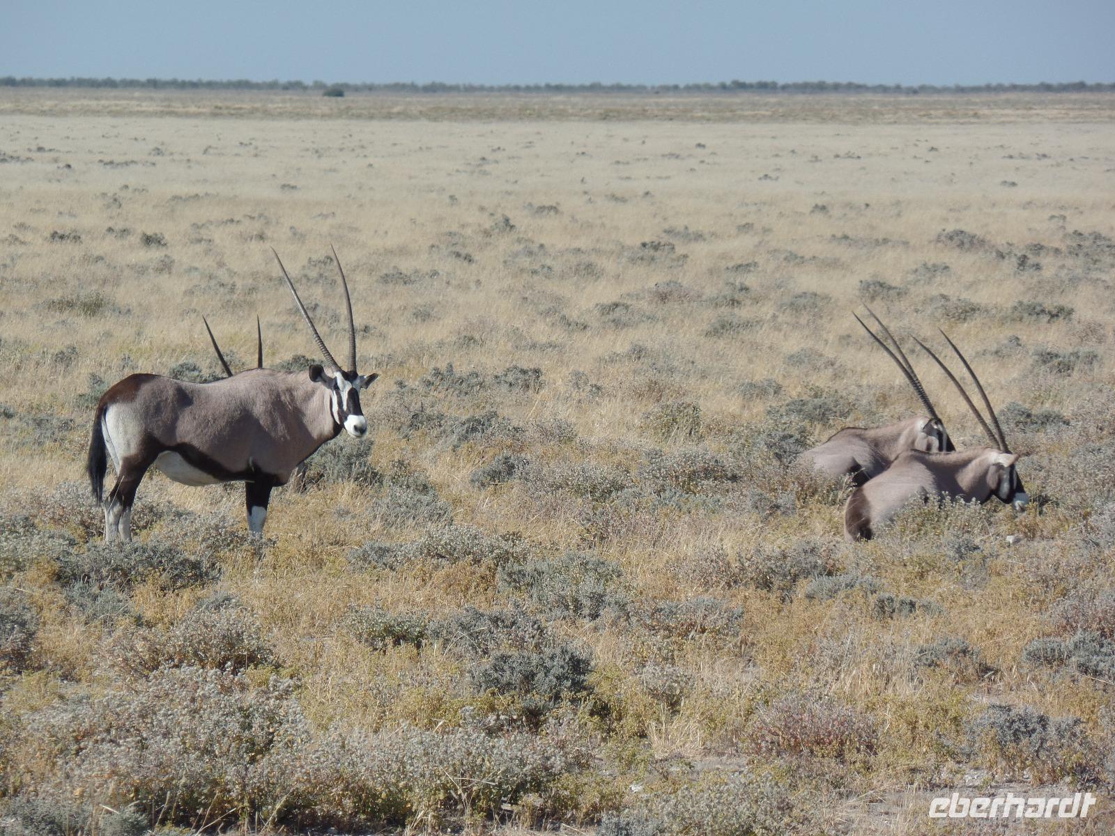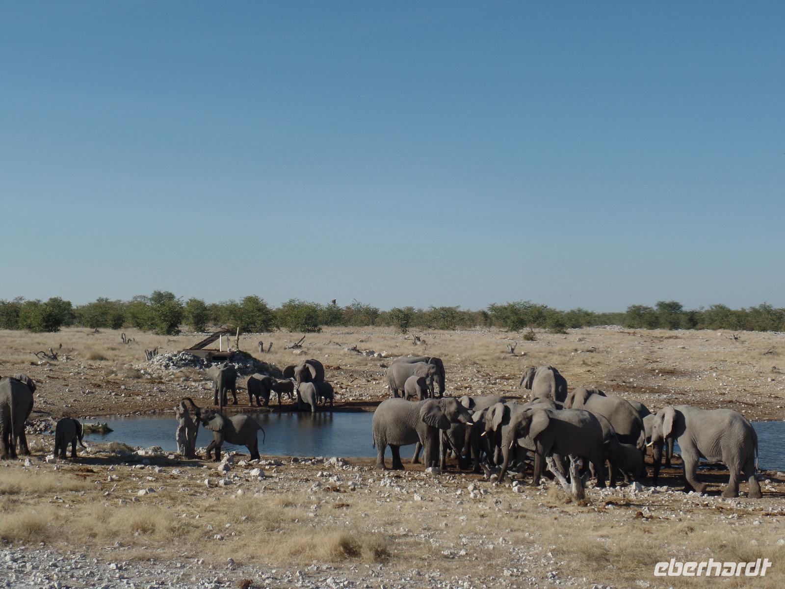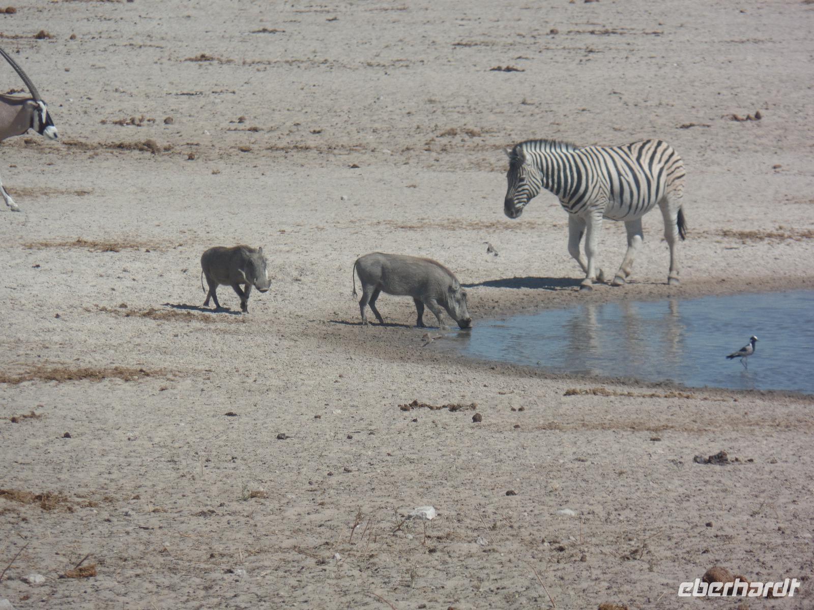 So wie gestern verbrachten wir die Mittagstunden beim gemütlichen Picknick in einem schattigen Camp direkt im Park. Hier konnte man sich was zum Essen bestellen oder zum Wasserloch laufen, um Tiere zu beobachten. Eberhardt Travel lud heute alle Gäste zum Eis ein. War eine gute Idee, oder? Am frühenNachmittag fuhren wir direkt am Rand von dem Herzstück des Parks, die 100 Kilometer lange Etosha-Pfanne. Eine große, weiße Fläche, wie der Name aus der Sansprache bedeutet, breitet sich ins Unendliche aus. Die weiße, nichtgreifbare Weite zieht uns alle magisch in ihren Bann.