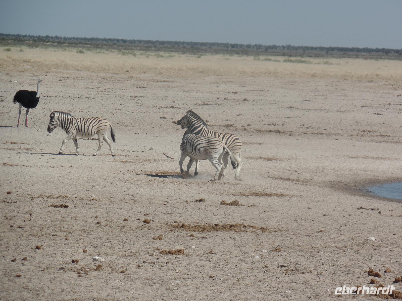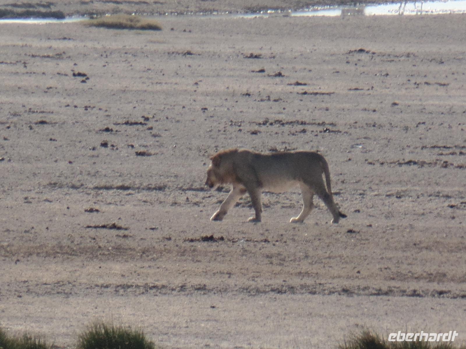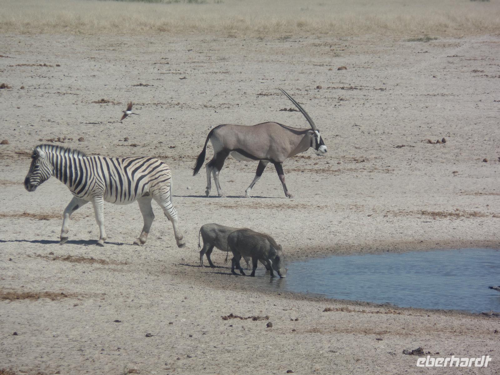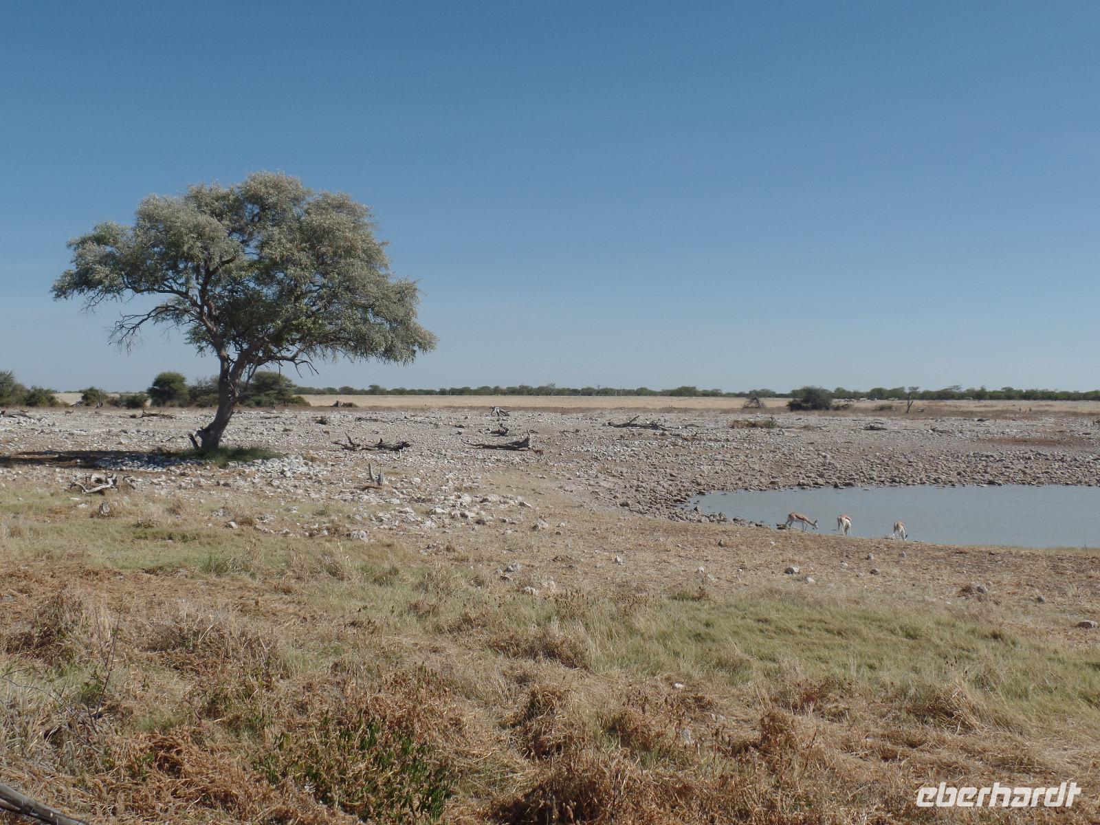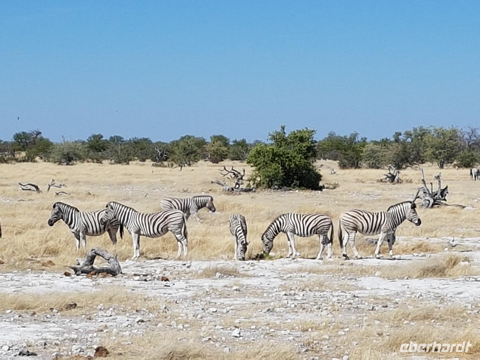 So wie gestern verbrachten wir die Mittagstunden beim gemütlichen Picknick in einem schattigen Camp direkt im Park. Hier konnte man sich was zum Essen bestellen oder zum Wasserloch laufen, um Tiere zu beobachten. Eberhardt Travel lud heute alle Gäste zum Eis ein. War eine gute Idee, oder? Am frühenNachmittag fuhren wir direkt am Rand von dem Herzstück des Parks, die 100 Kilometer lange Etosha-Pfanne. Eine große, weiße Fläche, wie der Name aus der Sansprache bedeutet, breitet sich ins Unendliche aus. Die weiße, nichtgreifbare Weite zieht uns alle magisch in ihren Bann.