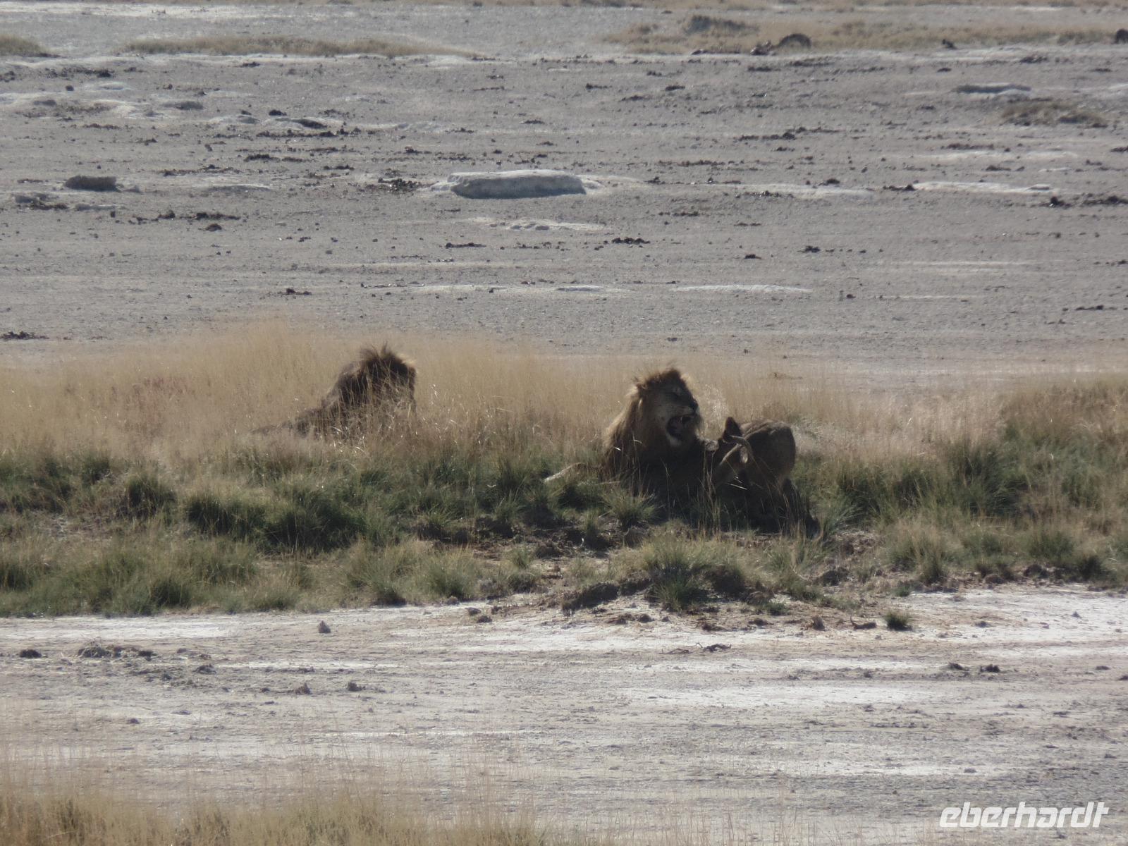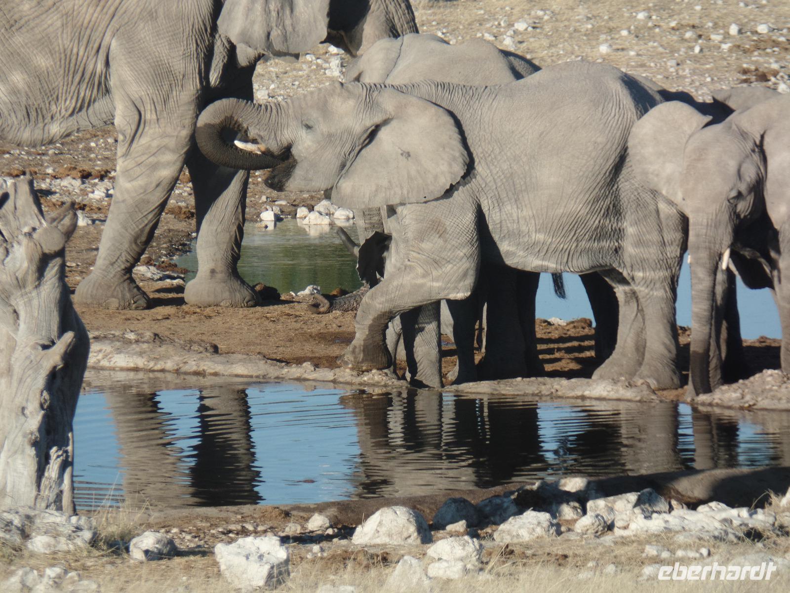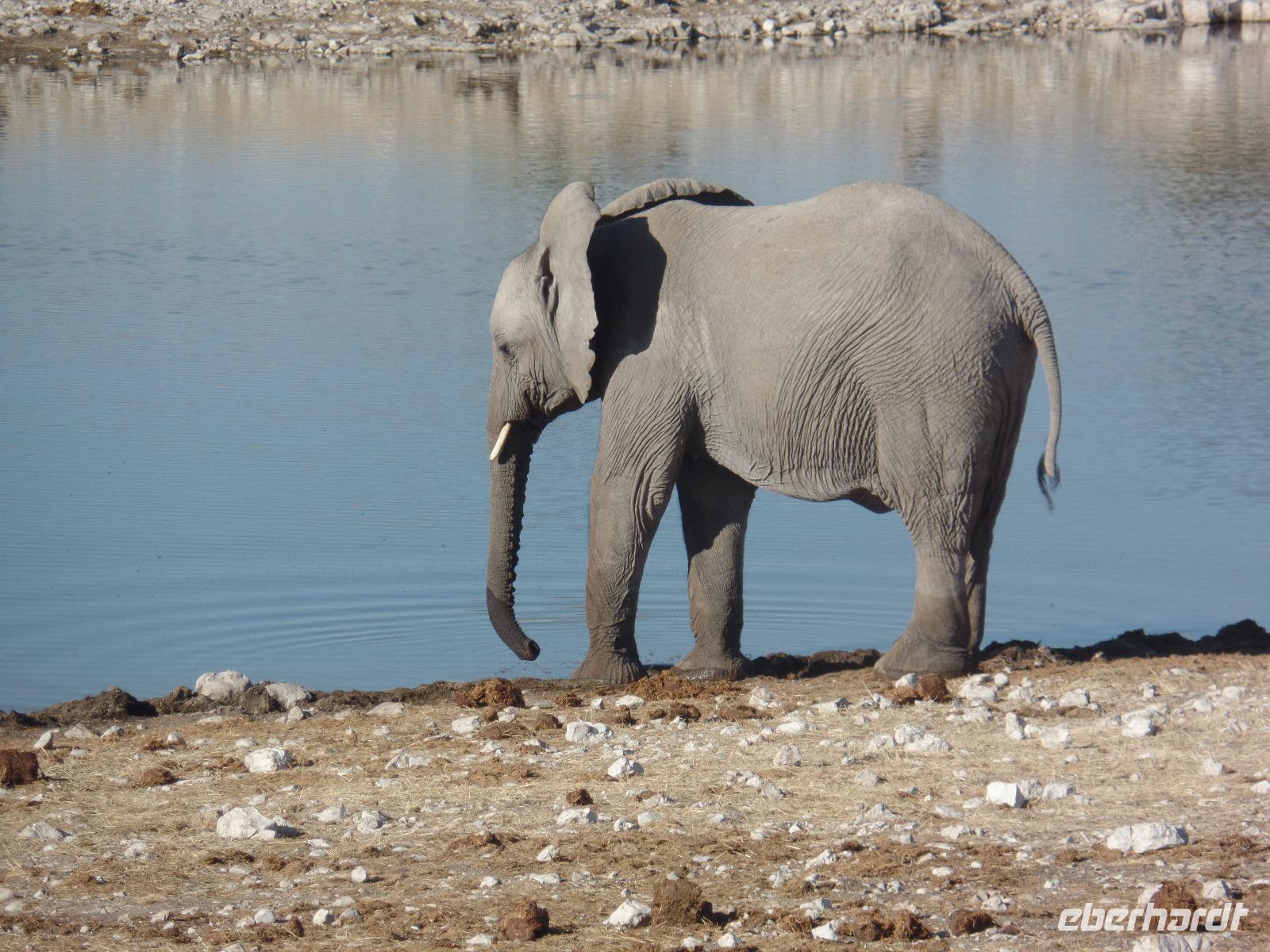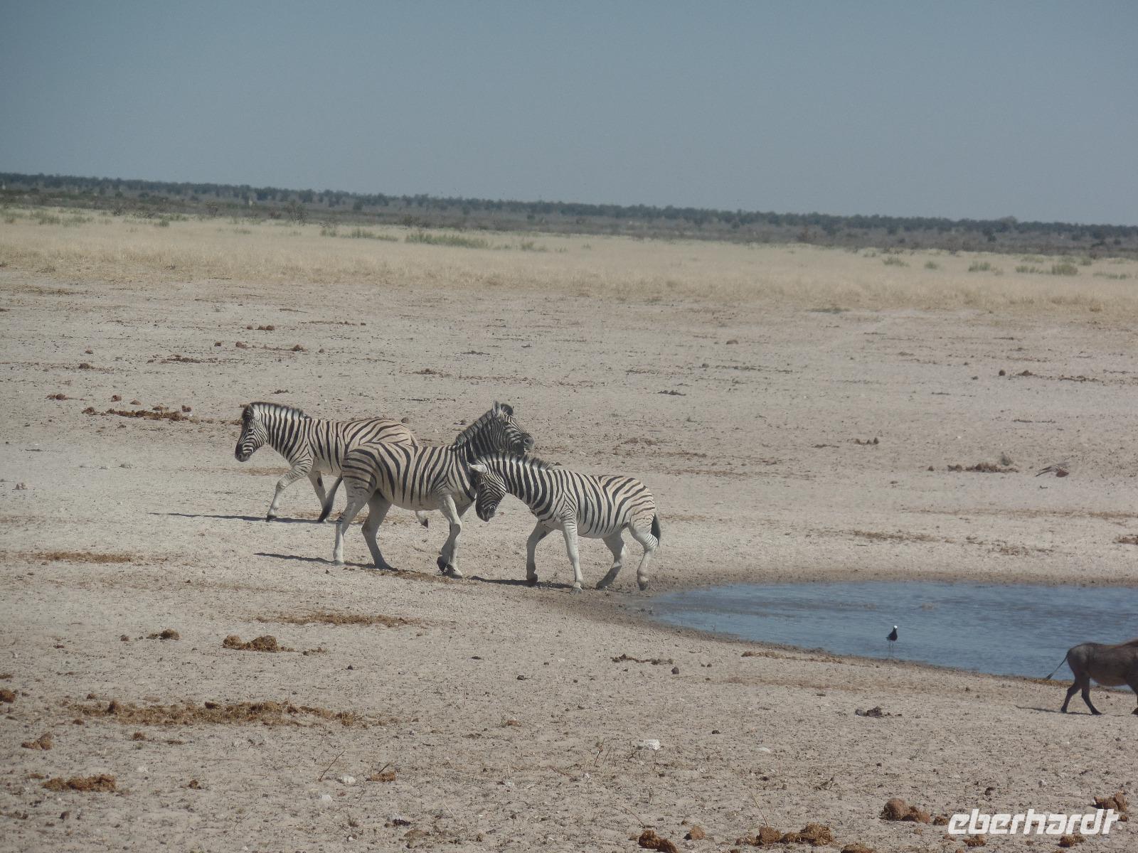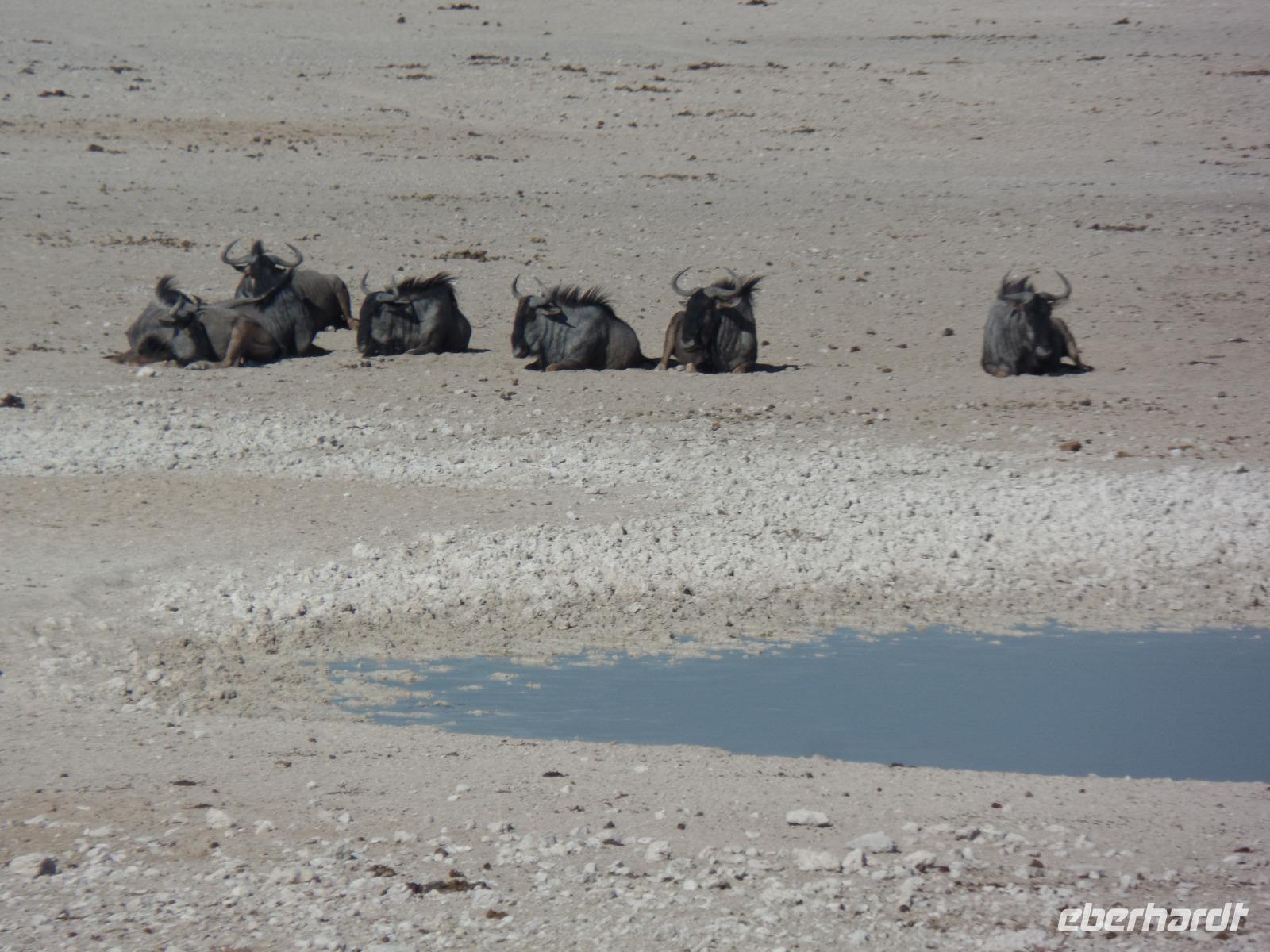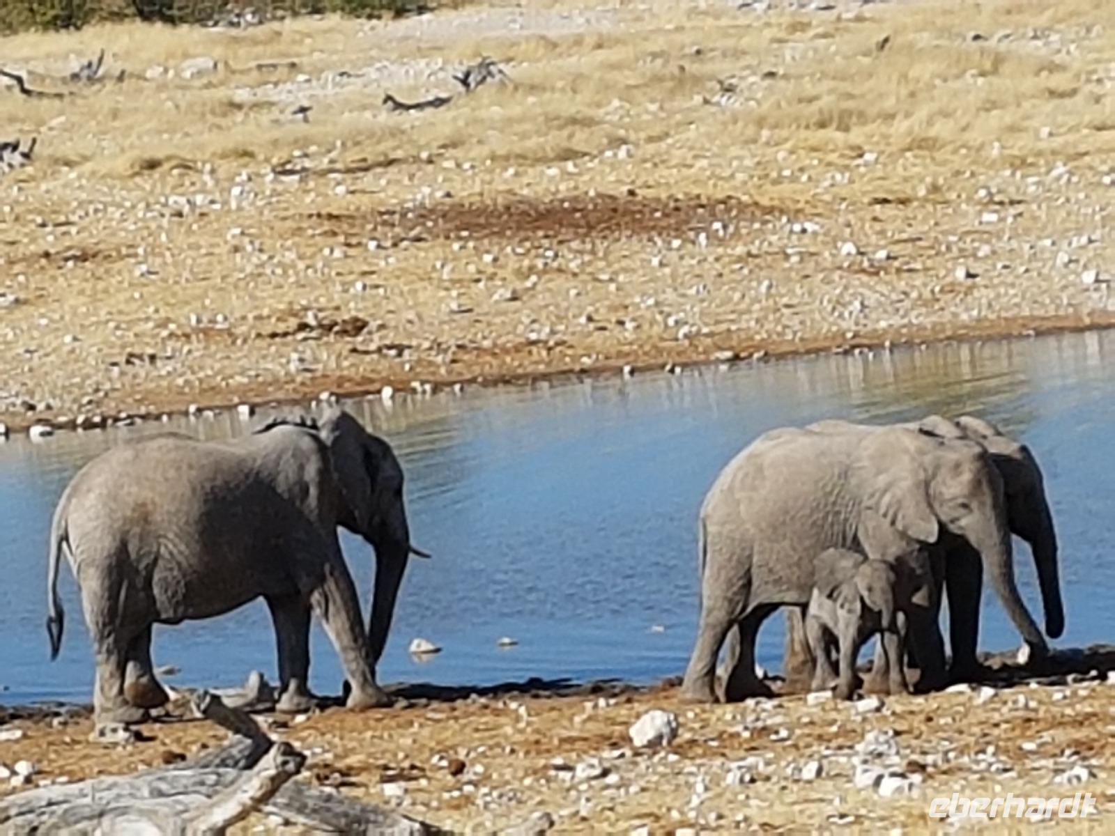 So wie gestern verbrachten wir die Mittagstunden beim gemütlichen Picknick in einem schattigen Camp direkt im Park. Hier konnte man sich was zum Essen bestellen oder zum Wasserloch laufen, um Tiere zu beobachten. Eberhardt Travel lud heute alle Gäste zum Eis ein. War eine gute Idee, oder? Am frühenNachmittag fuhren wir direkt am Rand von dem Herzstück des Parks, die 100 Kilometer lange Etosha-Pfanne. Eine große, weiße Fläche, wie der Name aus der Sansprache bedeutet, breitet sich ins Unendliche aus. Die weiße, nichtgreifbare Weite zieht uns alle magisch in ihren Bann.
