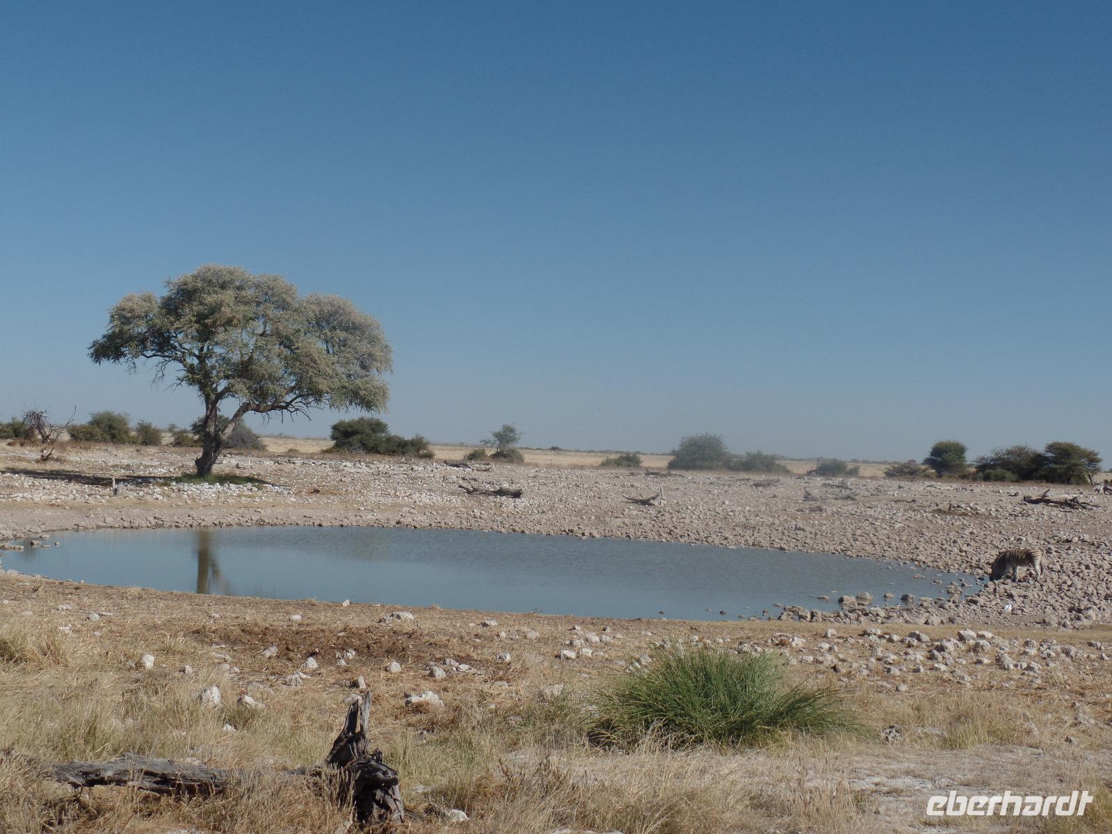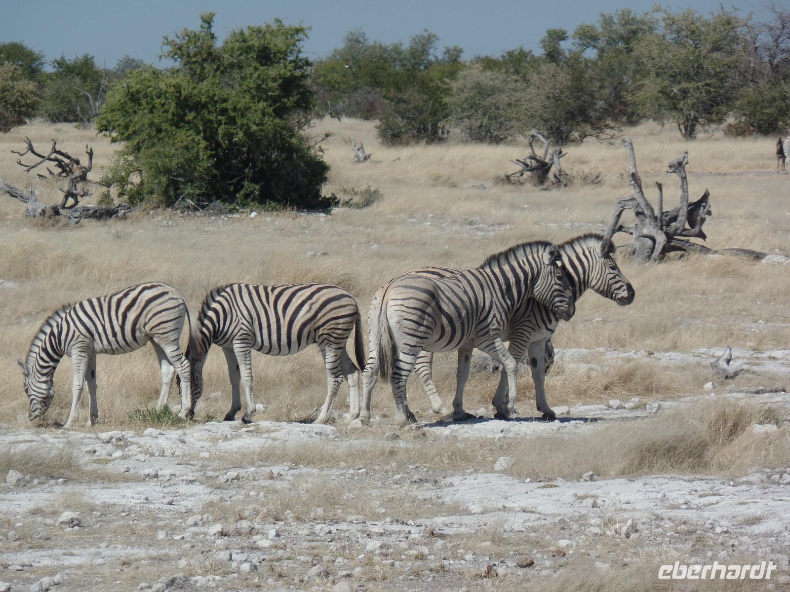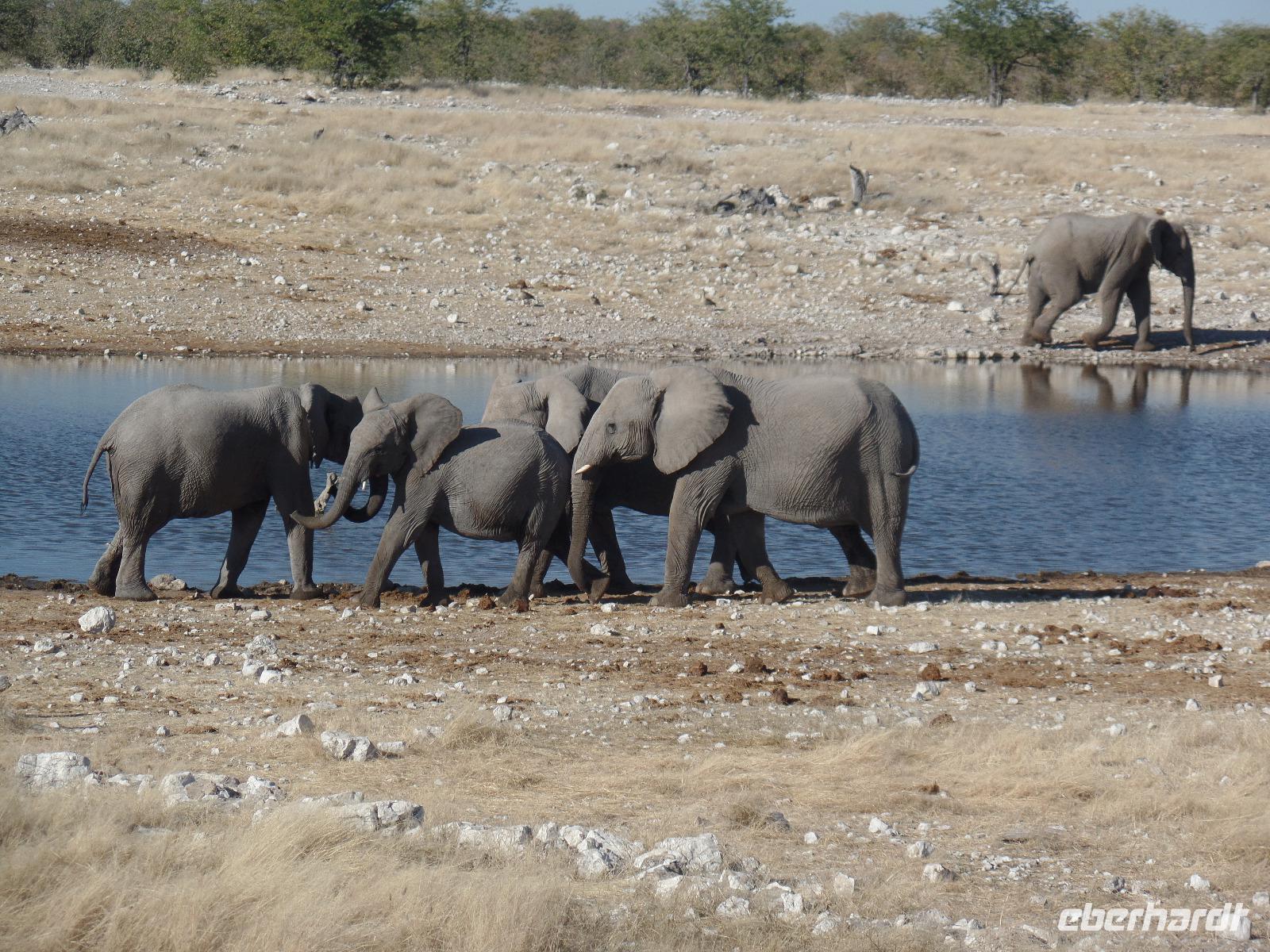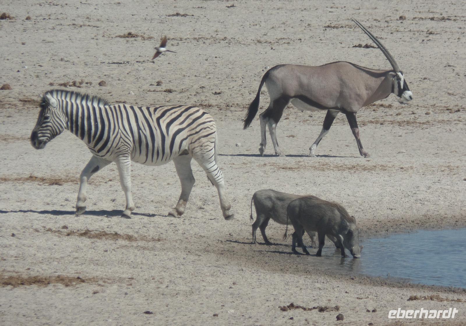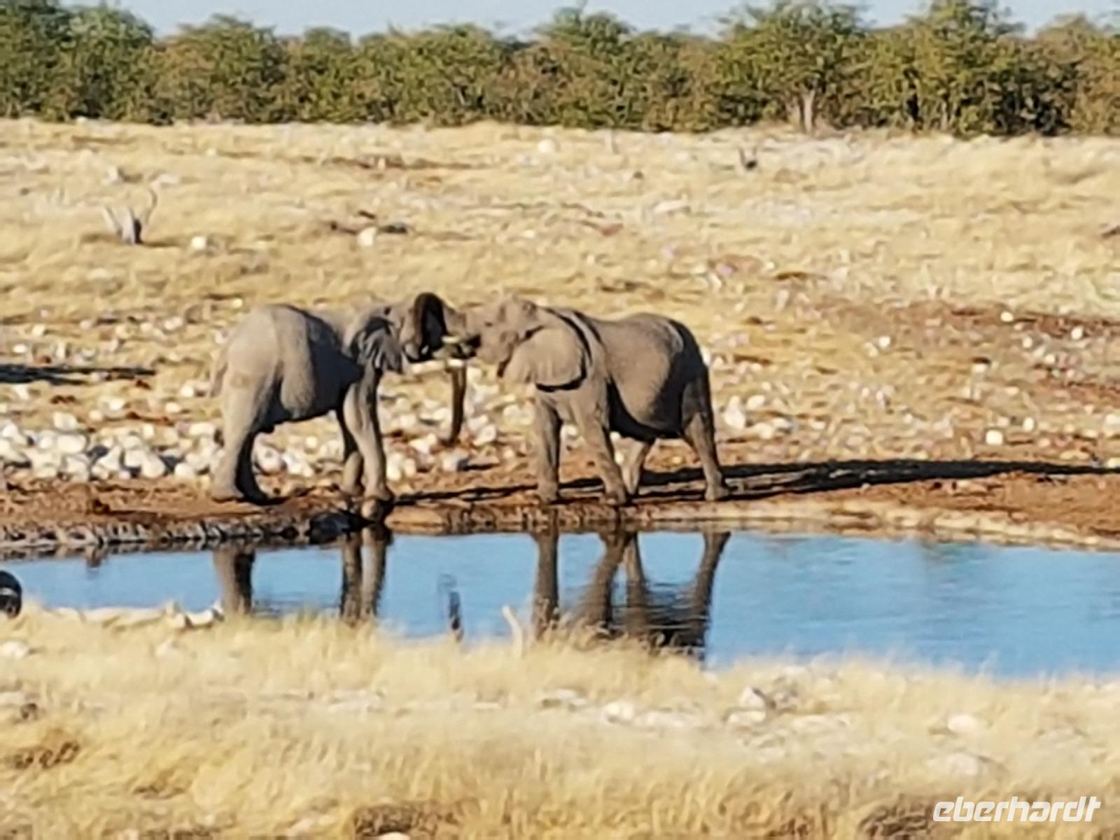 So wie gestern verbrachten wir die Mittagstunden beim gemütlichen Picknick in einem schattigen Camp direkt im Park. Hier konnte man sich was zum Essen bestellen oder zum Wasserloch laufen, um Tiere zu beobachten. Eberhardt Travel lud heute alle Gäste zum Eis ein. War eine gute Idee, oder? Am frühenNachmittag fuhren wir direkt am Rand von dem Herzstück des Parks, die 100 Kilometer lange Etosha-Pfanne. Eine große, weiße Fläche, wie der Name aus der Sansprache bedeutet, breitet sich ins Unendliche aus. Die weiße, nichtgreifbare Weite zieht uns alle magisch in ihren Bann.