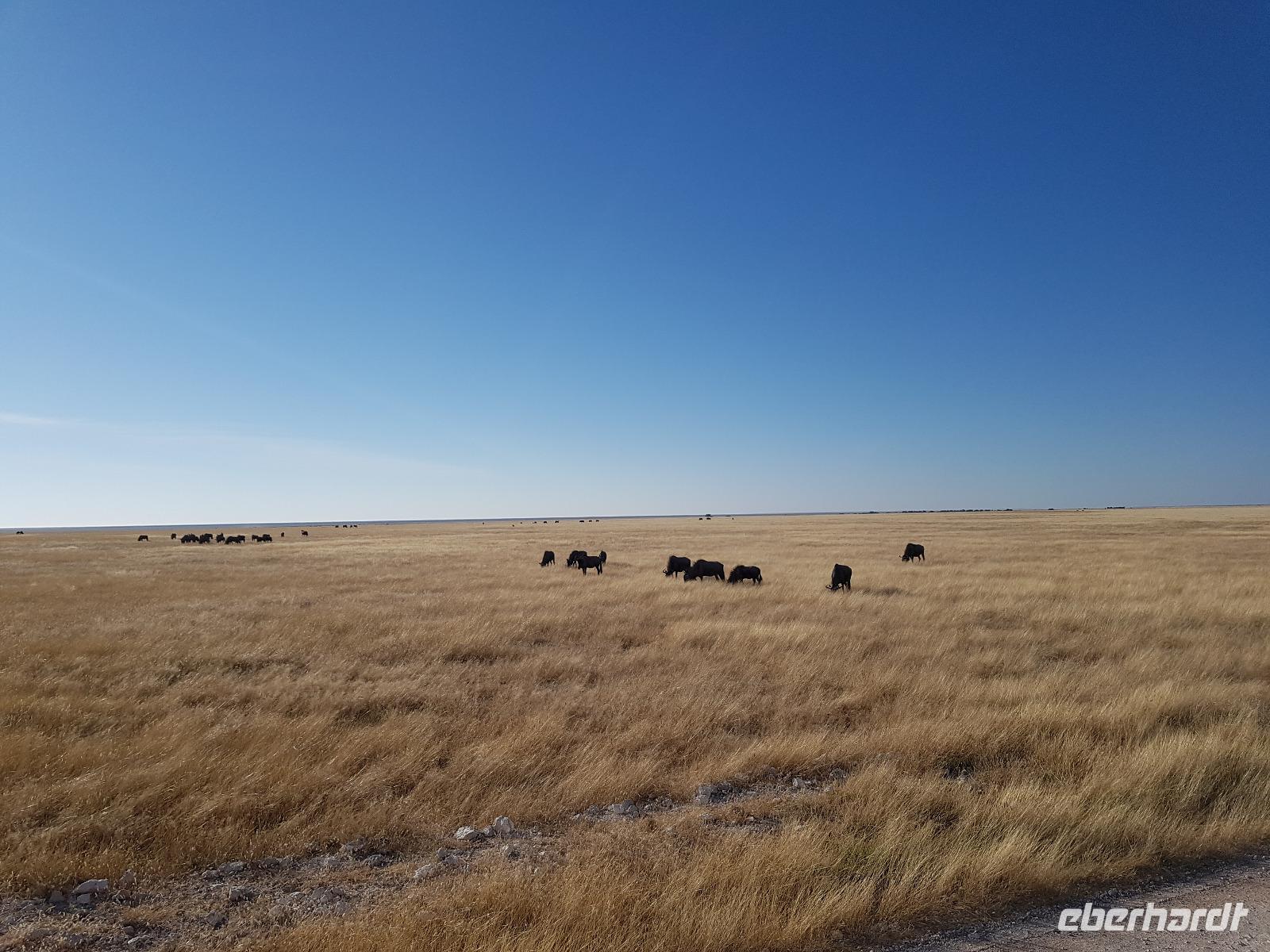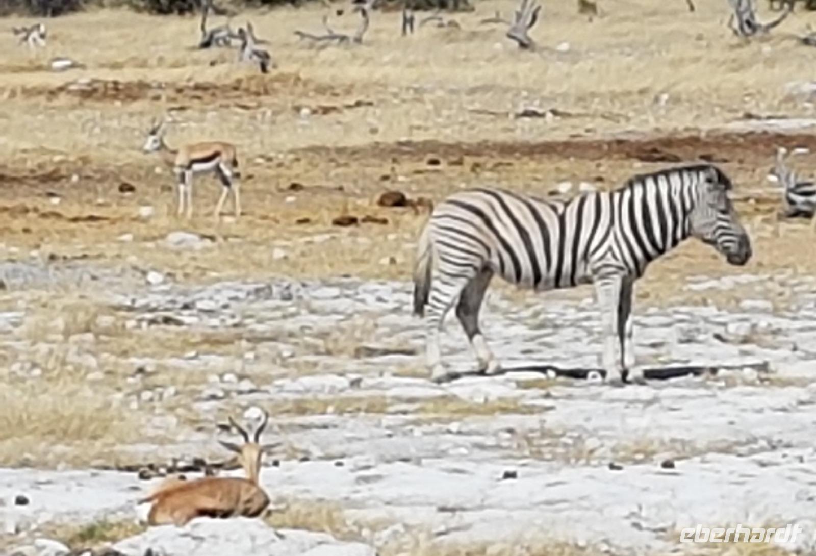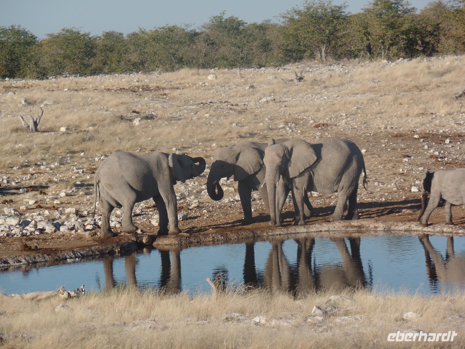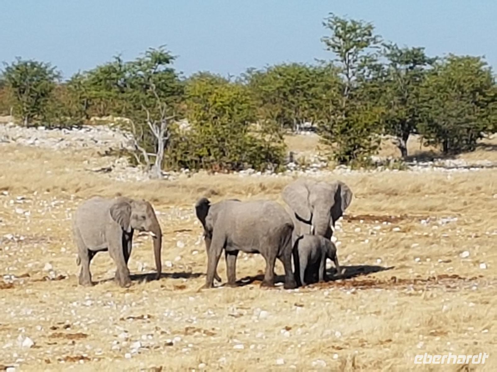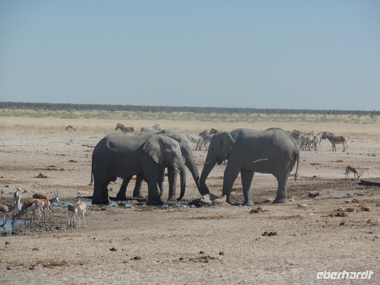 So wie gestern verbrachten wir die Mittagstunden beim gemütlichen Picknick in einem schattigen Camp direkt im Park. Hier konnte man sich was zum Essen bestellen oder zum Wasserloch laufen, um Tiere zu beobachten. Eberhardt Travel lud heute alle Gäste zum Eis ein. War eine gute Idee, oder? Am frühenNachmittag fuhren wir direkt am Rand von dem Herzstück des Parks, die 100 Kilometer lange Etosha-Pfanne. Eine große, weiße Fläche, wie der Name aus der Sansprache bedeutet, breitet sich ins Unendliche aus. Die weiße, nichtgreifbare Weite zieht uns alle magisch in ihren Bann.