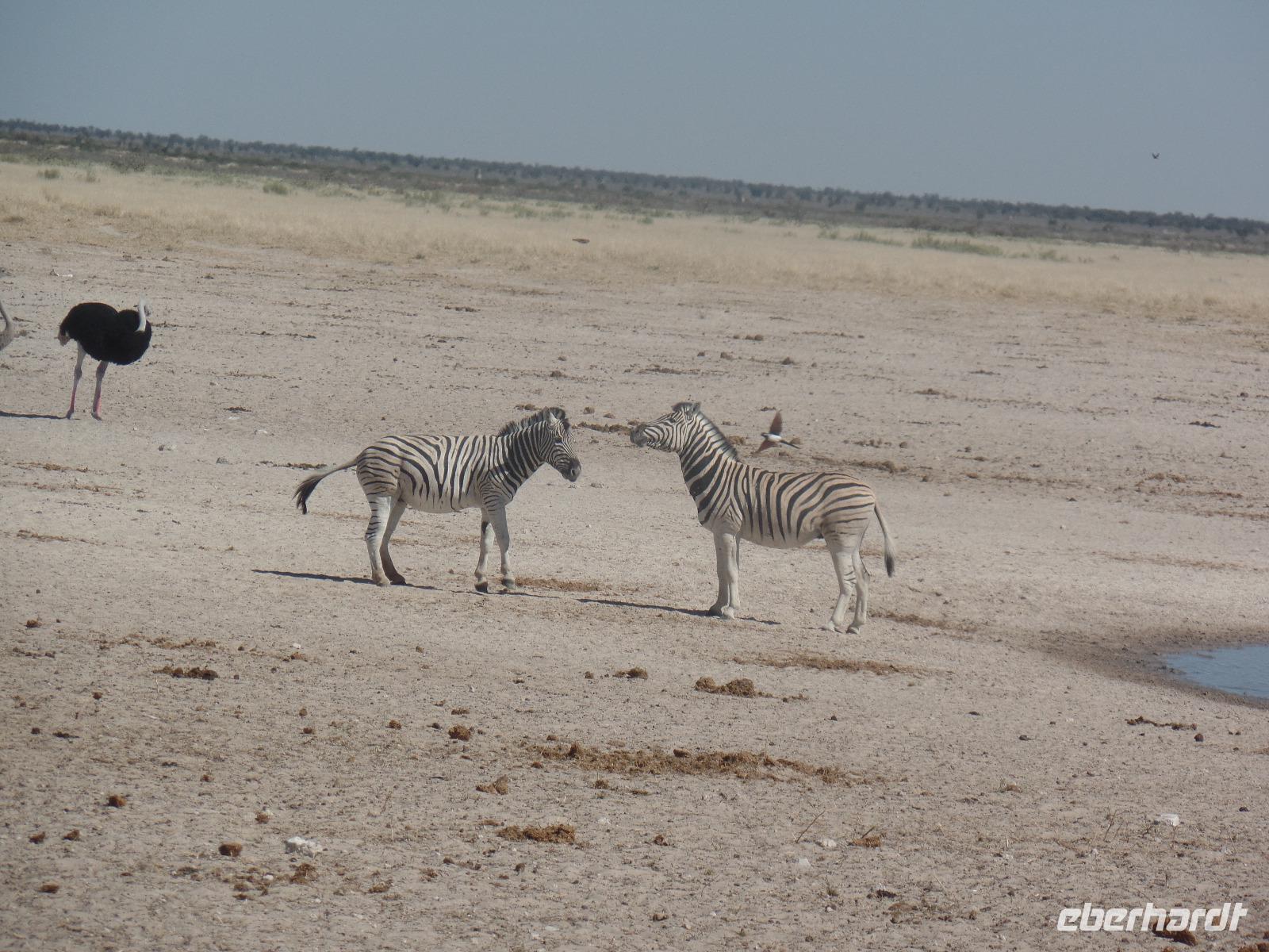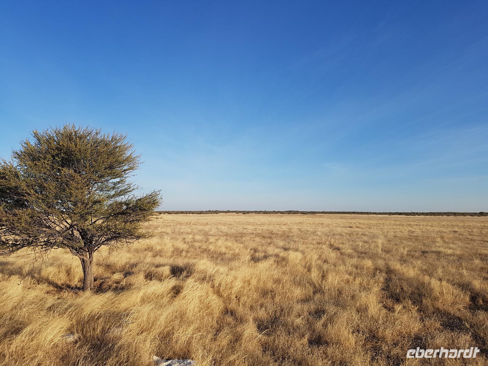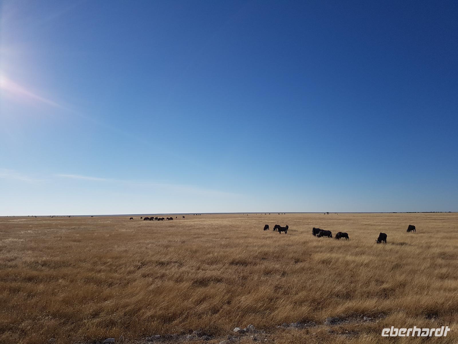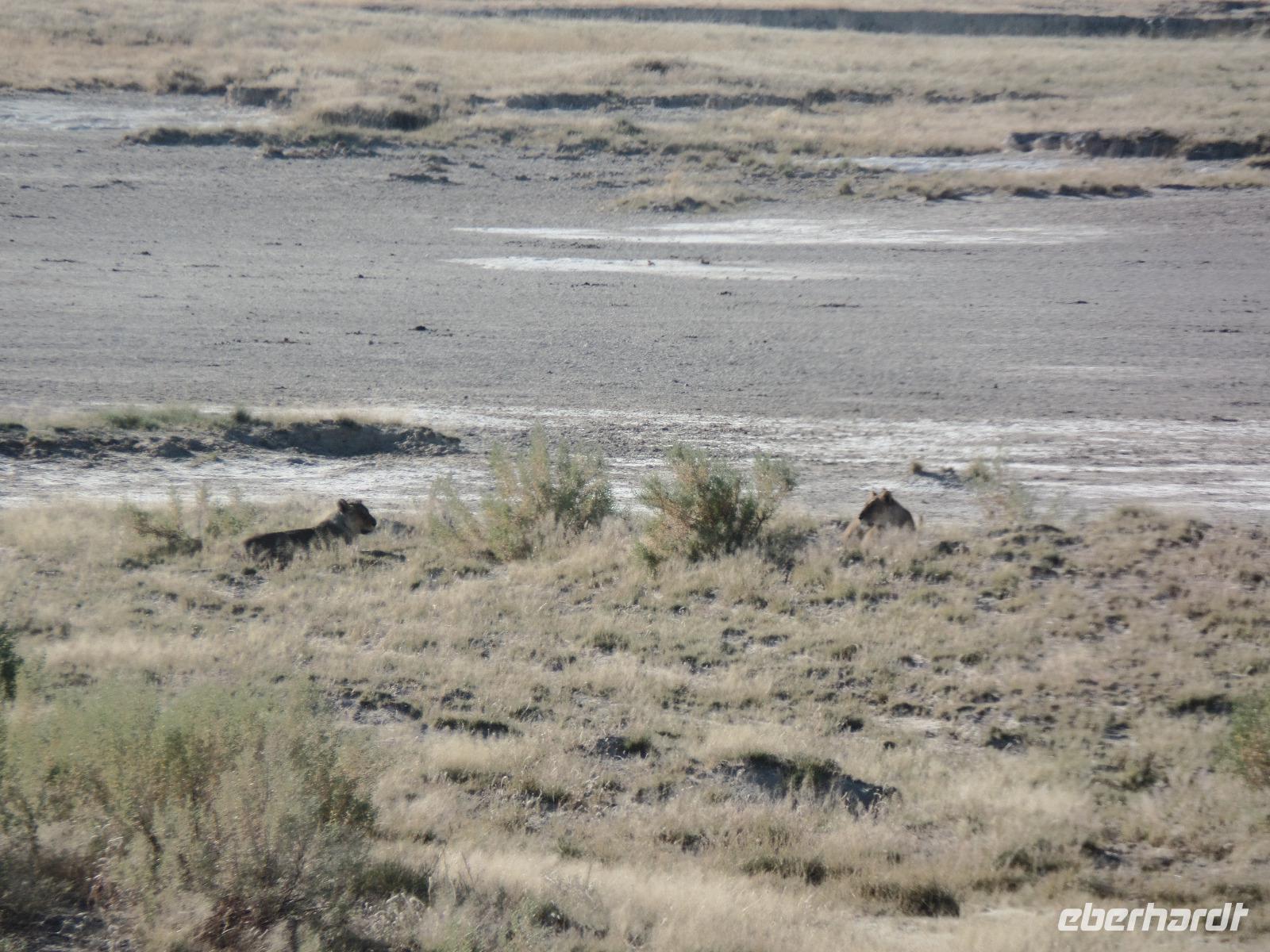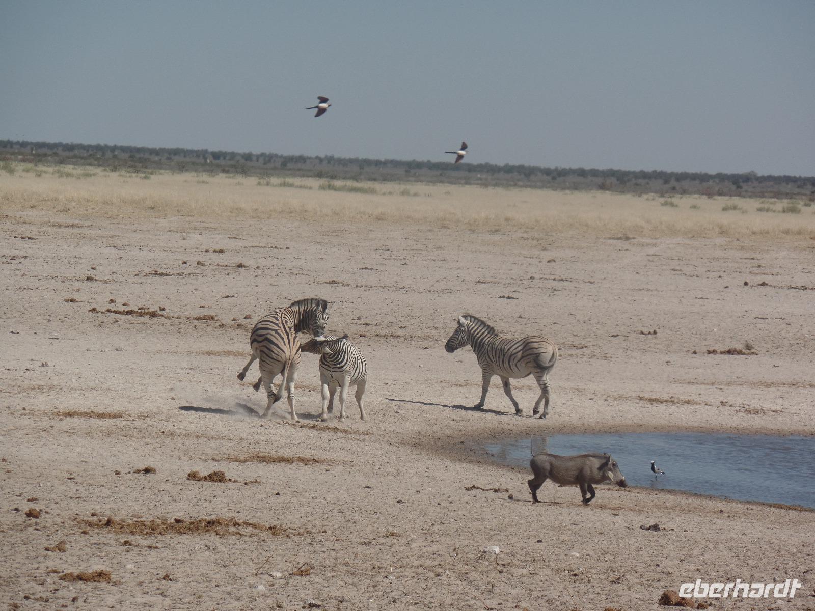 So wie gestern verbrachten wir die Mittagstunden beim gemütlichen Picknick in einem schattigen Camp direkt im Park. Hier konnte man sich was zum Essen bestellen oder zum Wasserloch laufen, um Tiere zu beobachten. Eberhardt Travel lud heute alle Gäste zum Eis ein. War eine gute Idee, oder? Am frühenNachmittag fuhren wir direkt am Rand von dem Herzstück des Parks, die 100 Kilometer lange Etosha-Pfanne. Eine große, weiße Fläche, wie der Name aus der Sansprache bedeutet, breitet sich ins Unendliche aus. Die weiße, nichtgreifbare Weite zieht uns alle magisch in ihren Bann.