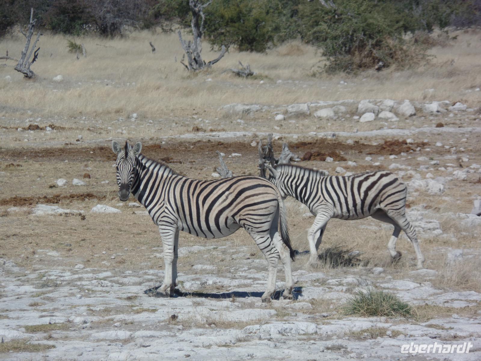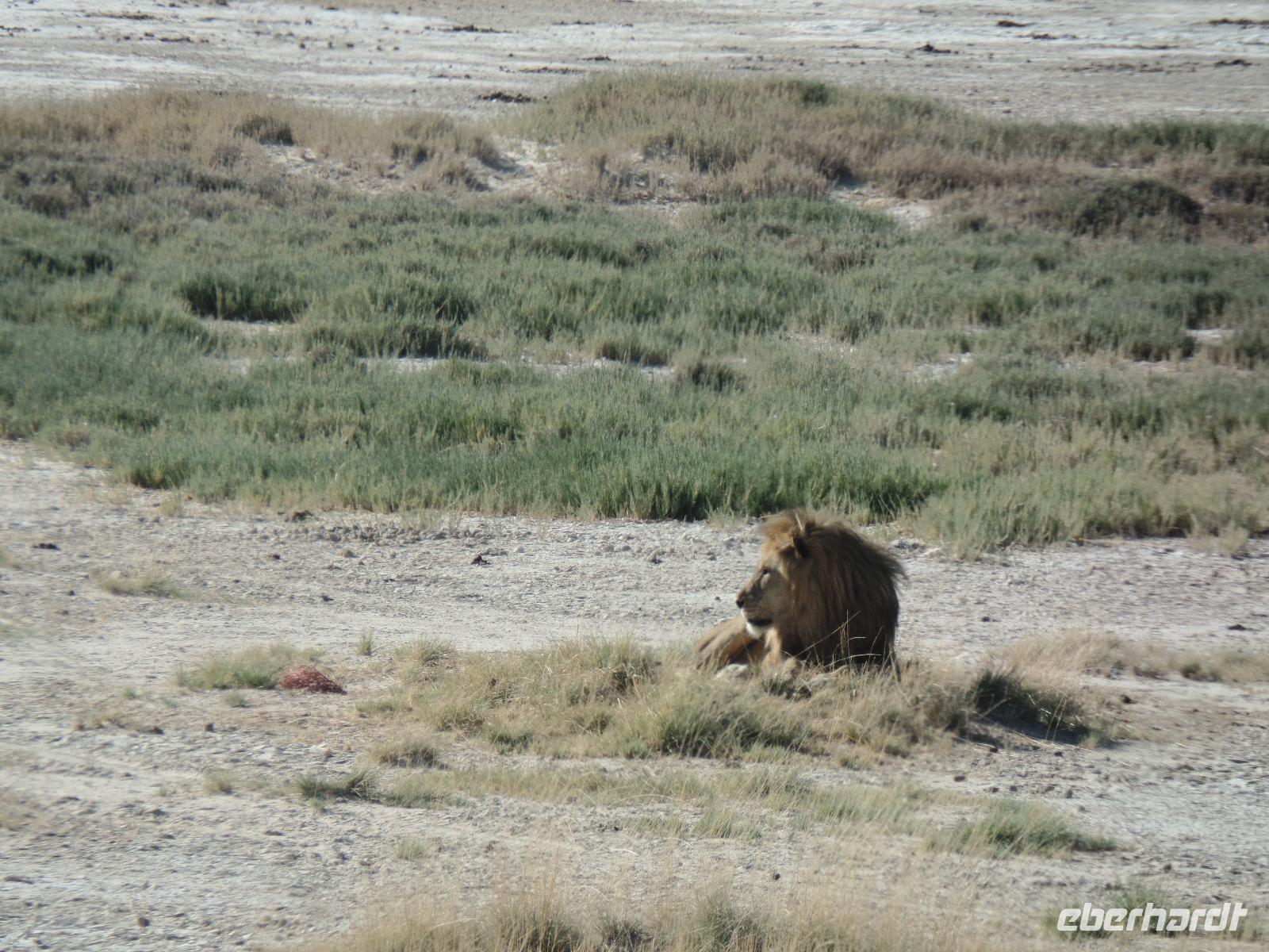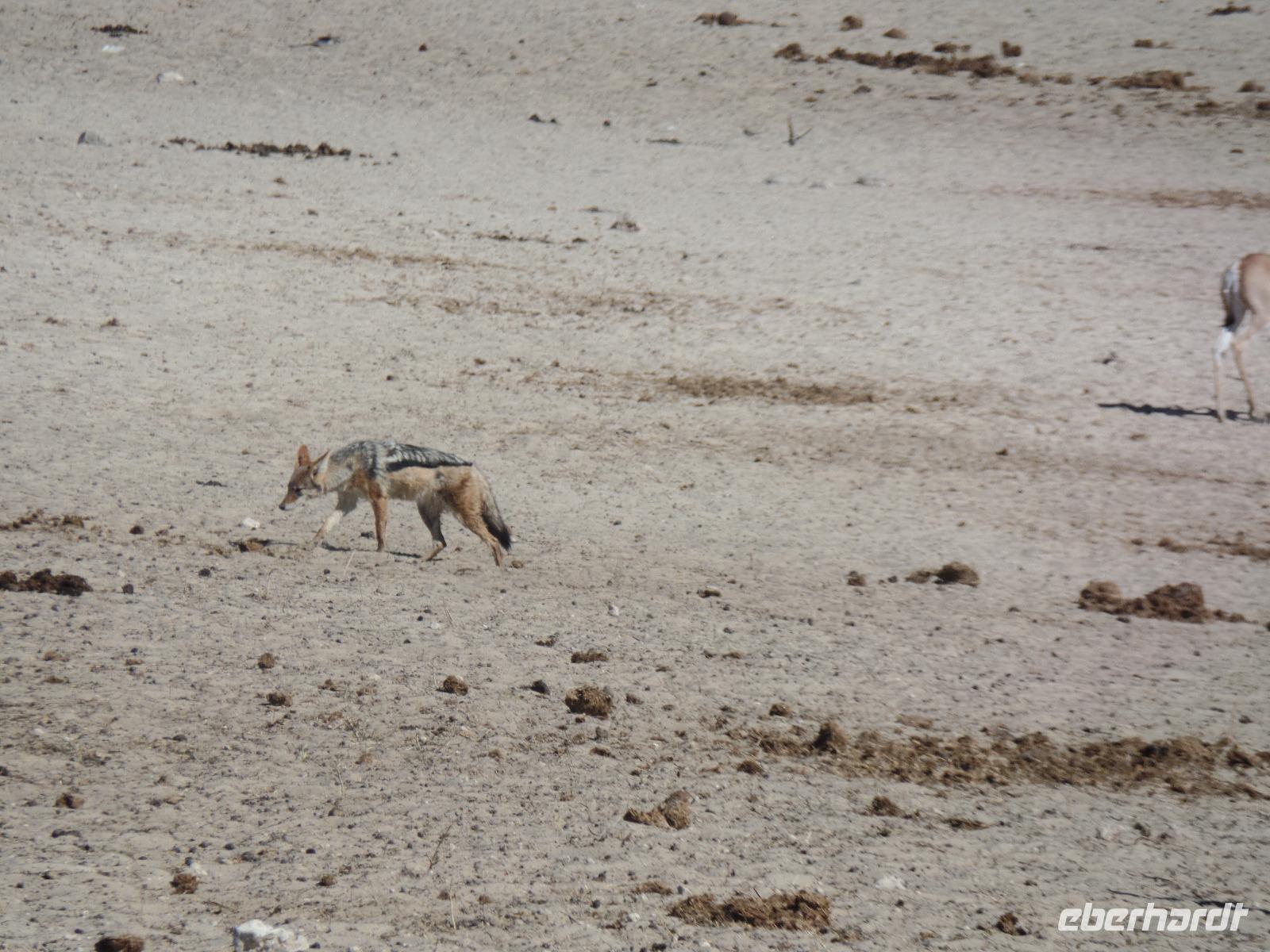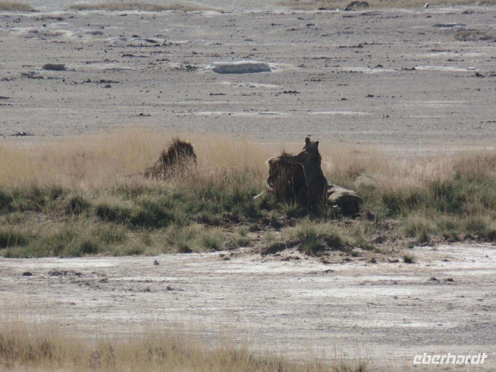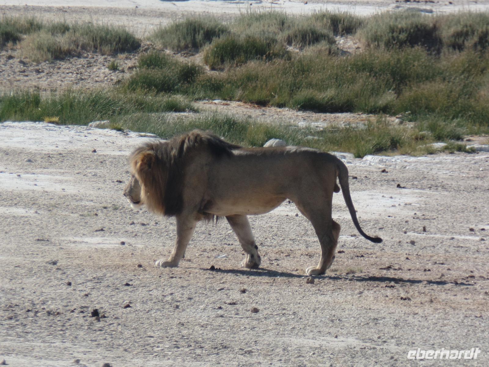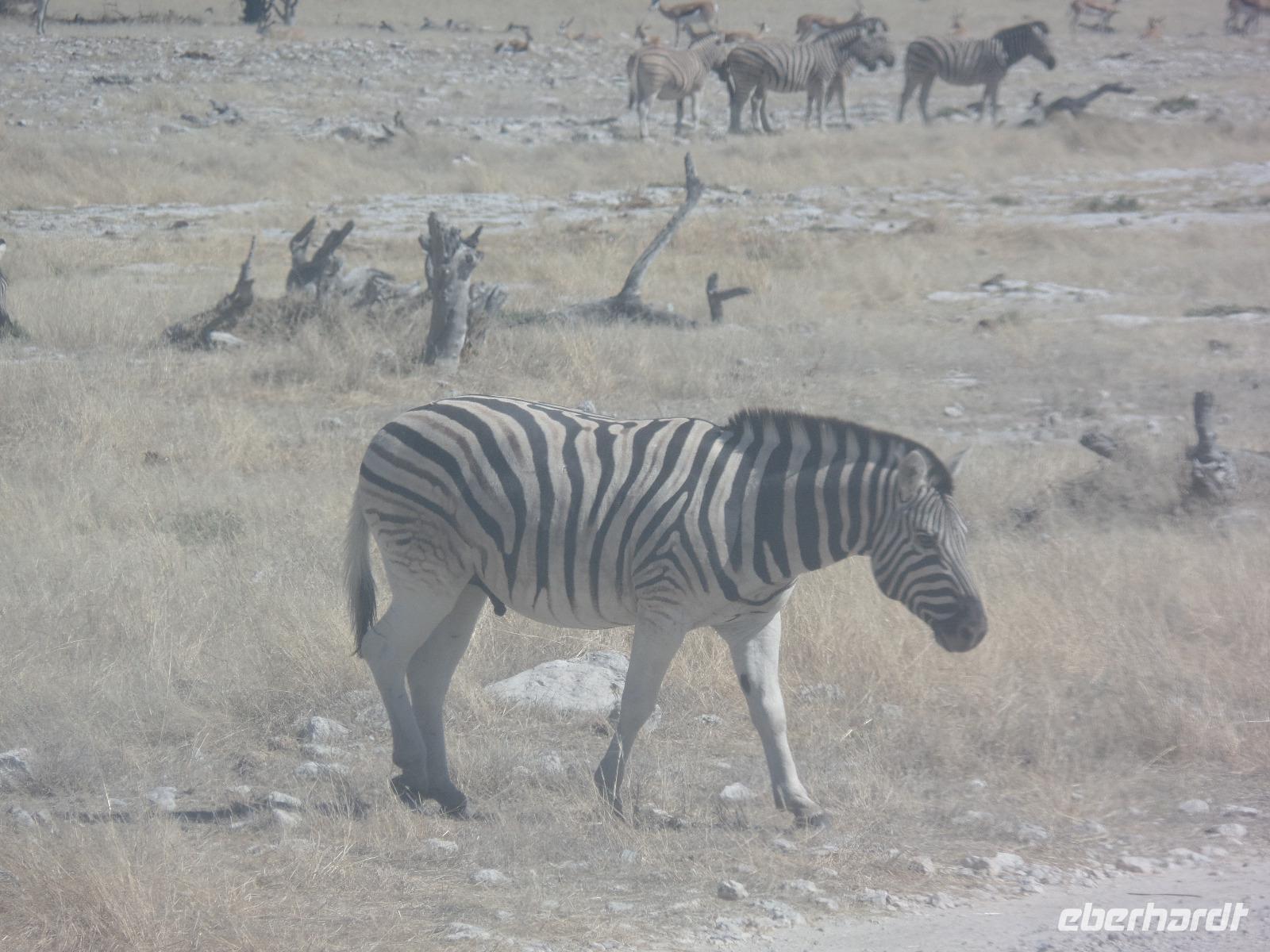 So wie gestern verbrachten wir die Mittagstunden beim gemütlichen Picknick in einem schattigen Camp direkt im Park. Hier konnte man sich was zum Essen bestellen oder zum Wasserloch laufen, um Tiere zu beobachten. Eberhardt Travel lud heute alle Gäste zum Eis ein. War eine gute Idee, oder? Am frühenNachmittag fuhren wir direkt am Rand von dem Herzstück des Parks, die 100 Kilometer lange Etosha-Pfanne. Eine große, weiße Fläche, wie der Name aus der Sansprache bedeutet, breitet sich ins Unendliche aus. Die weiße, nichtgreifbare Weite zieht uns alle magisch in ihren Bann.