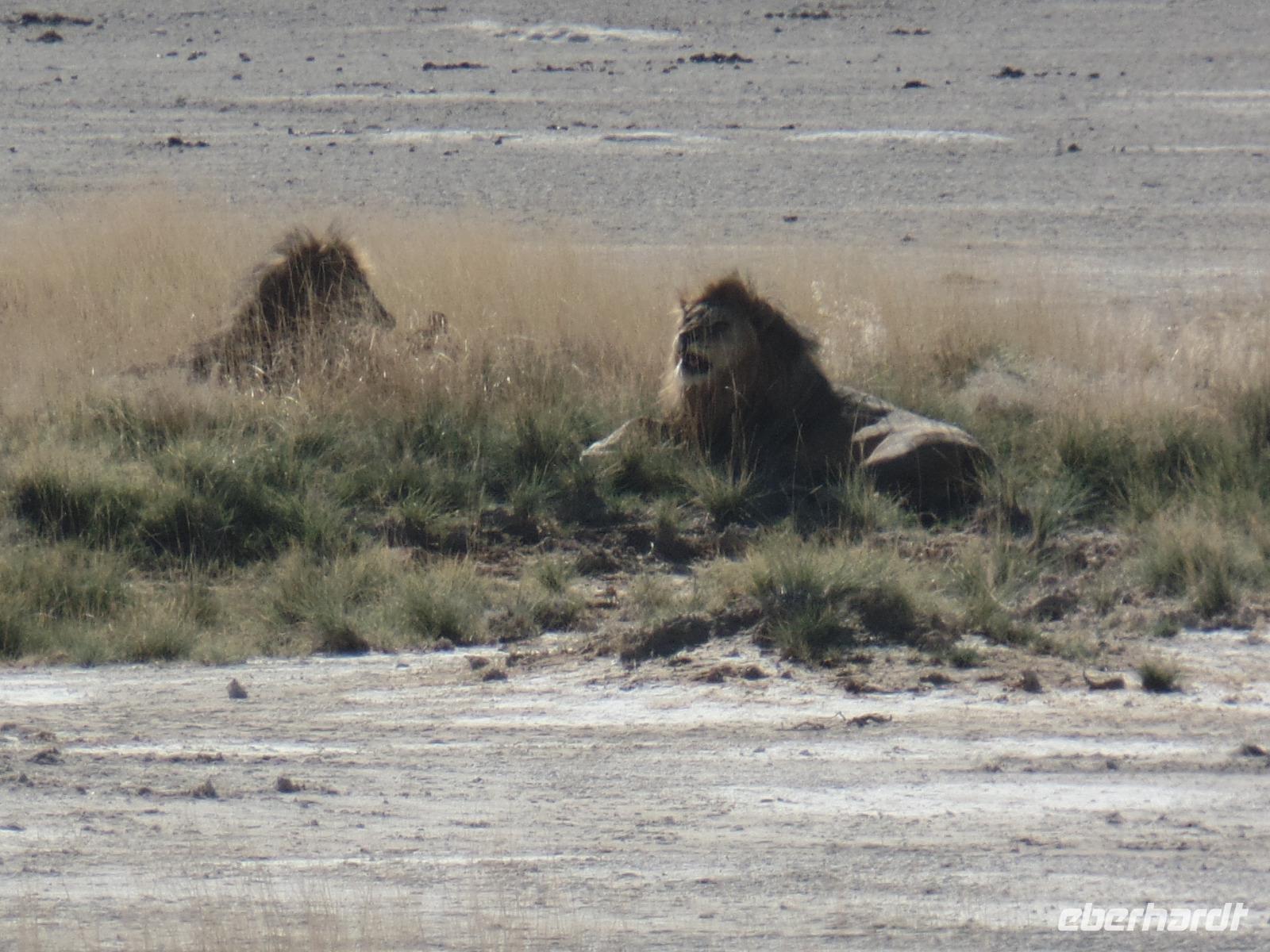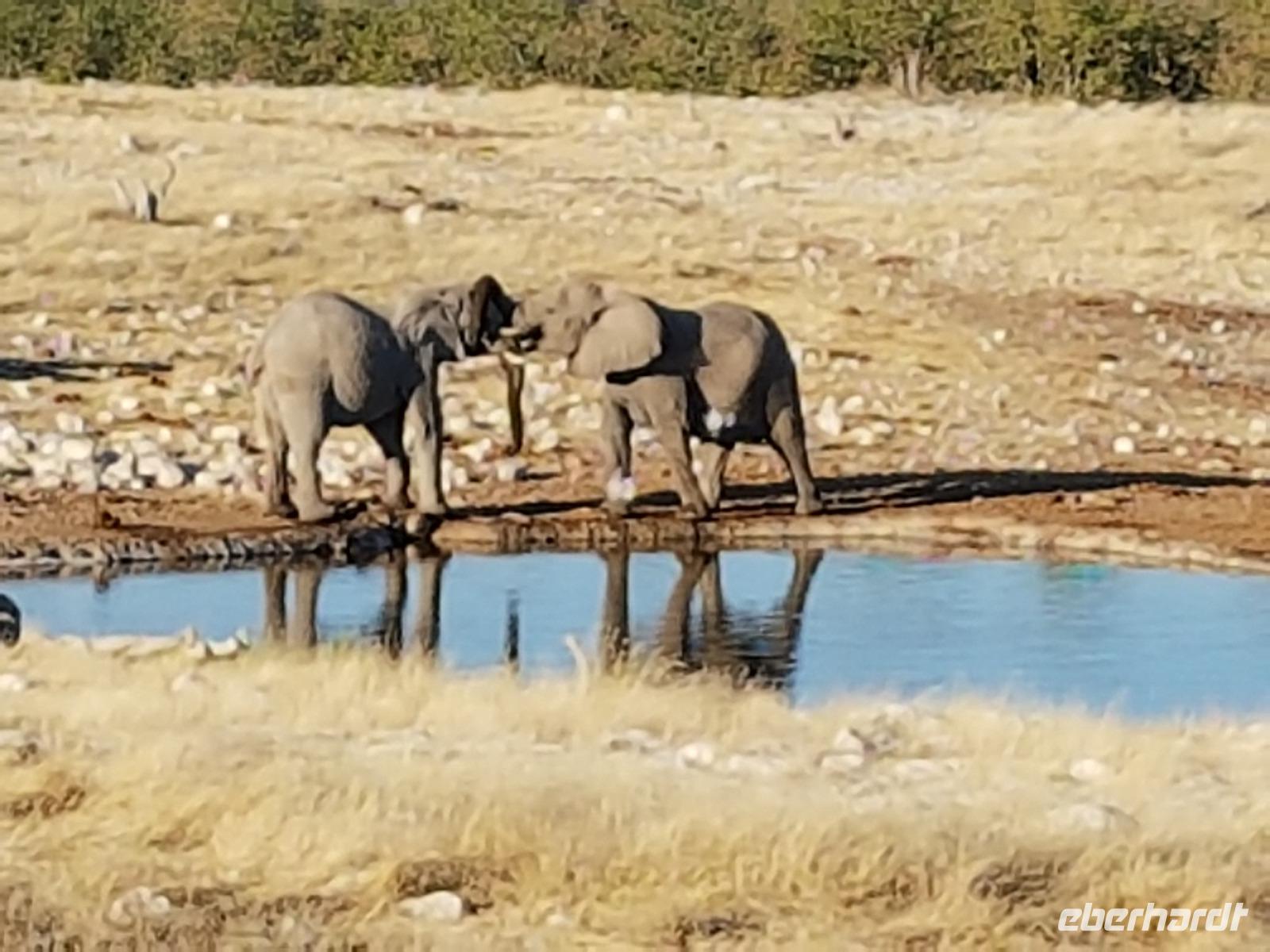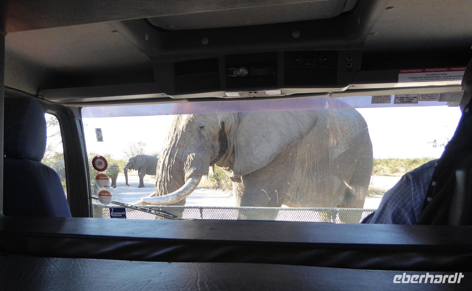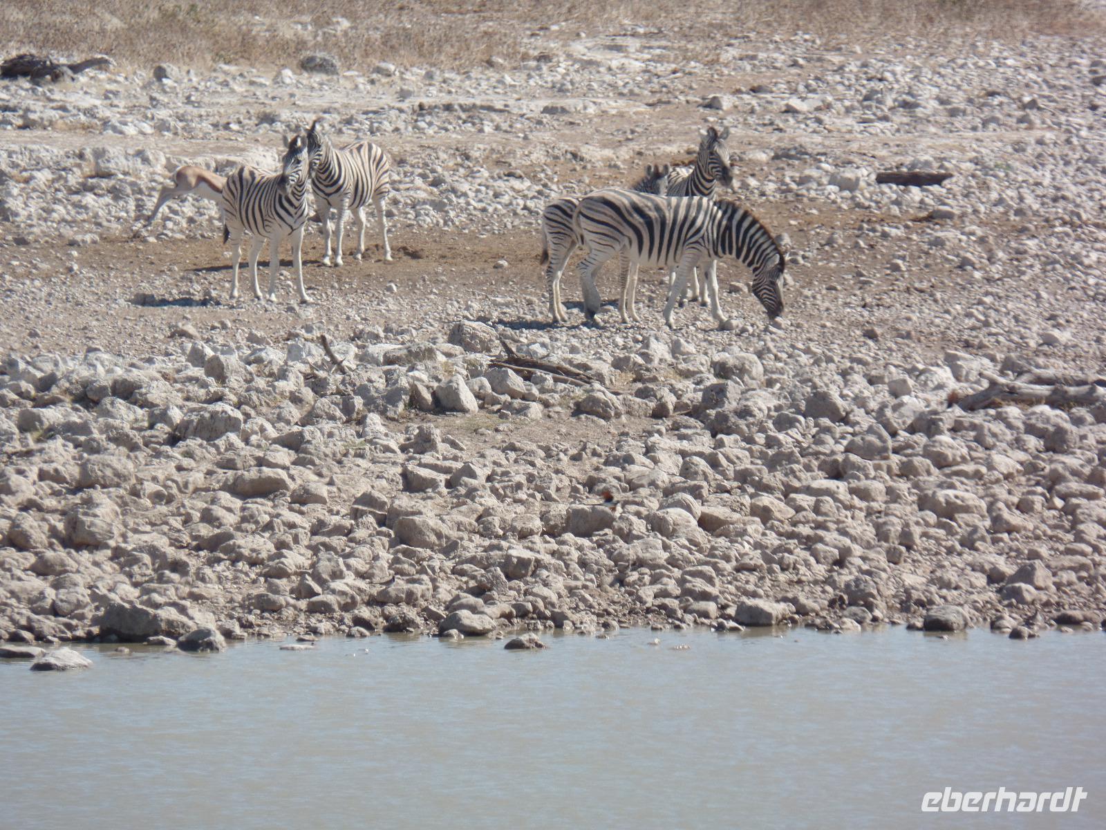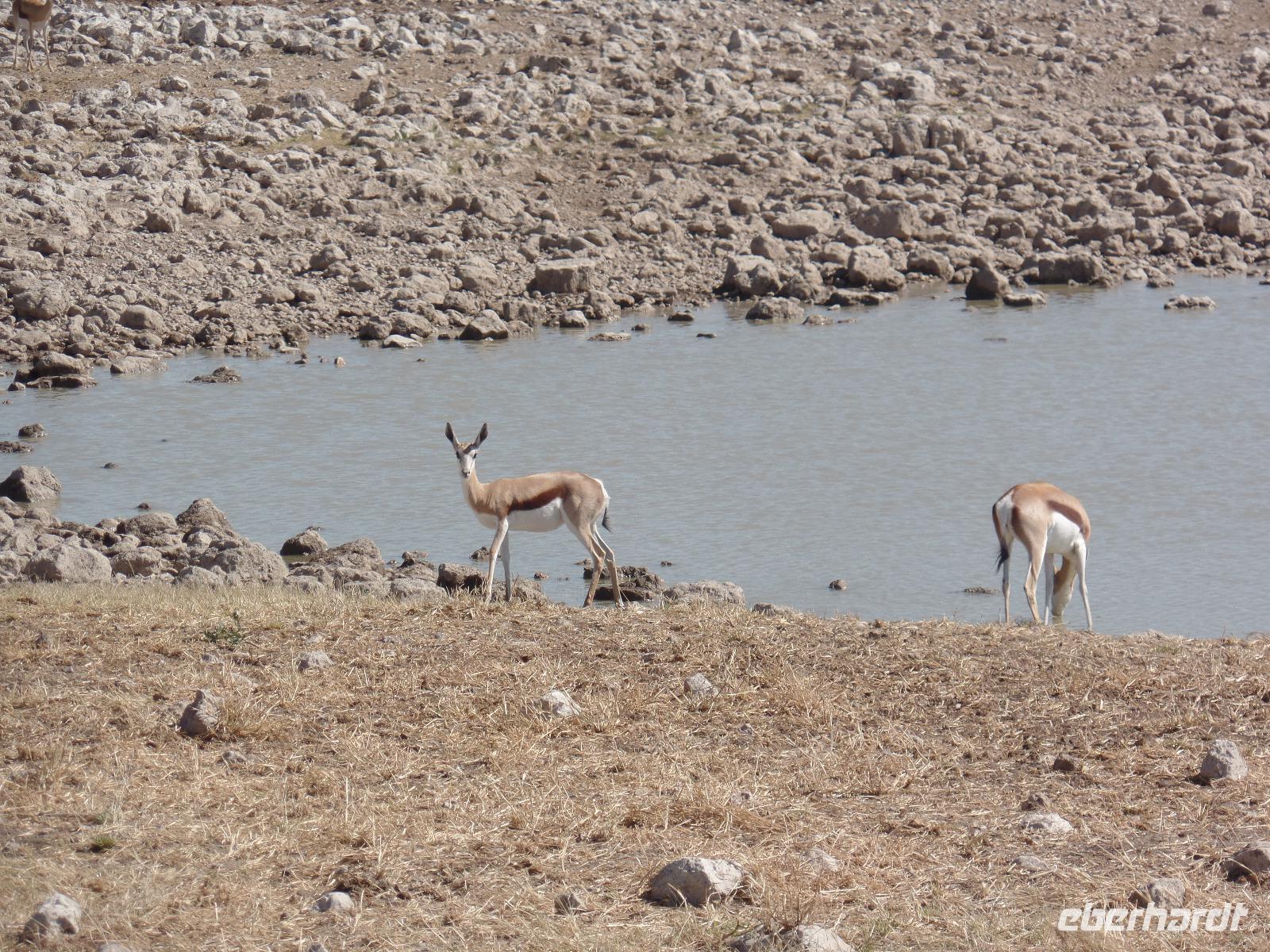 So wie gestern verbrachten wir die Mittagstunden beim gemütlichen Picknick in einem schattigen Camp direkt im Park. Hier konnte man sich was zum Essen bestellen oder zum Wasserloch laufen, um Tiere zu beobachten. Eberhardt Travel lud heute alle Gäste zum Eis ein. War eine gute Idee, oder? Am frühenNachmittag fuhren wir direkt am Rand von dem Herzstück des Parks, die 100 Kilometer lange Etosha-Pfanne. Eine große, weiße Fläche, wie der Name aus der Sansprache bedeutet, breitet sich ins Unendliche aus. Die weiße, nichtgreifbare Weite zieht uns alle magisch in ihren Bann.