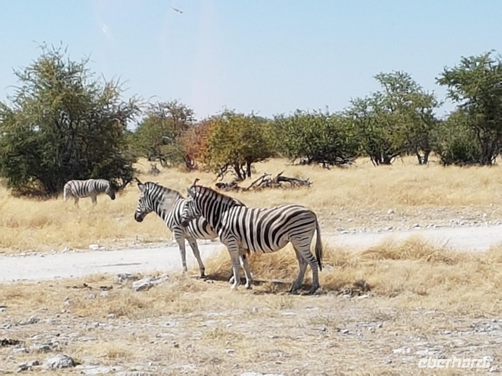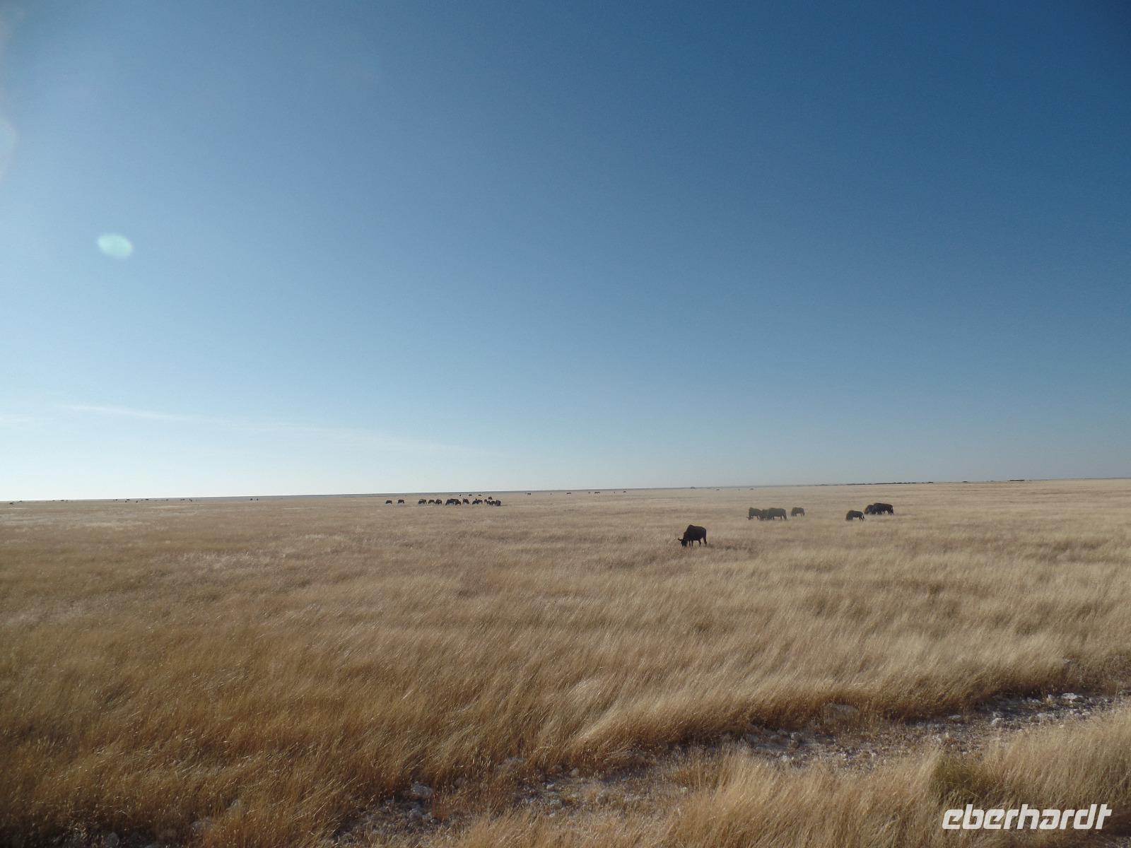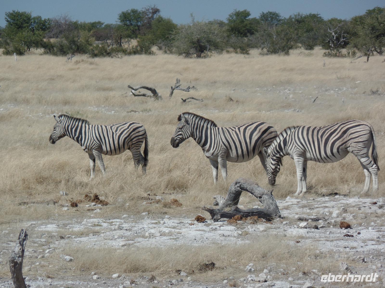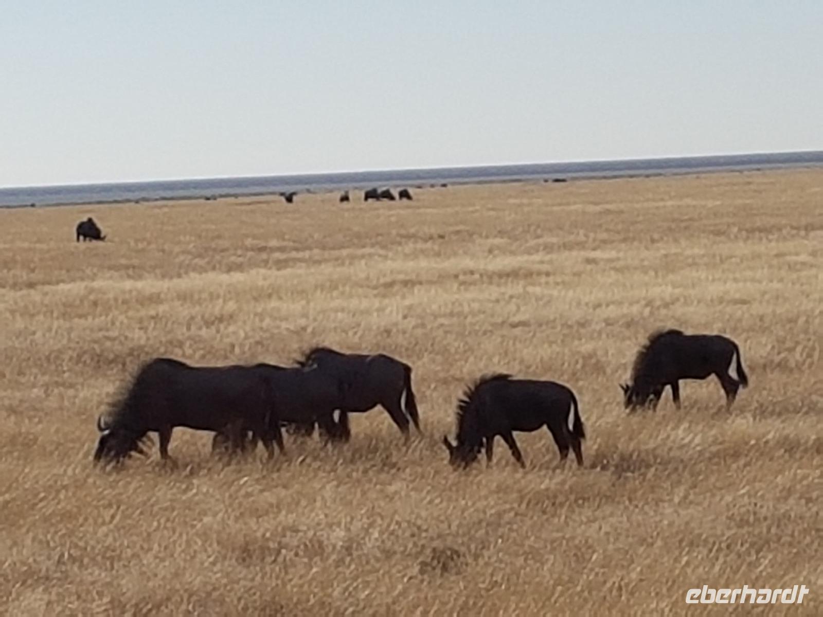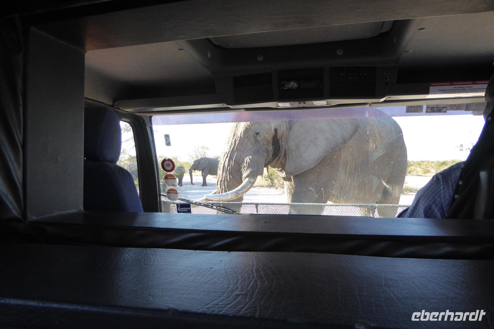 So wie gestern verbrachten wir die Mittagstunden beim gemütlichen Picknick in einem schattigen Camp direkt im Park. Hier konnte man sich was zum Essen bestellen oder zum Wasserloch laufen, um Tiere zu beobachten. Eberhardt Travel lud heute alle Gäste zum Eis ein. War eine gute Idee, oder? Am frühenNachmittag fuhren wir direkt am Rand von dem Herzstück des Parks, die 100 Kilometer lange Etosha-Pfanne. Eine große, weiße Fläche, wie der Name aus der Sansprache bedeutet, breitet sich ins Unendliche aus. Die weiße, nichtgreifbare Weite zieht uns alle magisch in ihren Bann.
