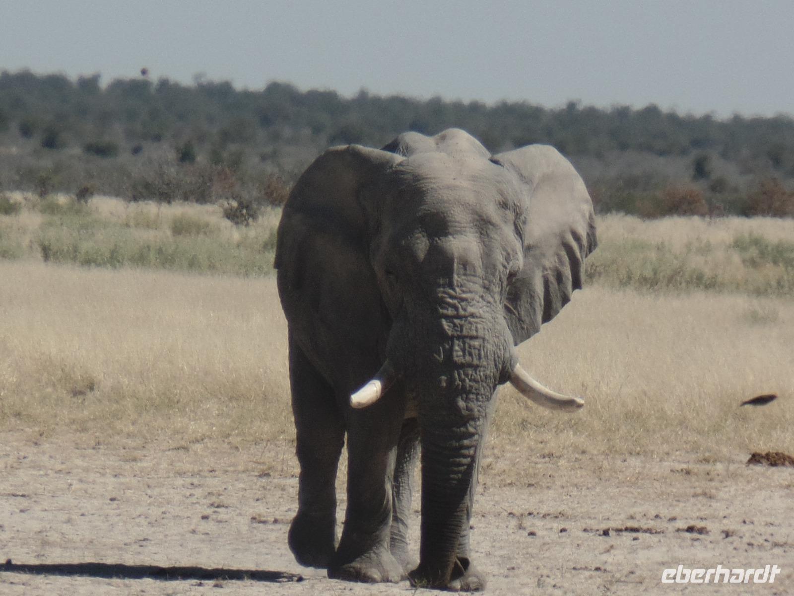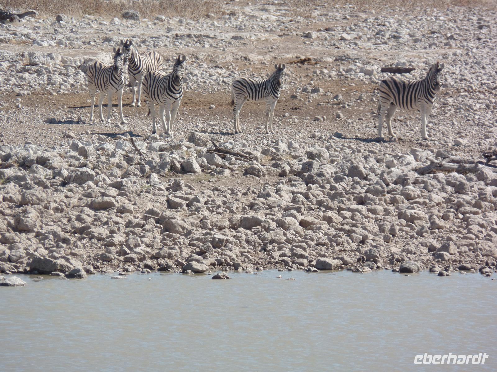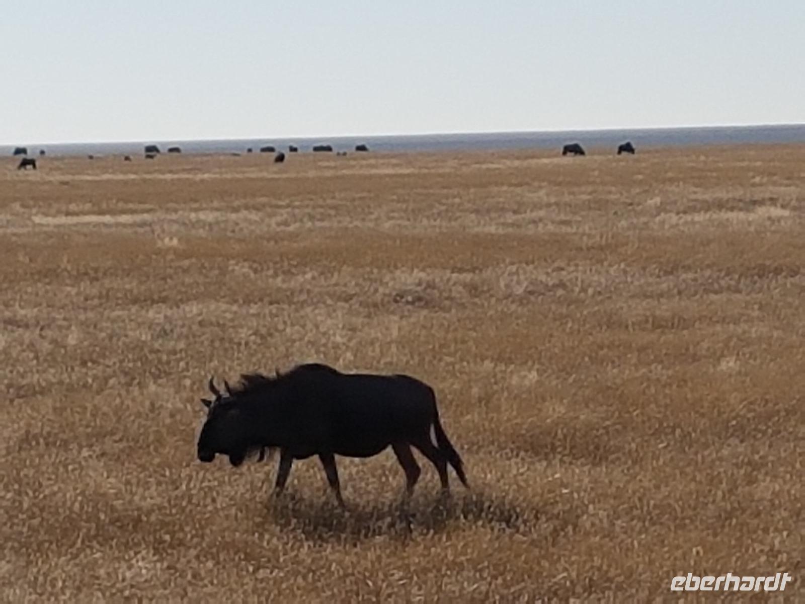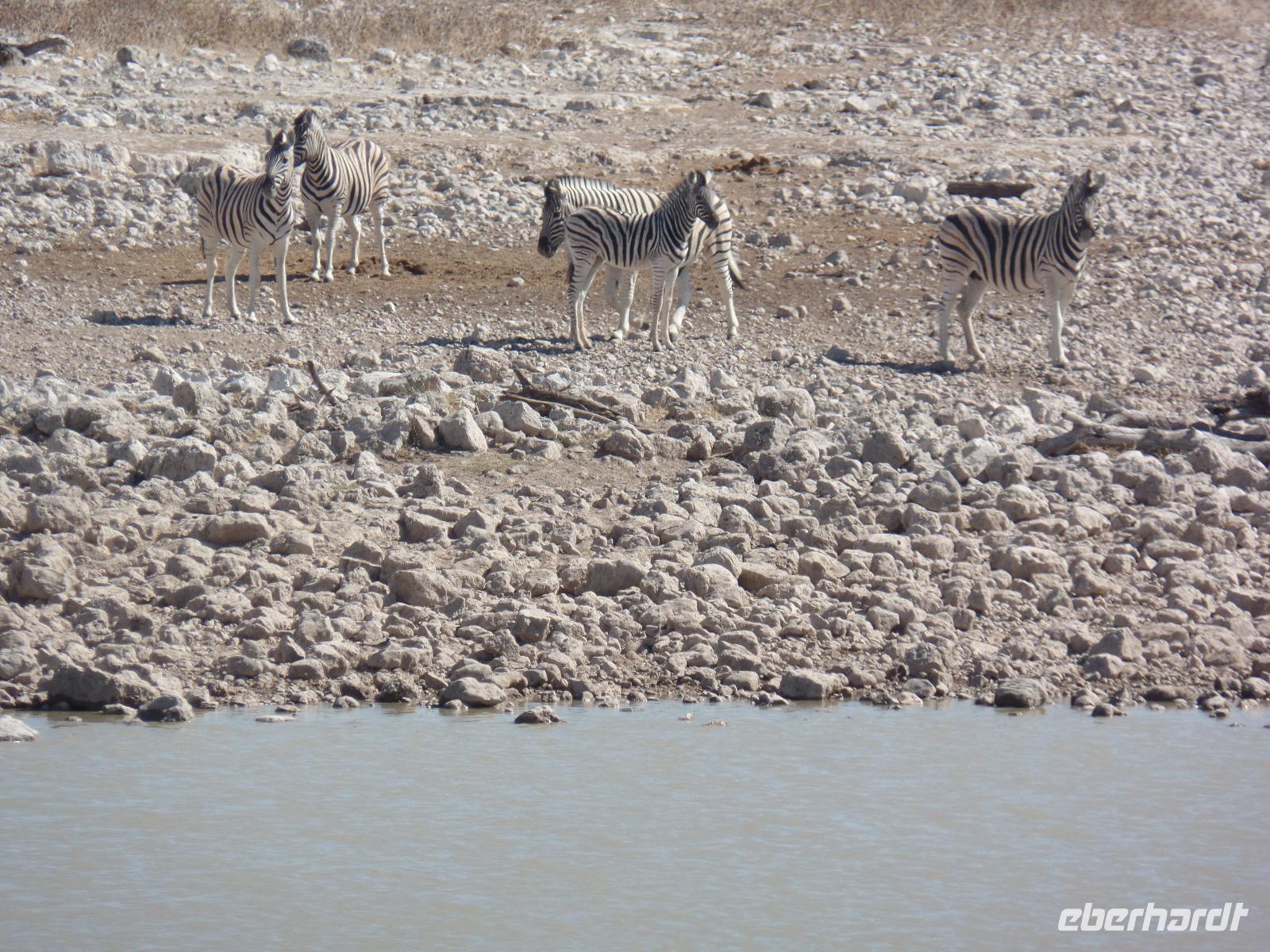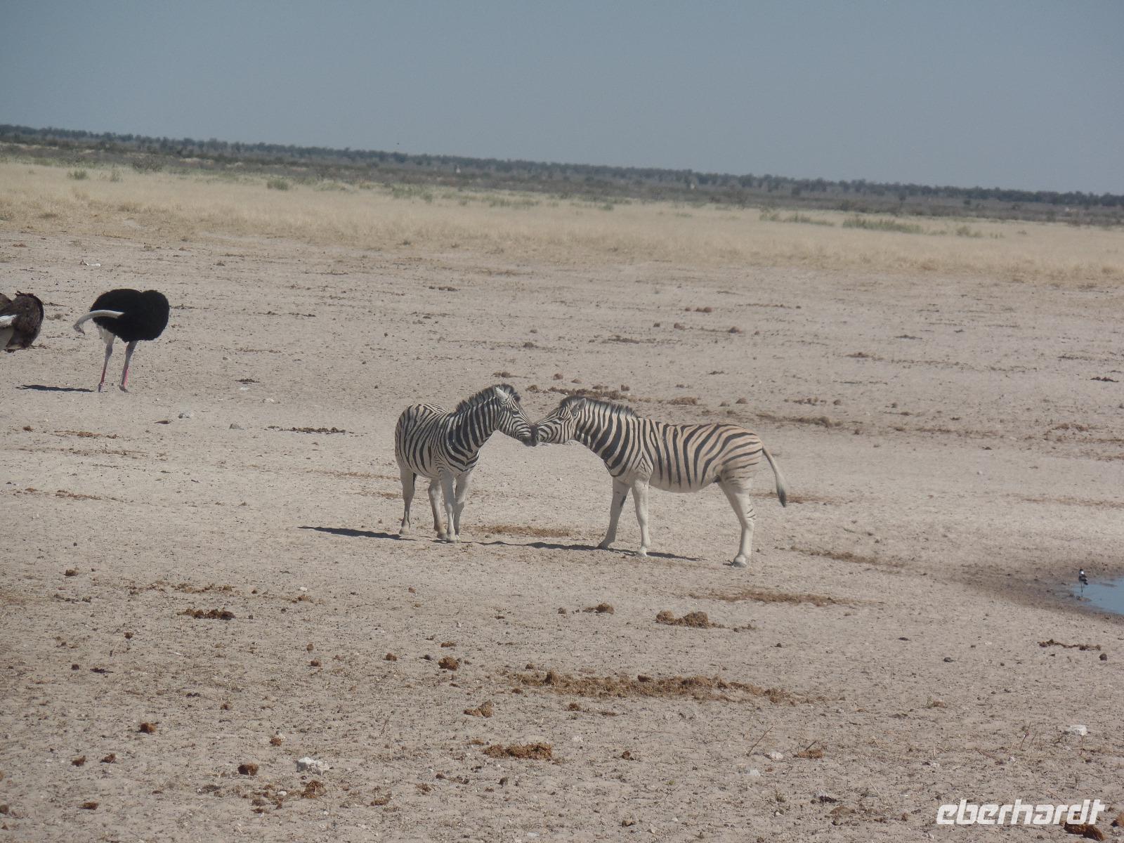 So wie gestern verbrachten wir die Mittagstunden beim gemütlichen Picknick in einem schattigen Camp direkt im Park. Hier konnte man sich was zum Essen bestellen oder zum Wasserloch laufen, um Tiere zu beobachten. Eberhardt Travel lud heute alle Gäste zum Eis ein. War eine gute Idee, oder? Am frühenNachmittag fuhren wir direkt am Rand von dem Herzstück des Parks, die 100 Kilometer lange Etosha-Pfanne. Eine große, weiße Fläche, wie der Name aus der Sansprache bedeutet, breitet sich ins Unendliche aus. Die weiße, nichtgreifbare Weite zieht uns alle magisch in ihren Bann.