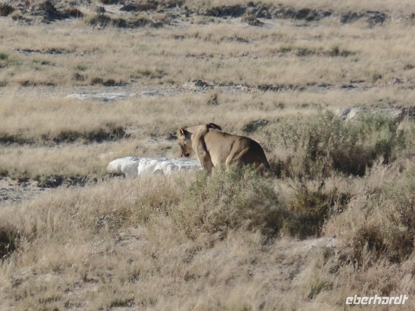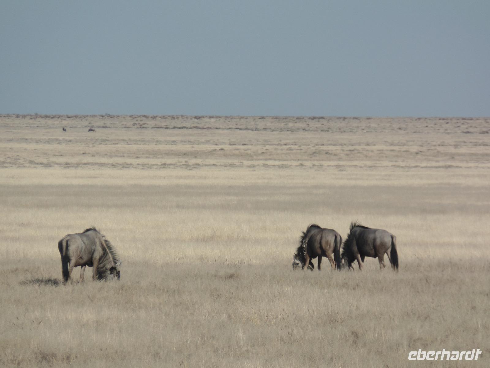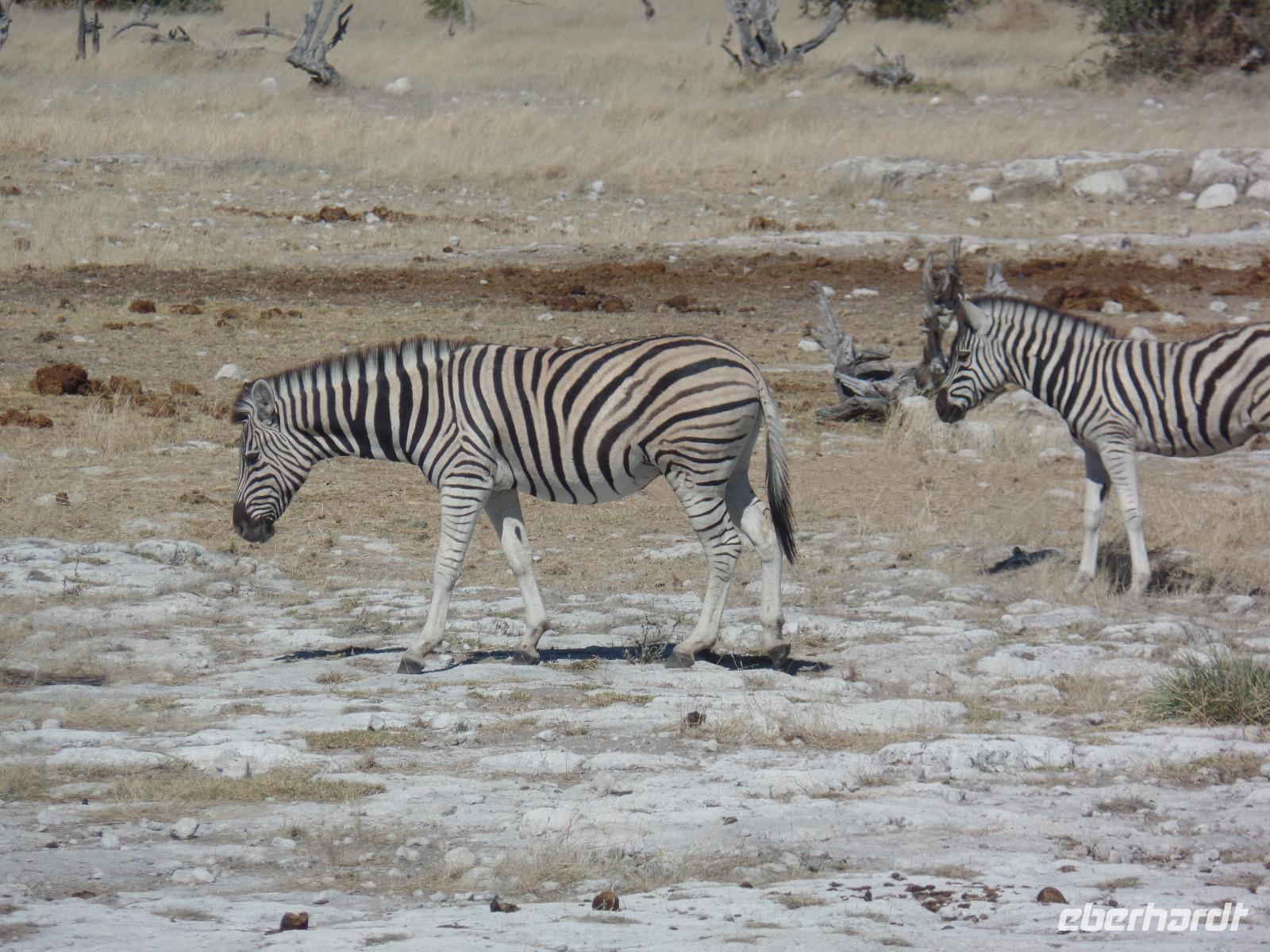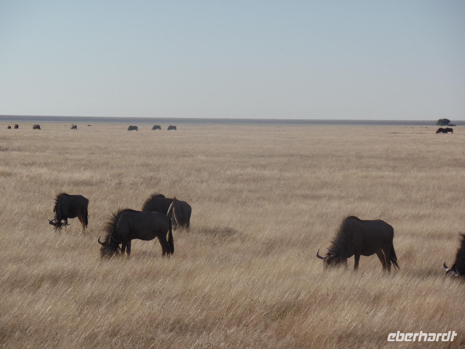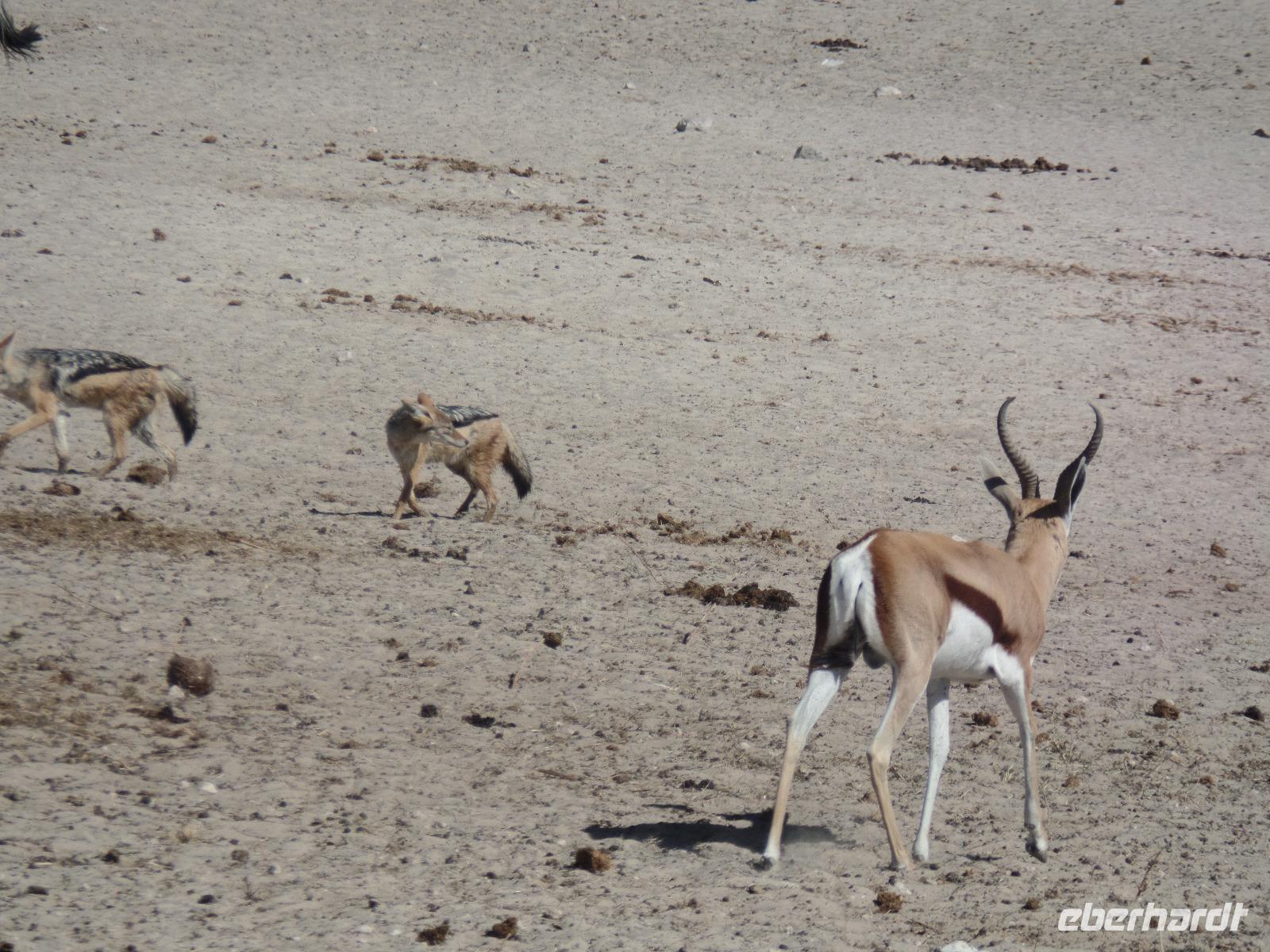 So wie gestern verbrachten wir die Mittagstunden beim gemütlichen Picknick in einem schattigen Camp direkt im Park. Hier konnte man sich was zum Essen bestellen oder zum Wasserloch laufen, um Tiere zu beobachten. Eberhardt Travel lud heute alle Gäste zum Eis ein. War eine gute Idee, oder? Am frühenNachmittag fuhren wir direkt am Rand von dem Herzstück des Parks, die 100 Kilometer lange Etosha-Pfanne. Eine große, weiße Fläche, wie der Name aus der Sansprache bedeutet, breitet sich ins Unendliche aus. Die weiße, nichtgreifbare Weite zieht uns alle magisch in ihren Bann.