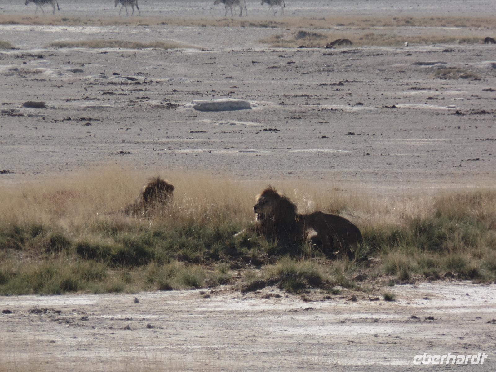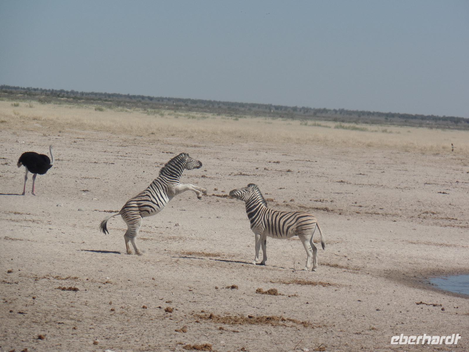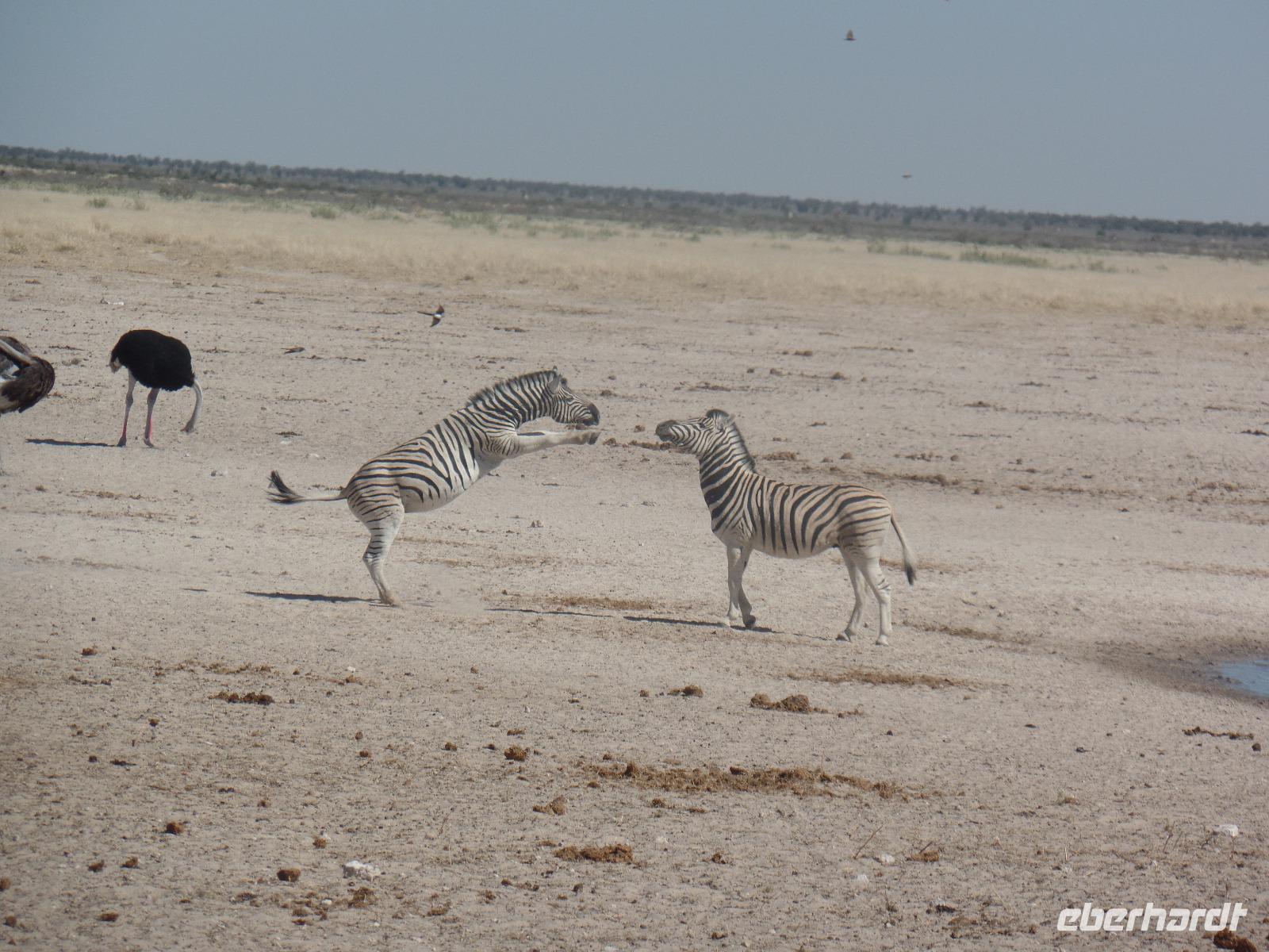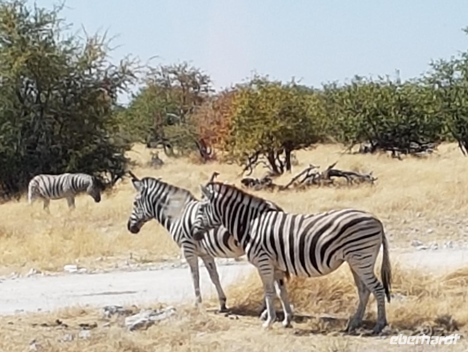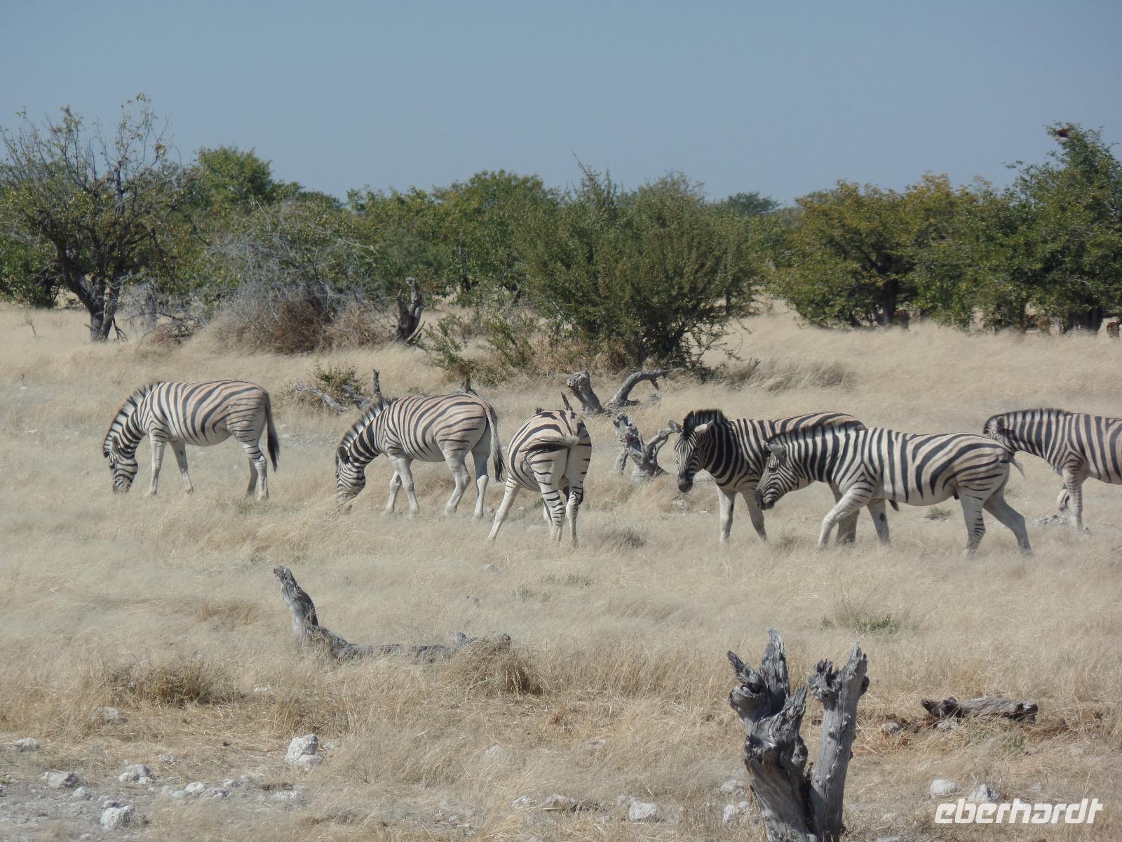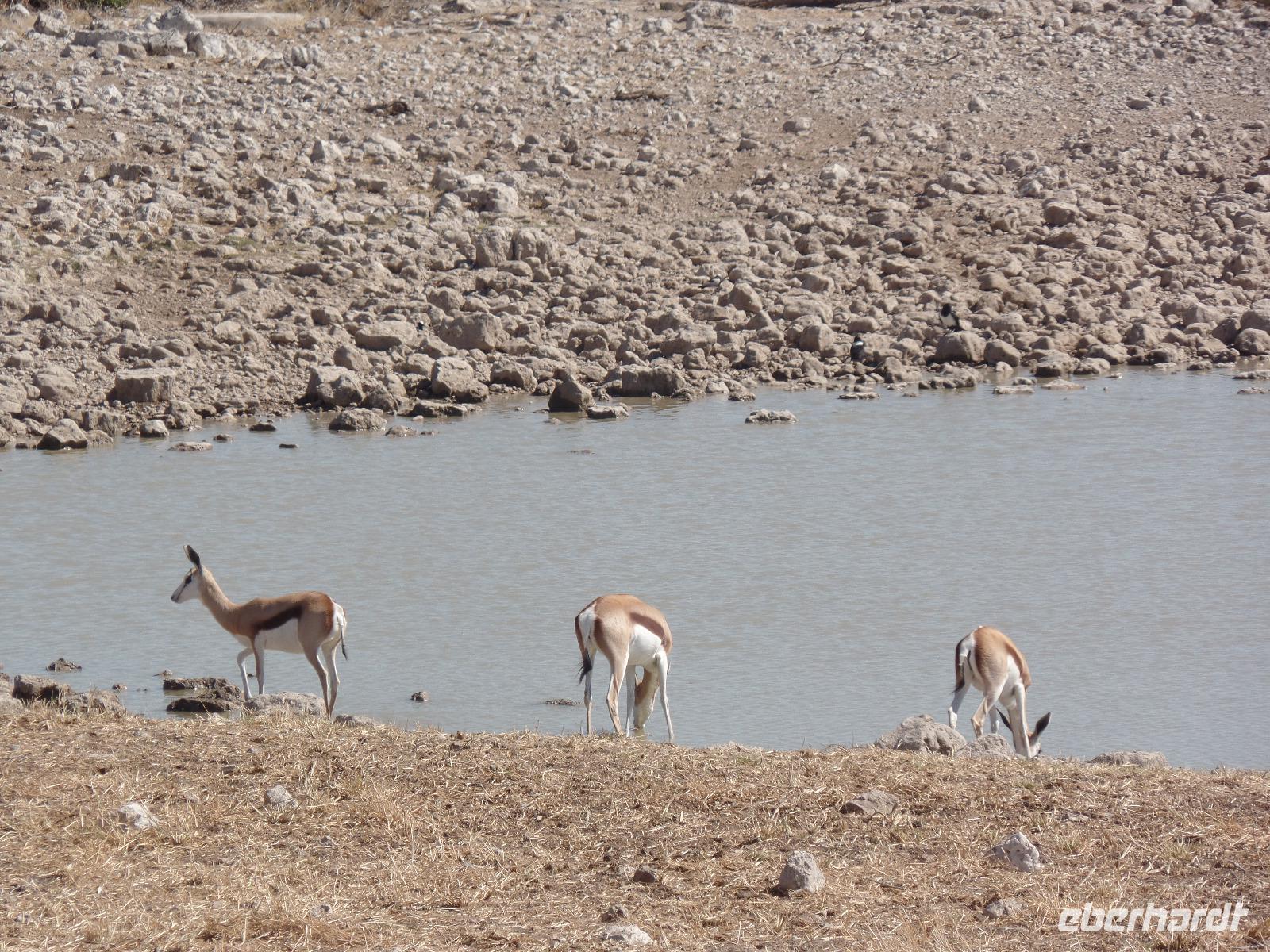 So wie gestern verbrachten wir die Mittagstunden beim gemütlichen Picknick in einem schattigen Camp direkt im Park. Hier konnte man sich was zum Essen bestellen oder zum Wasserloch laufen, um Tiere zu beobachten. Eberhardt Travel lud heute alle Gäste zum Eis ein. War eine gute Idee, oder? Am frühenNachmittag fuhren wir direkt am Rand von dem Herzstück des Parks, die 100 Kilometer lange Etosha-Pfanne. Eine große, weiße Fläche, wie der Name aus der Sansprache bedeutet, breitet sich ins Unendliche aus. Die weiße, nichtgreifbare Weite zieht uns alle magisch in ihren Bann.