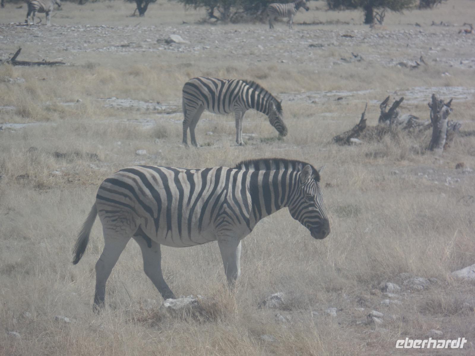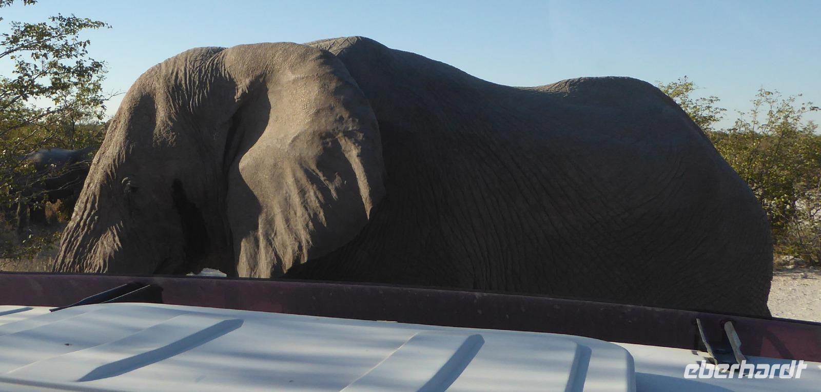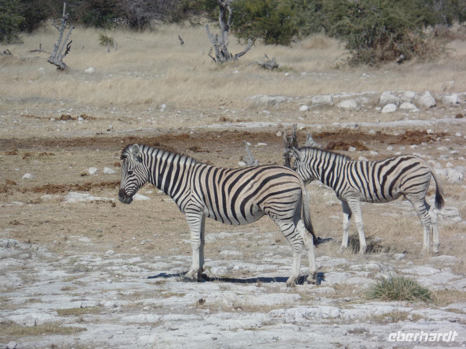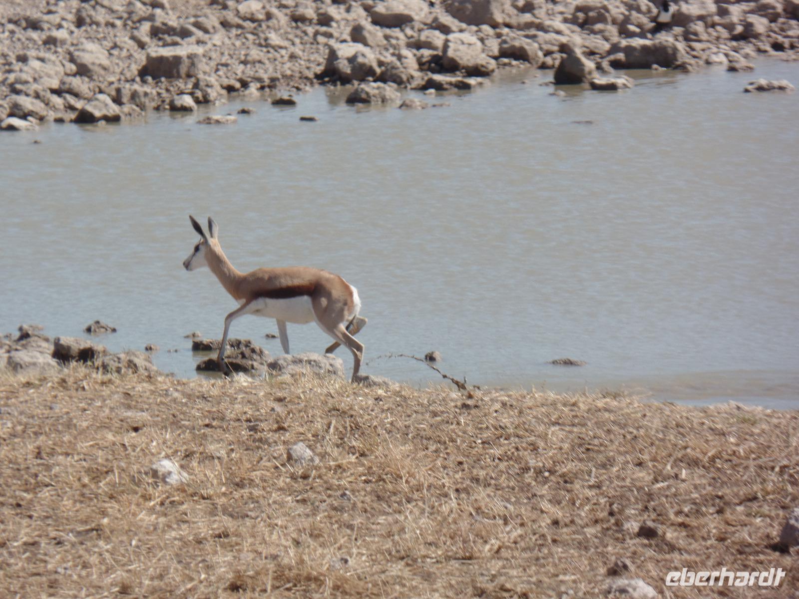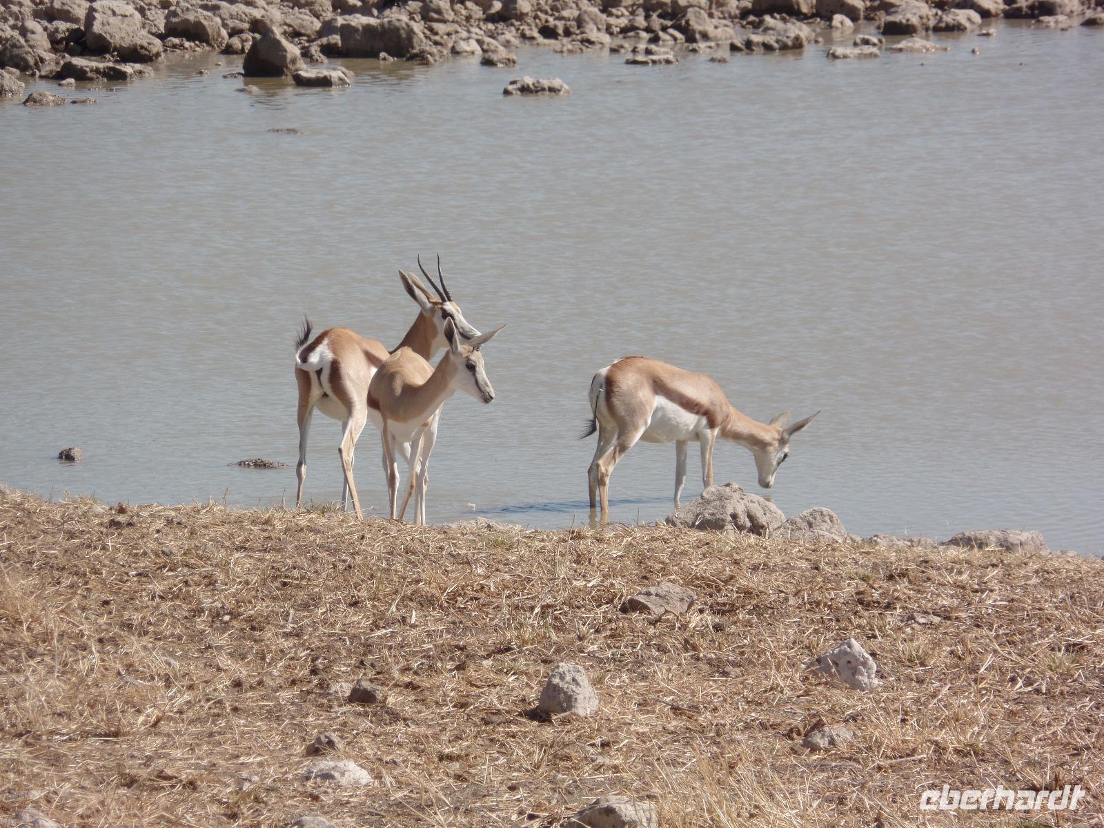 So wie gestern verbrachten wir die Mittagstunden beim gemütlichen Picknick in einem schattigen Camp direkt im Park. Hier konnte man sich was zum Essen bestellen oder zum Wasserloch laufen, um Tiere zu beobachten. Eberhardt Travel lud heute alle Gäste zum Eis ein. War eine gute Idee, oder? Am frühenNachmittag fuhren wir direkt am Rand von dem Herzstück des Parks, die 100 Kilometer lange Etosha-Pfanne. Eine große, weiße Fläche, wie der Name aus der Sansprache bedeutet, breitet sich ins Unendliche aus. Die weiße, nichtgreifbare Weite zieht uns alle magisch in ihren Bann.